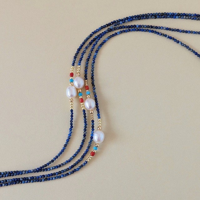 【14kgf製ネックレス】ラピスラズリ 淡水パール 赤珊瑚 細め 天然石ネックレス
