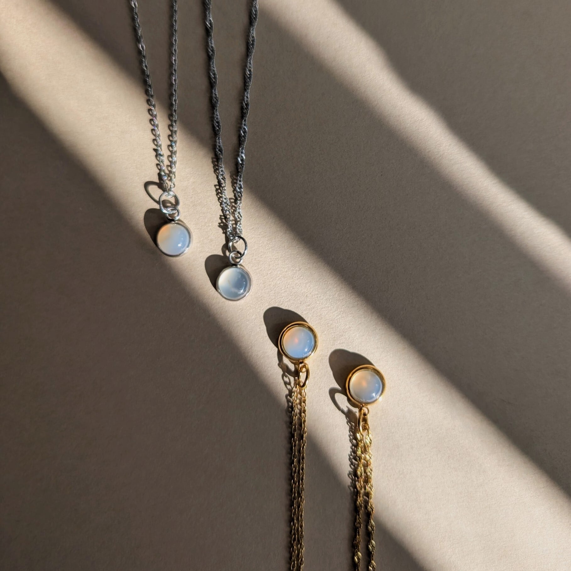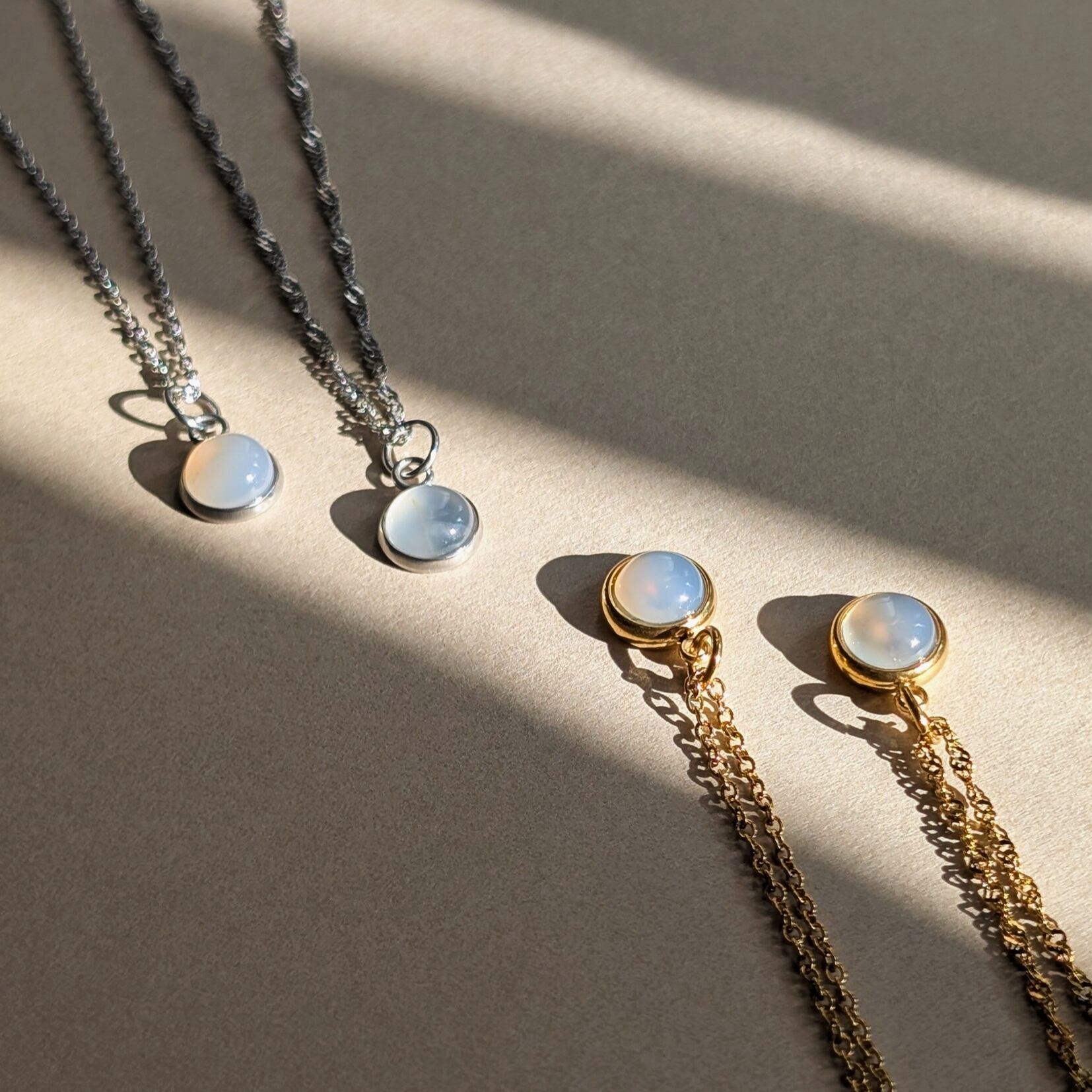 天然ホワイトアゲートを使用したネックレス。乳白色の優しい透明感。ホワイトアゲートのホワイトでコーディネートに柔らかさをプラス。