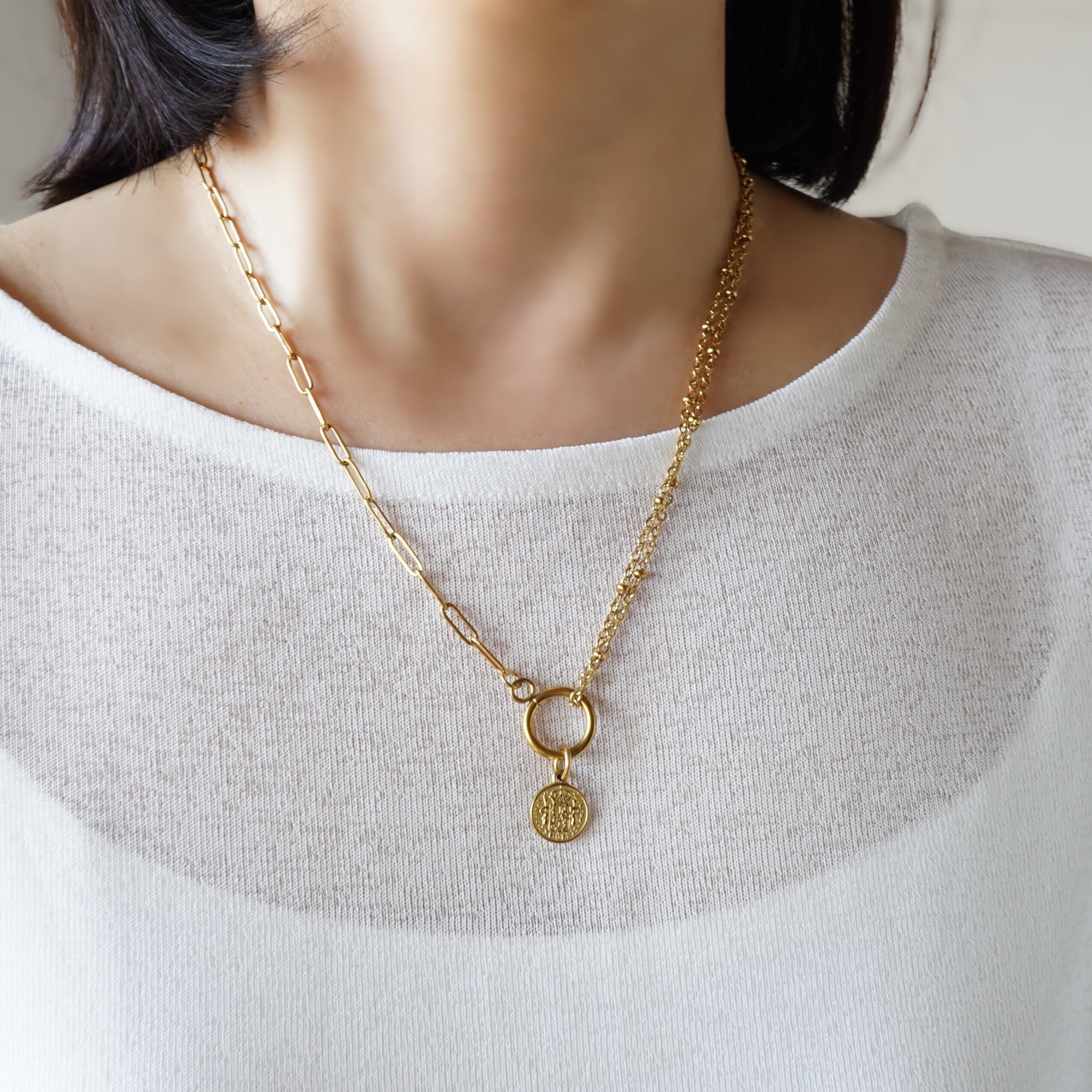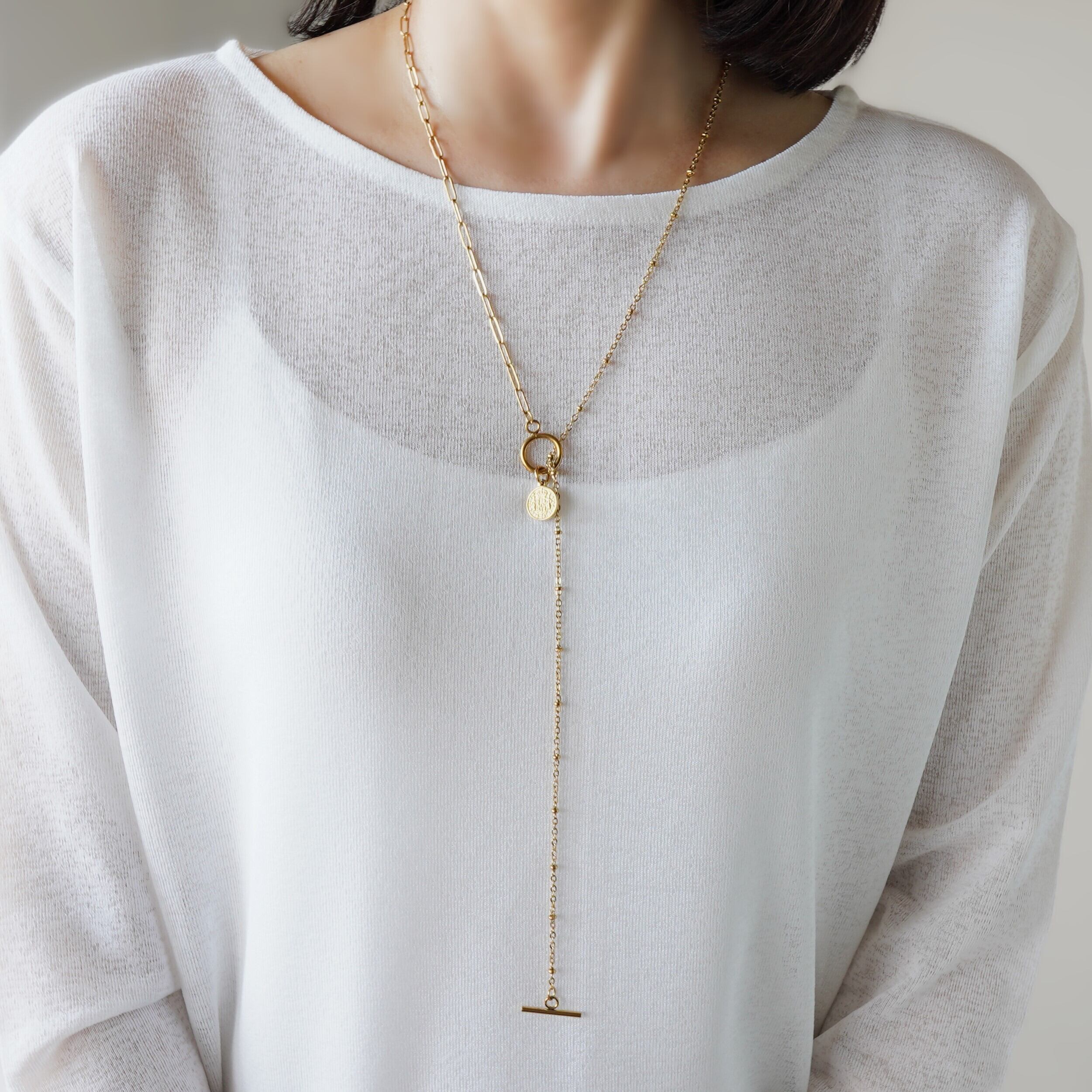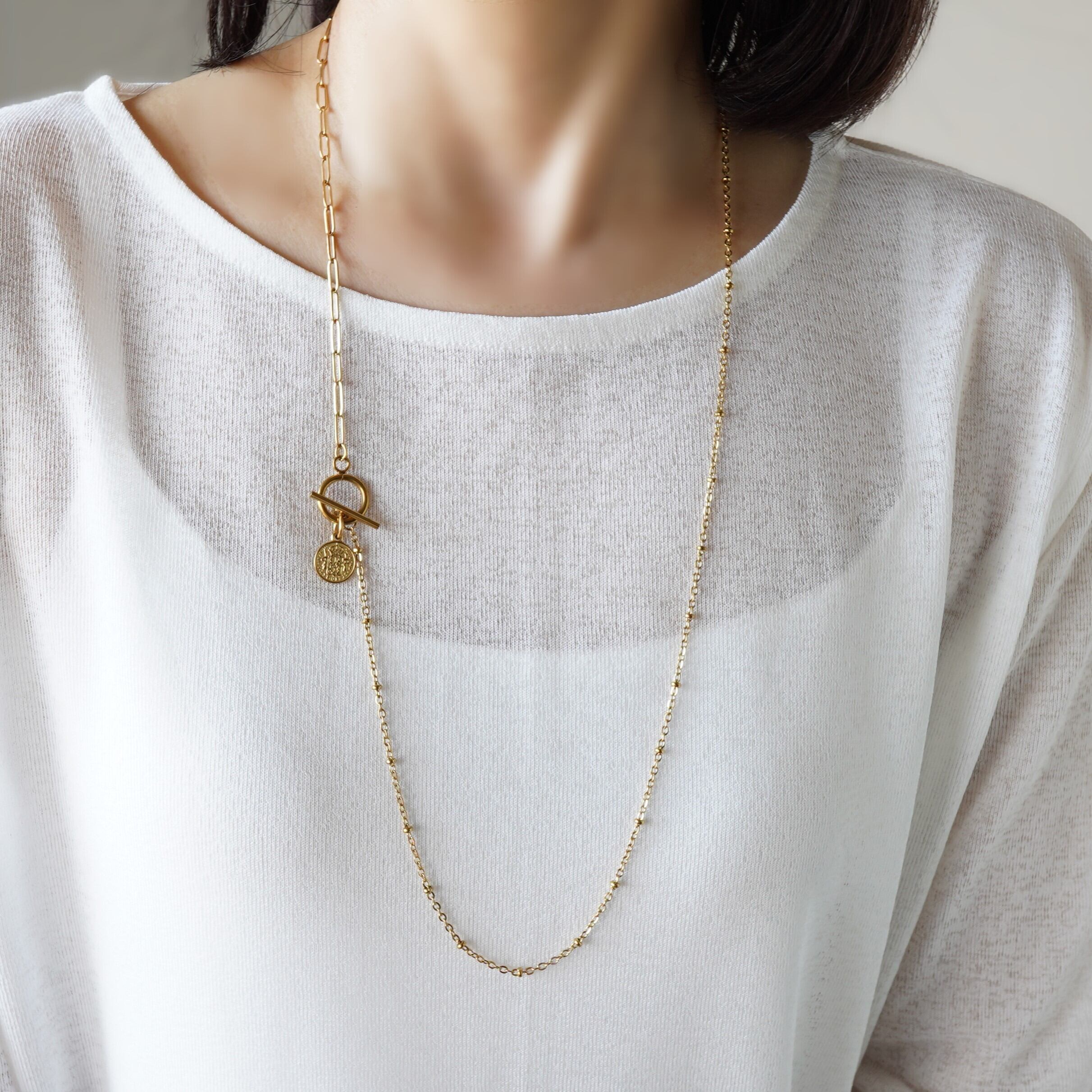 縦ラインが強調されるYチェーンネックレス。バーの部分をコインの付いているマンテルに二回からめて長めに垂らすとおしゃれな雰囲気になります。