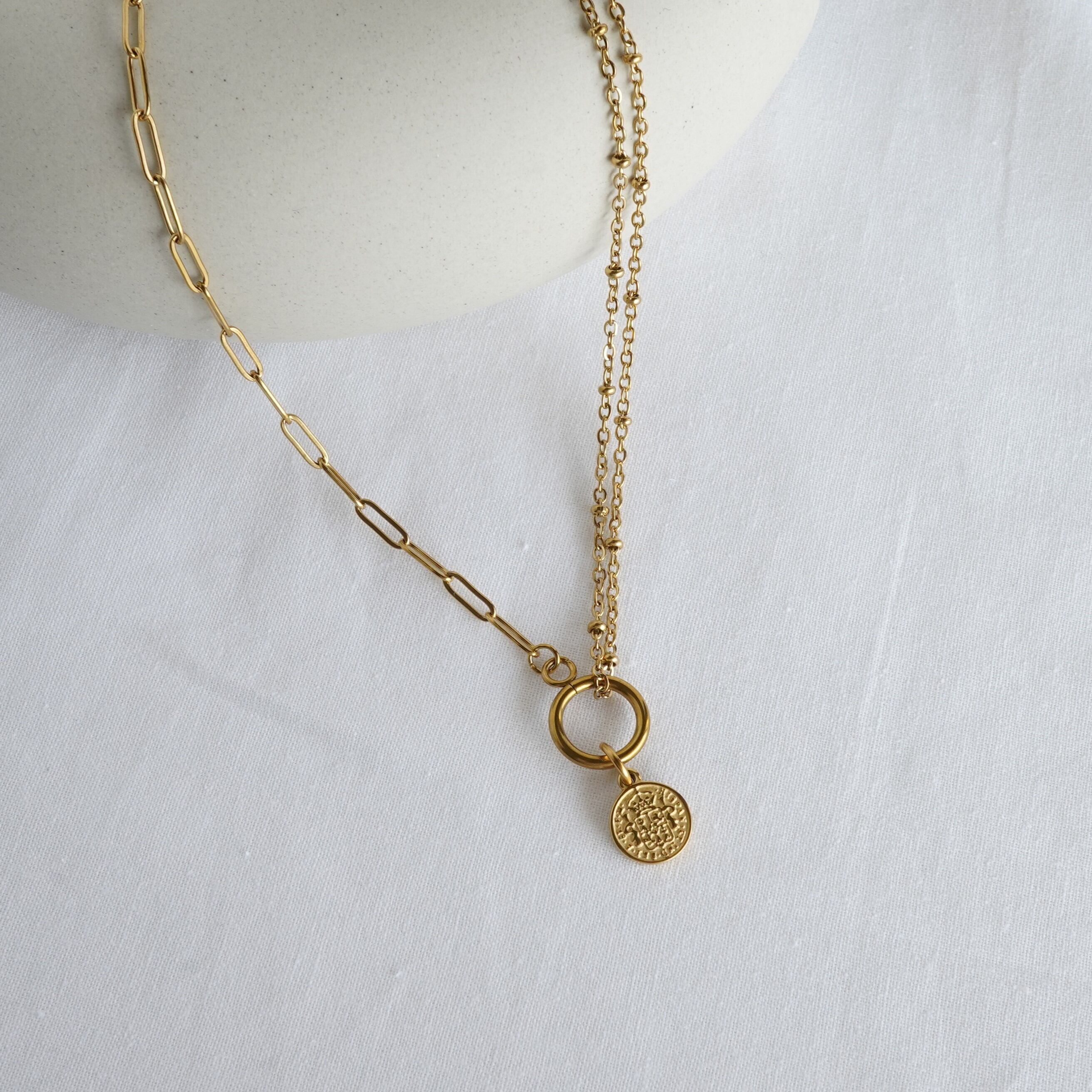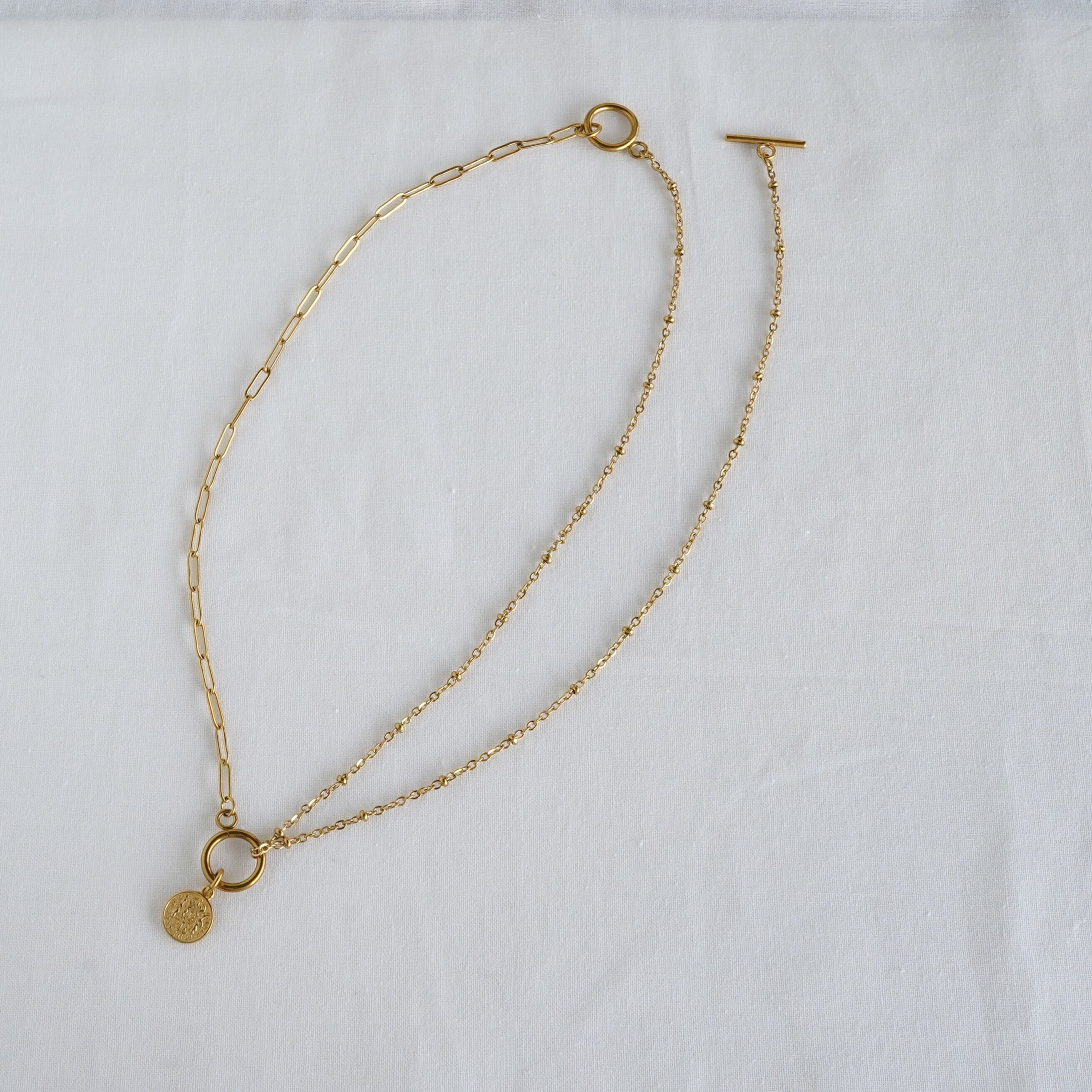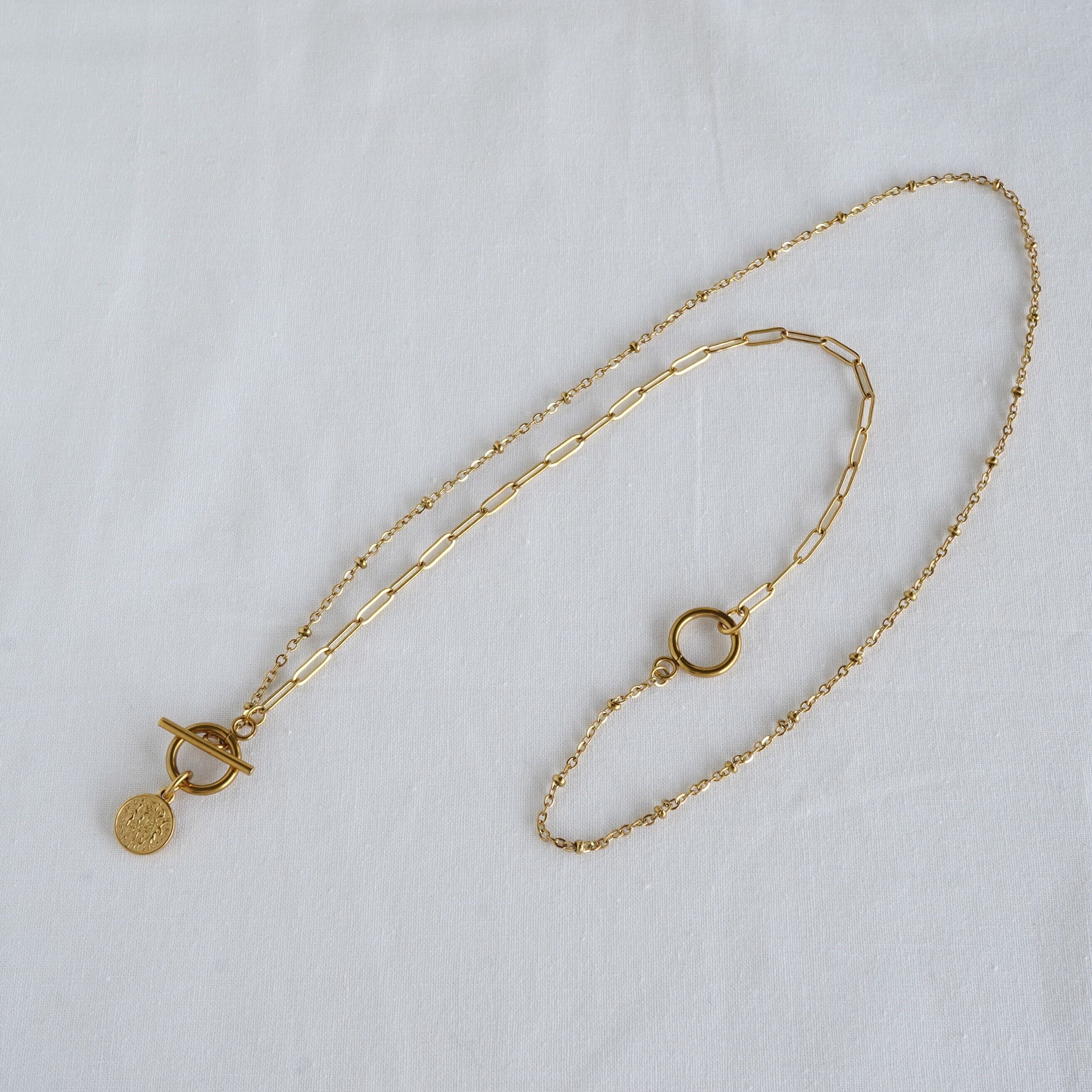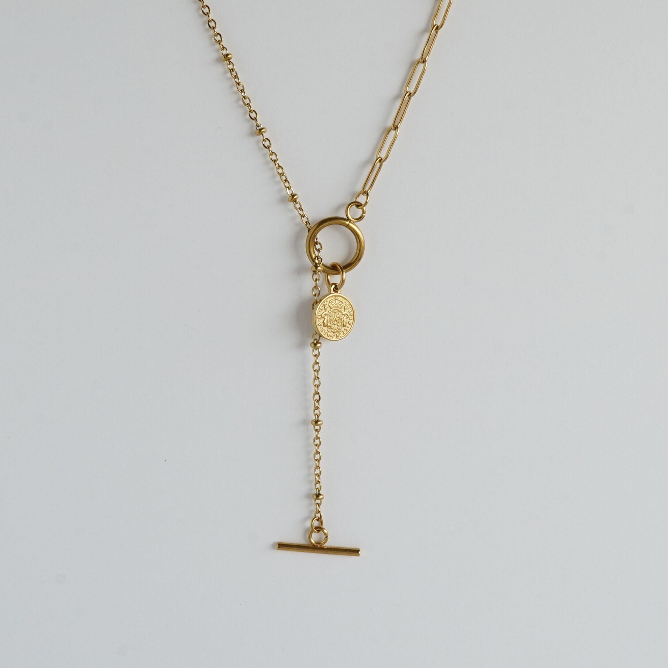 縦ラインが強調されるYチェーンネックレス。バーの部分をコインの付いているマンテルに二回からめて長めに垂らすとおしゃれな雰囲気になります。