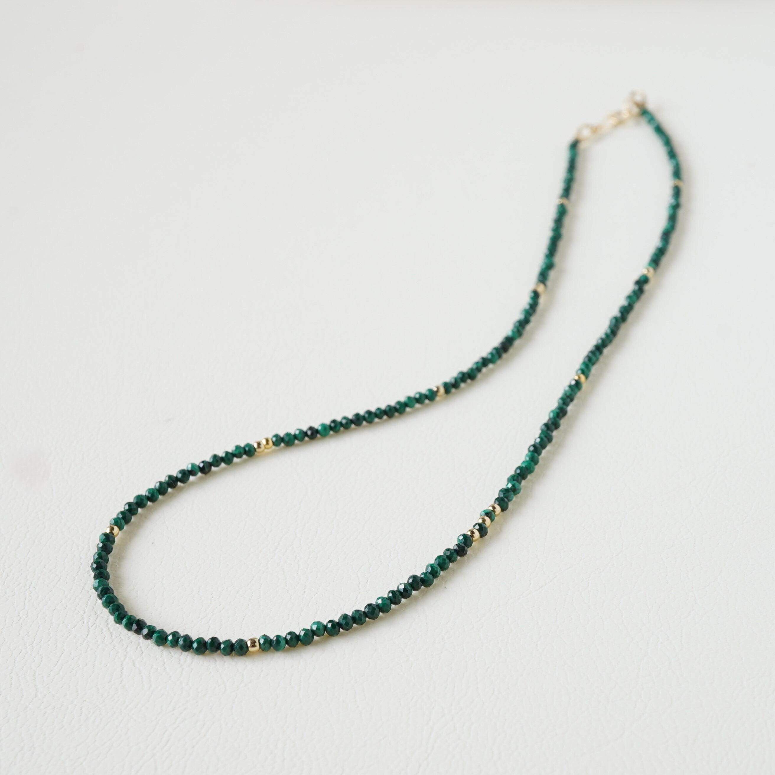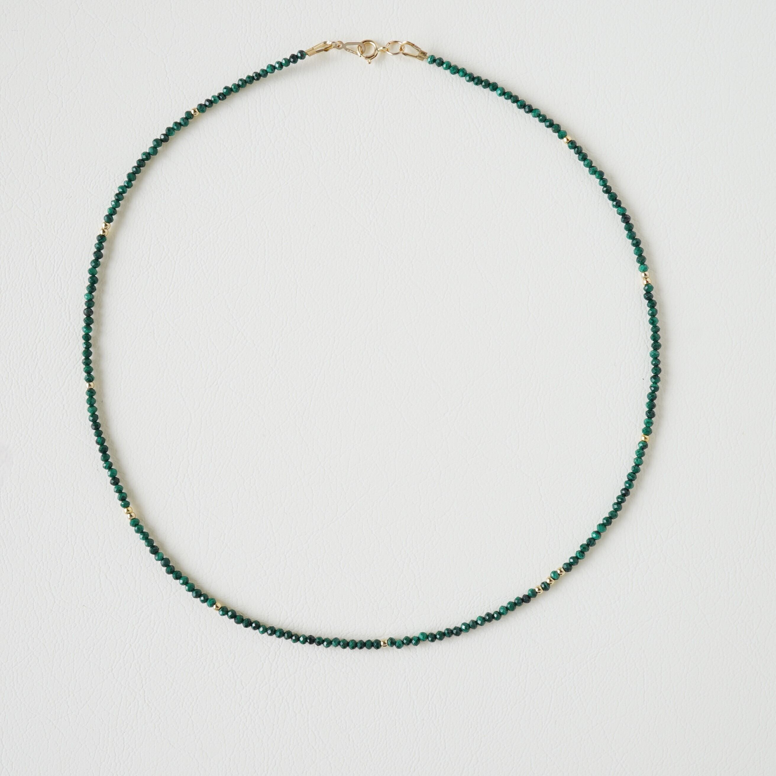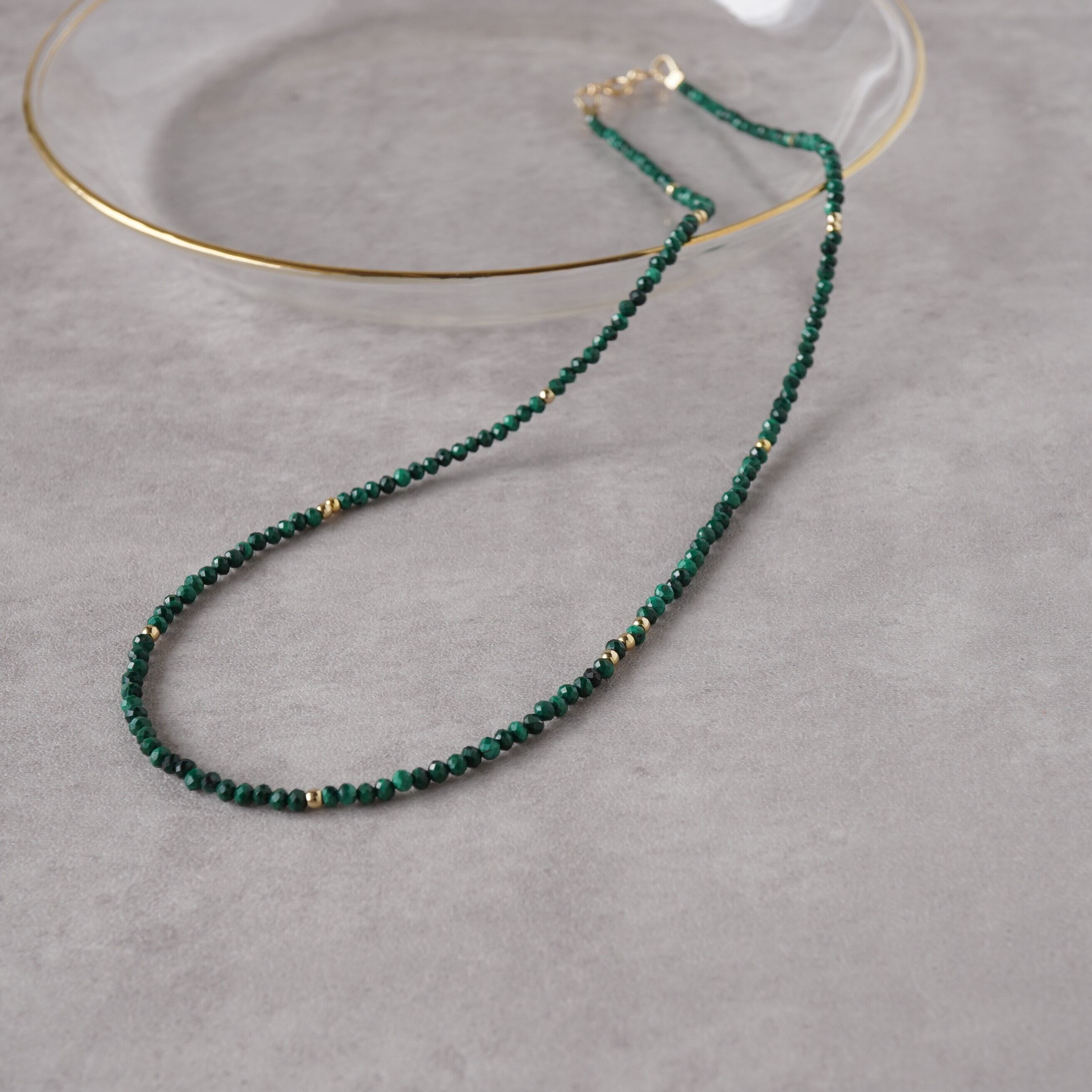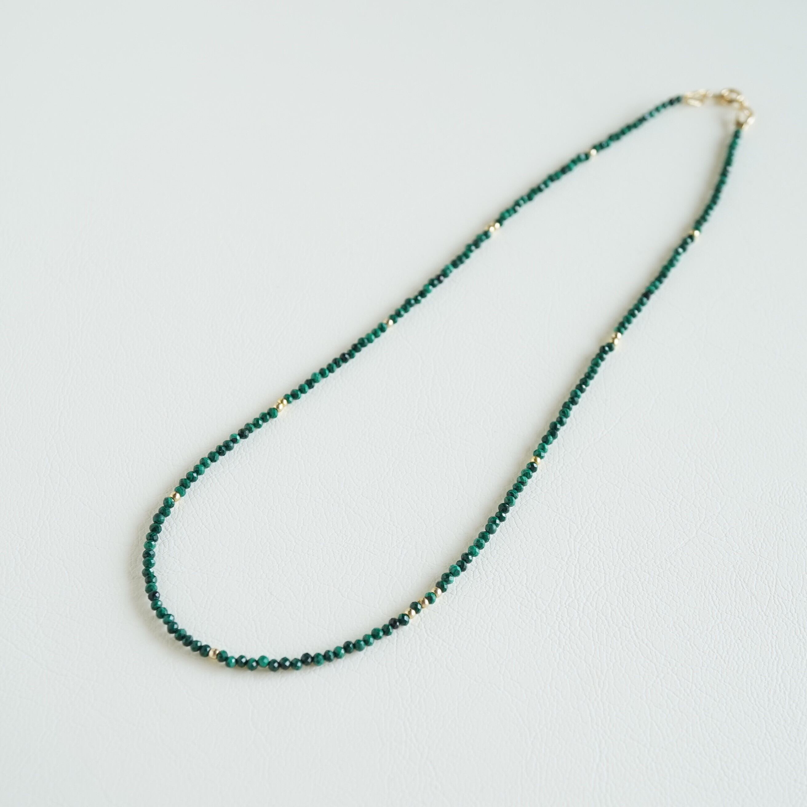 極小2㎜の本物の天然マラカイトを使用したネックレスです。マラカイトは、深みのあるグリーンと独特の縞模様が魅力的な石です。ランダムにちりばめたメタルビースがアクセント。