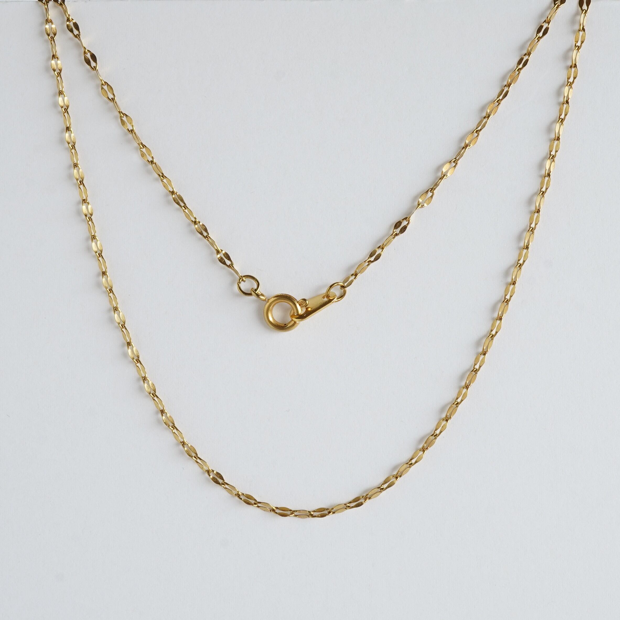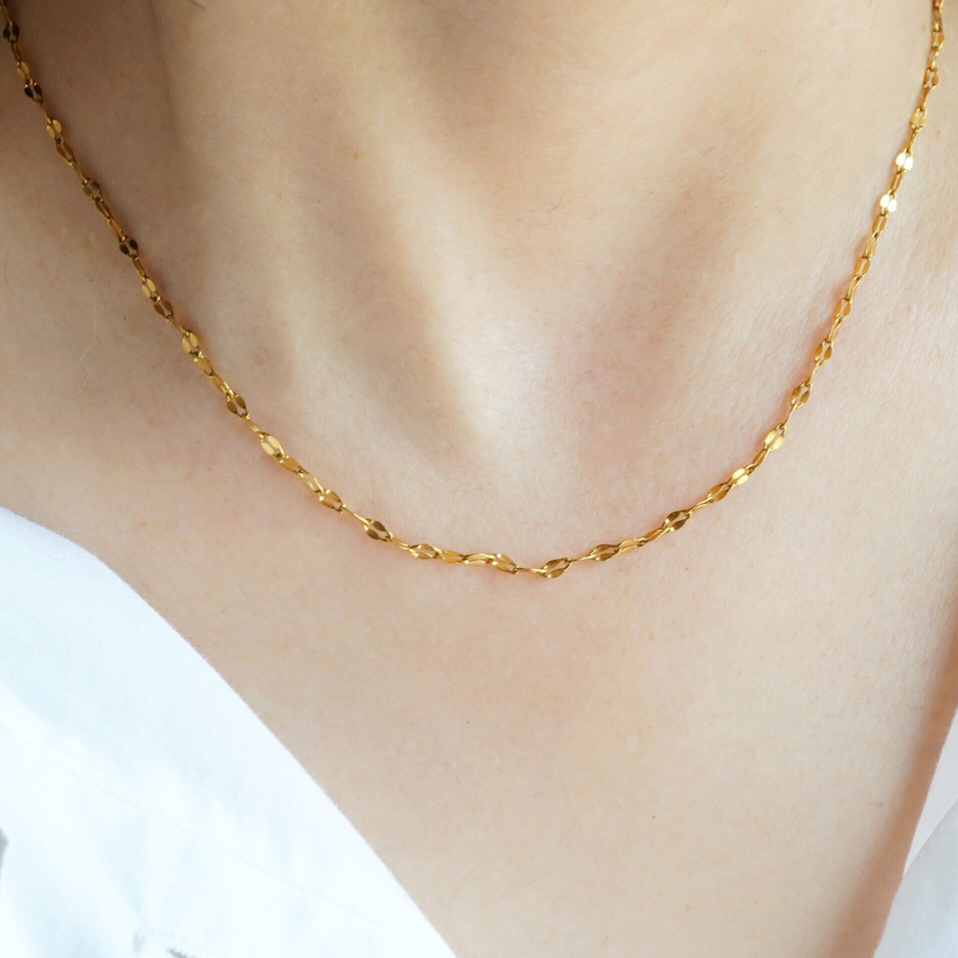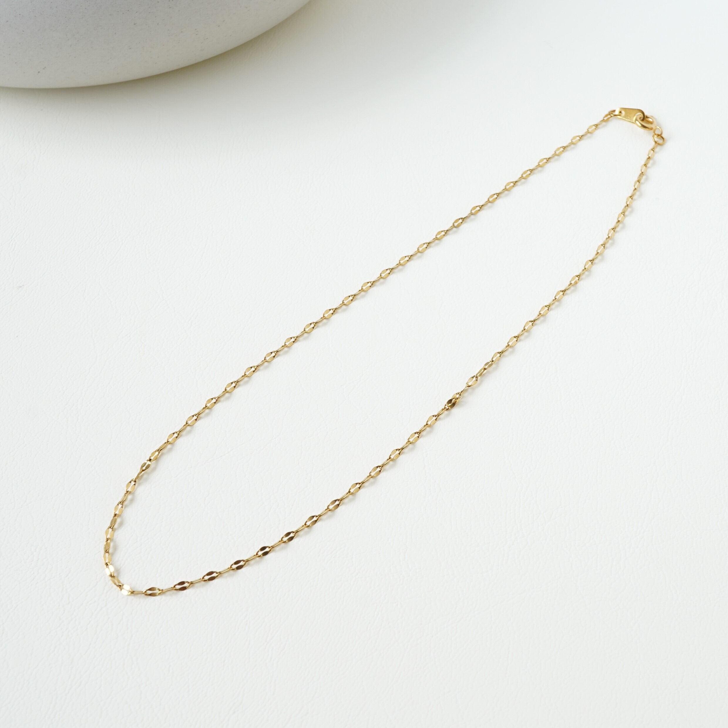 「花びら」を意味するペタルチェーンは、チェーンのひとこまの中央をつぶして面を造り、光を反射させるデザインとなっています。 面に光が集まりキラキラと輝き、繊細で上品な雰囲気を出してくれます。
