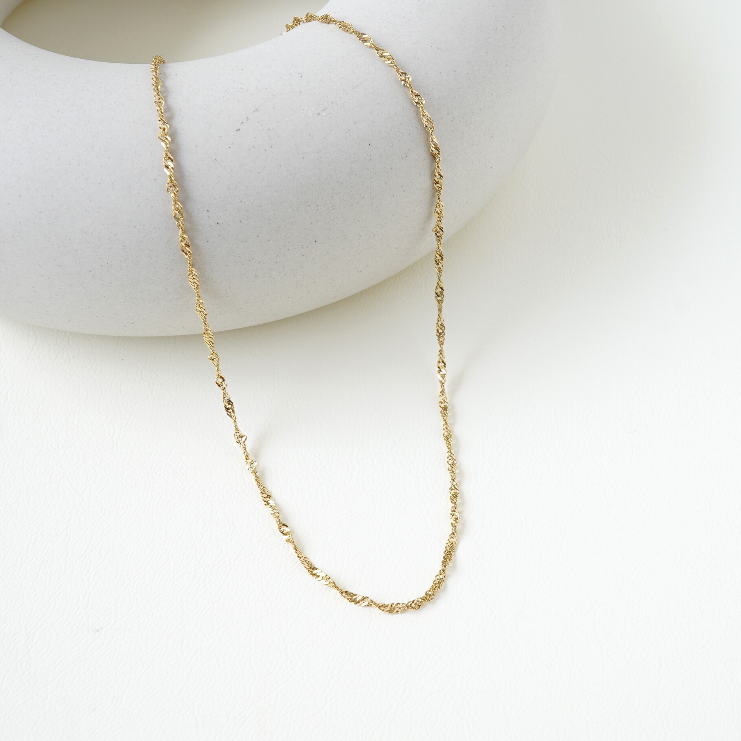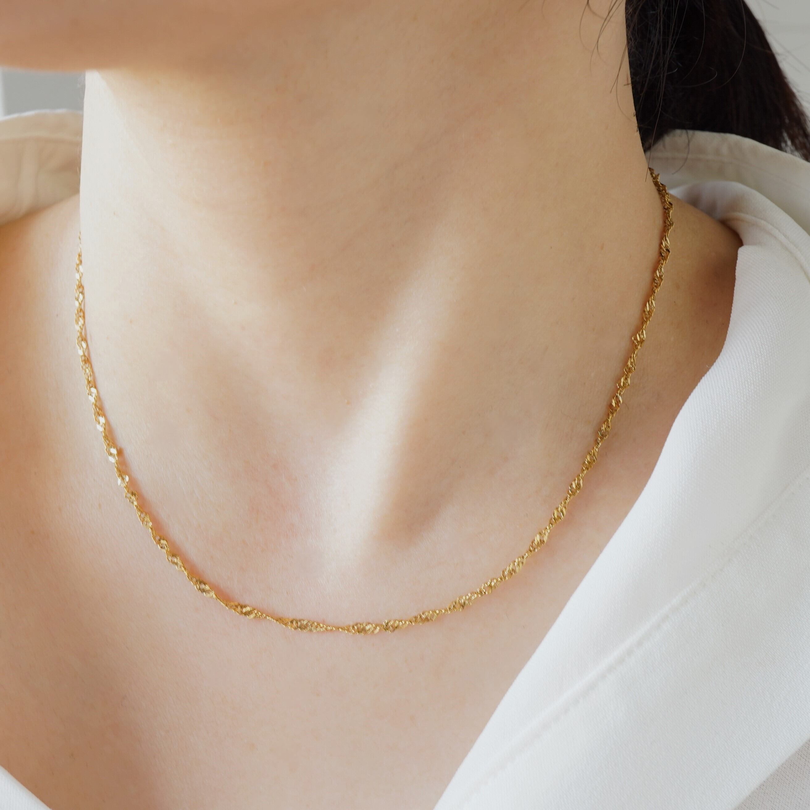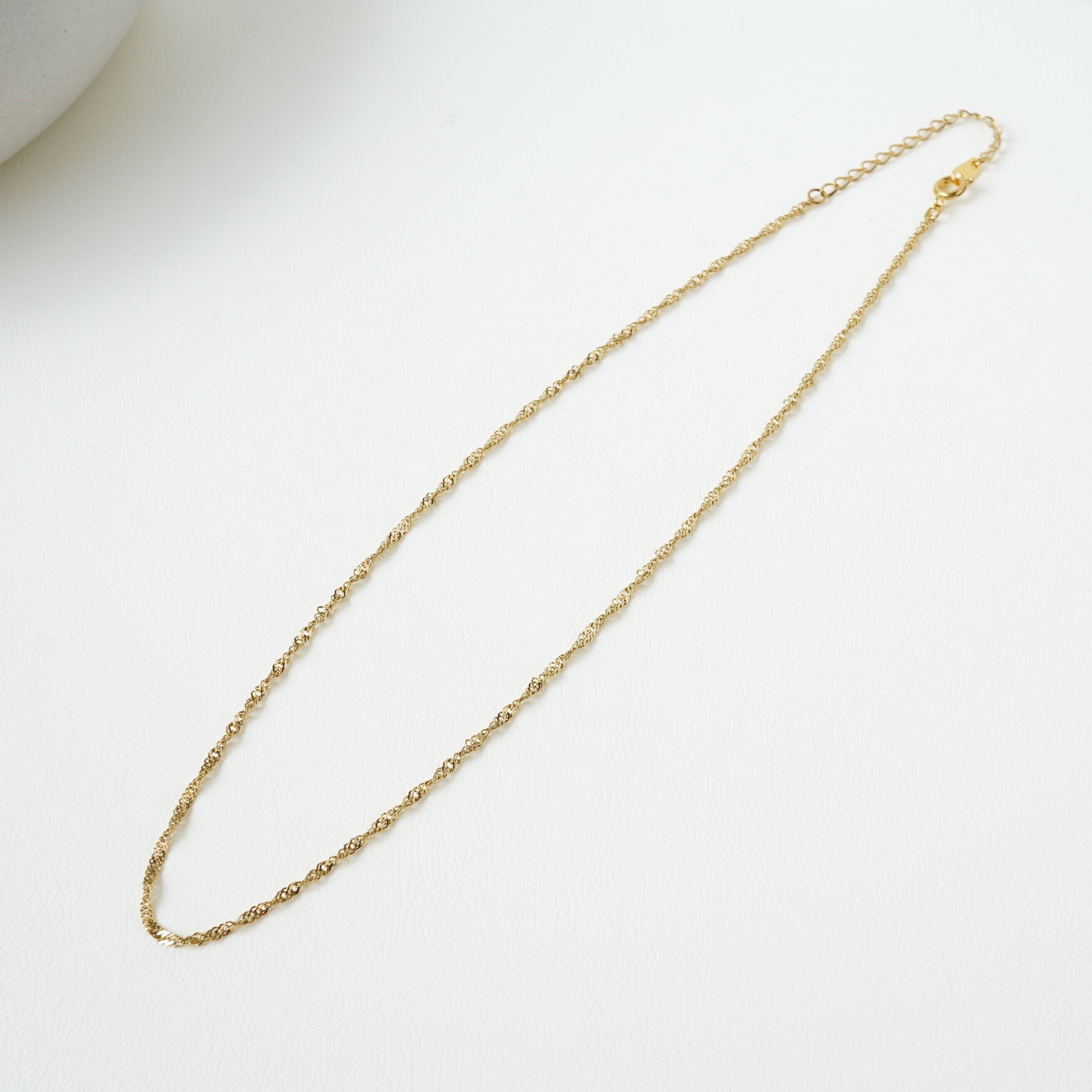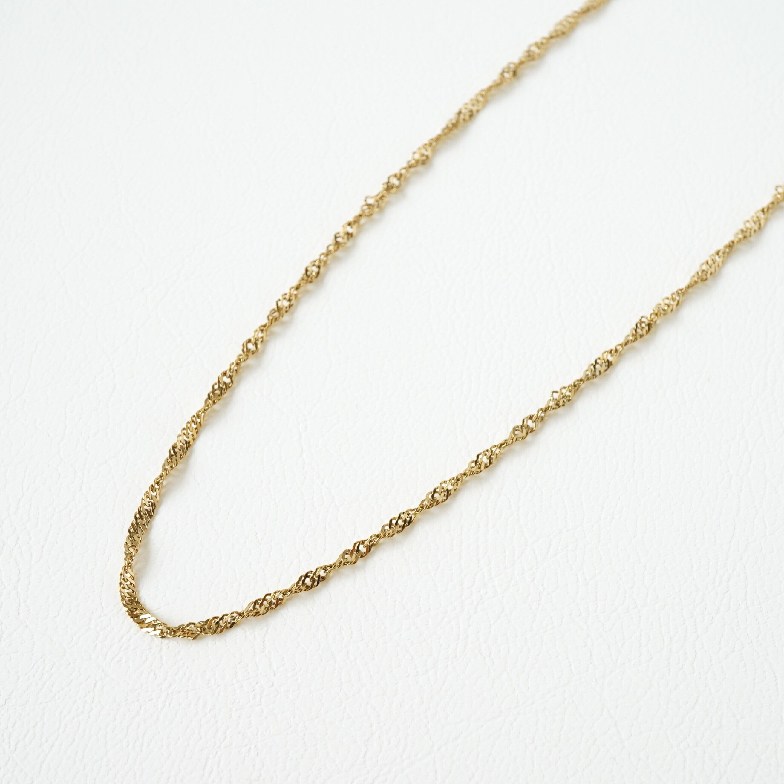 複数のチェーンが複雑かつ繊細に絡み合って独特の輝きを放つシンガポールチェーン。キラキラとしてとても綺麗。