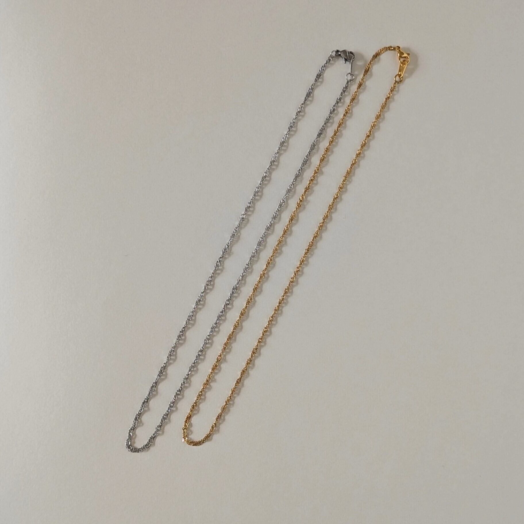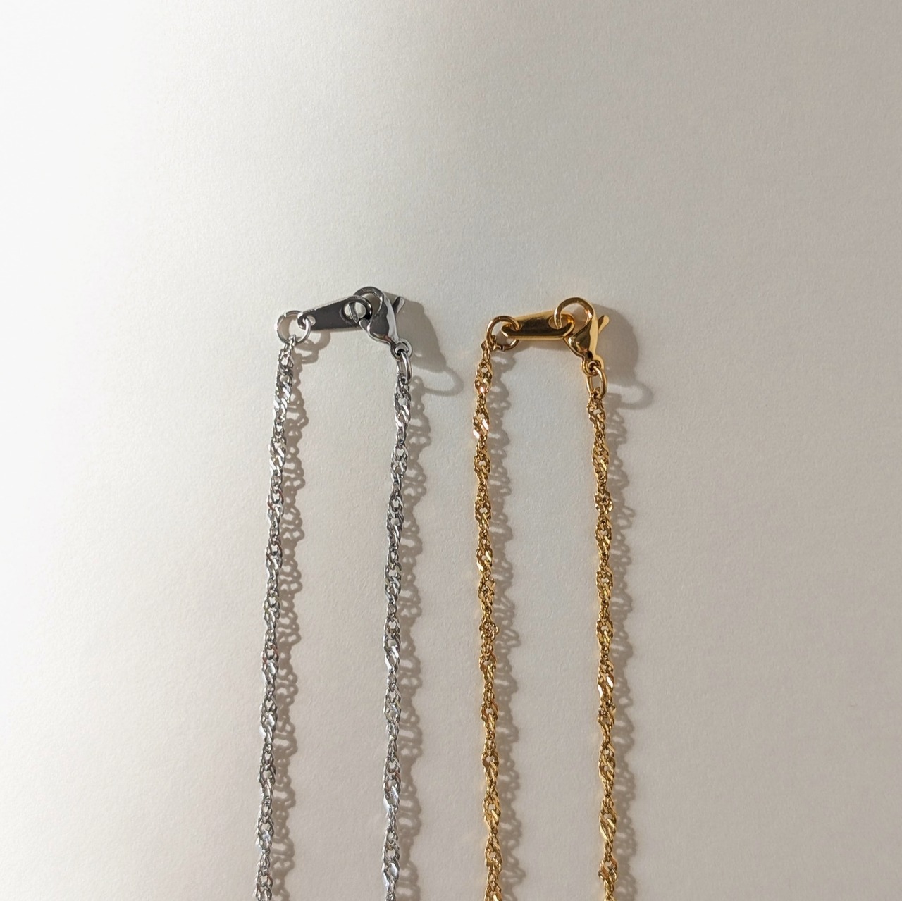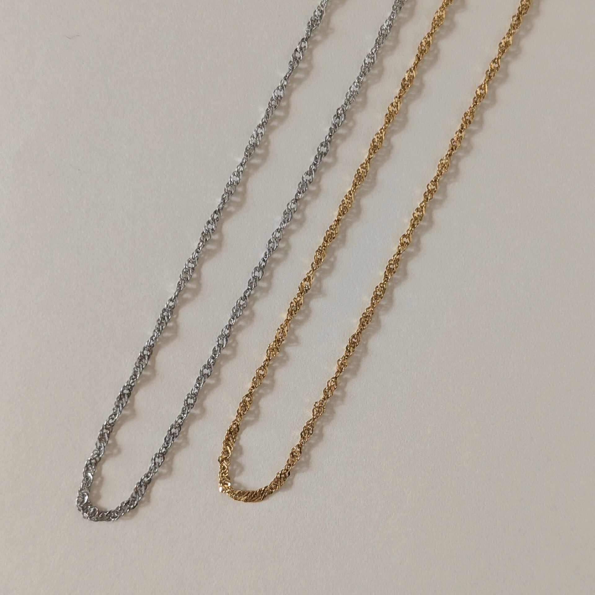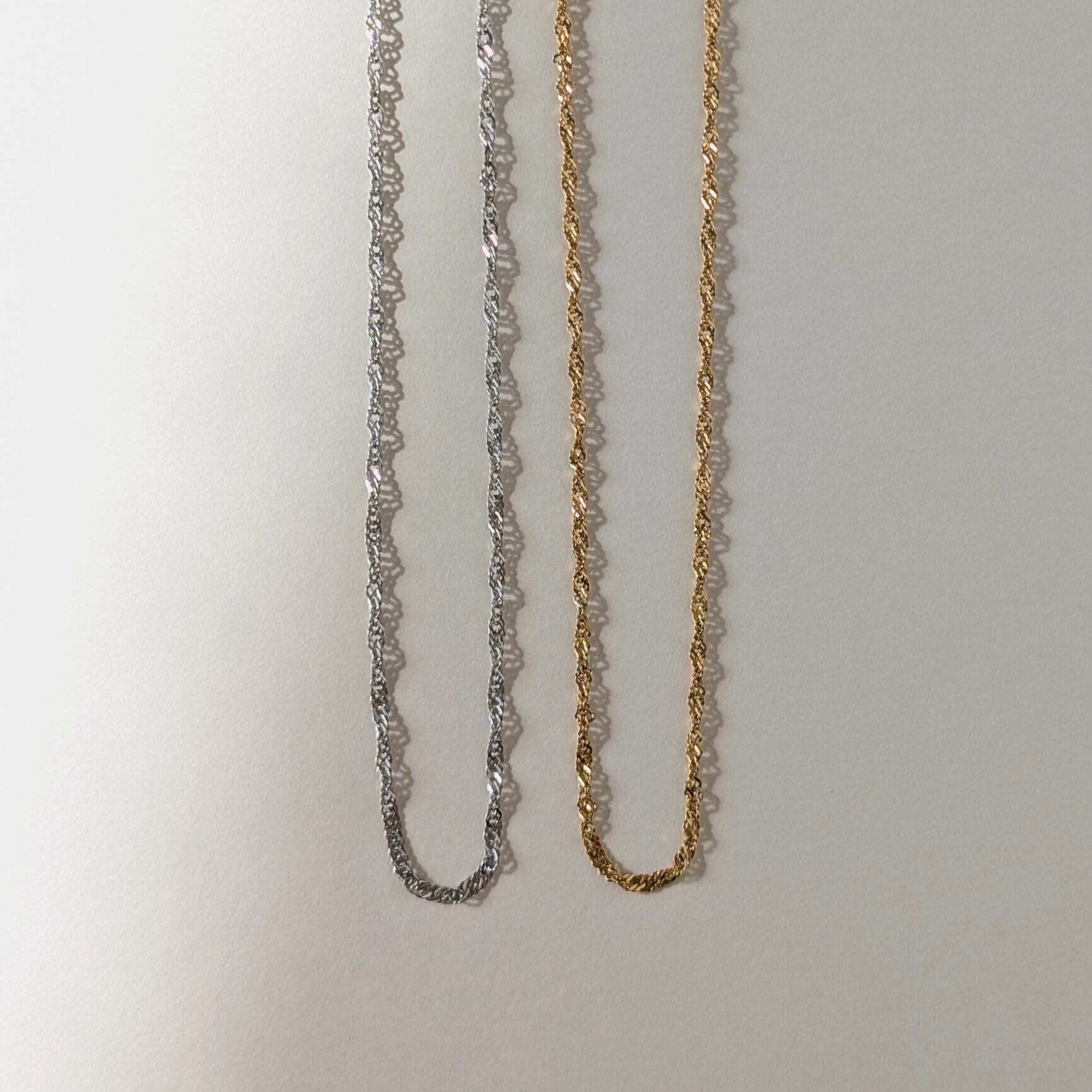 複数のチェーンが複雑かつ繊細に絡み合って独特の輝きを放つシンガポールチェーン。キラキラとしてとても綺麗。ゴールド/シルバーよりお選びいただけます。