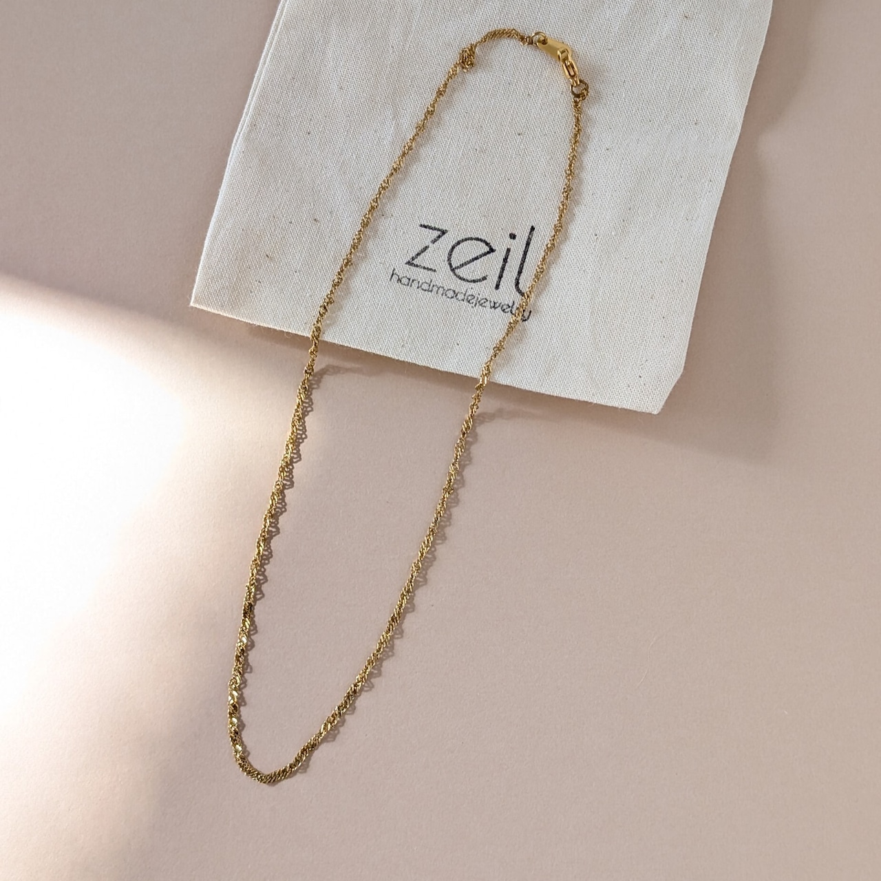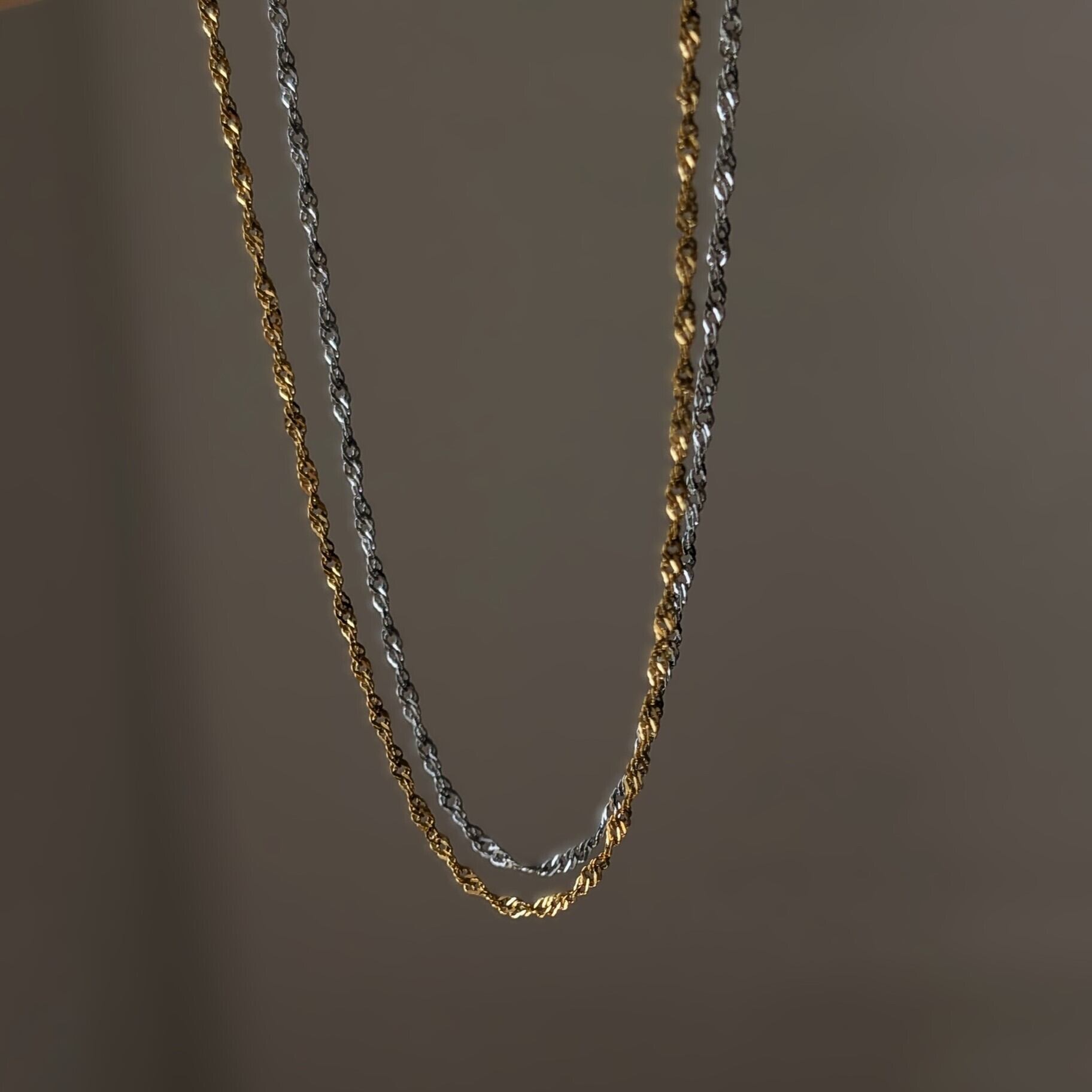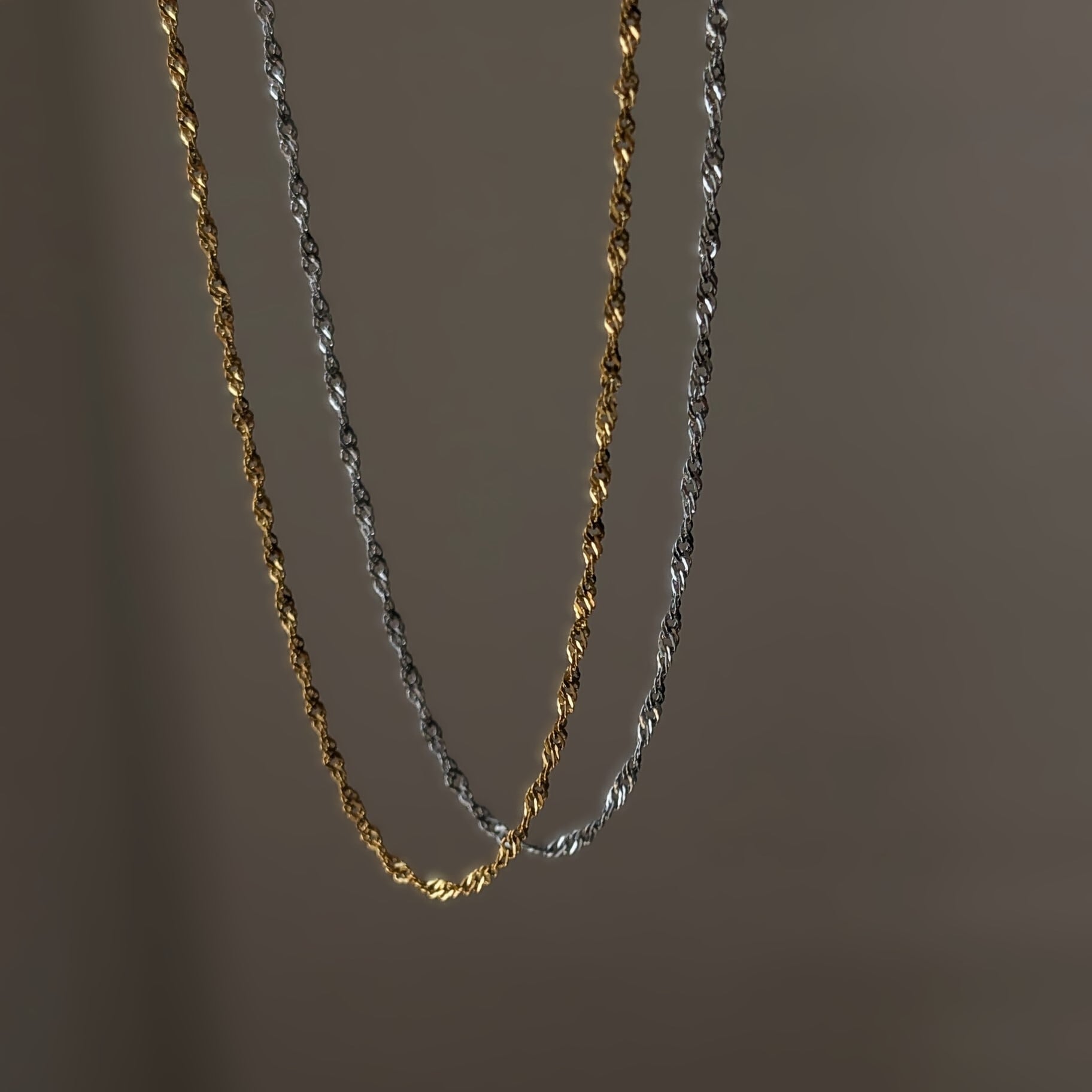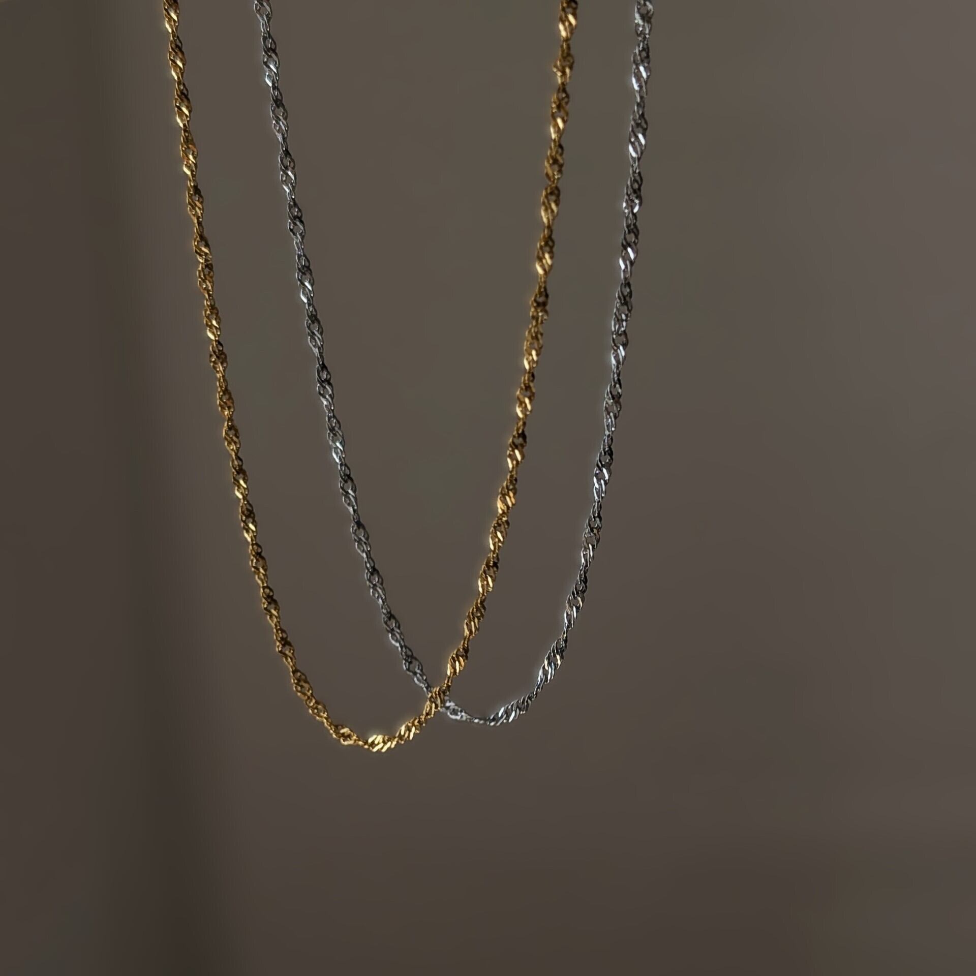 複数のチェーンが複雑かつ繊細に絡み合って独特の輝きを放つシンガポールチェーン。キラキラとしてとても綺麗。ゴールド/シルバーよりお選びいただけます。