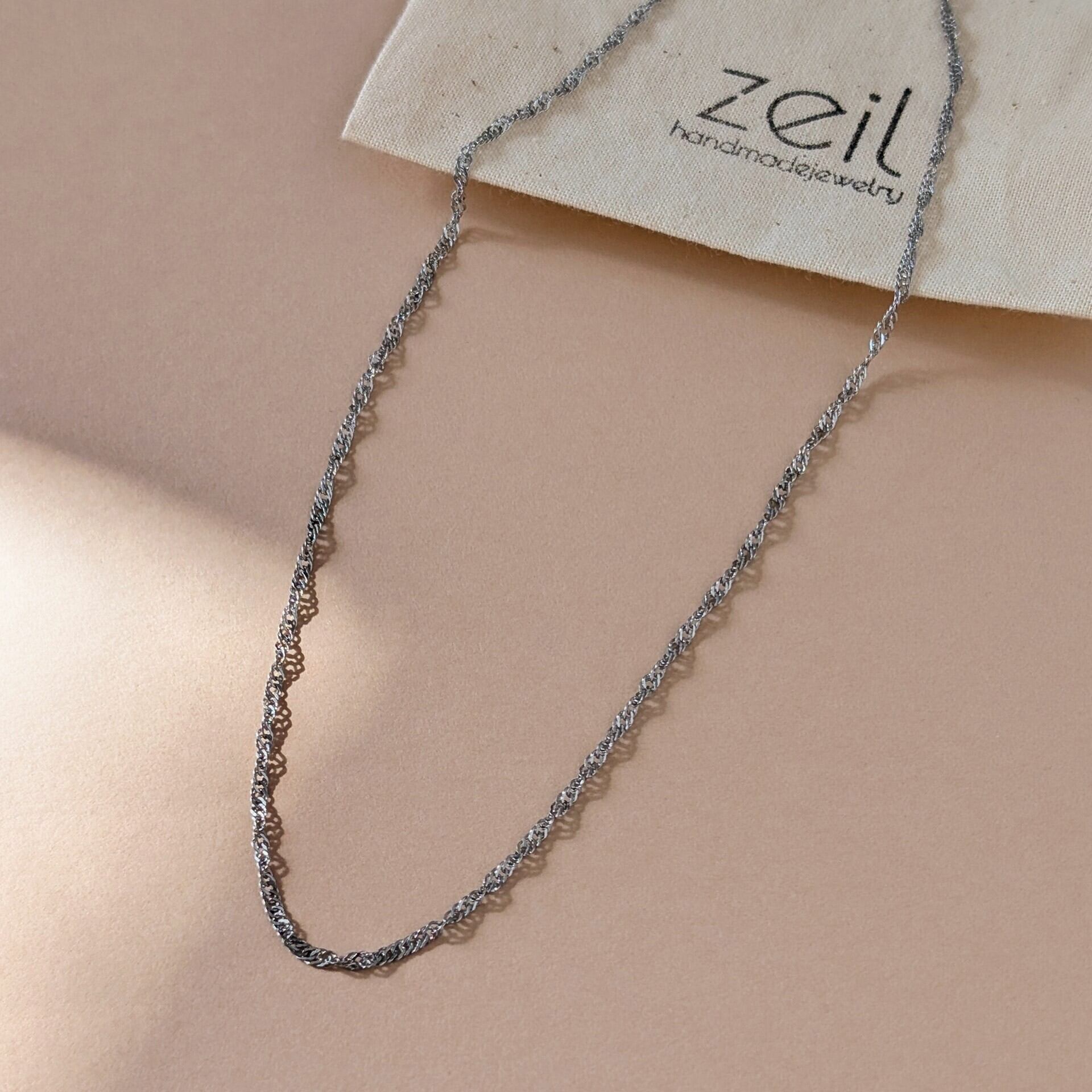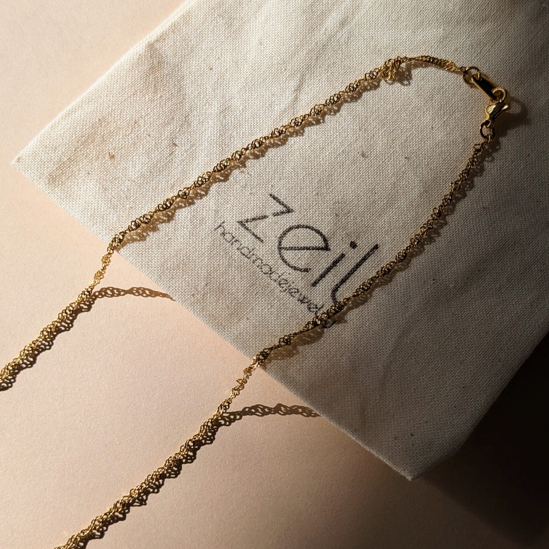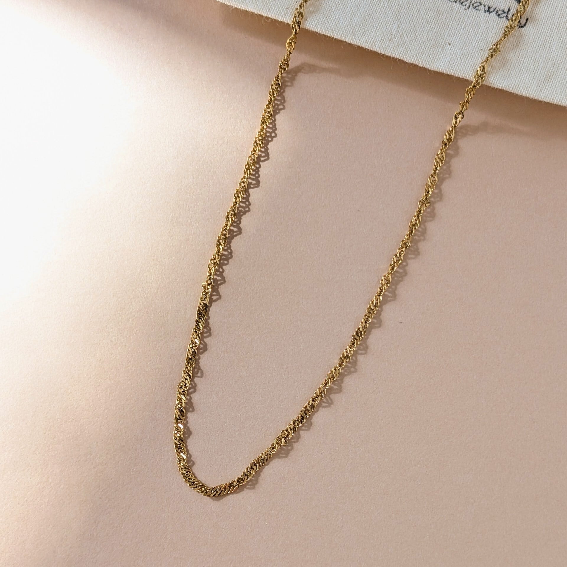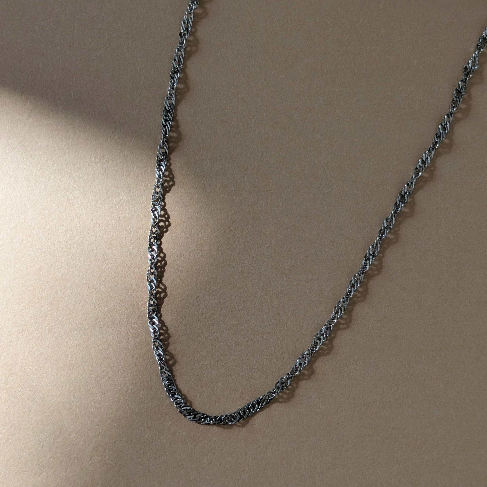 複数のチェーンが複雑かつ繊細に絡み合って独特の輝きを放つシンガポールチェーン。キラキラとしてとても綺麗。ゴールド/シルバーよりお選びいただけます。