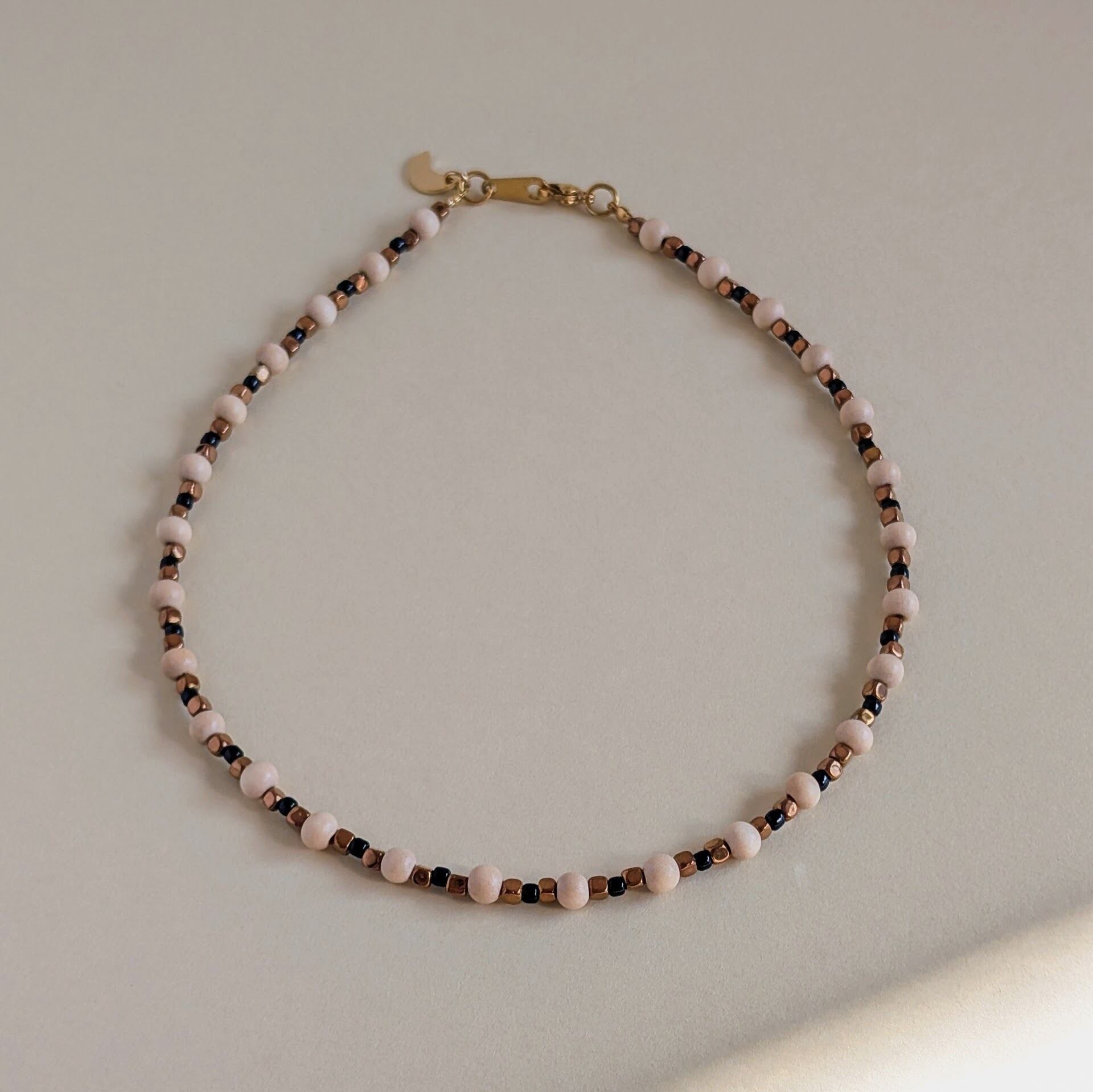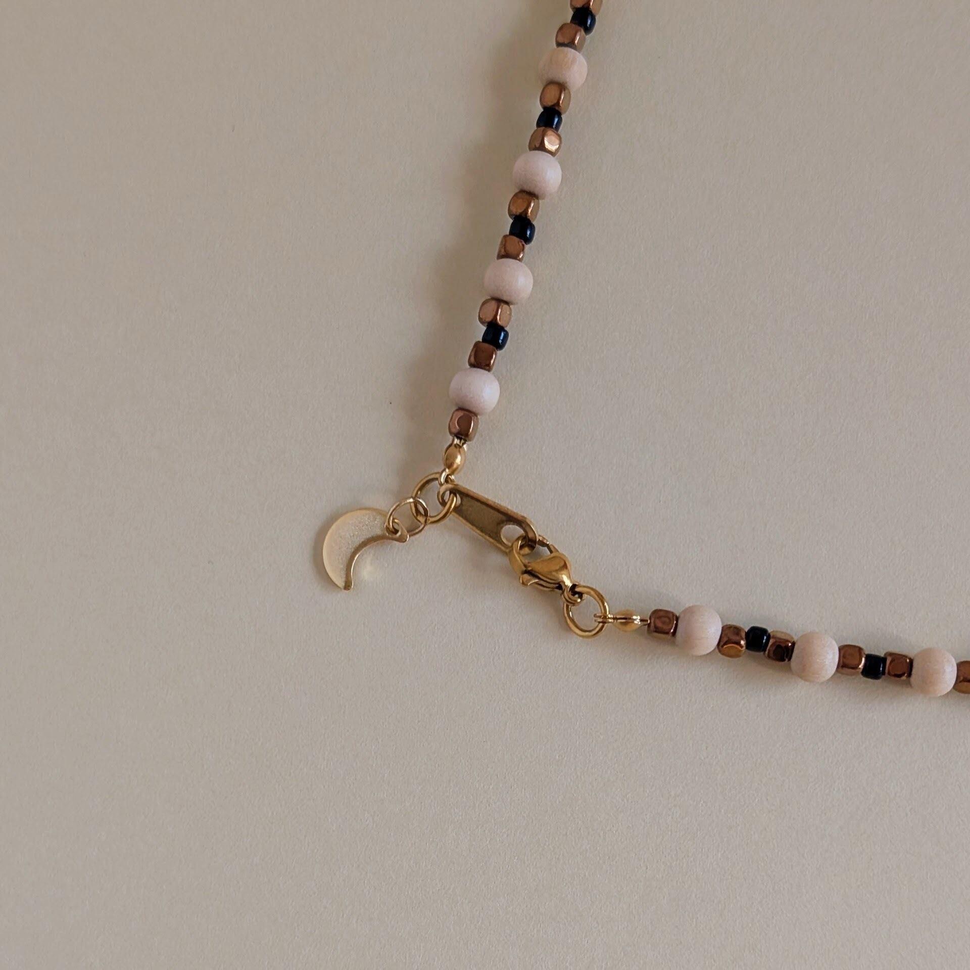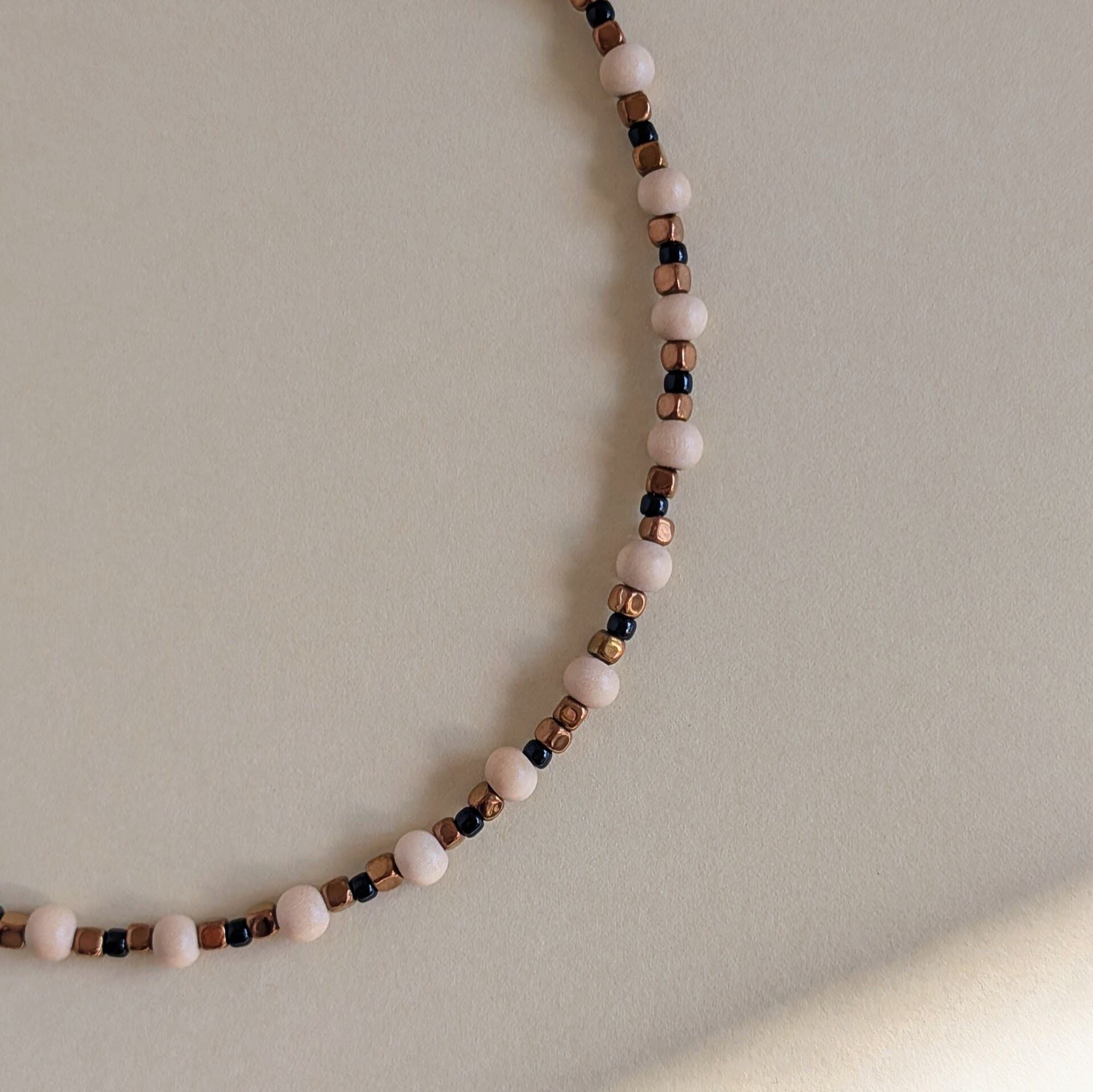 ウッドビーズにヘマタイトを組み合わせたネックレスです。