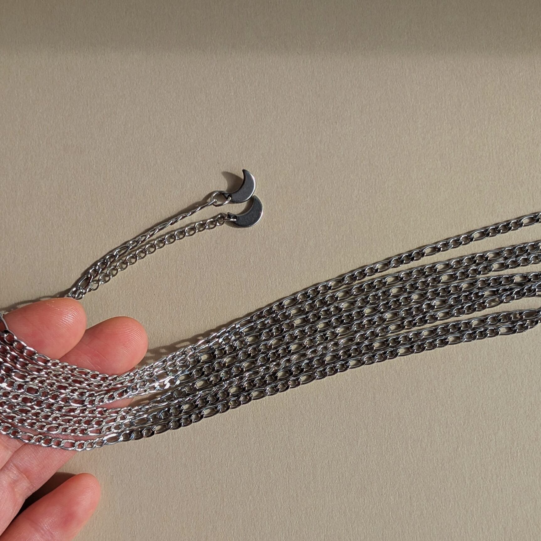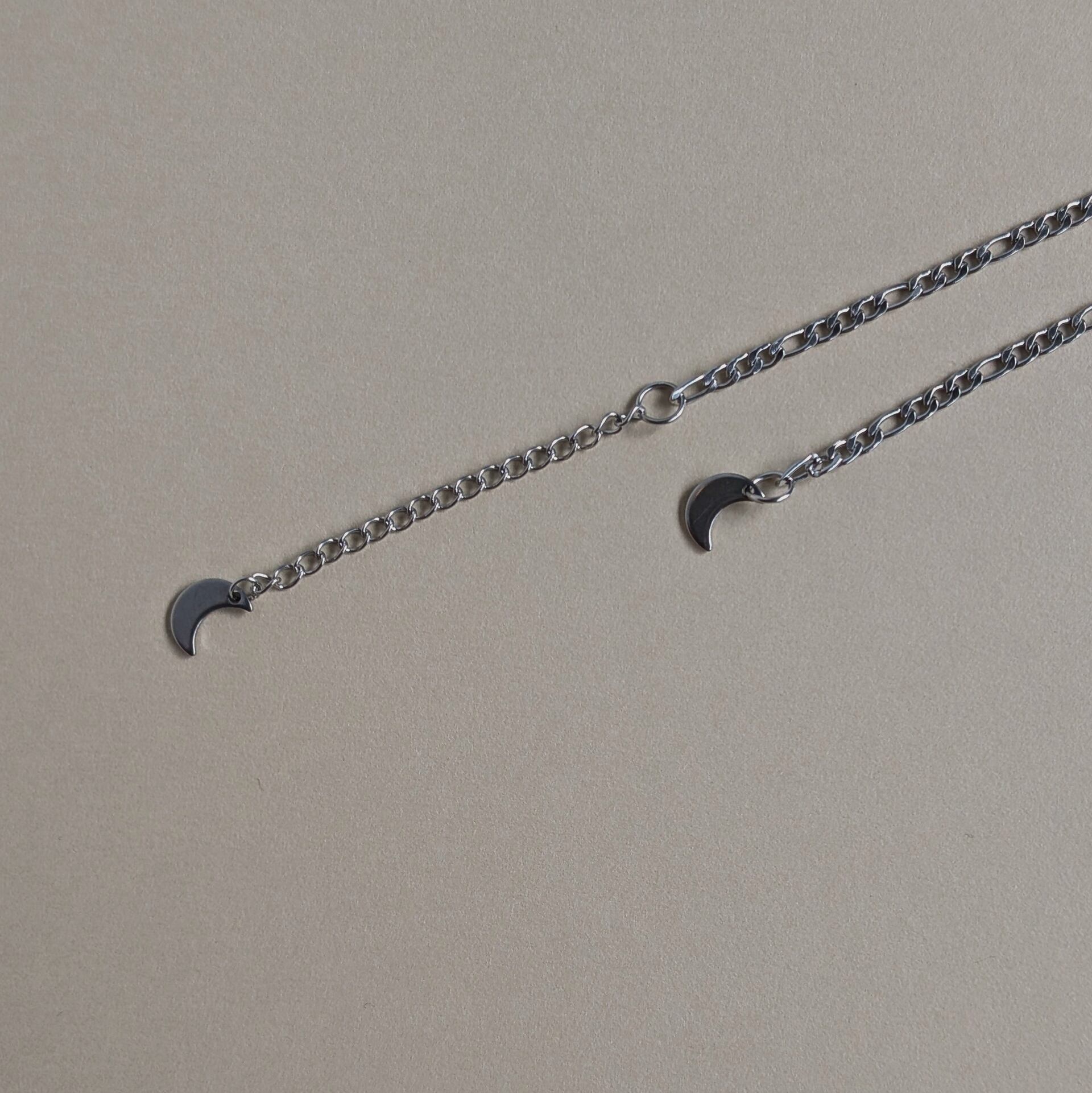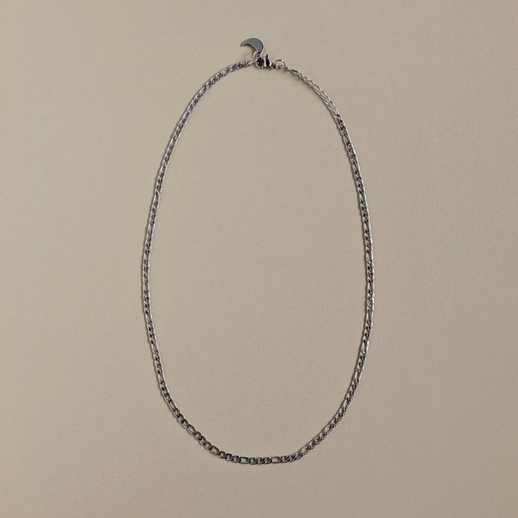 3㎜幅。フィガロチェーンの中では細めなので、強い印象になりすぎず、使いやすいです。月のチャームがアクセント。