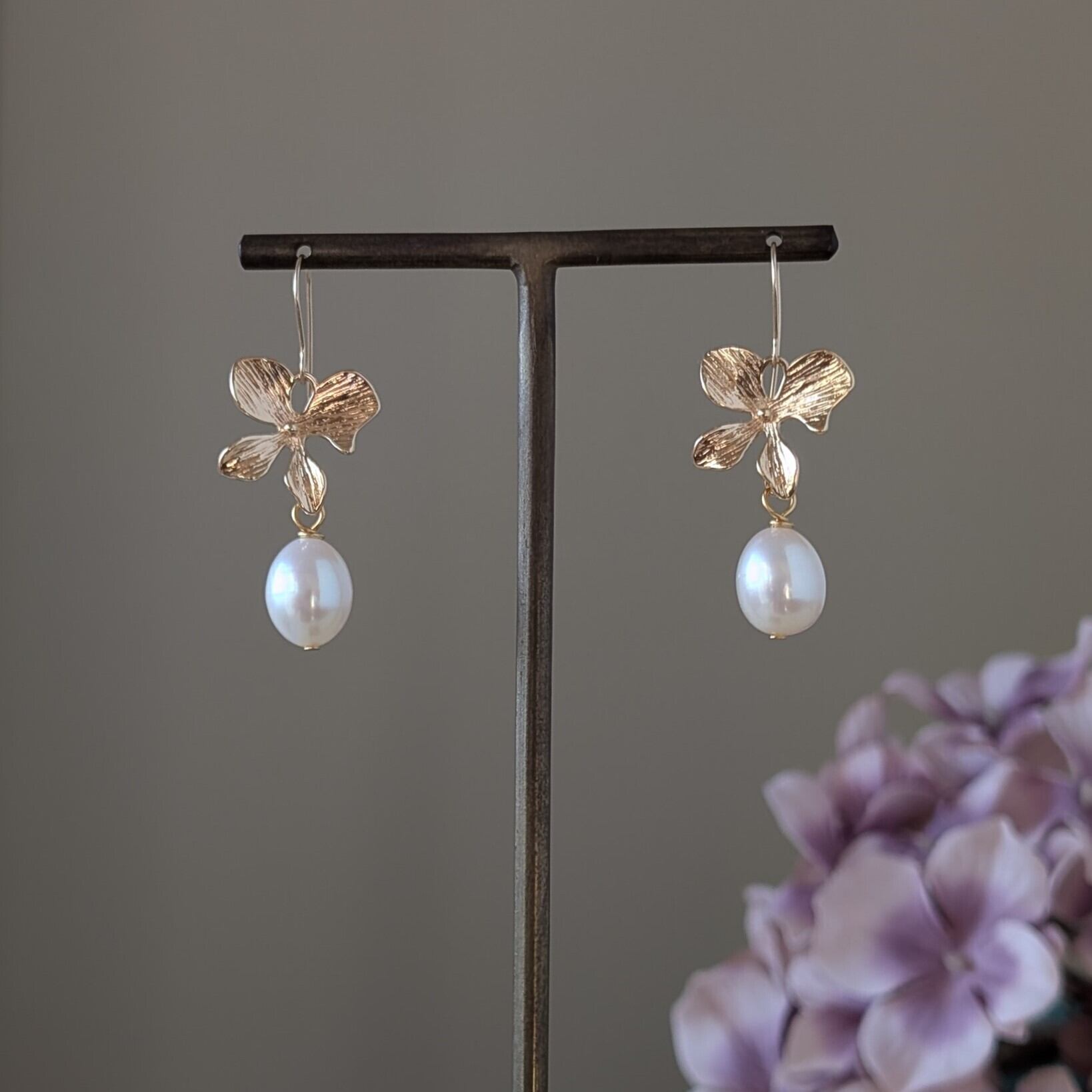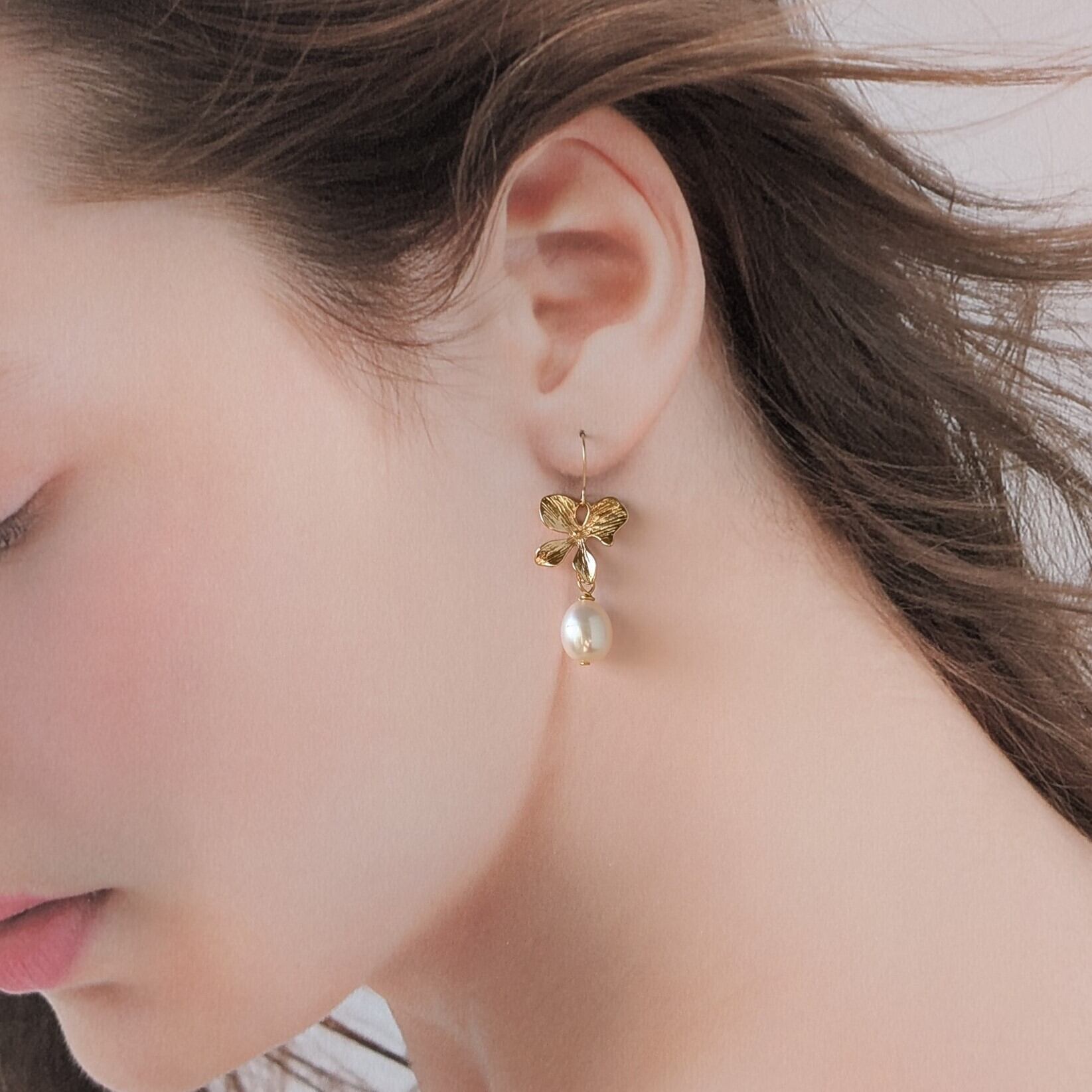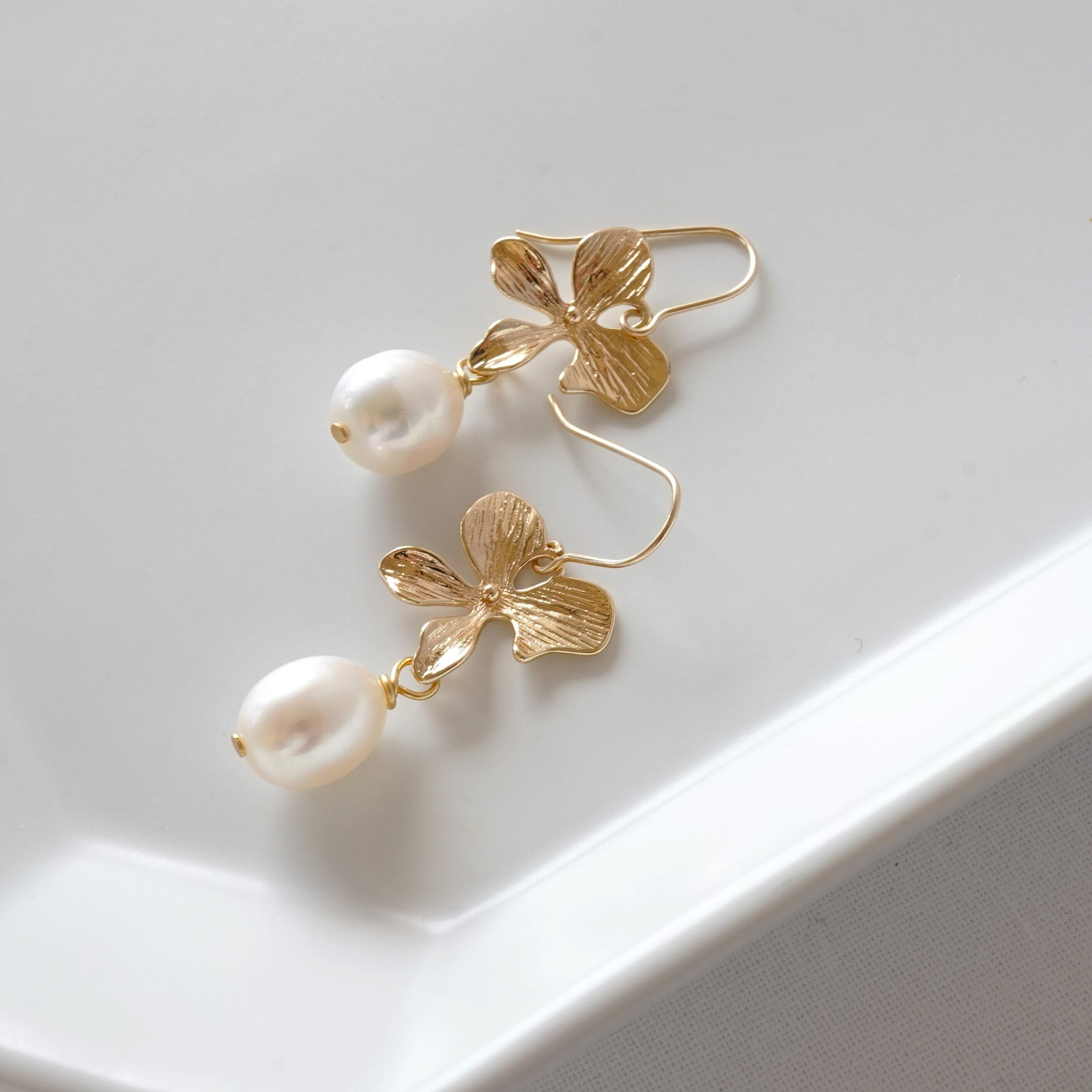 【14kgf製ピアス】高品質淡水パール メタル フラワー パールピアス お花のピアス