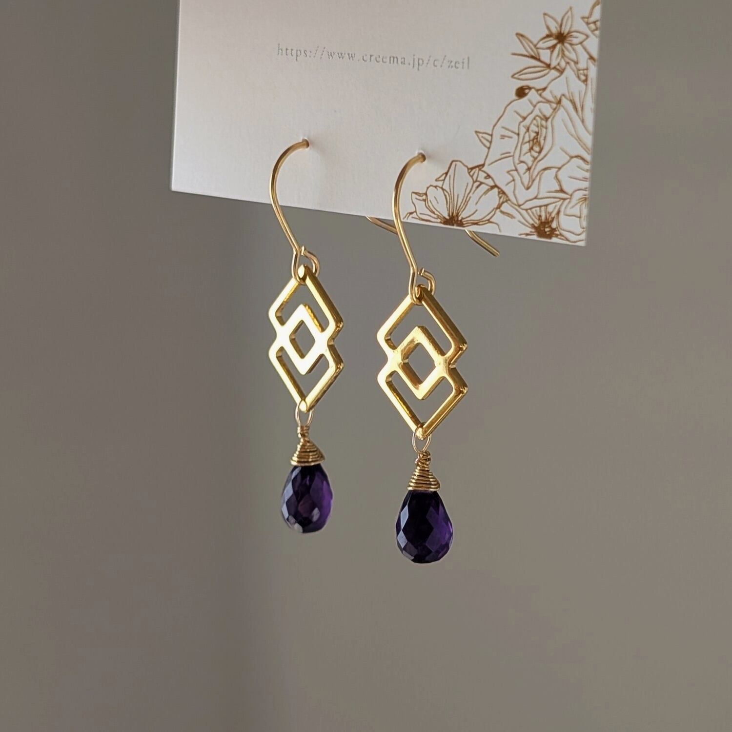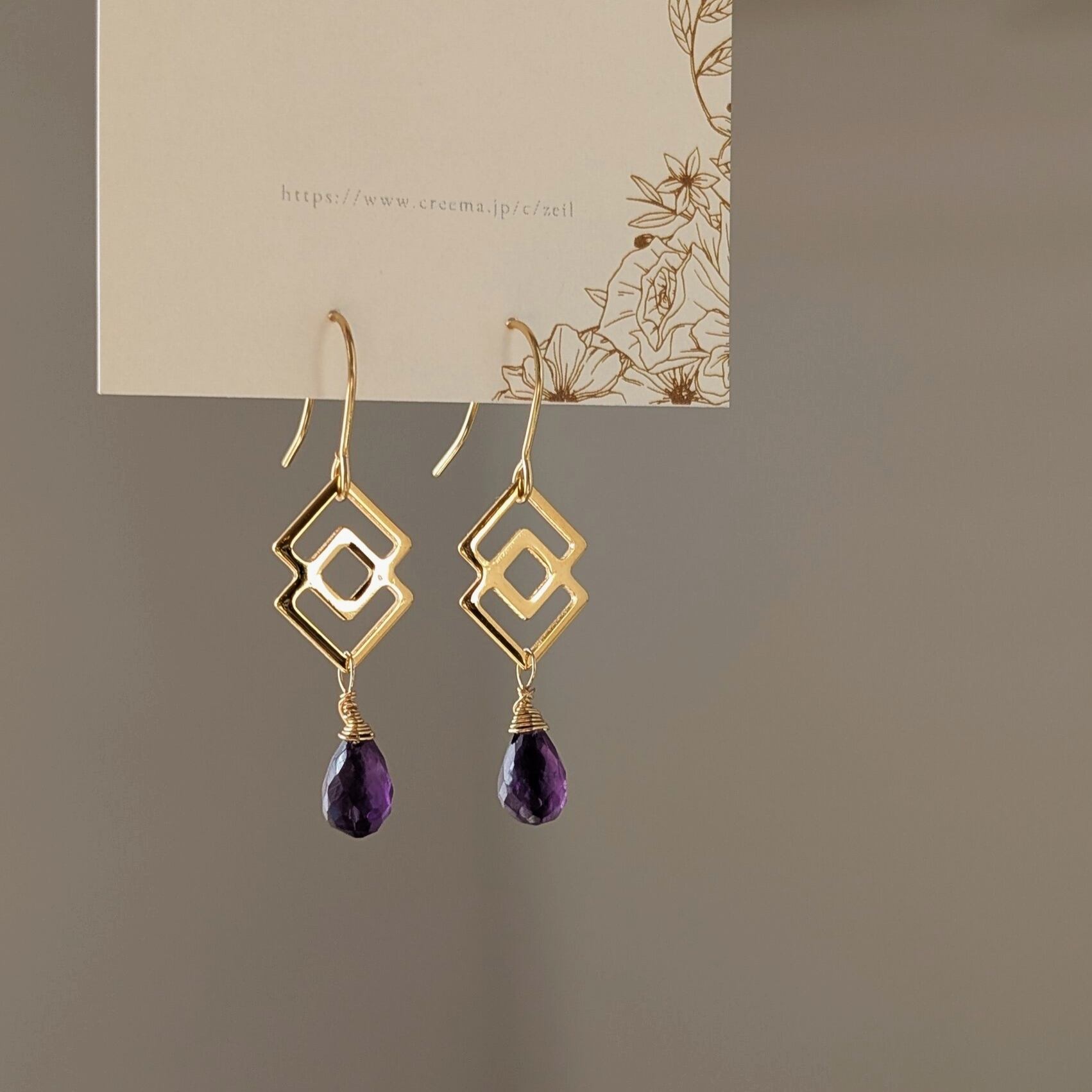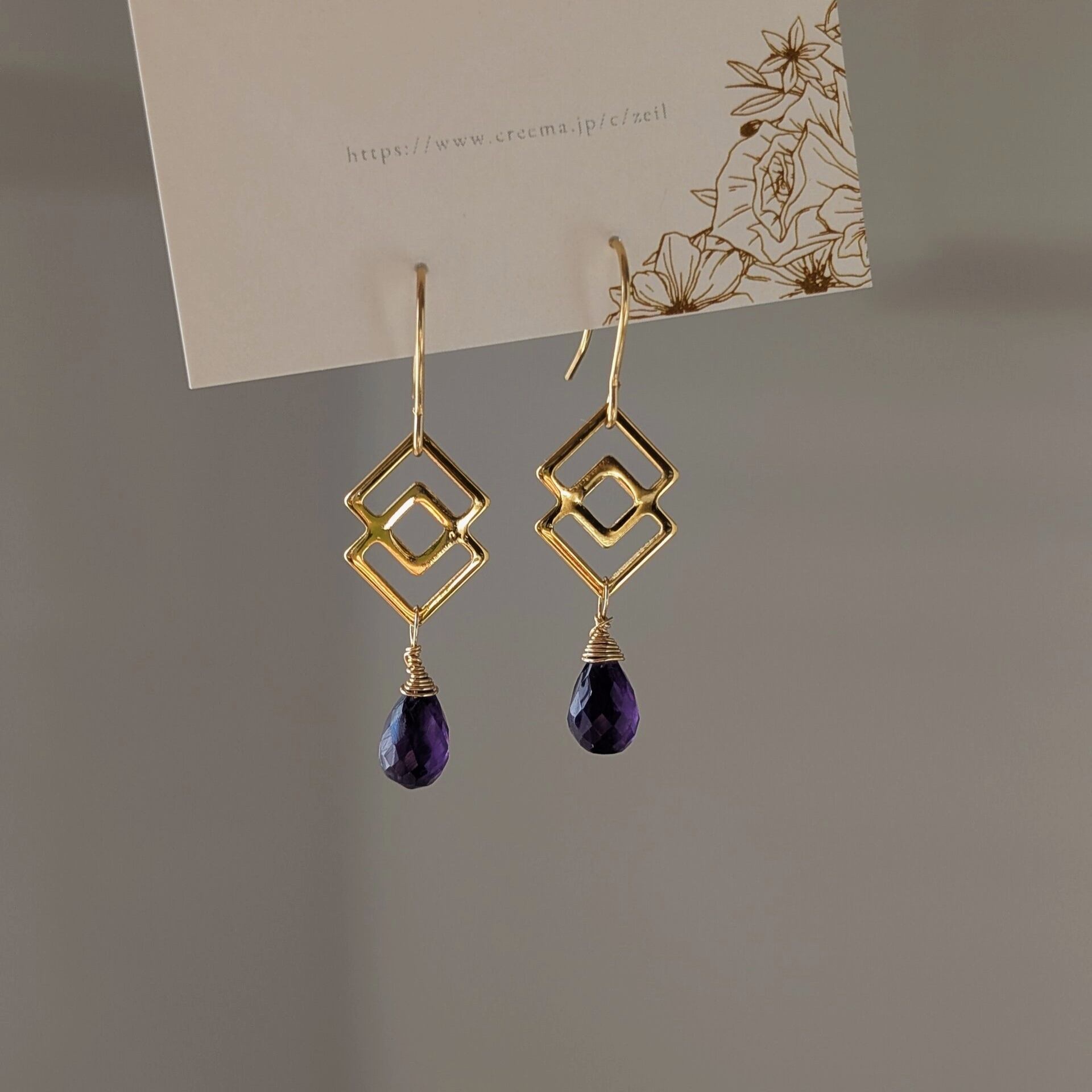 ザンビア産、宝石質アメジストのドロップカットを使用したピアスです。 透明感があり、濃く深い色合いにカットの輝きが映えます。