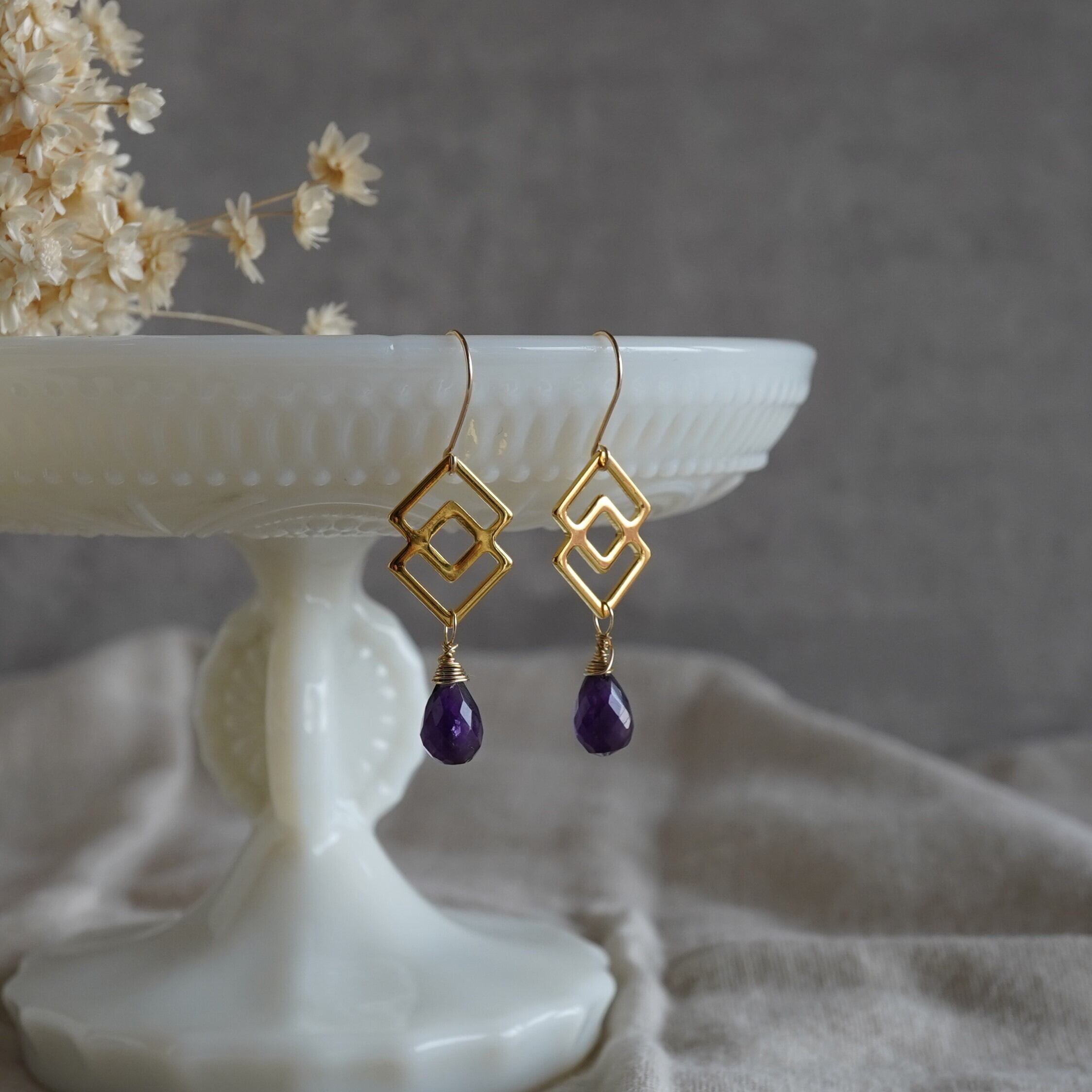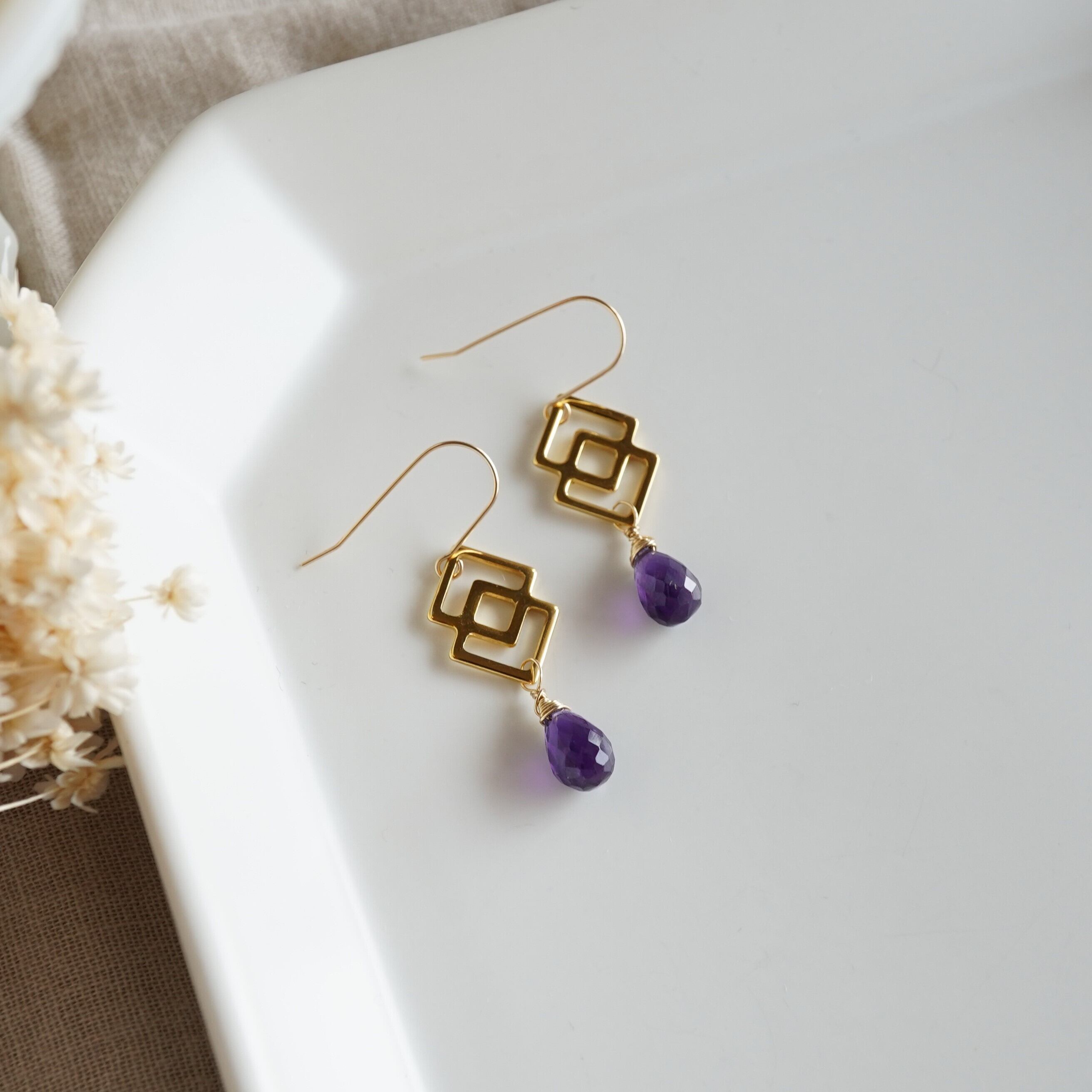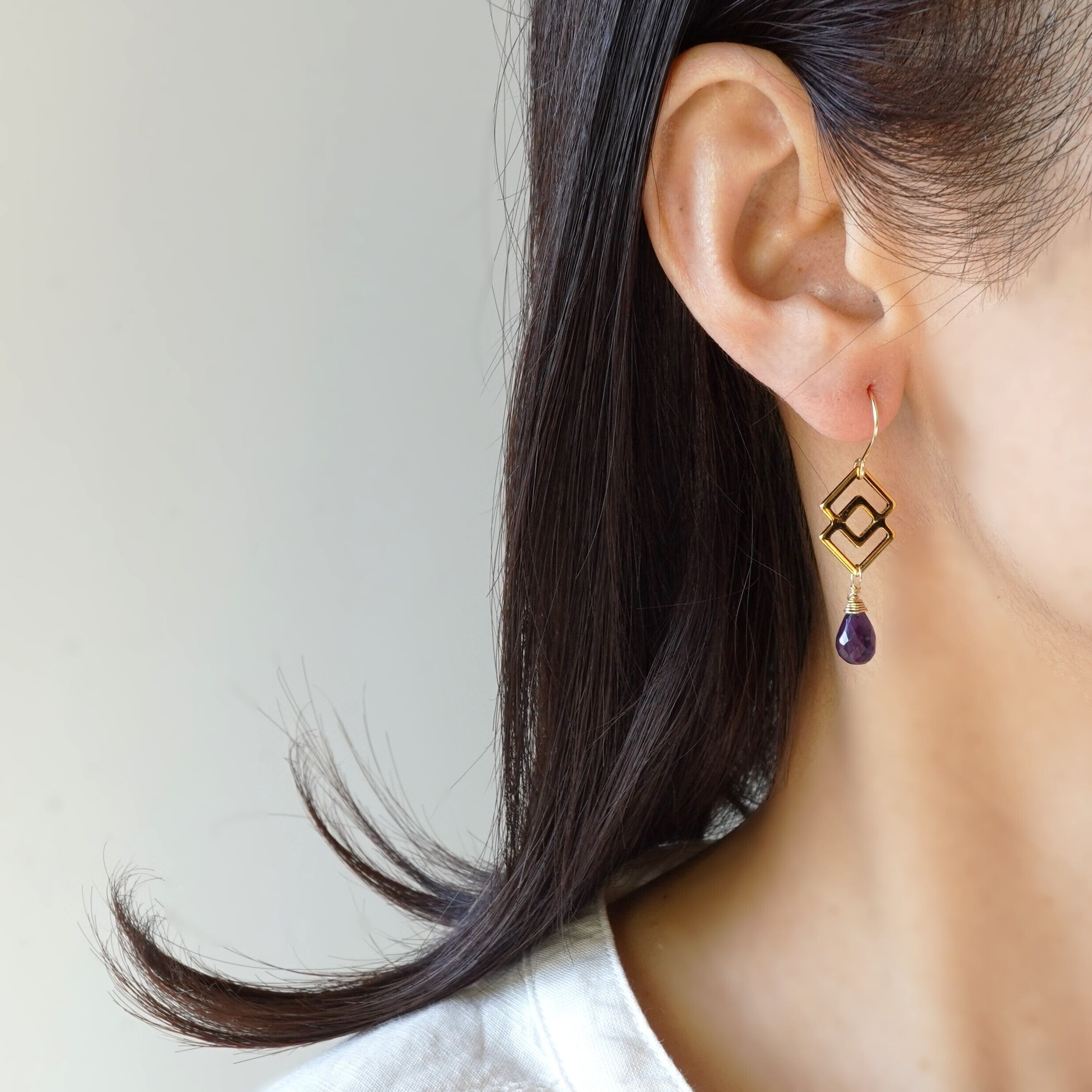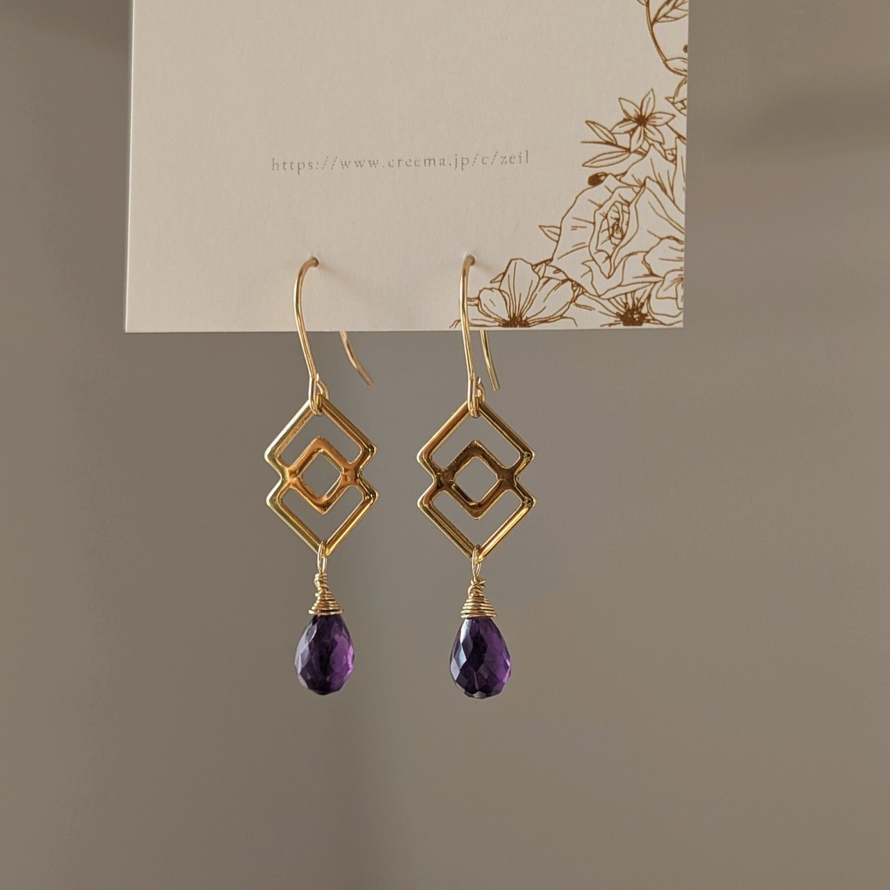 ザンビア産、宝石質アメジストのドロップカットを使用したピアスです。 透明感があり、濃く深い色合いにカットの輝きが映えます。
