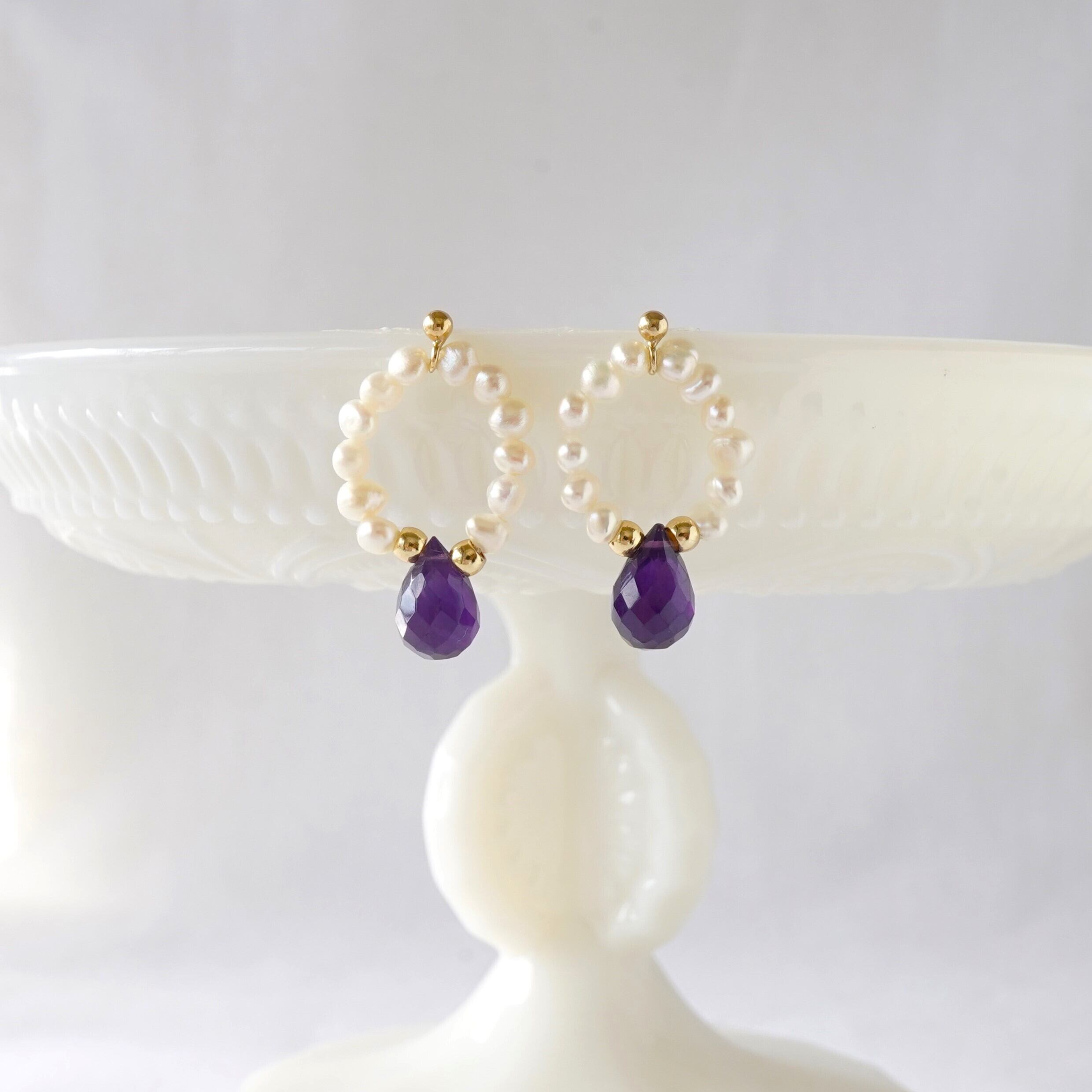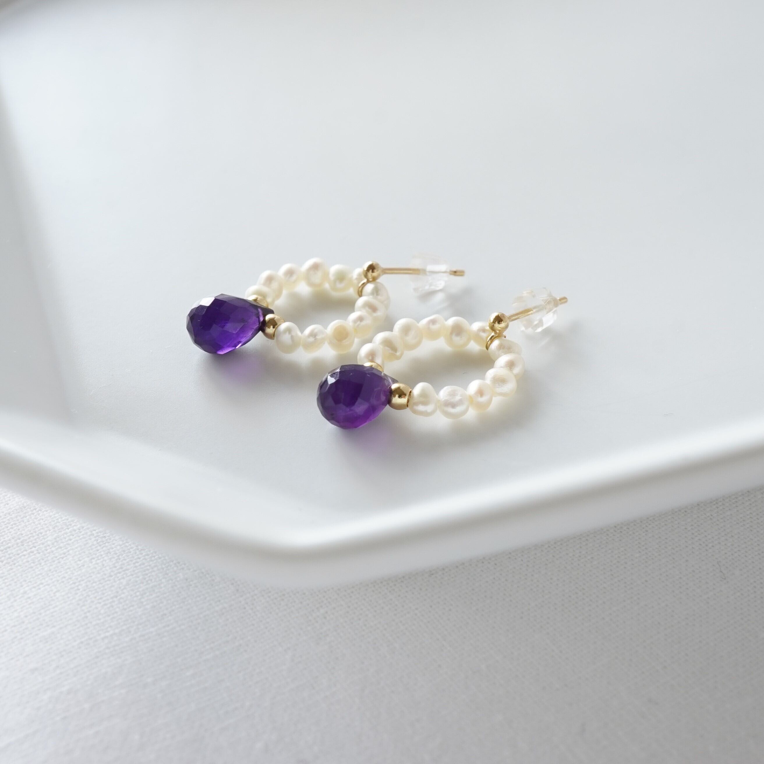 #天然石ピアス #14kgf #アメジスト #ドロップ #上品ピアス #淡水パール #フープピアス