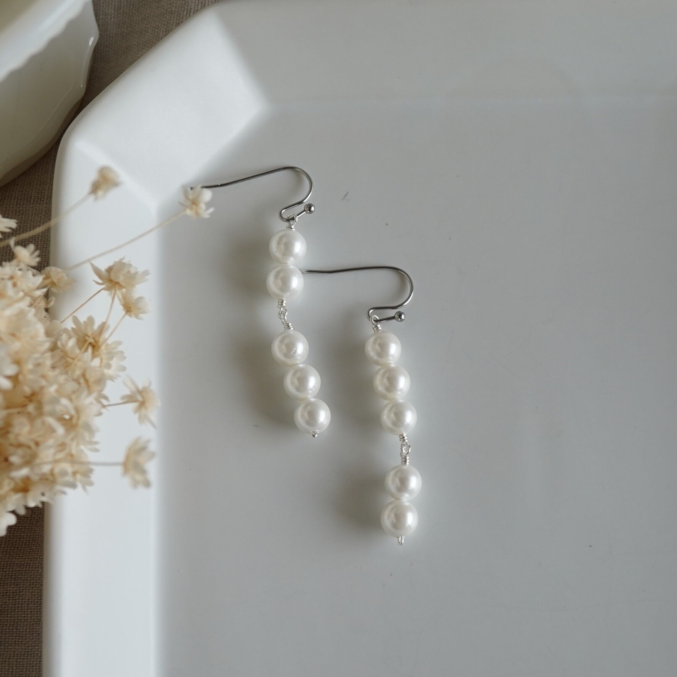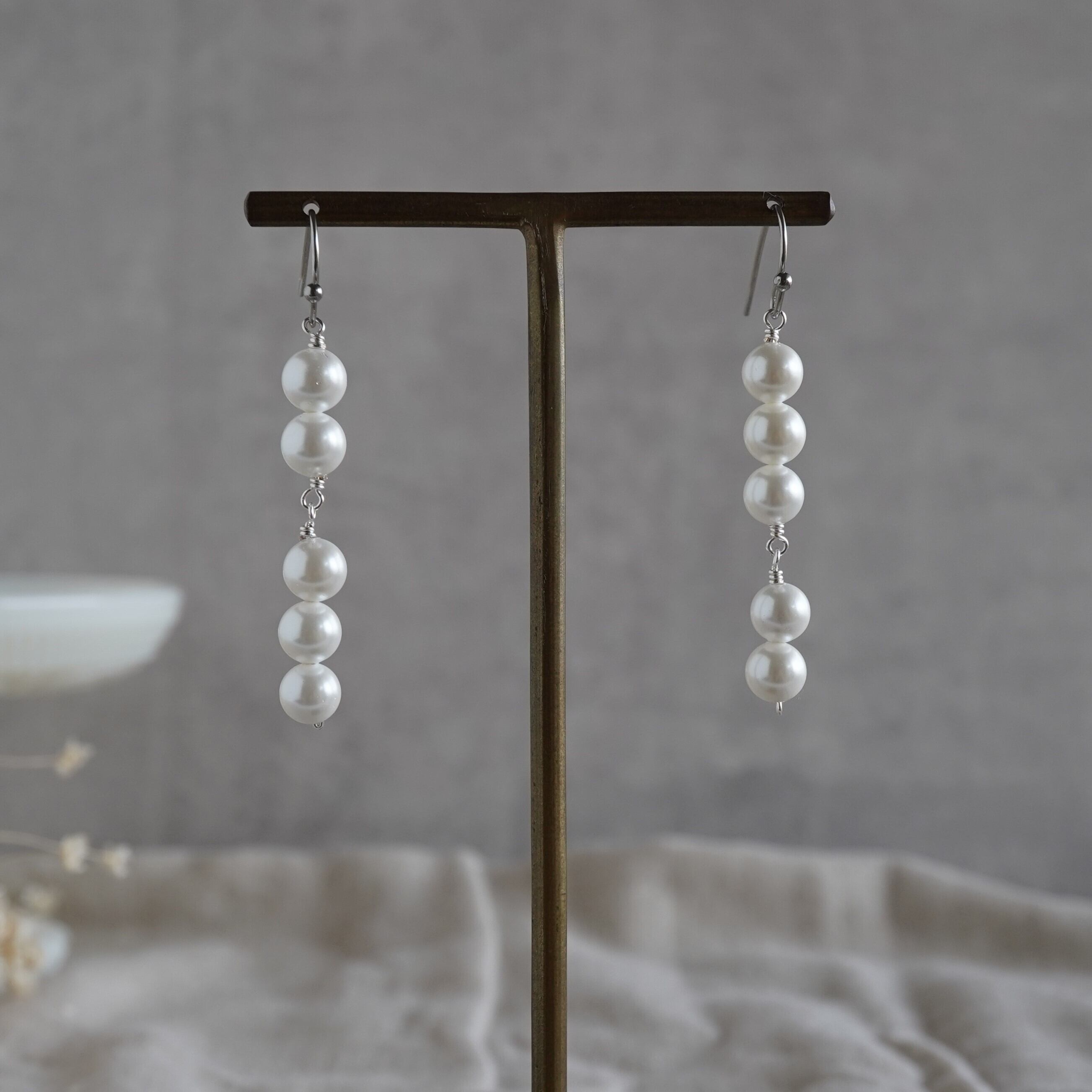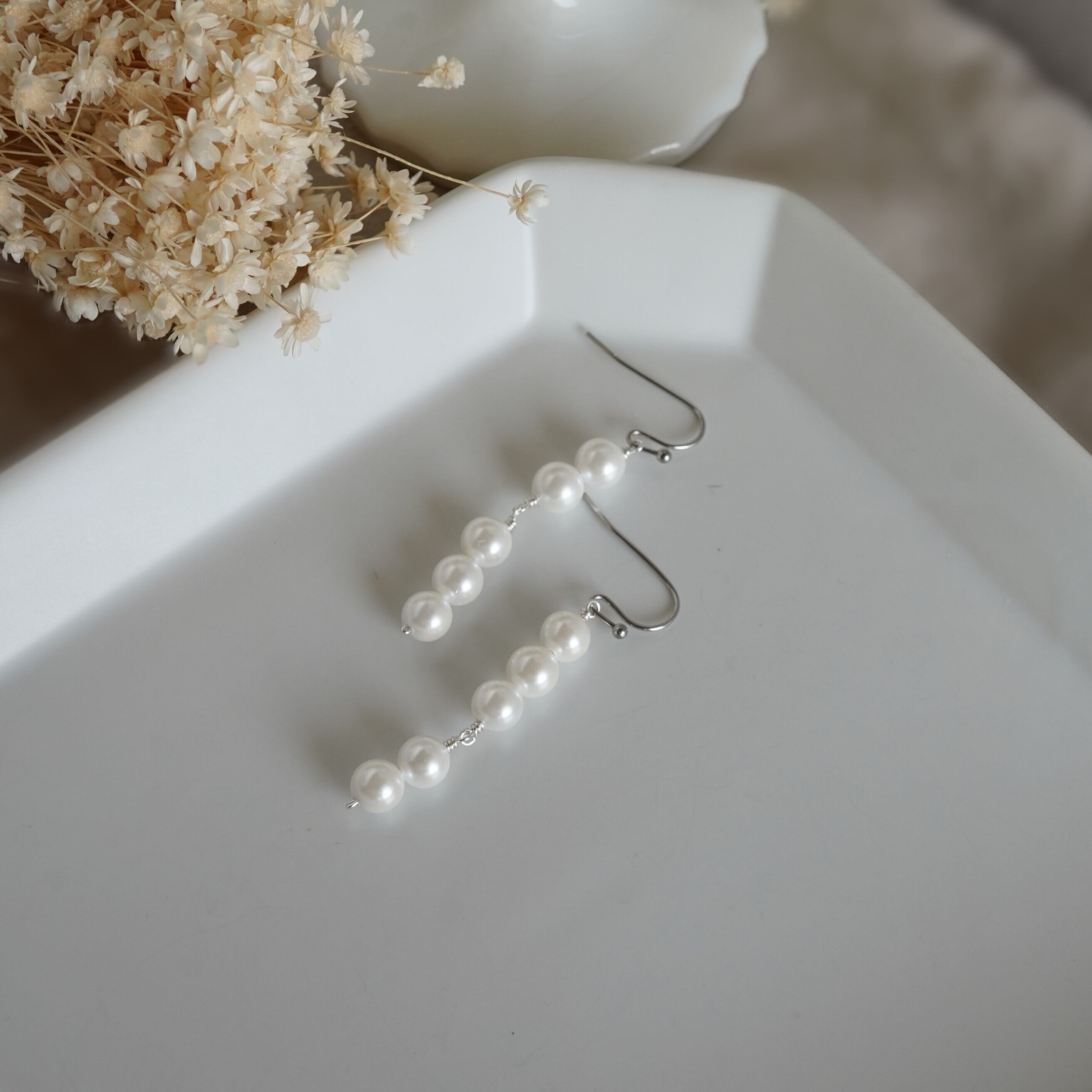 シンプルでお洋服に合わせやすく季節を問わずお使いいただけます。2つに分けてワイヤーで繋ぎ、繊細にゆれるようにデザイン。アシンメトリーもポイントです。