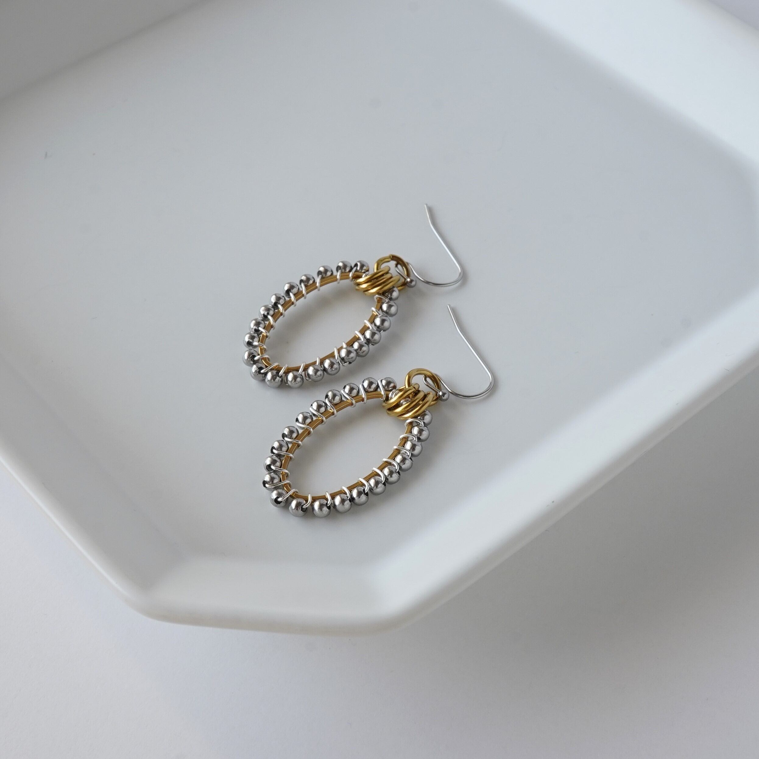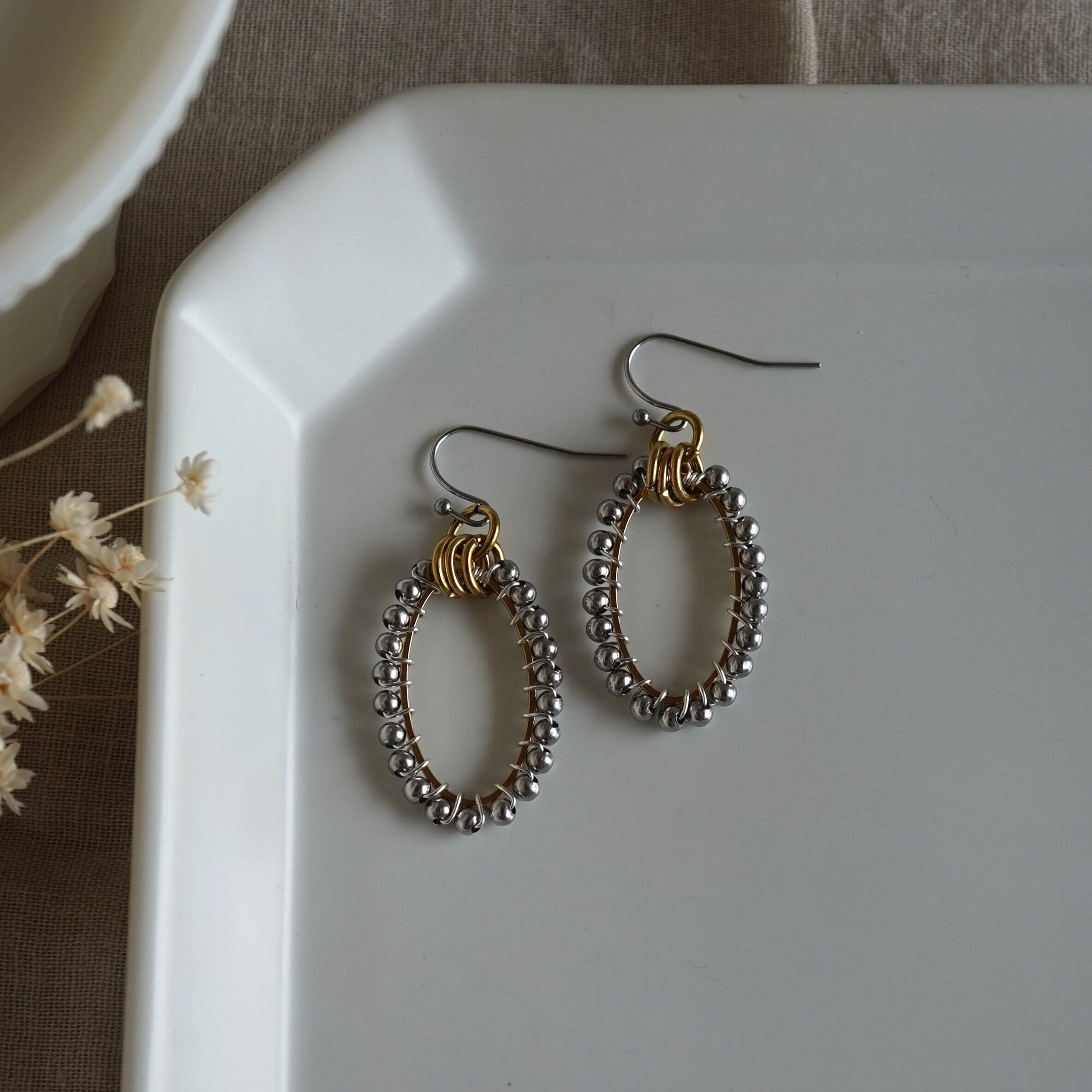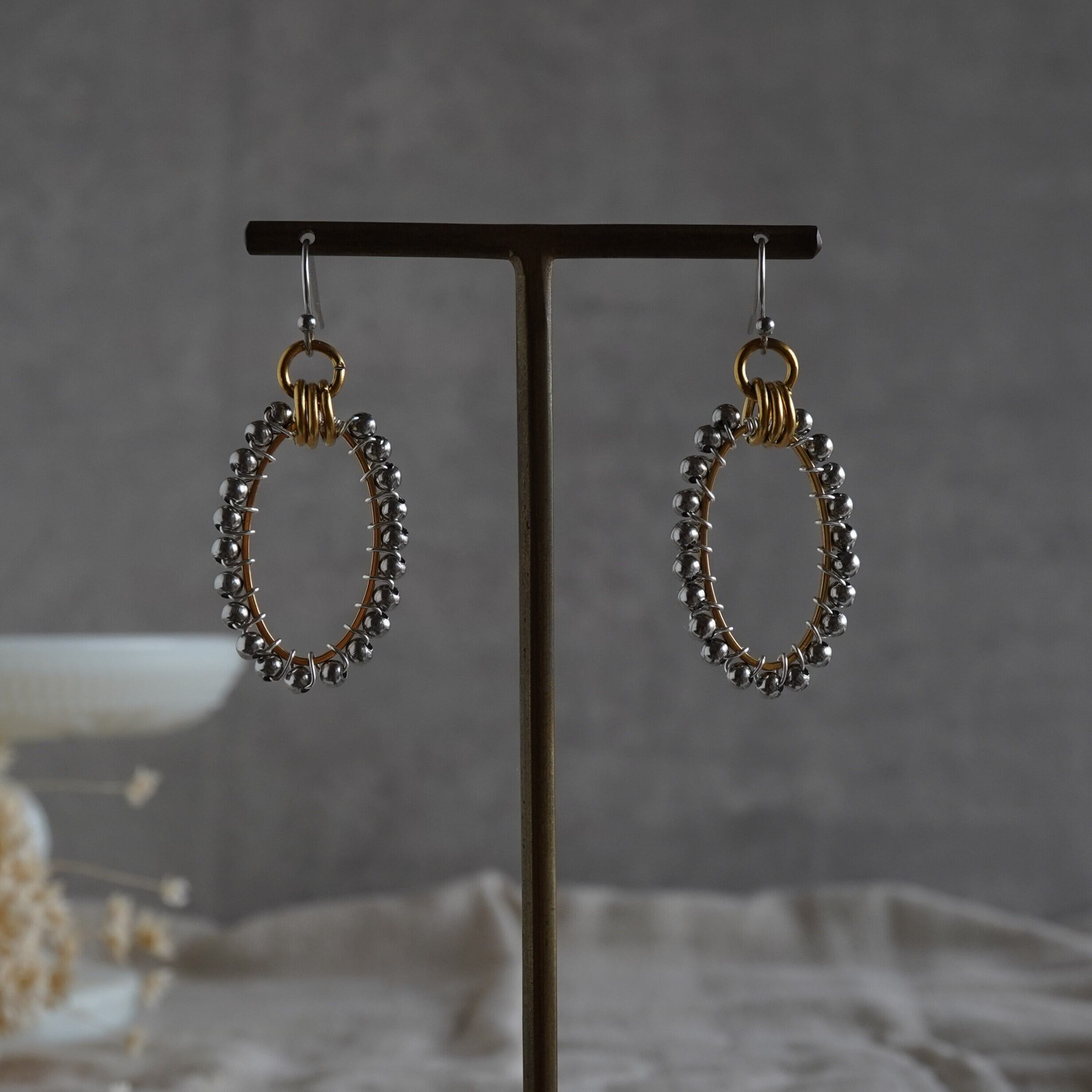 メタルボールを一粒ずつ丁寧に巻き付け、華やかさとかっこよさもあるピアスです。