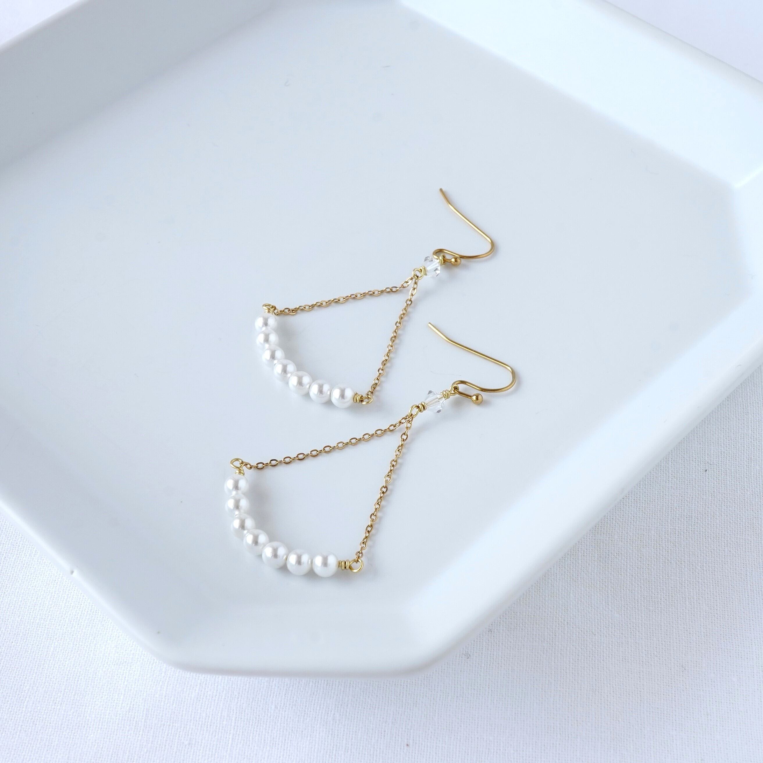 パールのスウィングピアスです。キラリと光る高級クリスタルガラスがアクセント。
