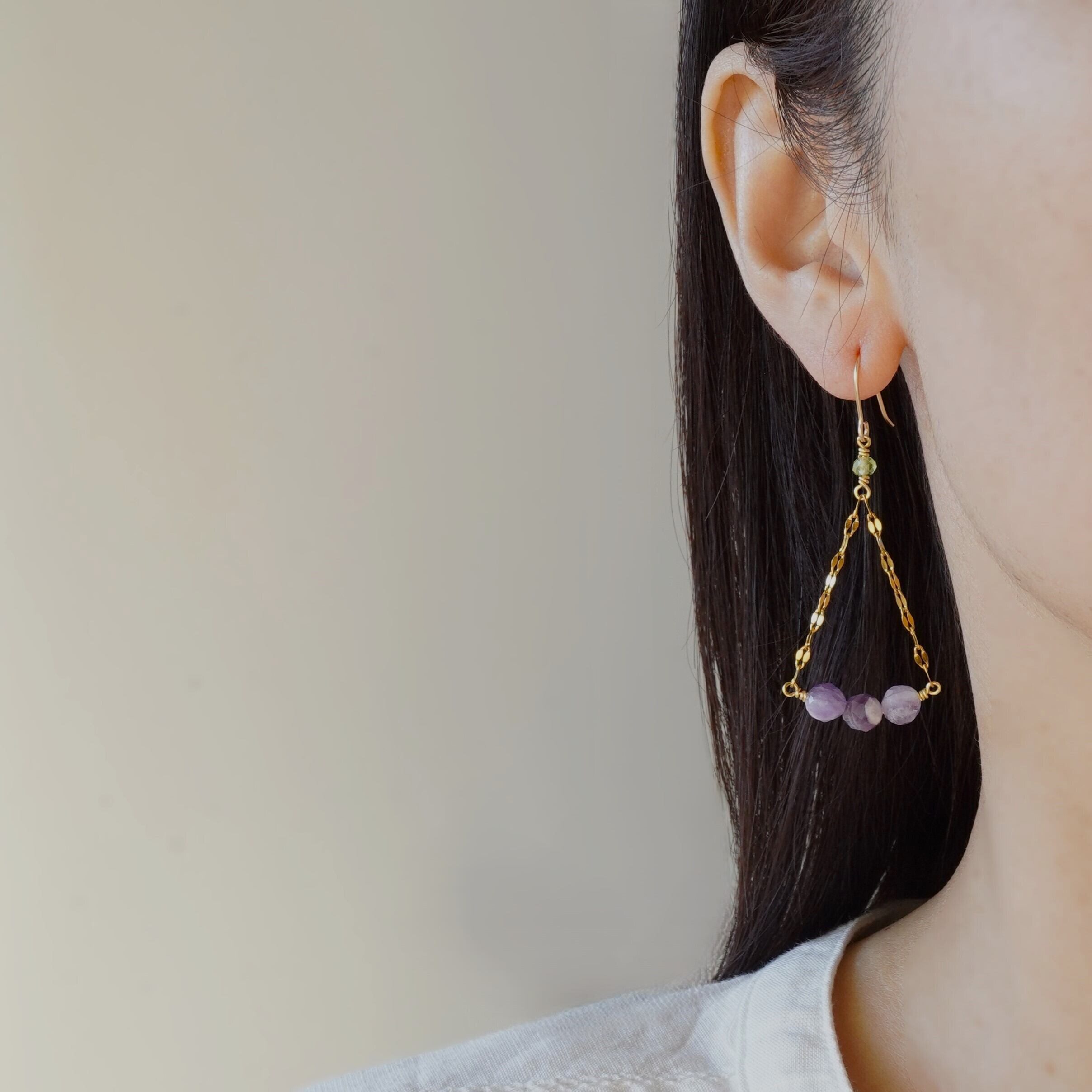 天然石ストライプアメジストペリドットを使用したスウィングピアスです。ペタルチェーンがきらきらと輝きます。