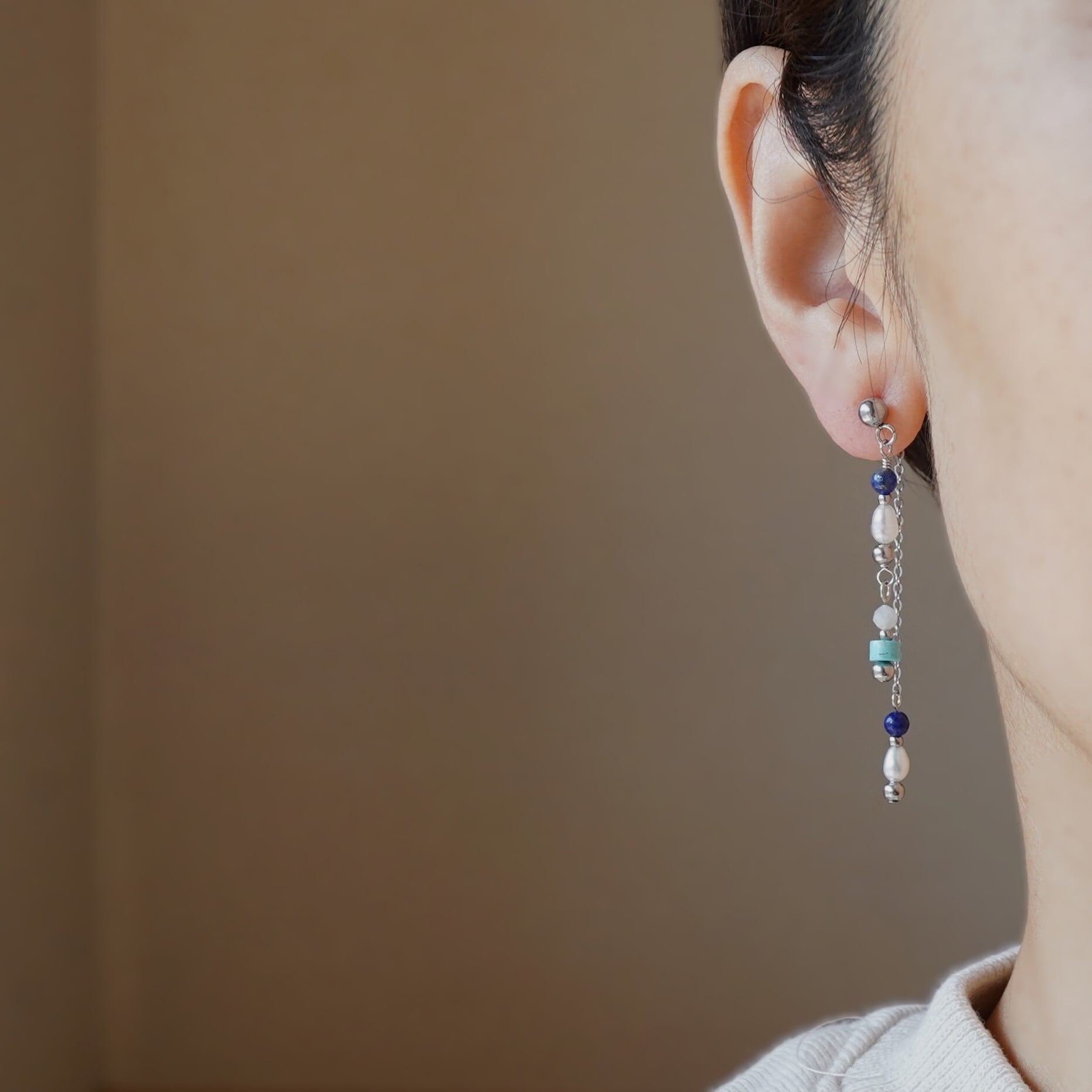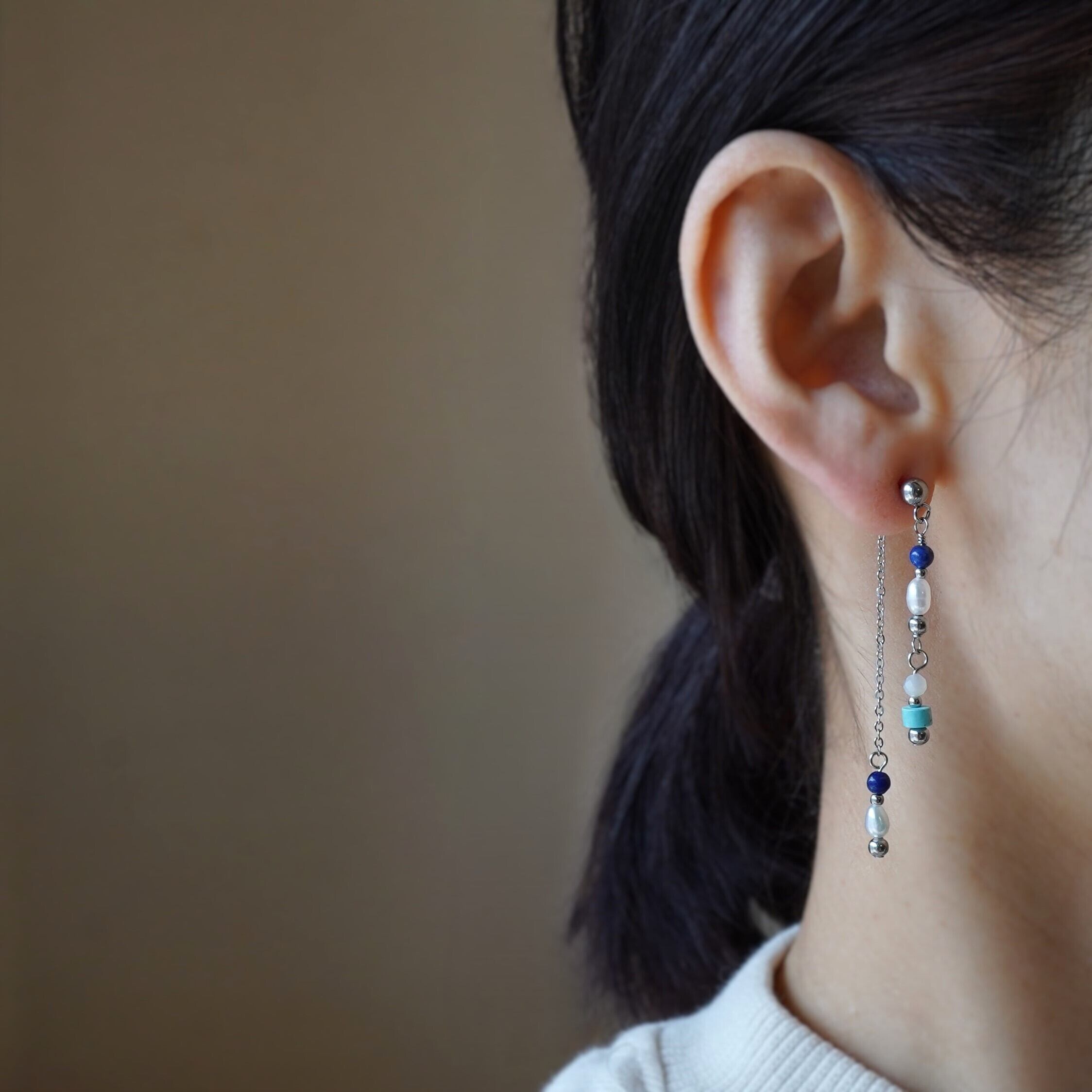 ラピスラズリ・ターコイズ。青系の天然石にホワイトムーンストーン・艶のある上質な淡水パールを丁寧にワイヤーで繋いだピアスです。
