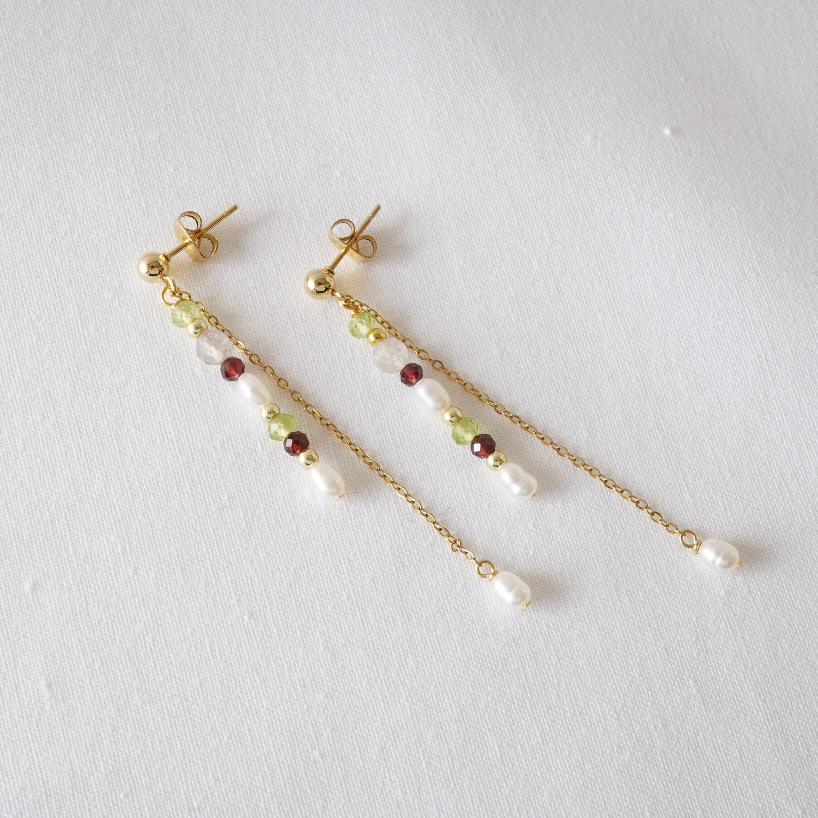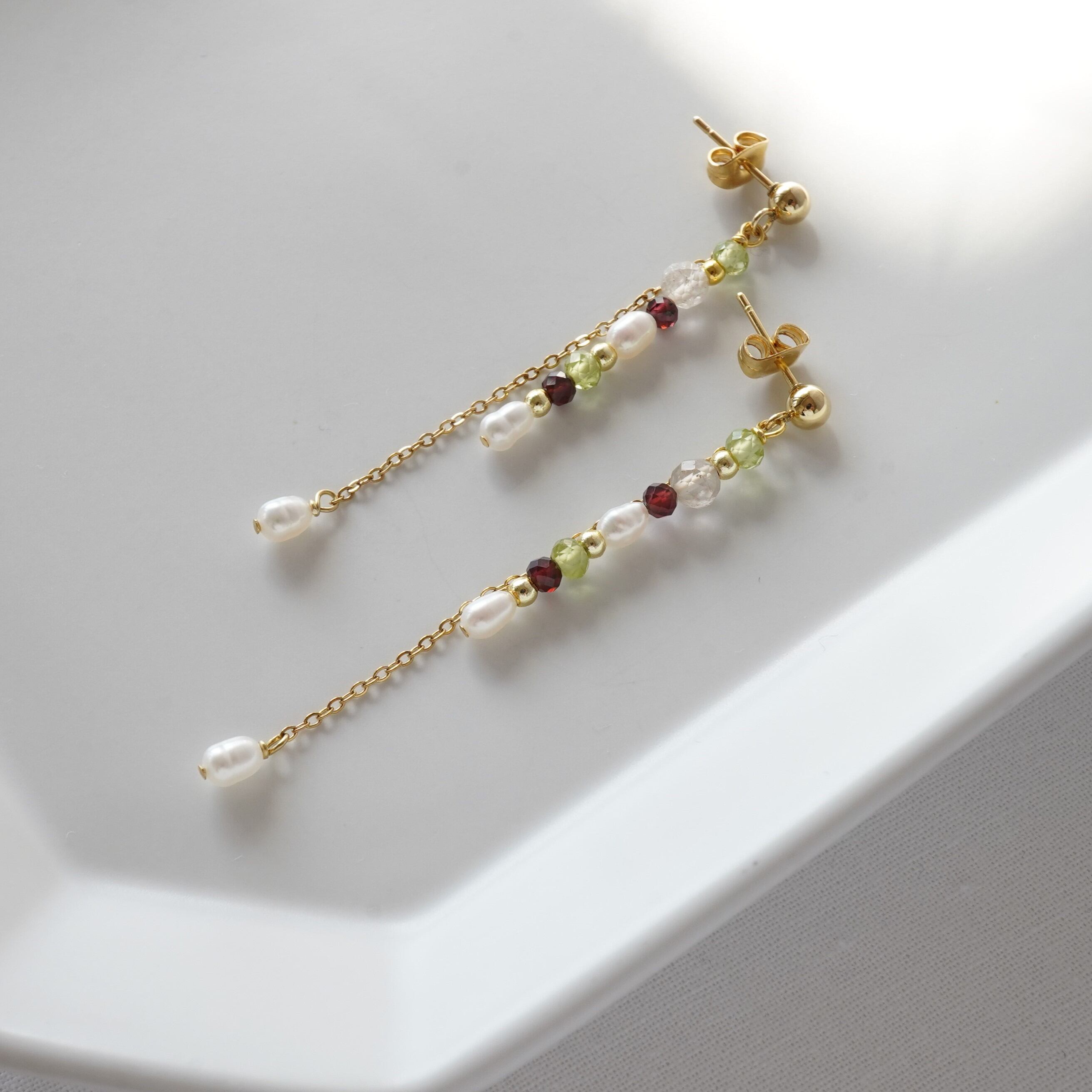 ペリドット・ガーネット・ルチルクォーツに艶のある上質な淡水パールを丁寧にワイヤーで繋いだピアスです。