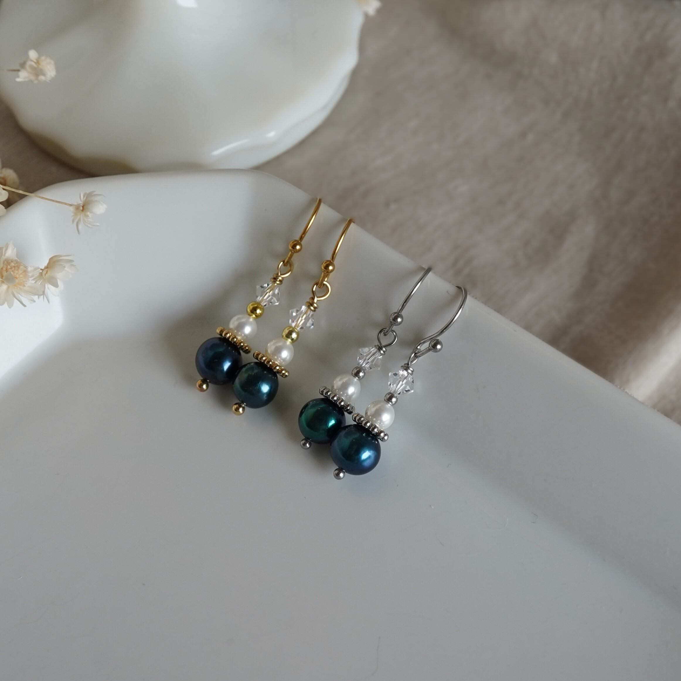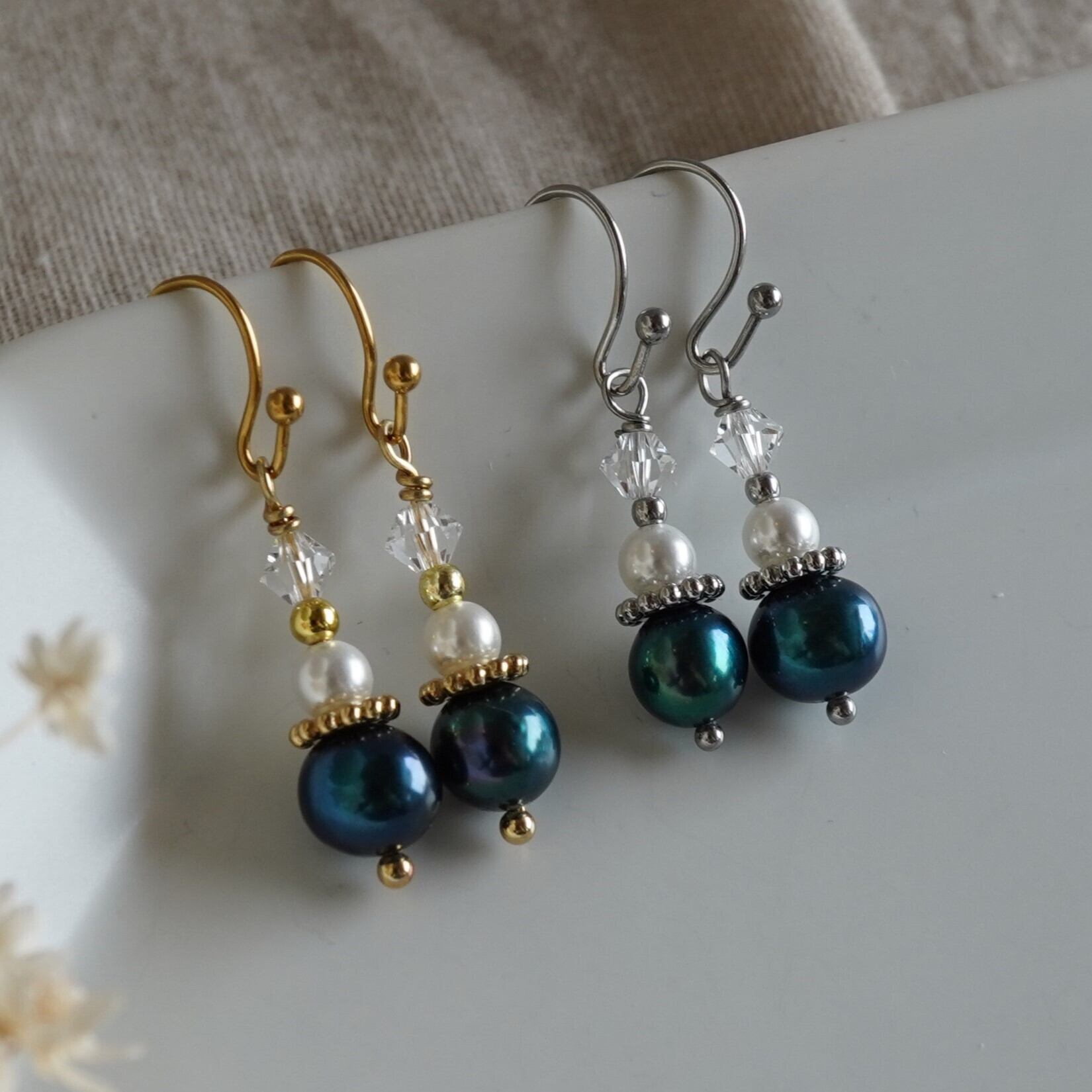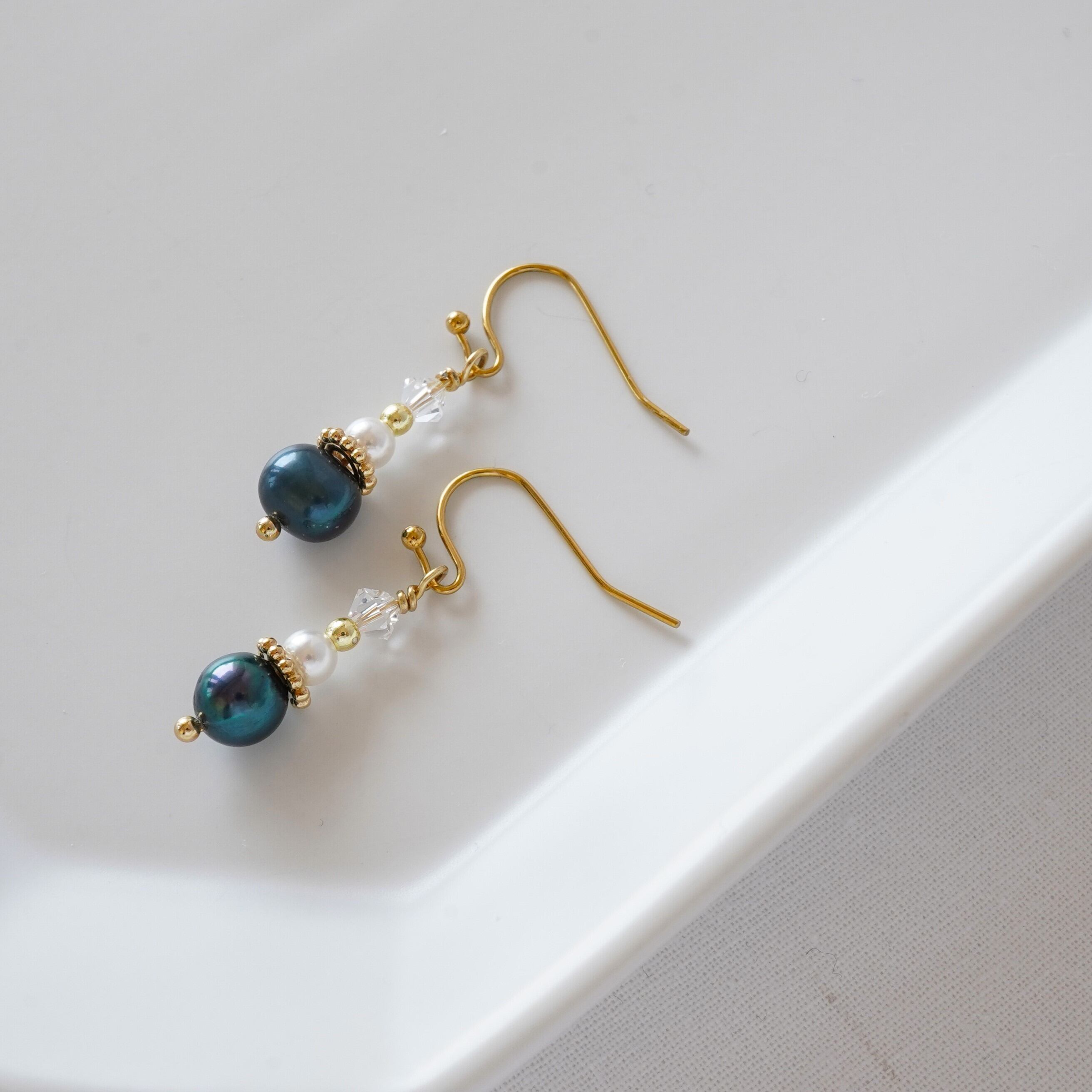 深い青色の淡水パールが印象的な小ぶりでシンプルなデザインのピアスです。