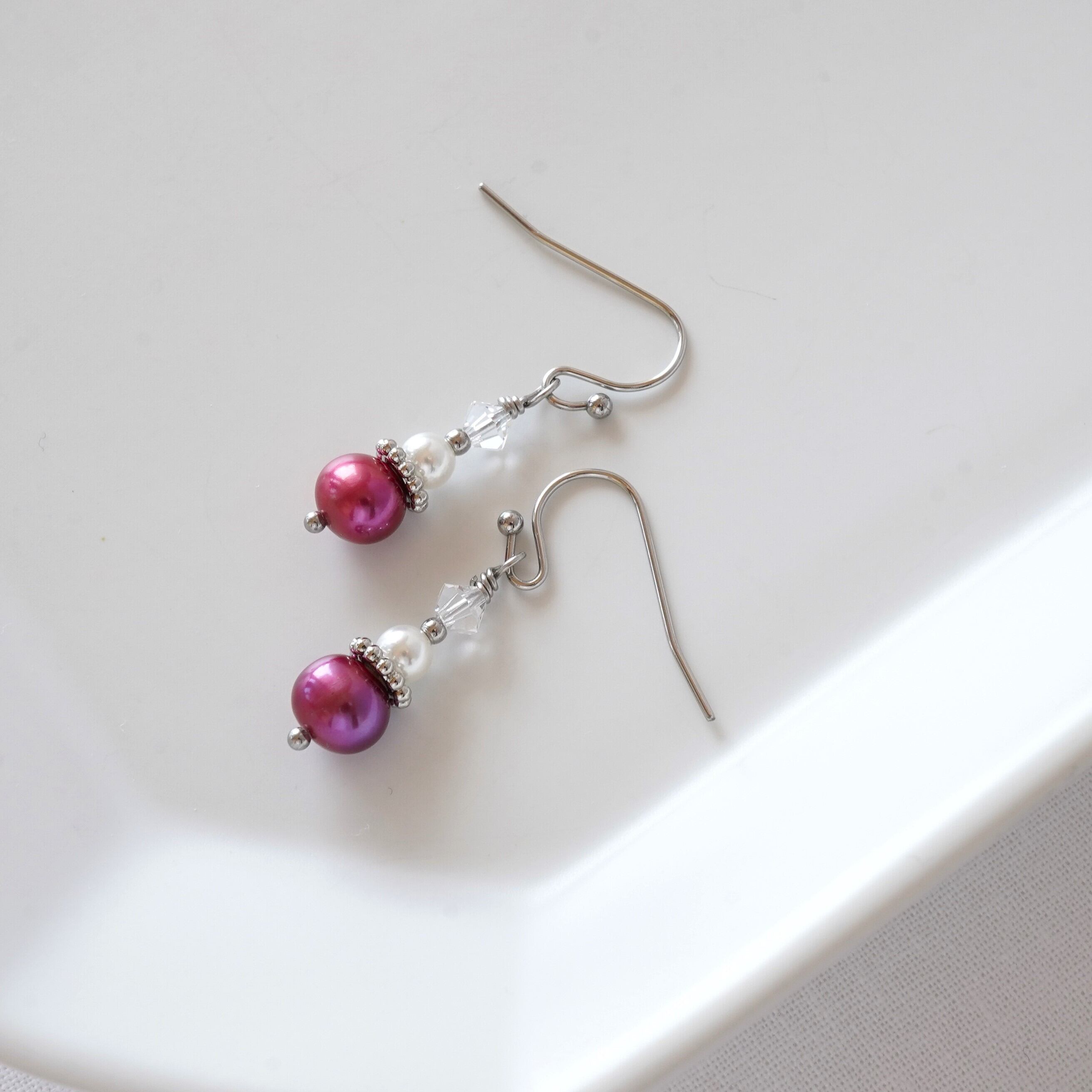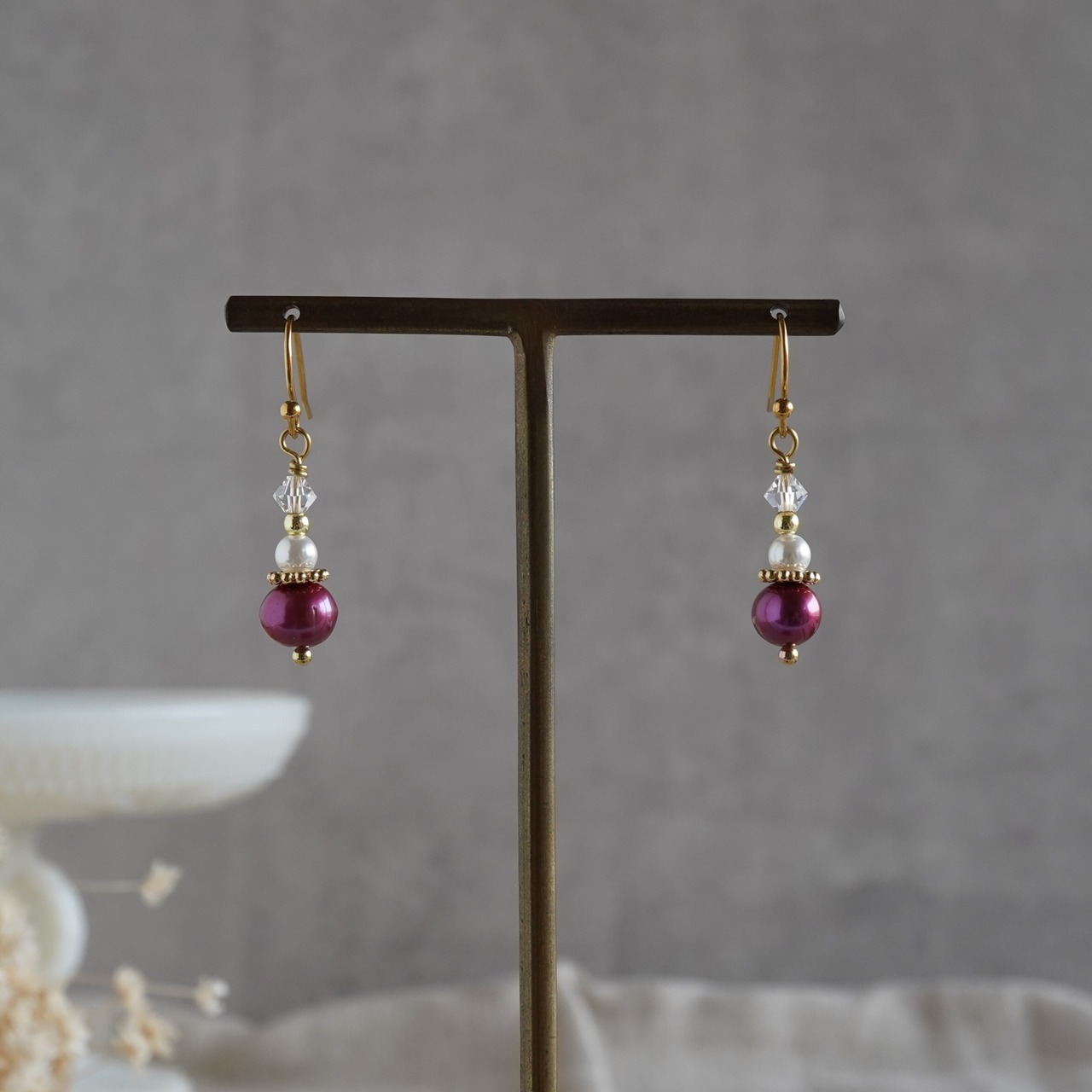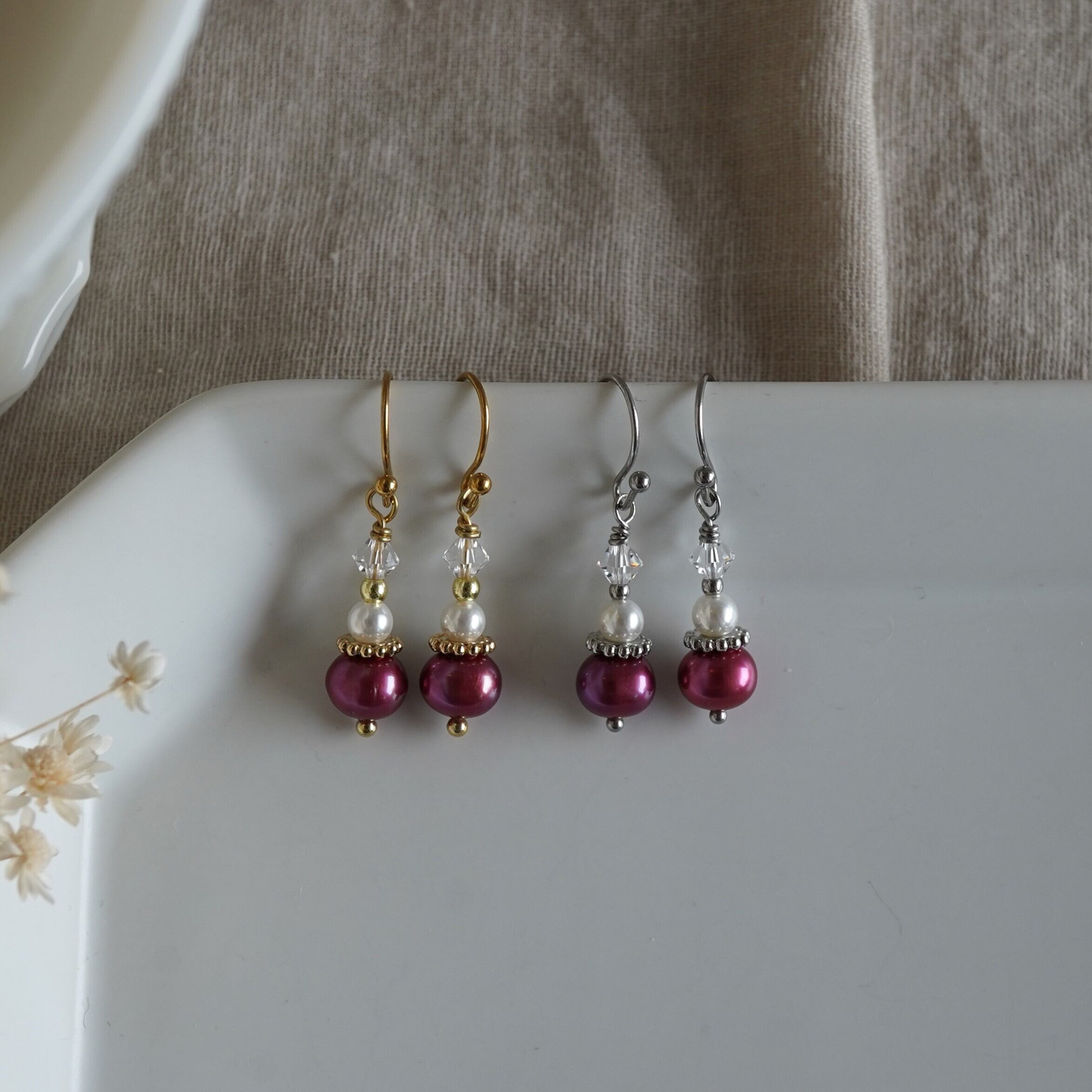 深い赤色の淡水パールが印象的な小ぶりでシンプルなデザインのピアスです。