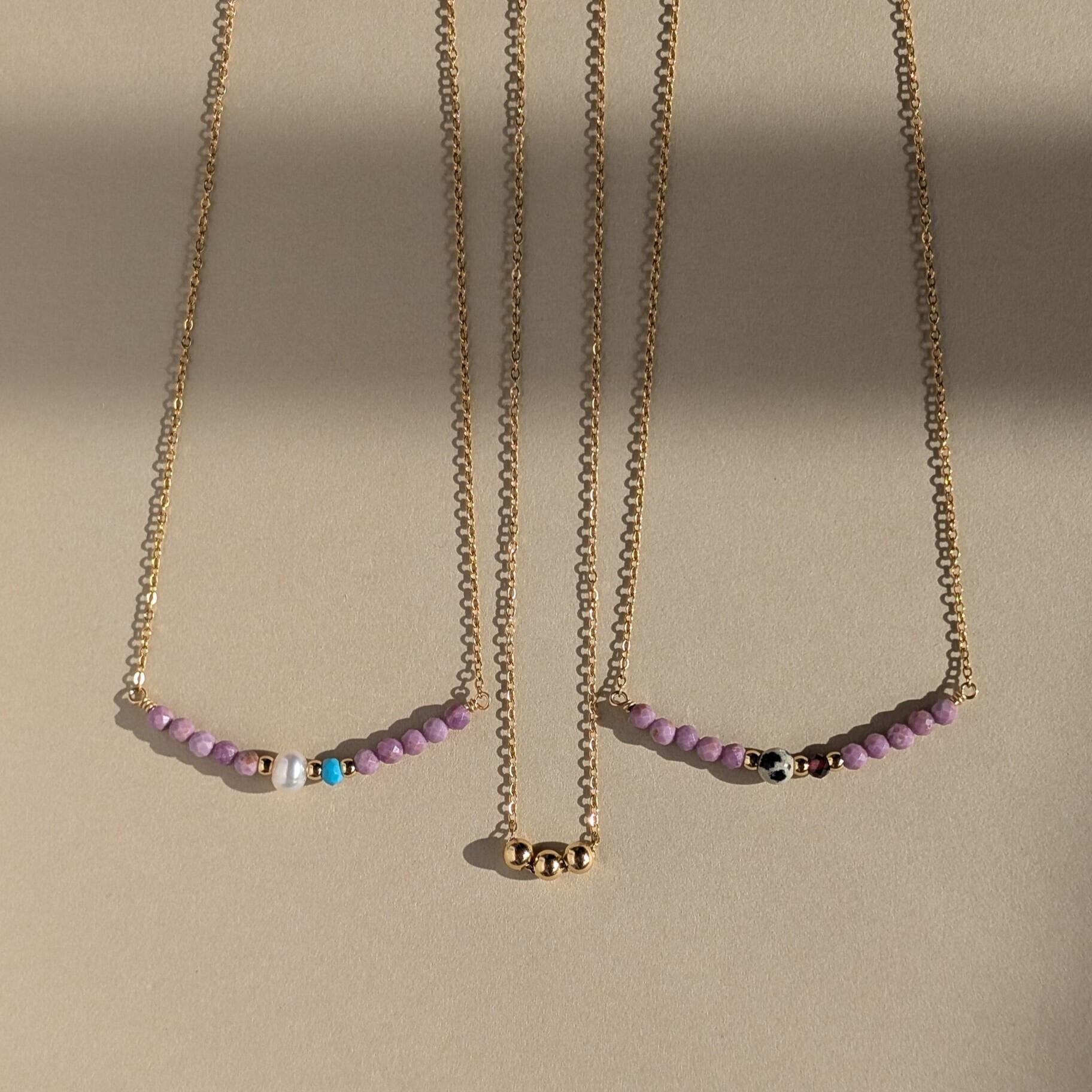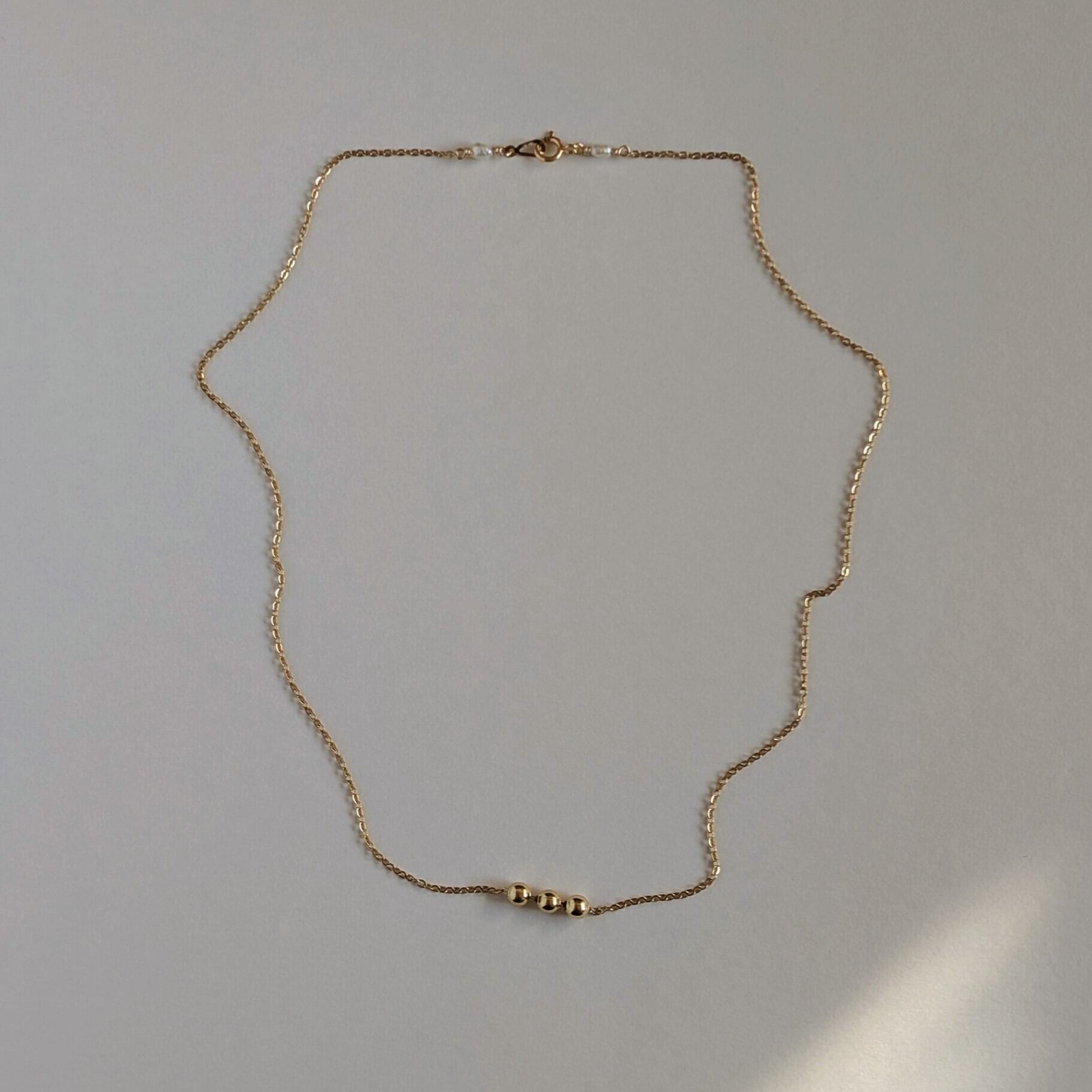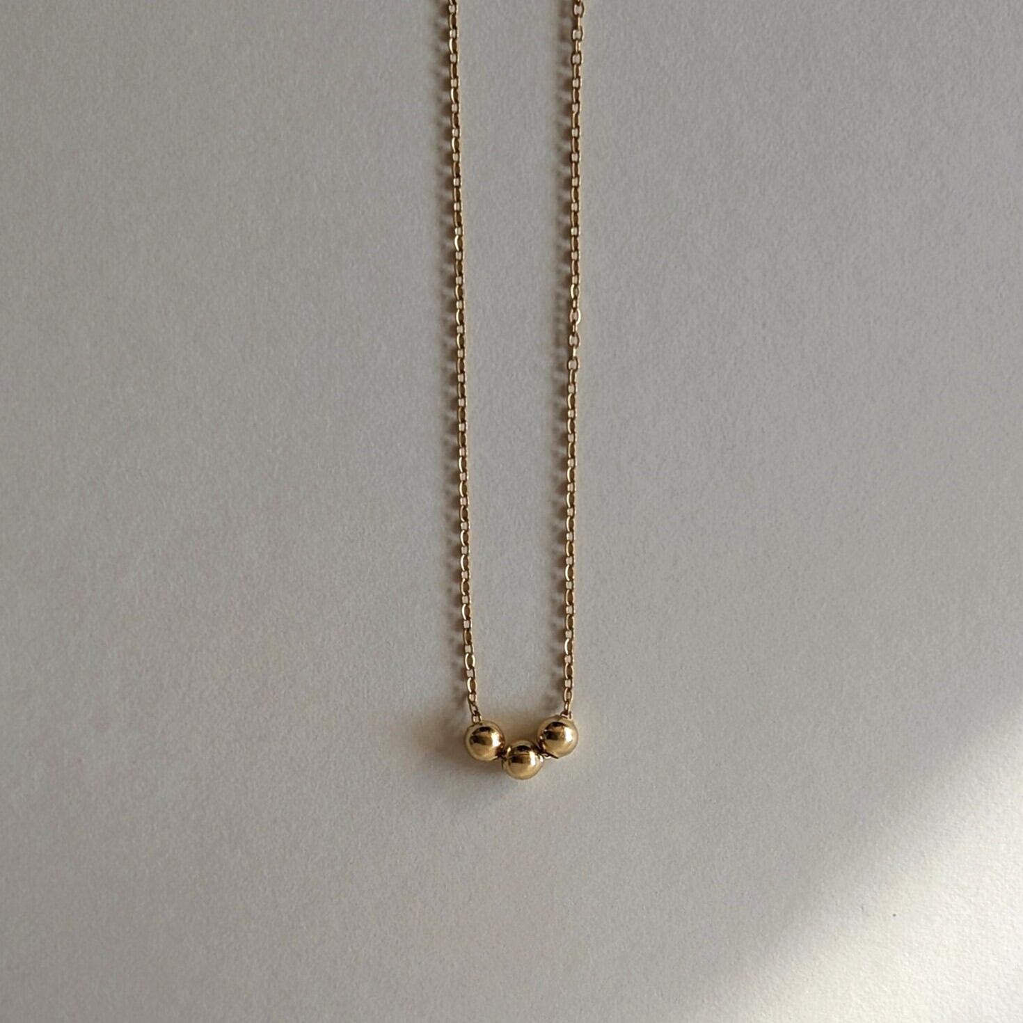 極細のチェーンにゴールドのメタルボールをあわせたミニマムなデザインのネックレスです。