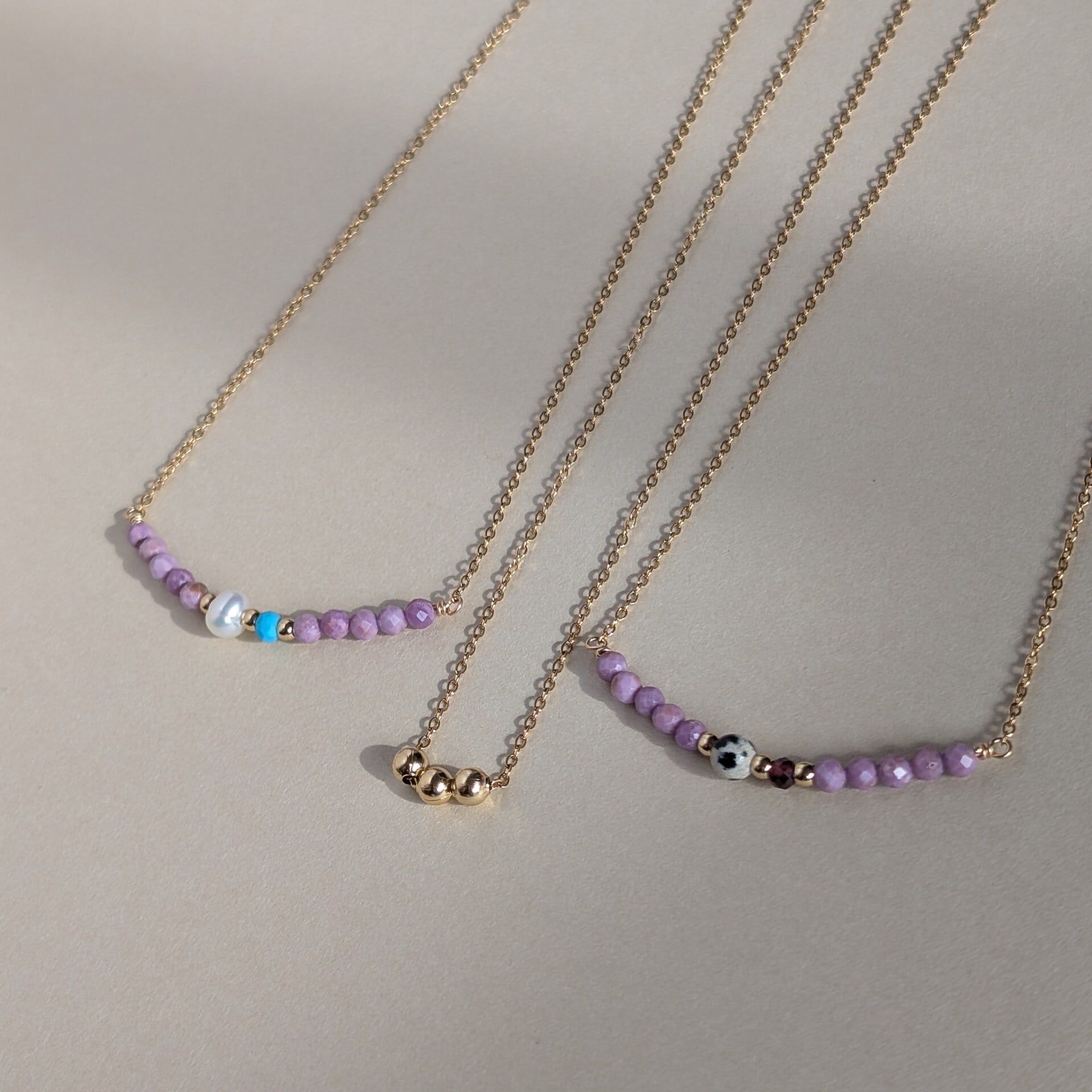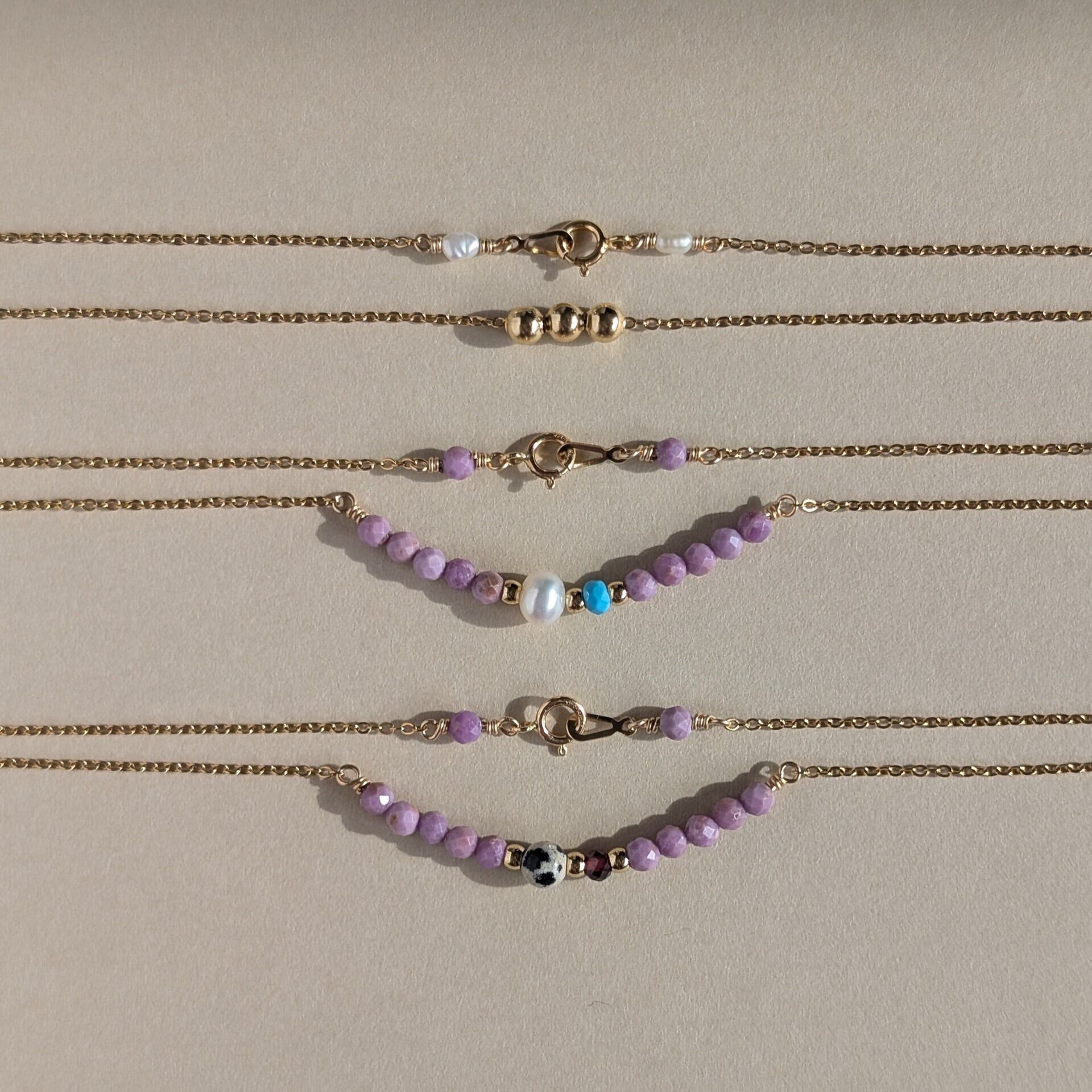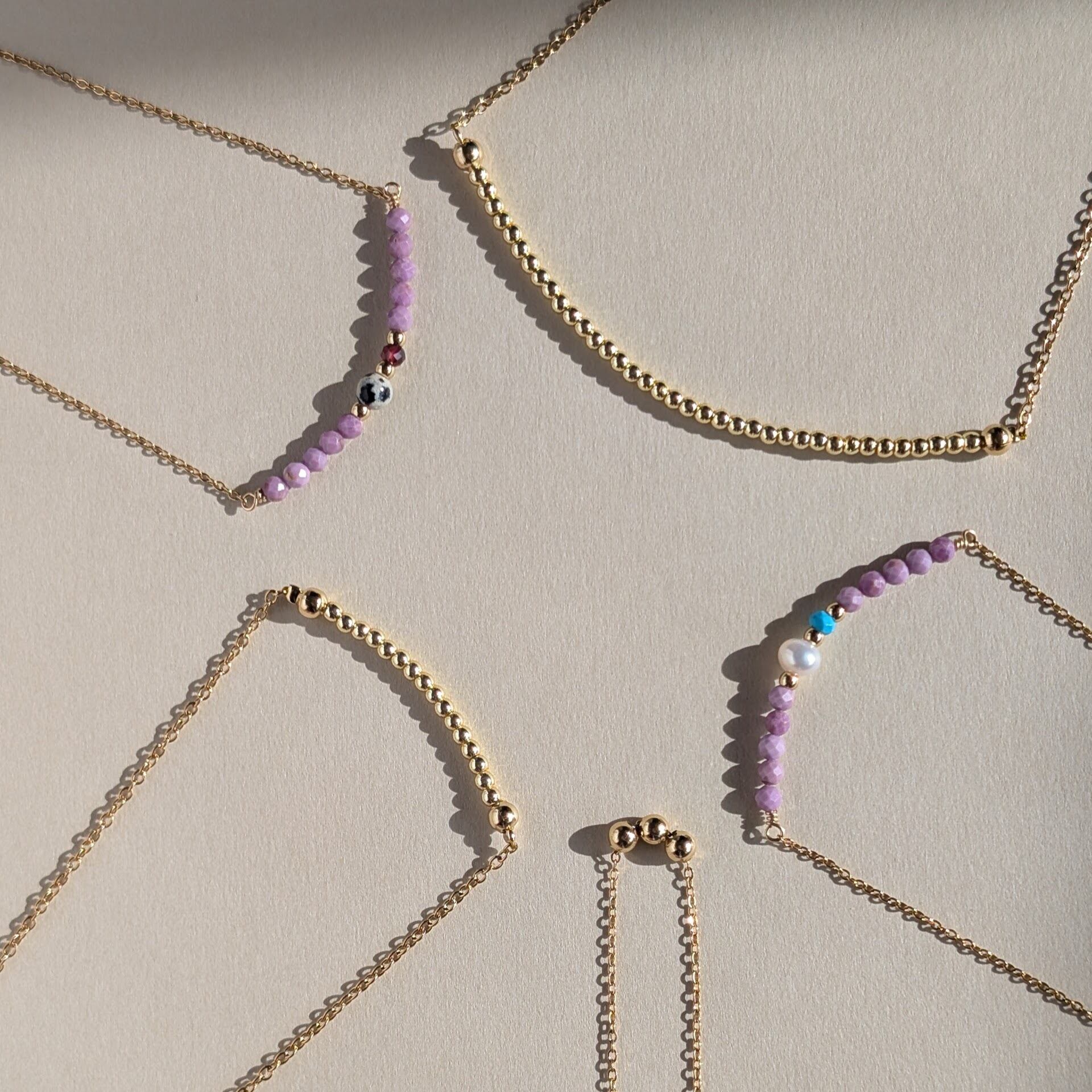 極細のチェーンにゴールドのメタルボールをあわせたミニマムなデザインのネックレスです。