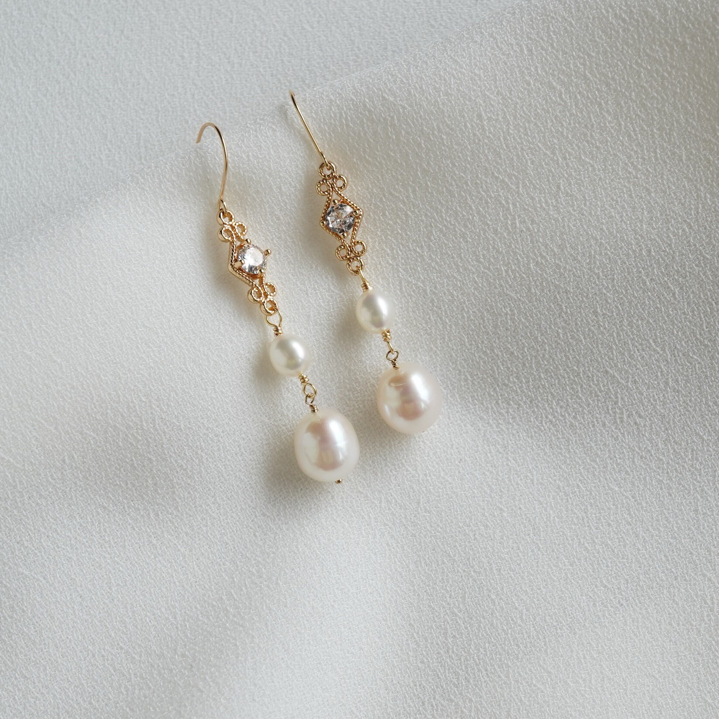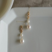 キラリとジルコニアの光る菱形チャームに、ふた粒の淡水パールが可愛いピアスです。ゆらゆらと揺れて、上品さと大人可愛いデザインです。