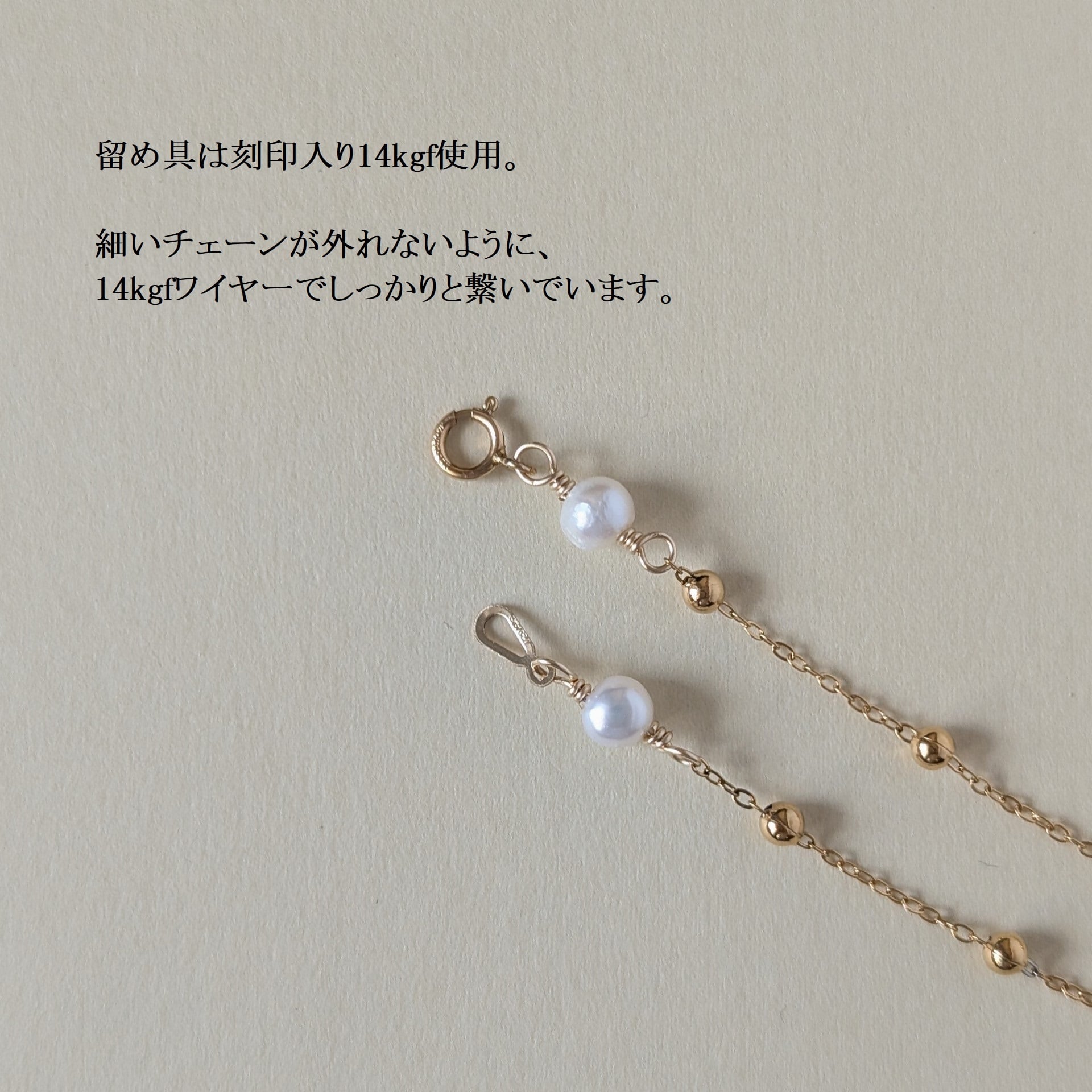 細いチェーンが外れないように、めがね留めという手法を用いて、14kgfワイヤーでしっかりと繋いであります。