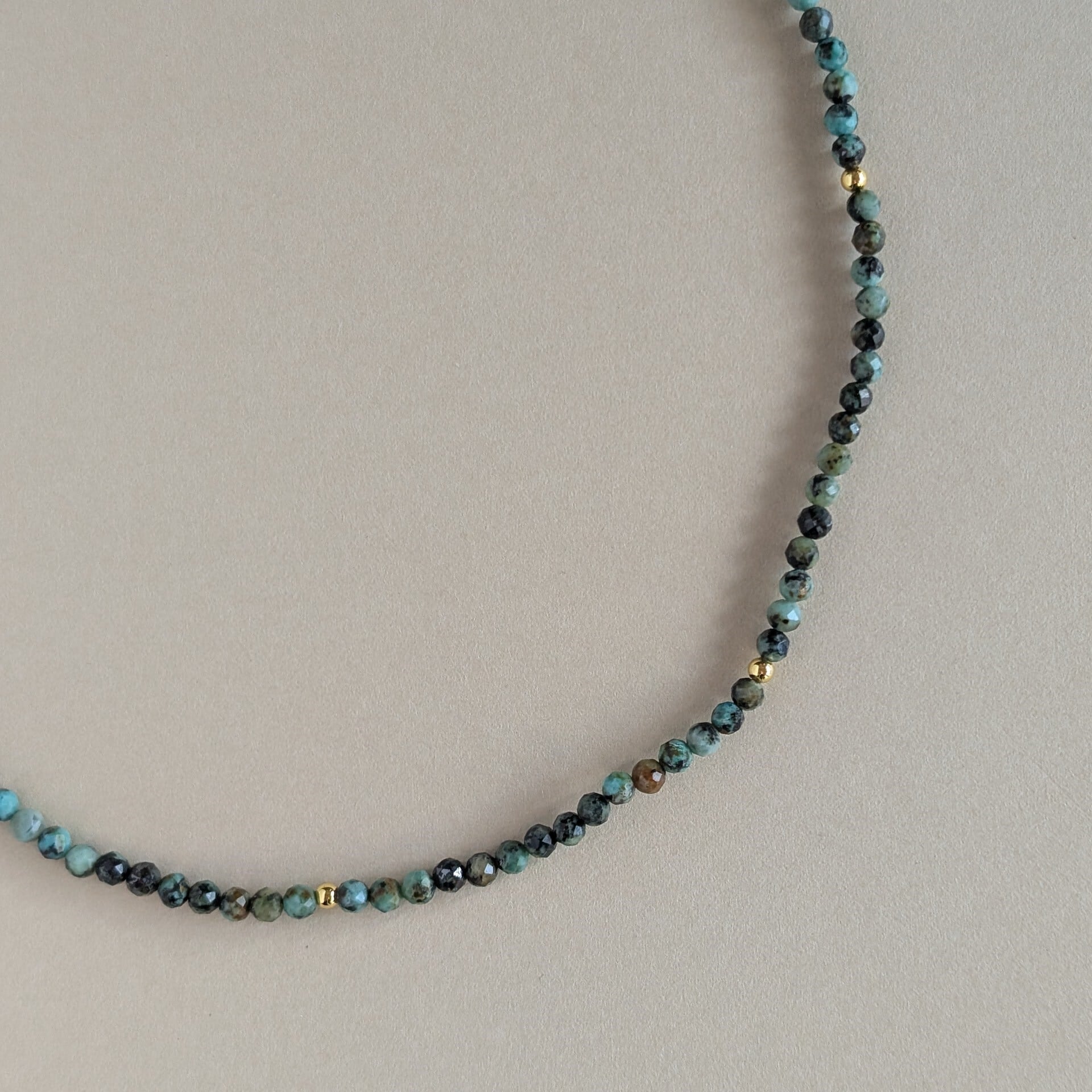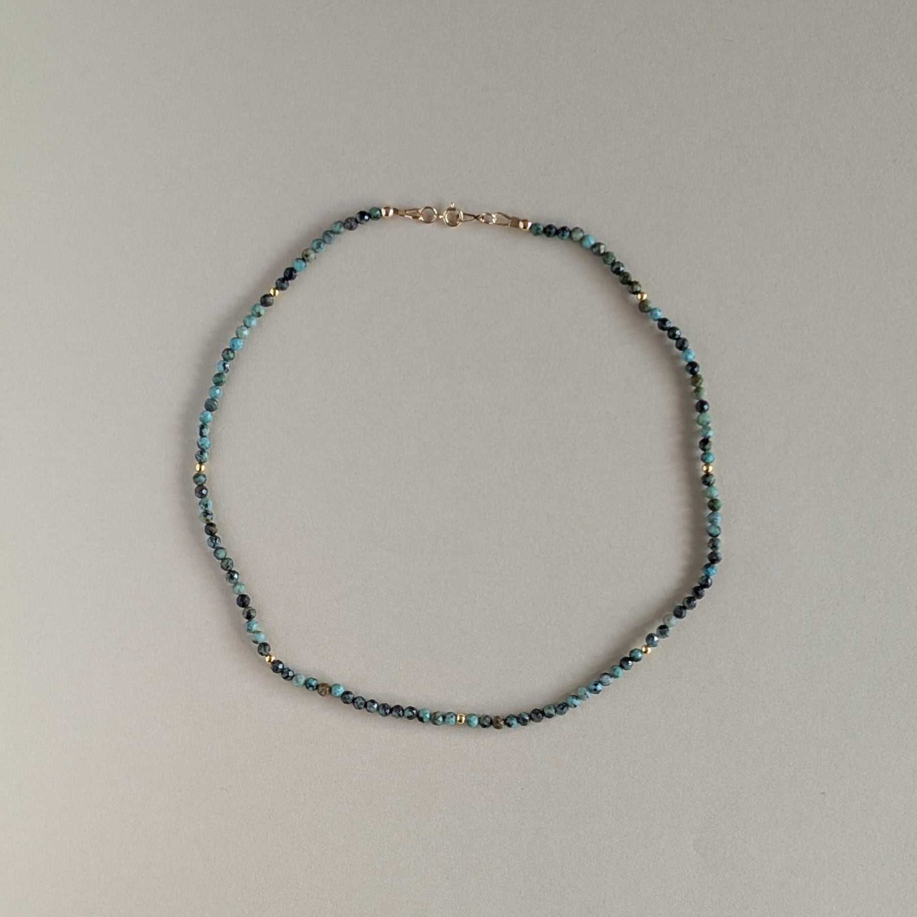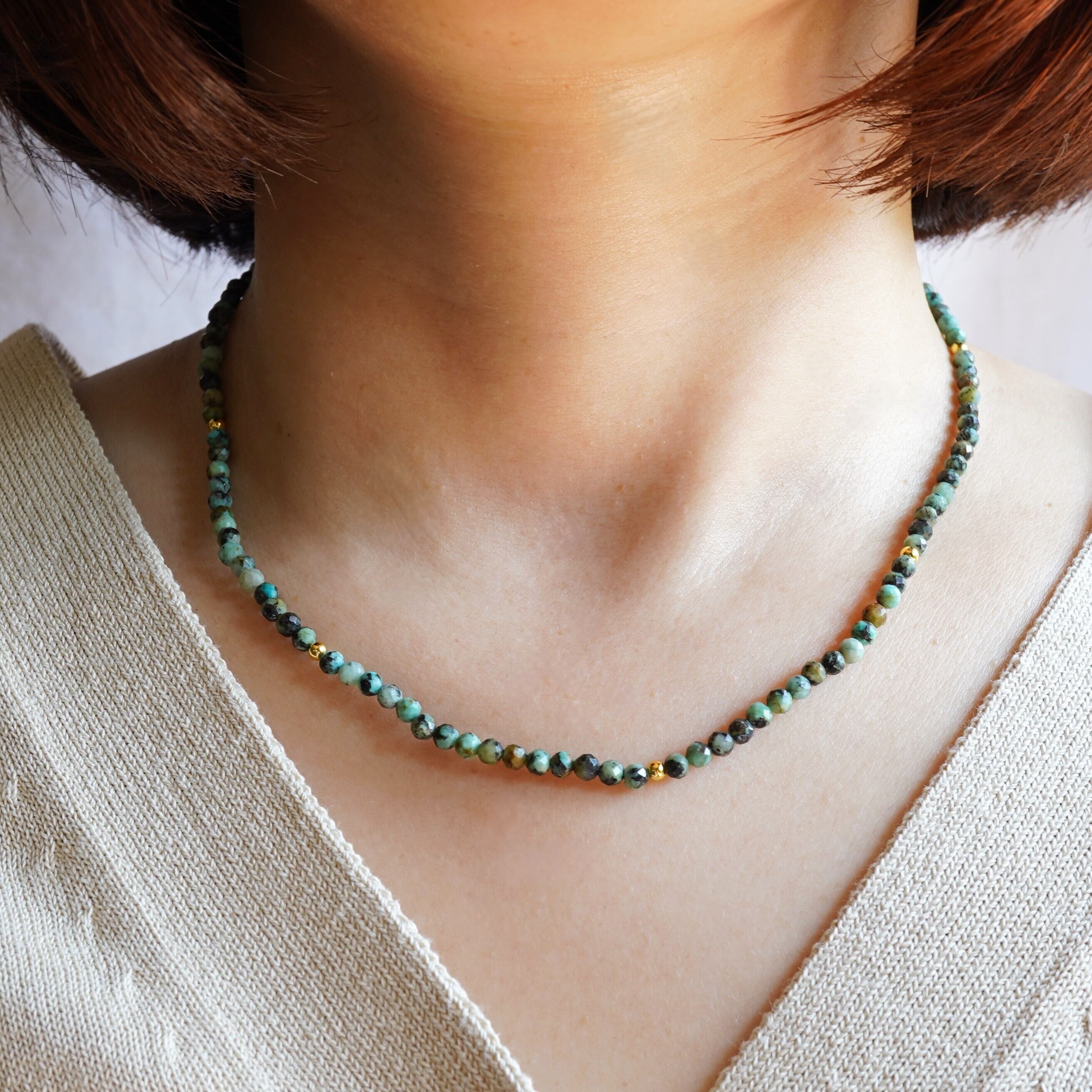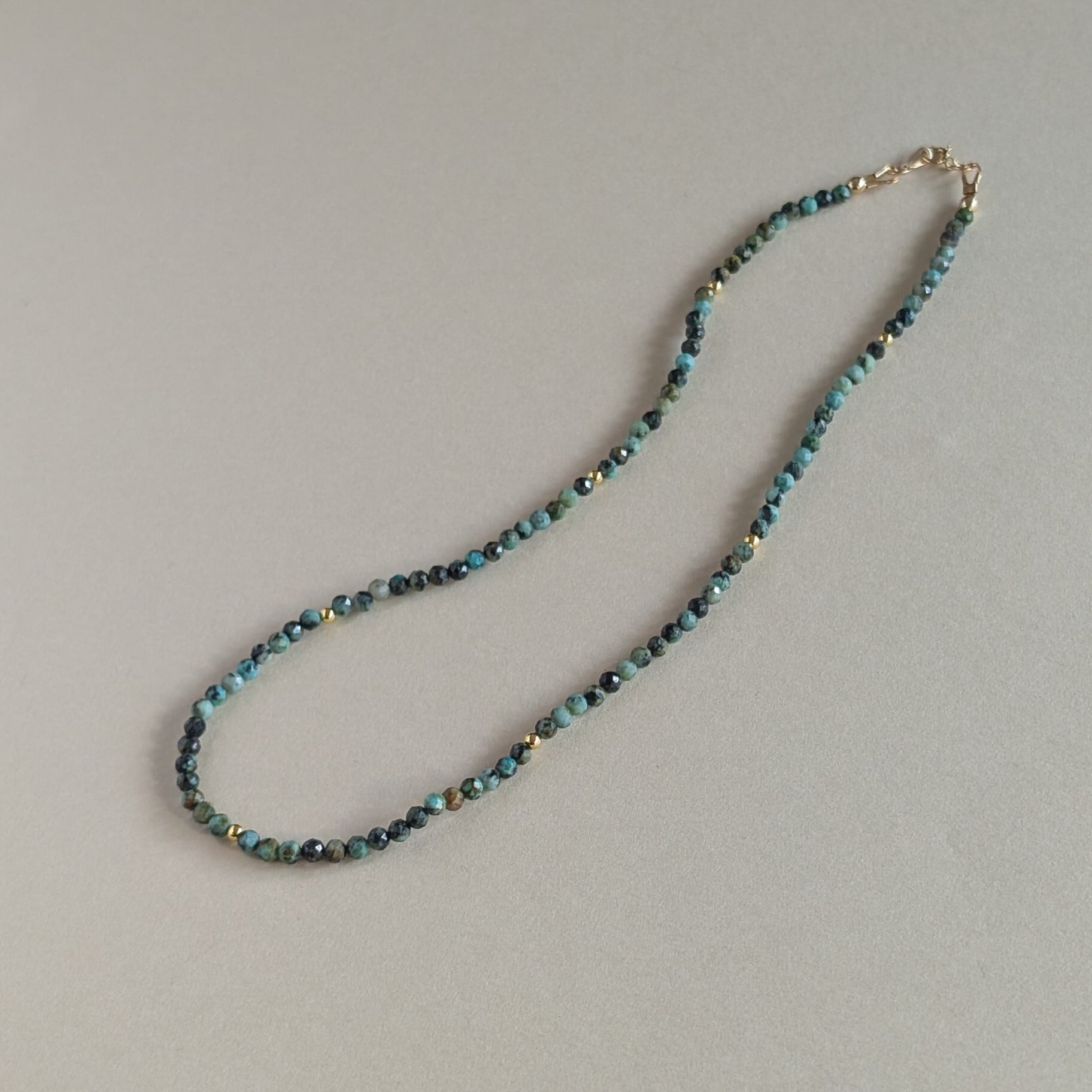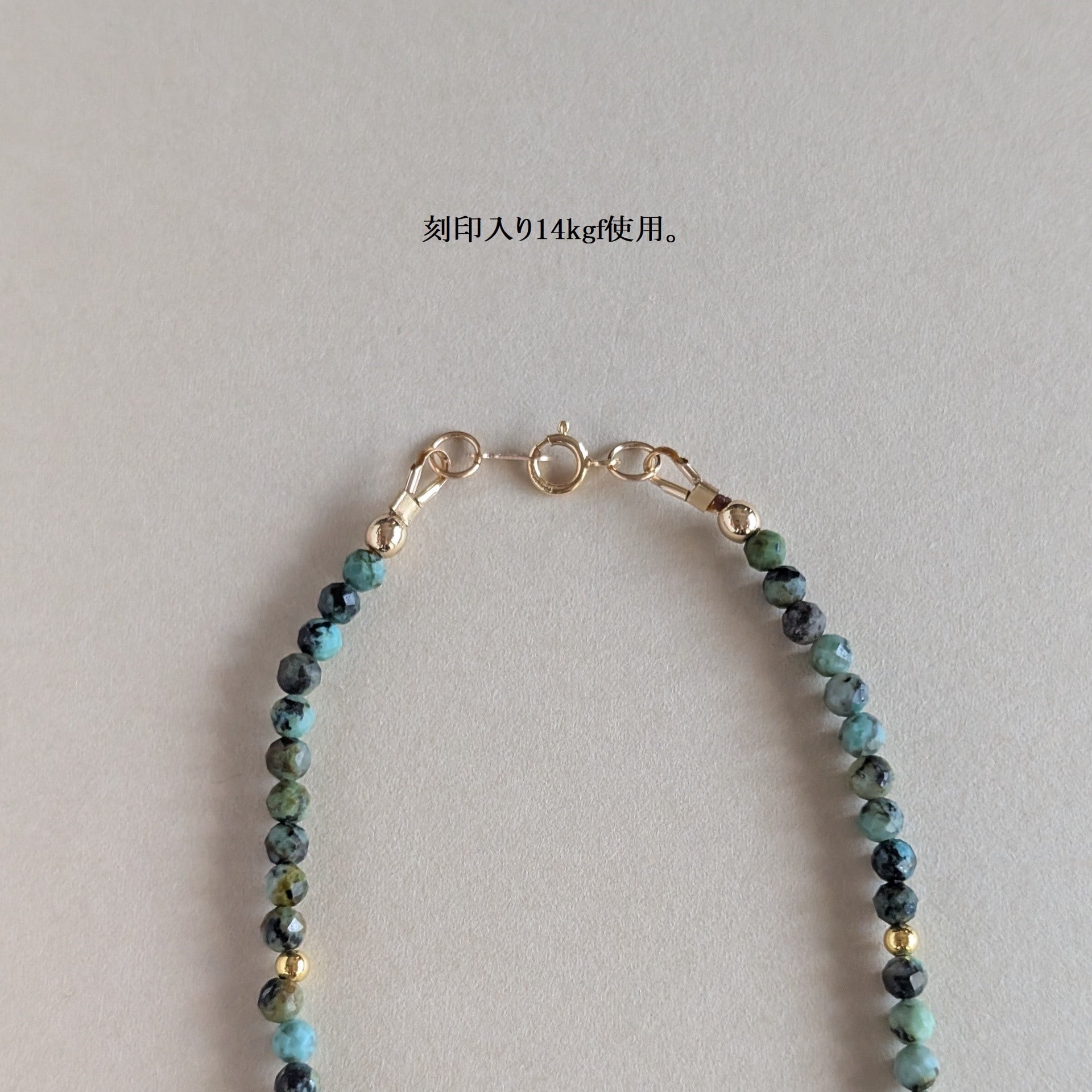 シンプルなデザインのターコイズネックレス。留め具は刻印入り14kgfを使用。