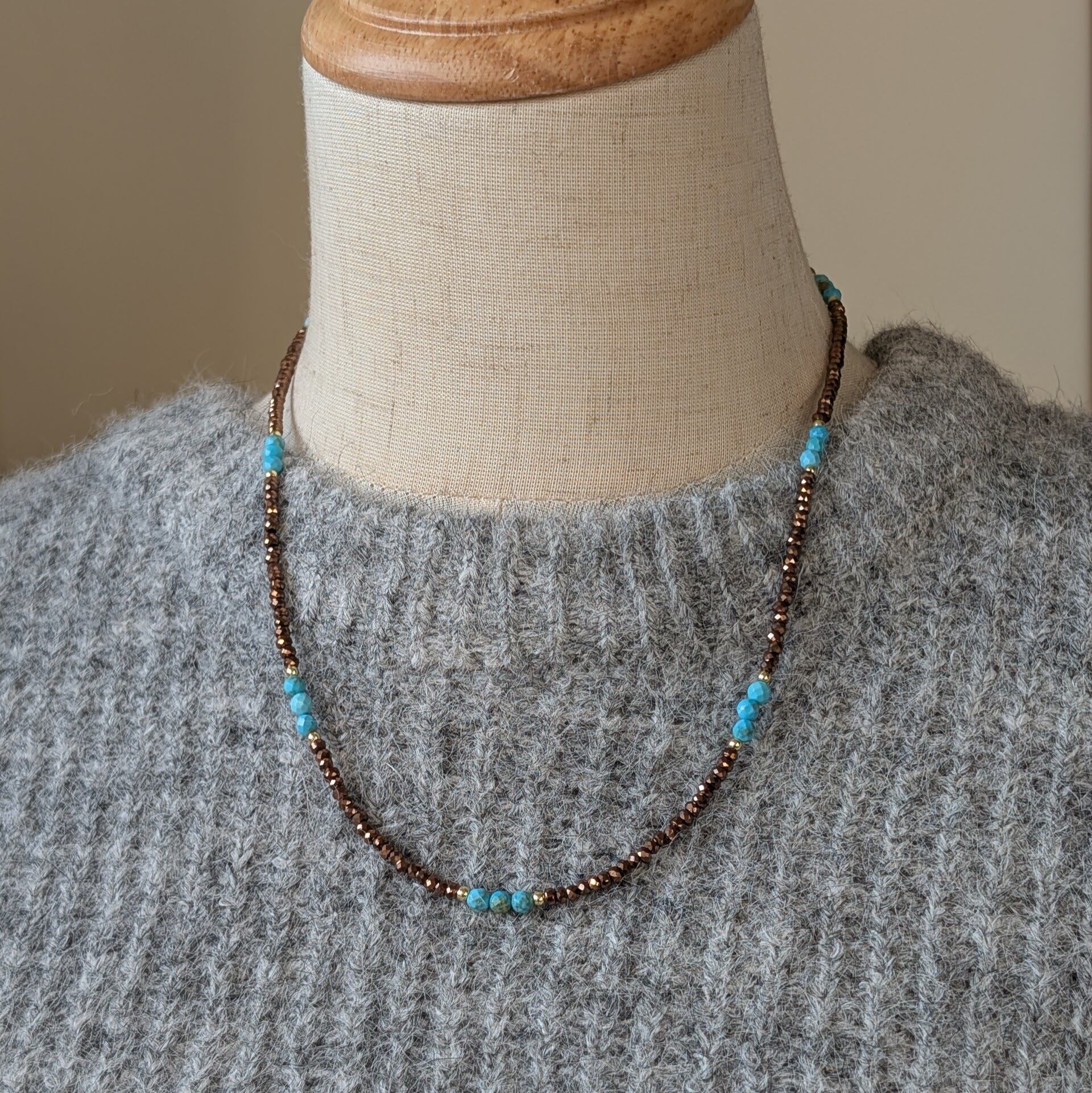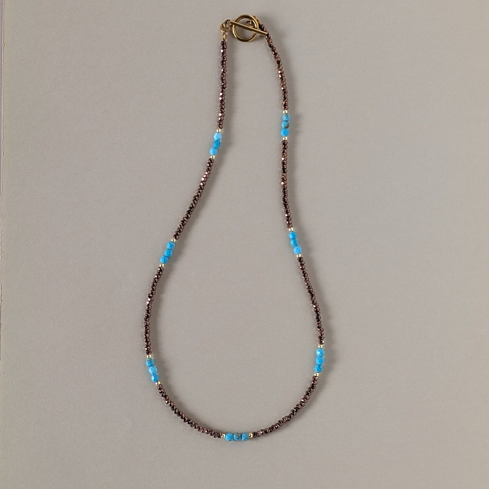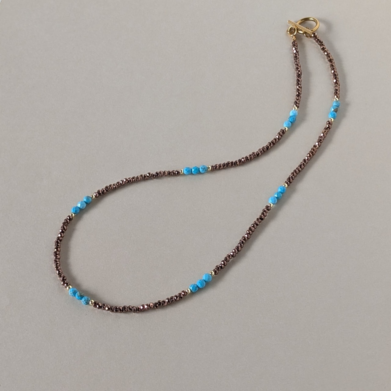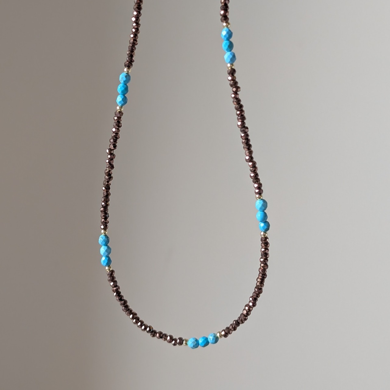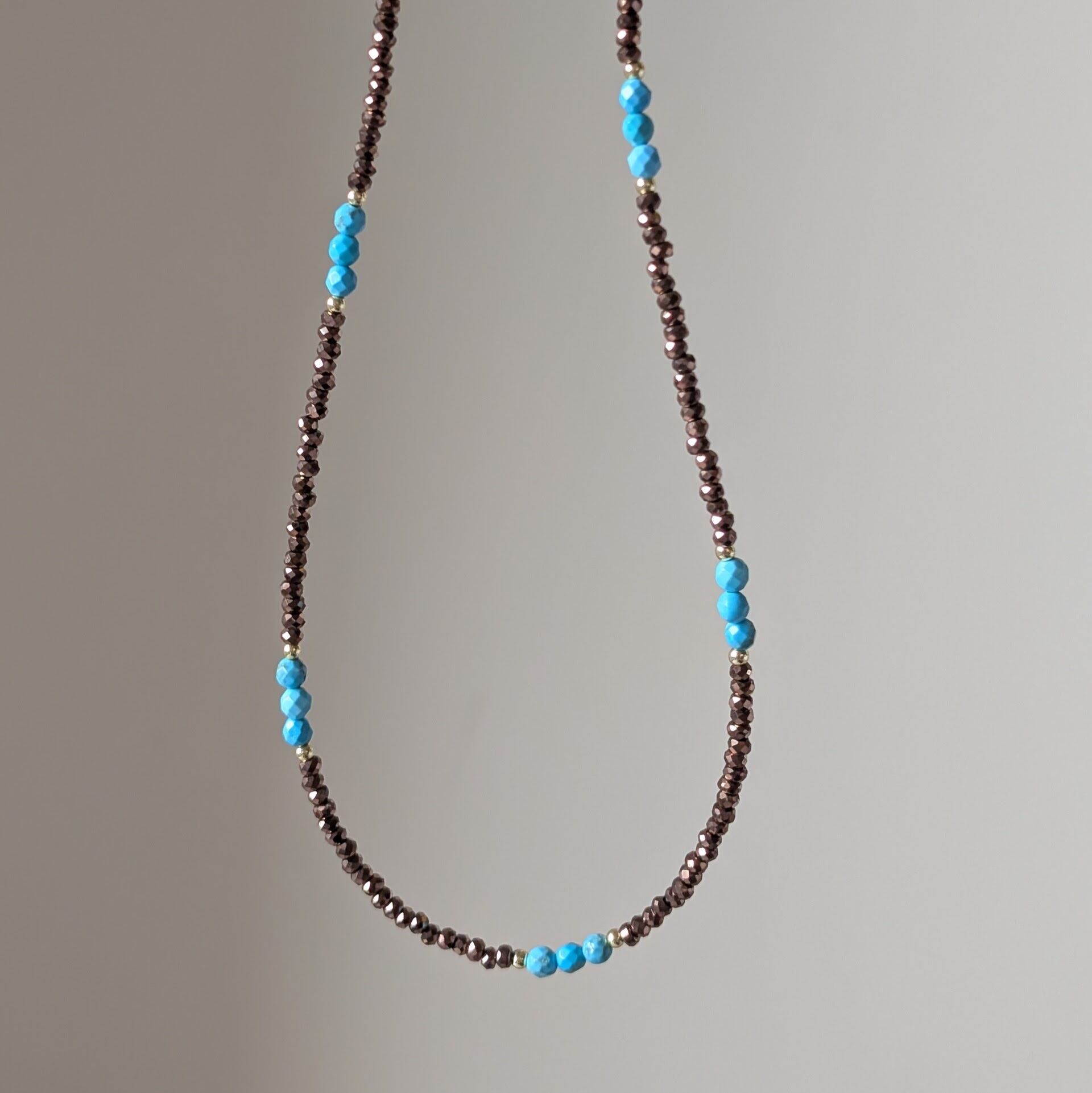 で多面カットのヘマタイトに鮮やかなターコイズが映えるロングネックレス。