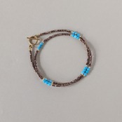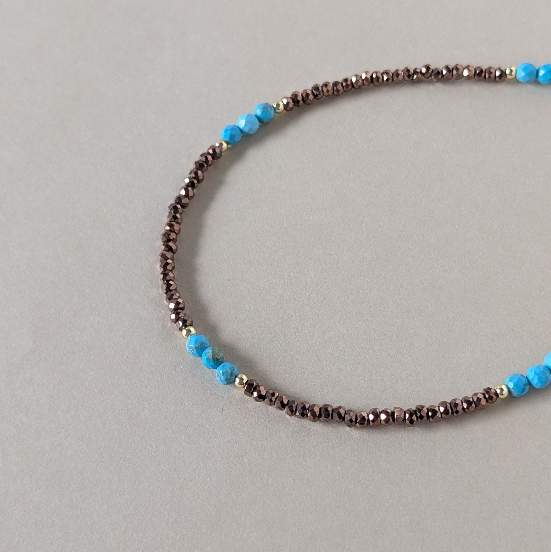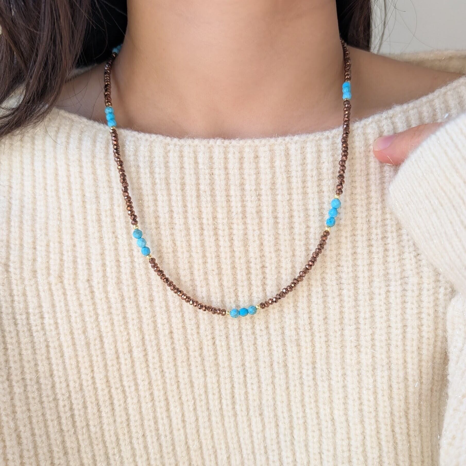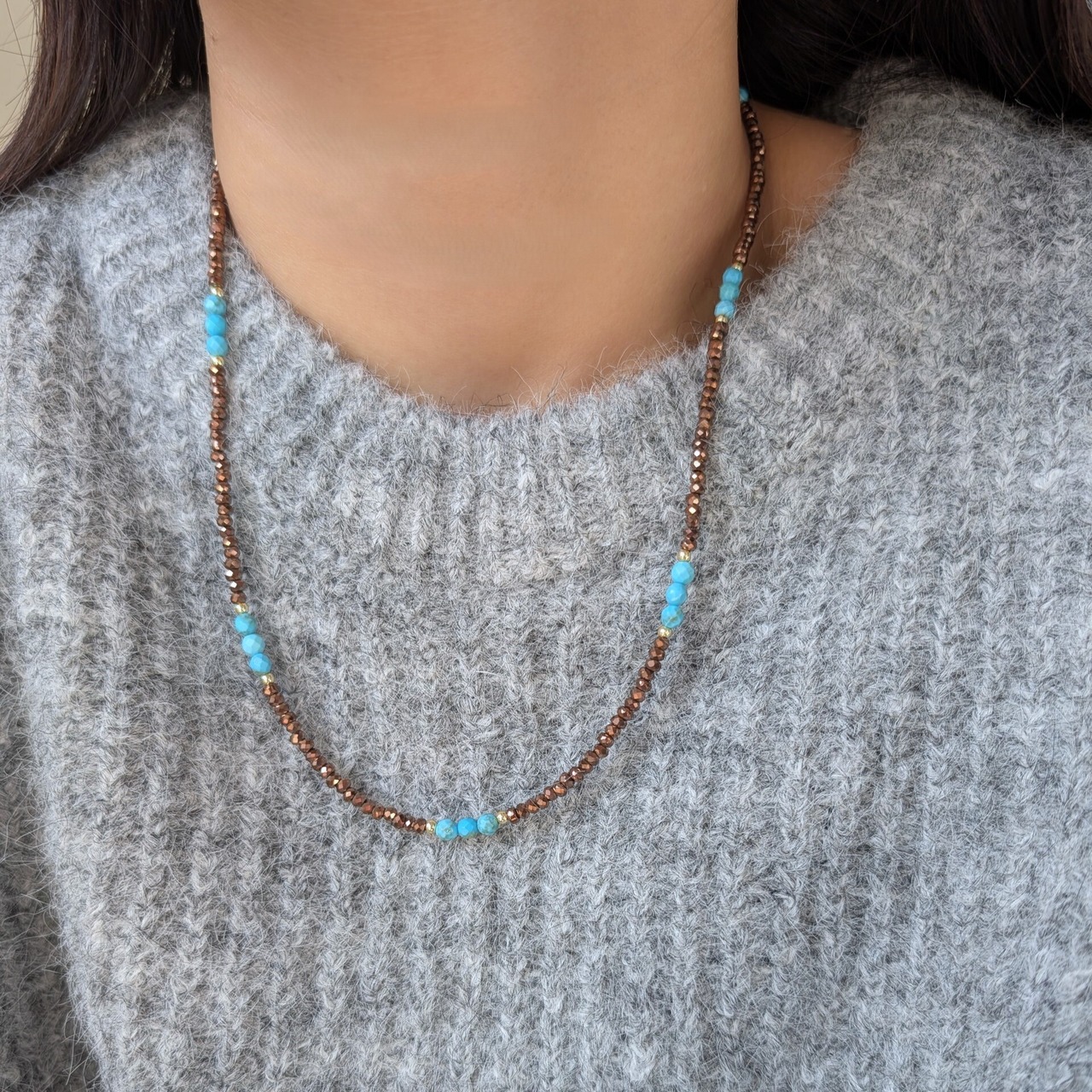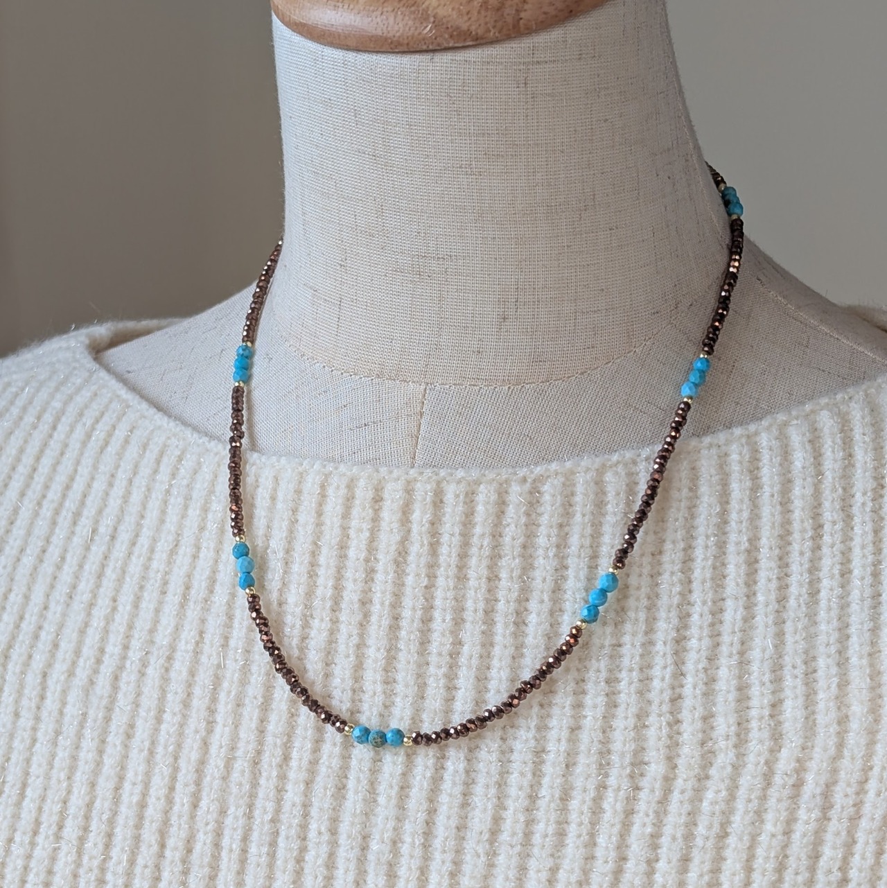 で多面カットのヘマタイトに鮮やかなターコイズが映えるロングネックレス。