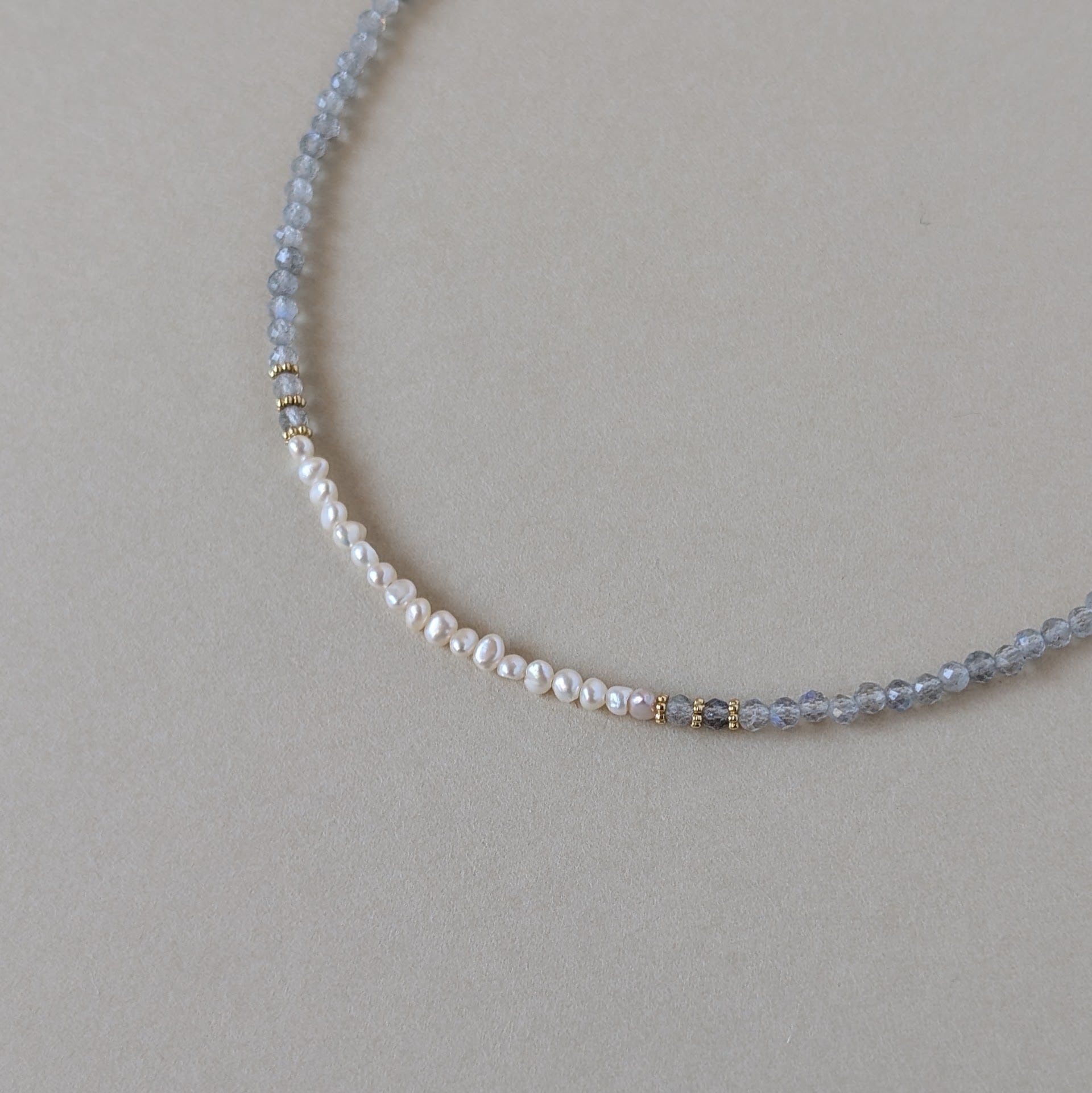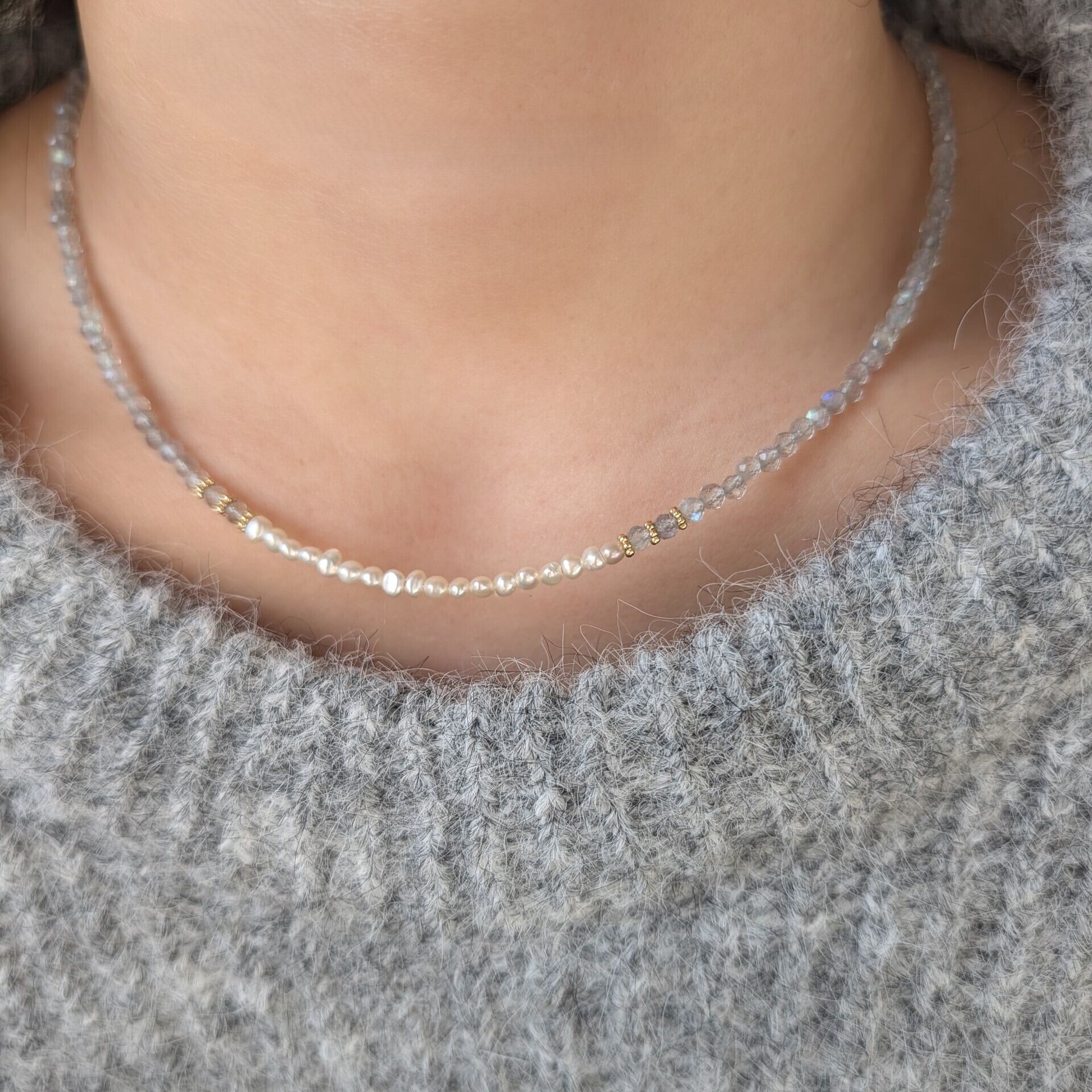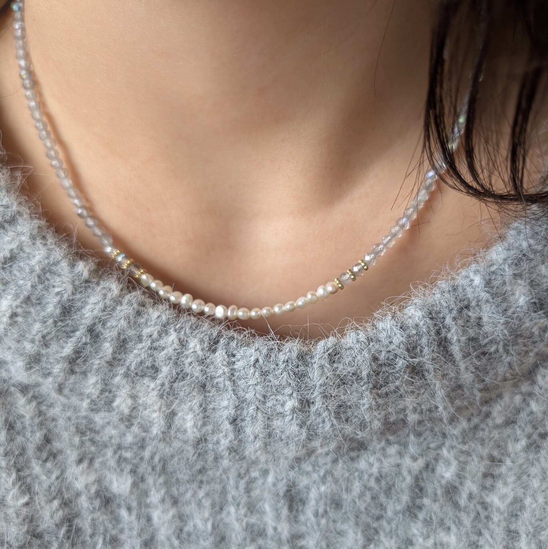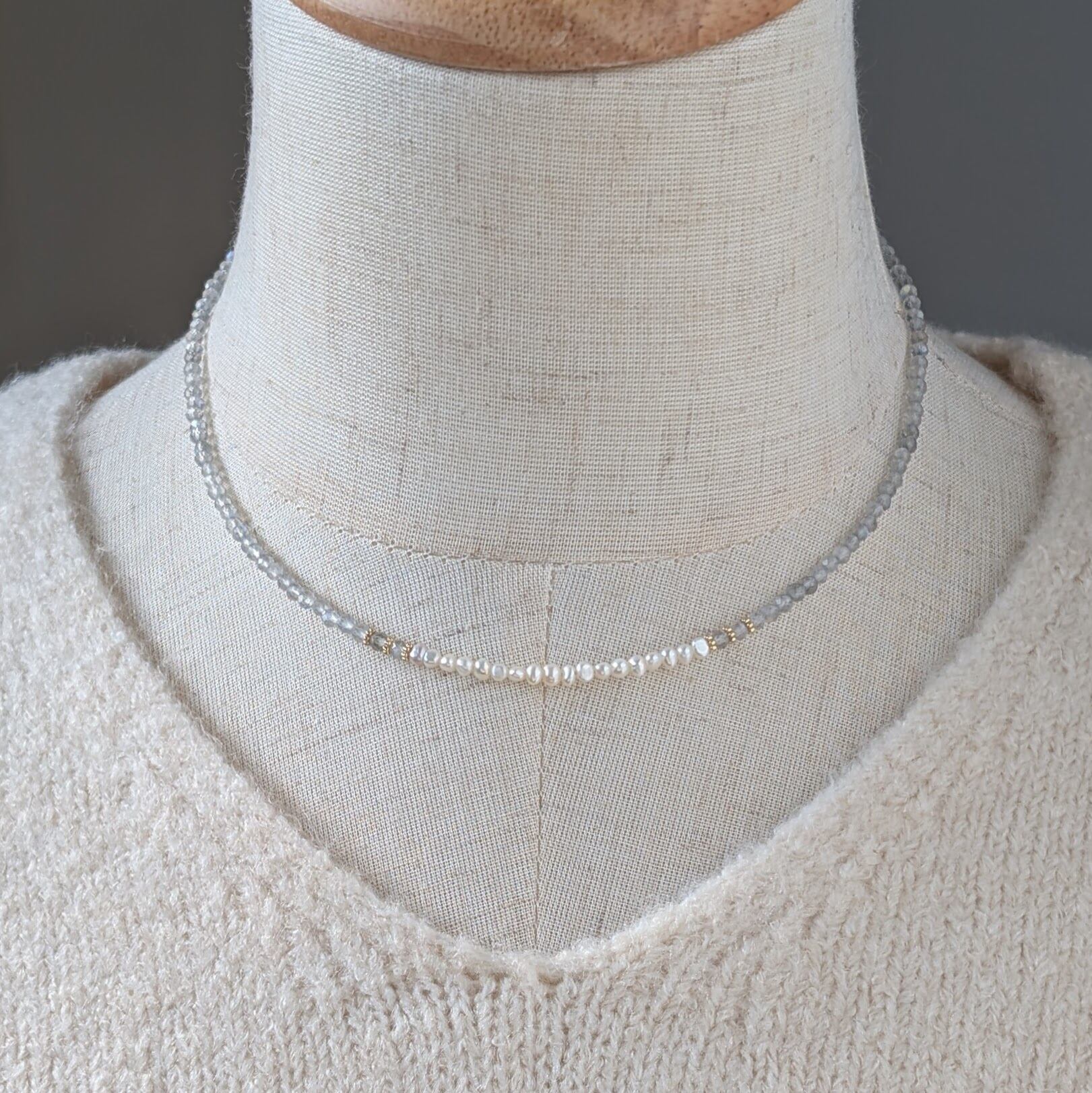 極小ながらも上質な貴重な淡水パールと組み合わせ大人可愛いネックレスに仕上げました。