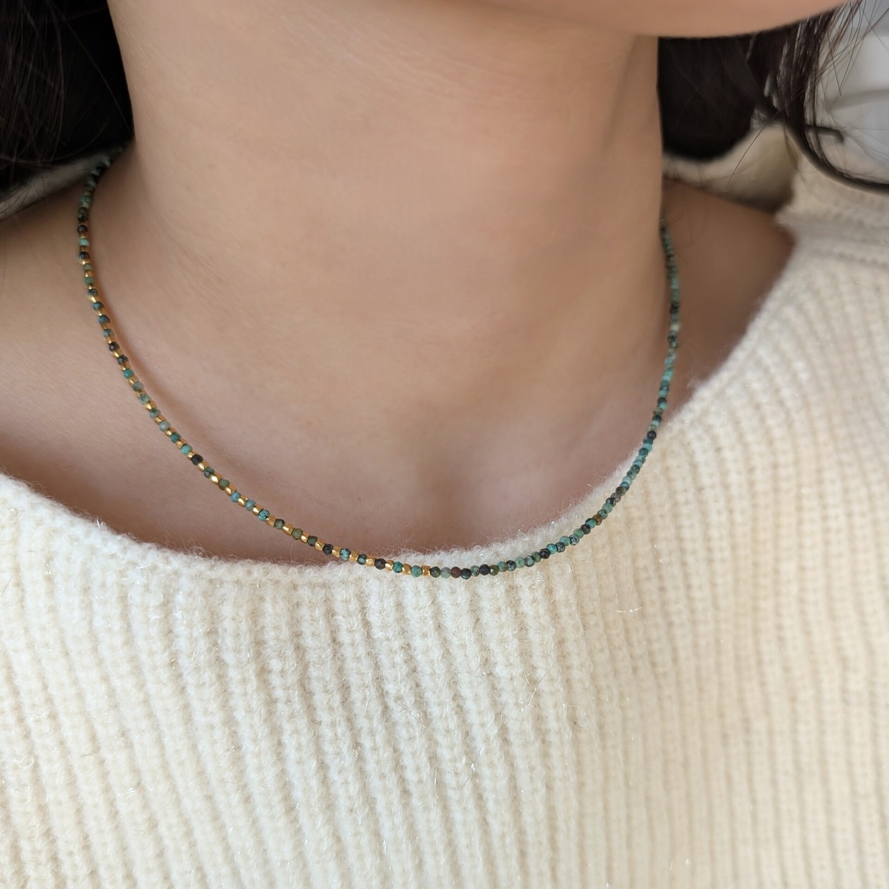 細くチェーンネックレスと同じような感覚でつけられます。