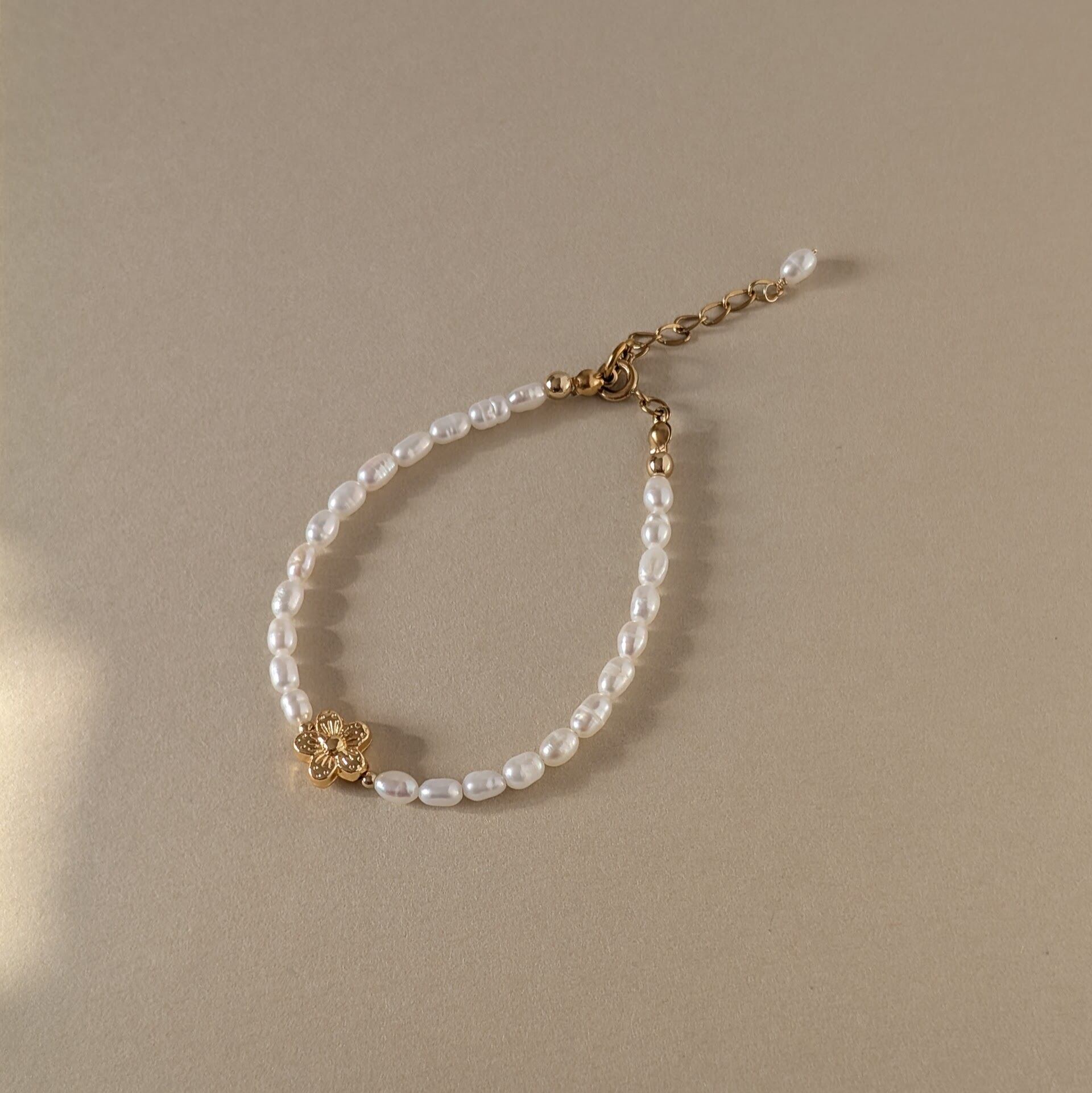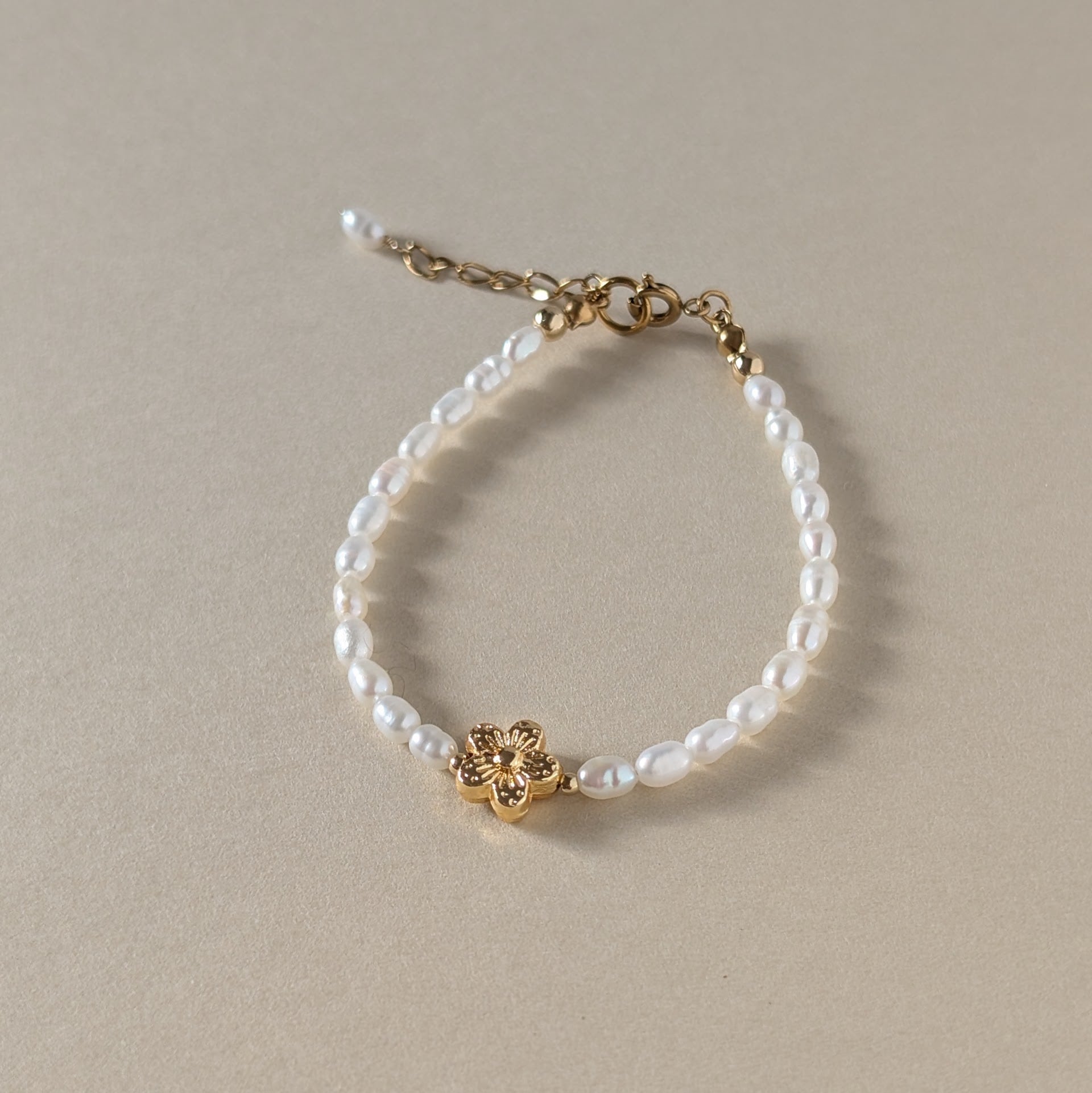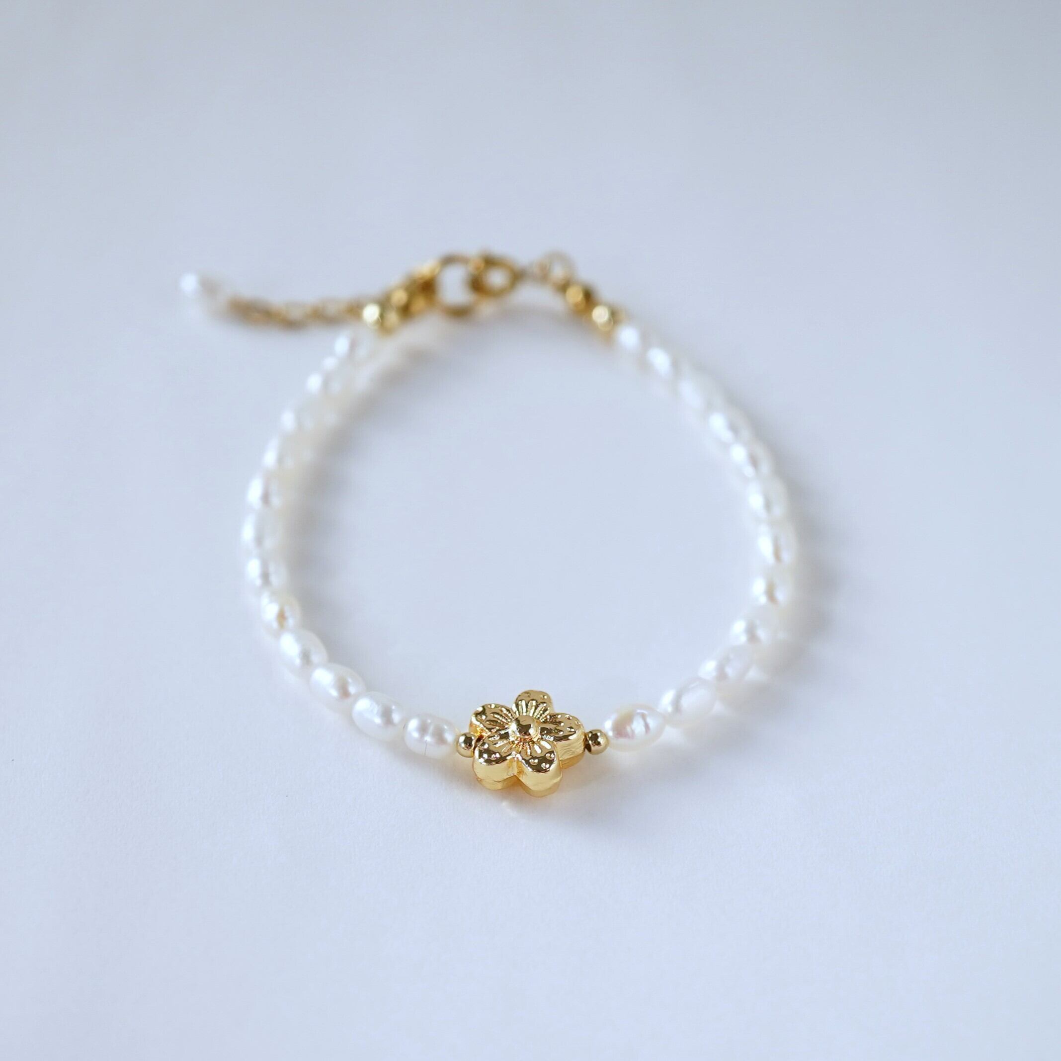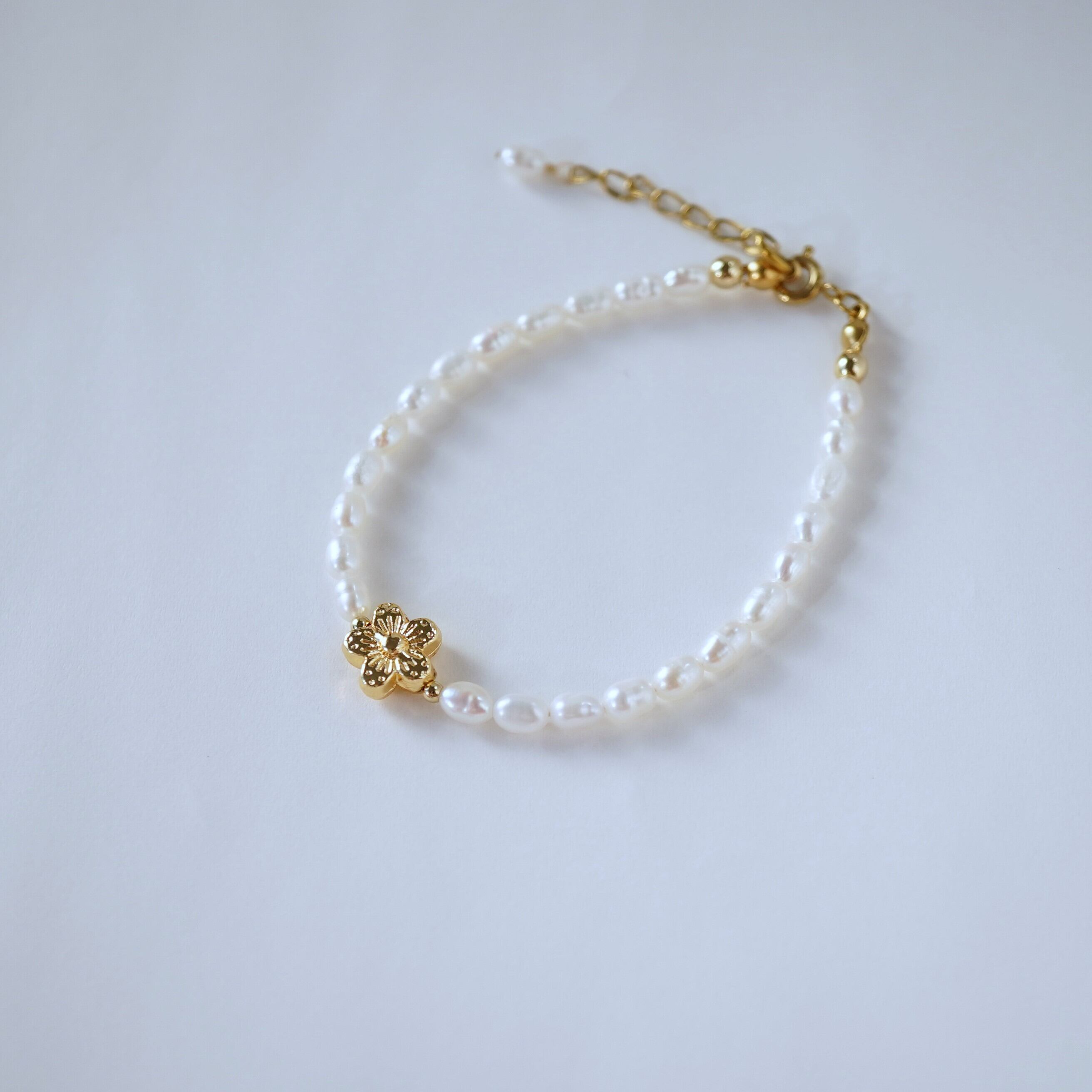 粒の揃った淡水パールにお花がポイントの可愛らしいブレスレットです。