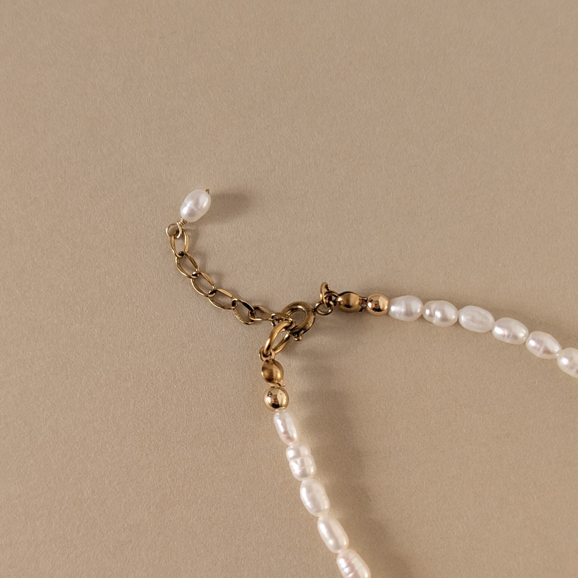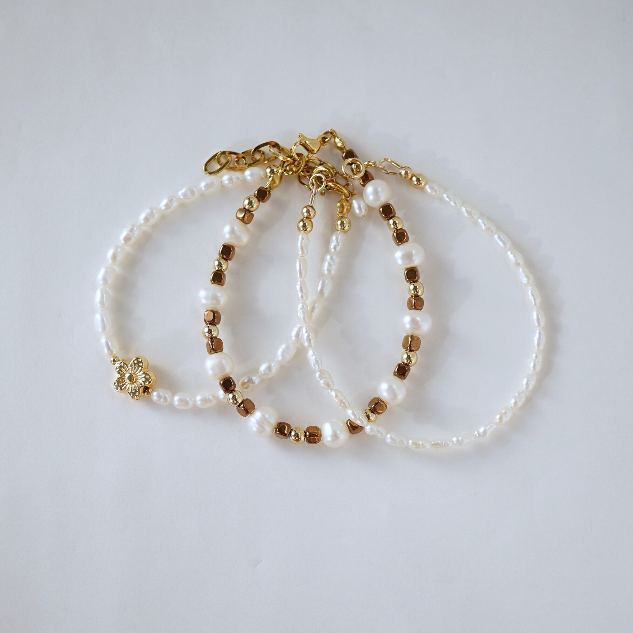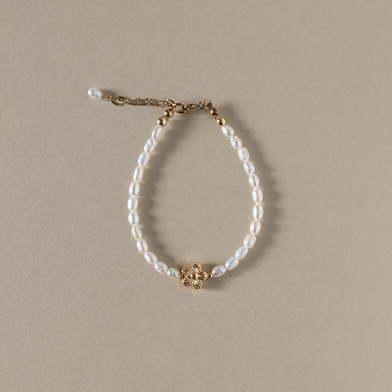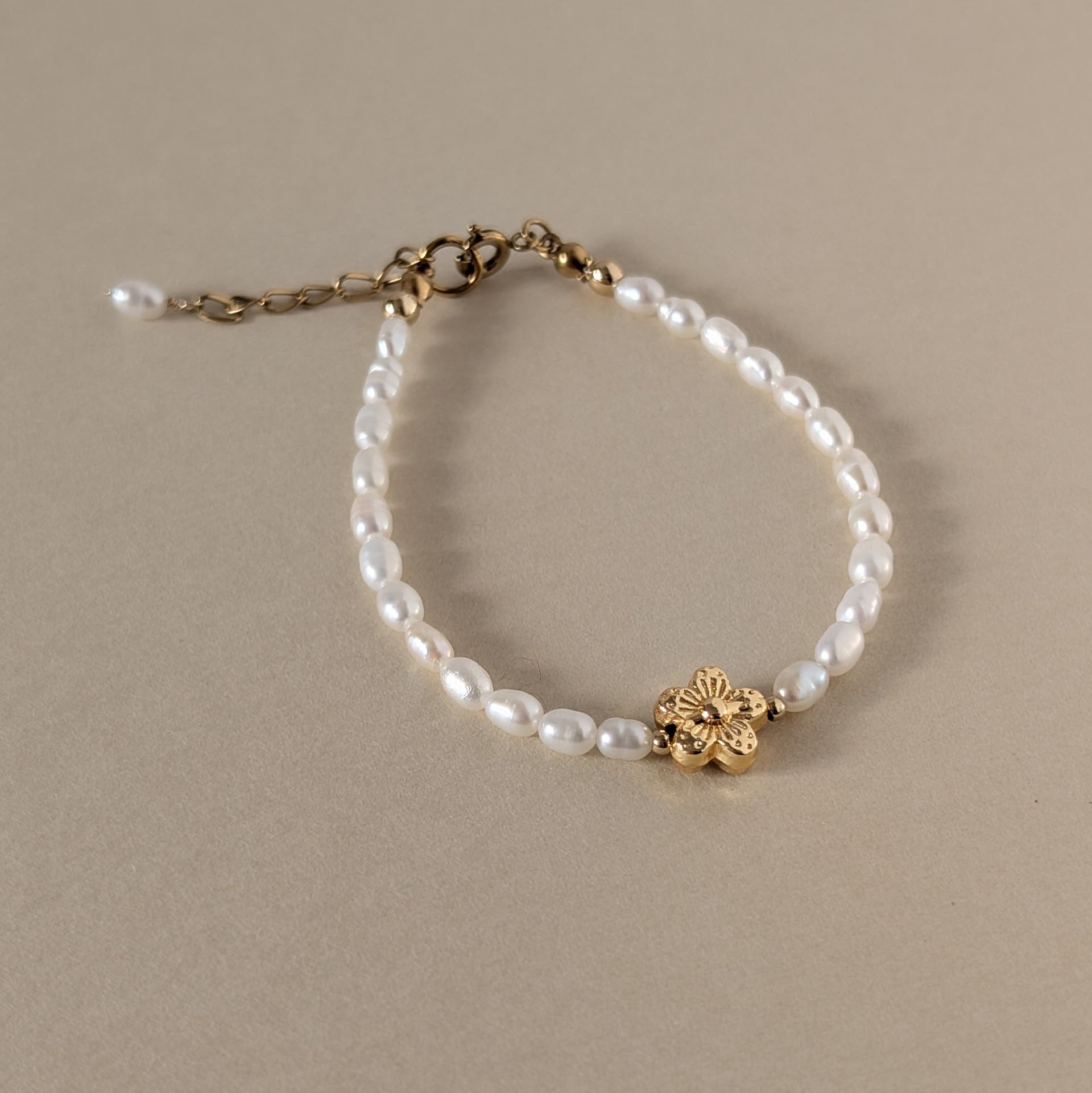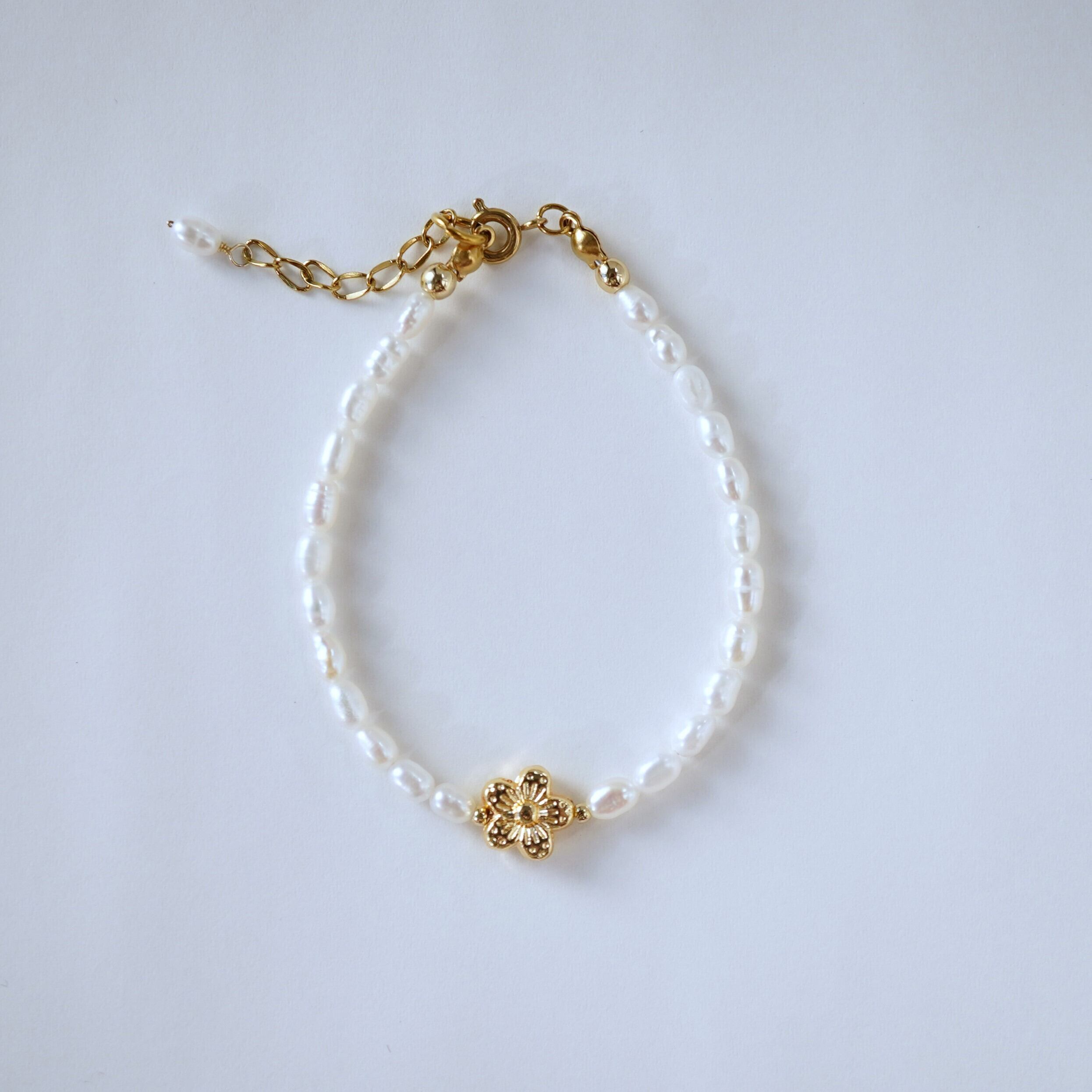 粒の揃った淡水パールにお花がポイントの可愛らしいブレスレットです。
