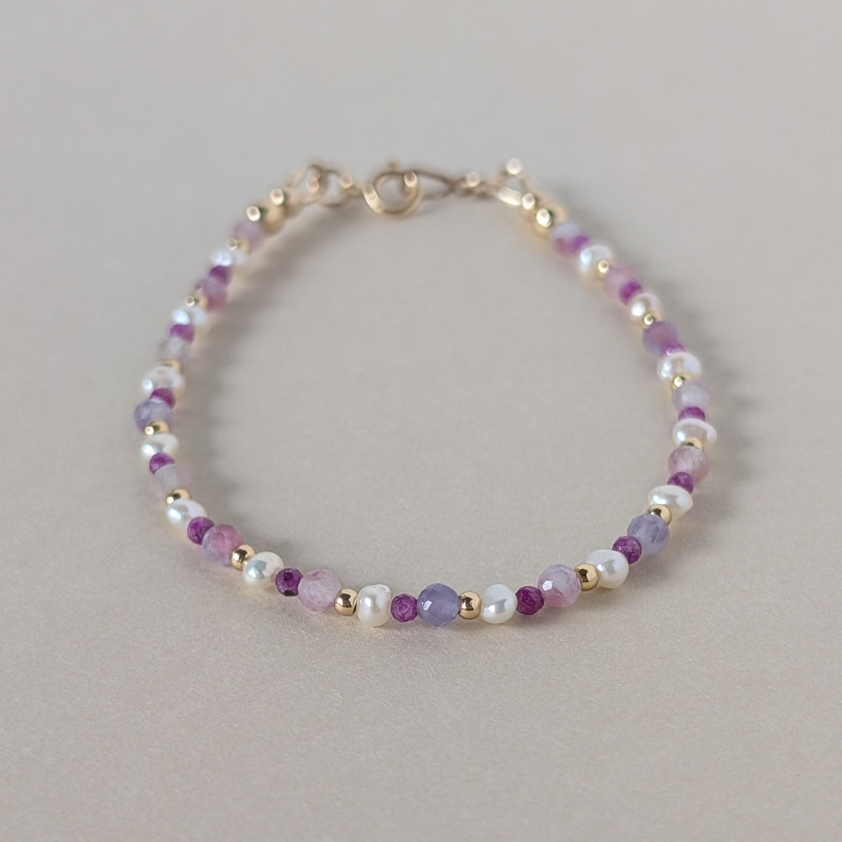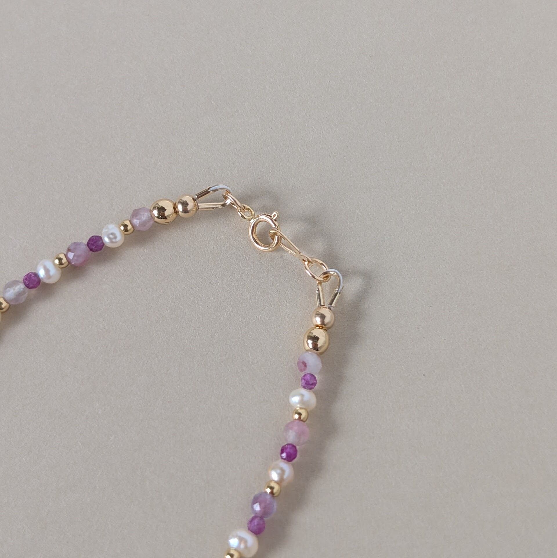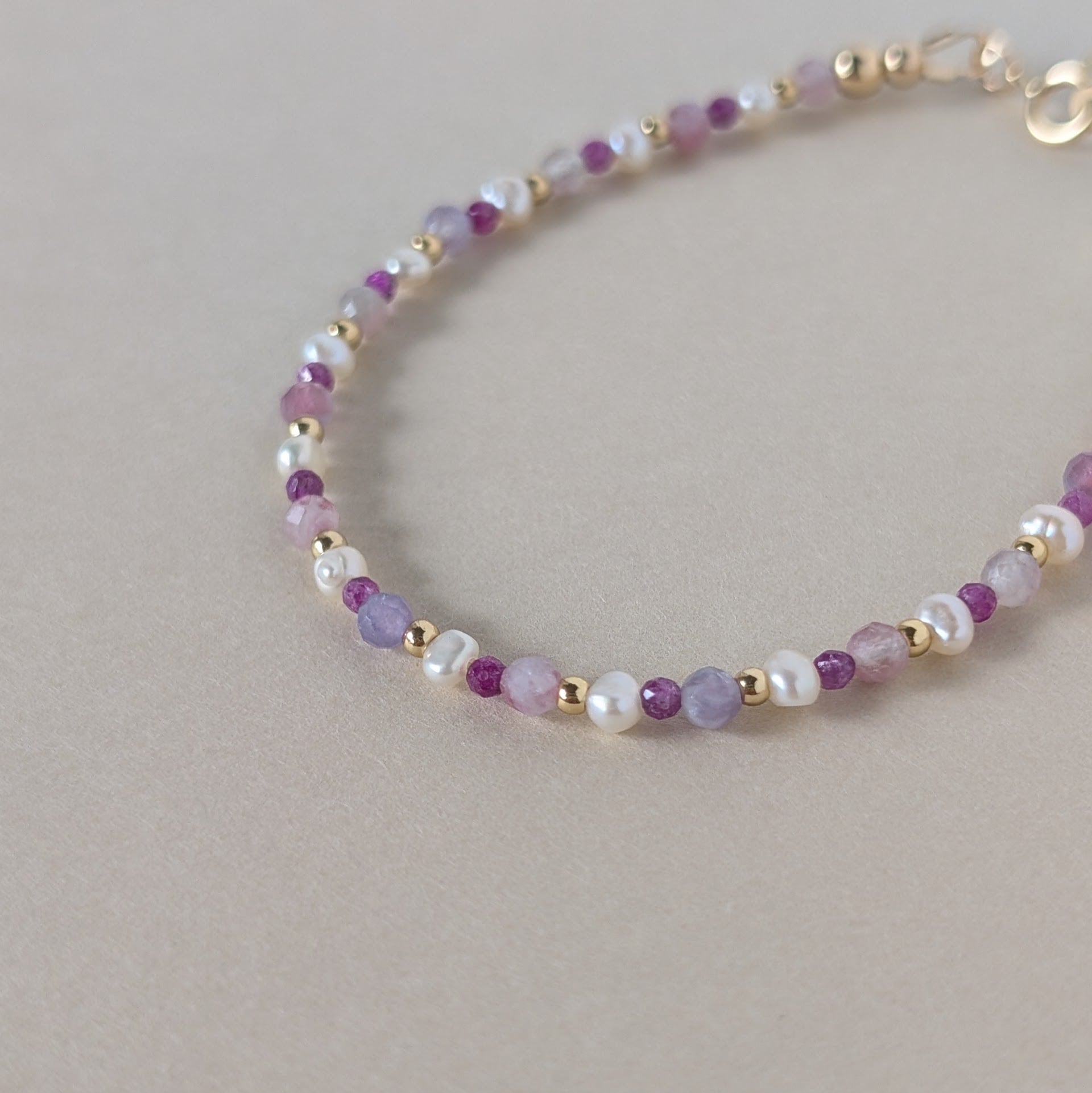 ピンクトルマリンよりも柔らかい色味のピンクトルマリンシリカに極小2㎜ながらも発色の良い天然ルビーをあわせたブレスレットです。