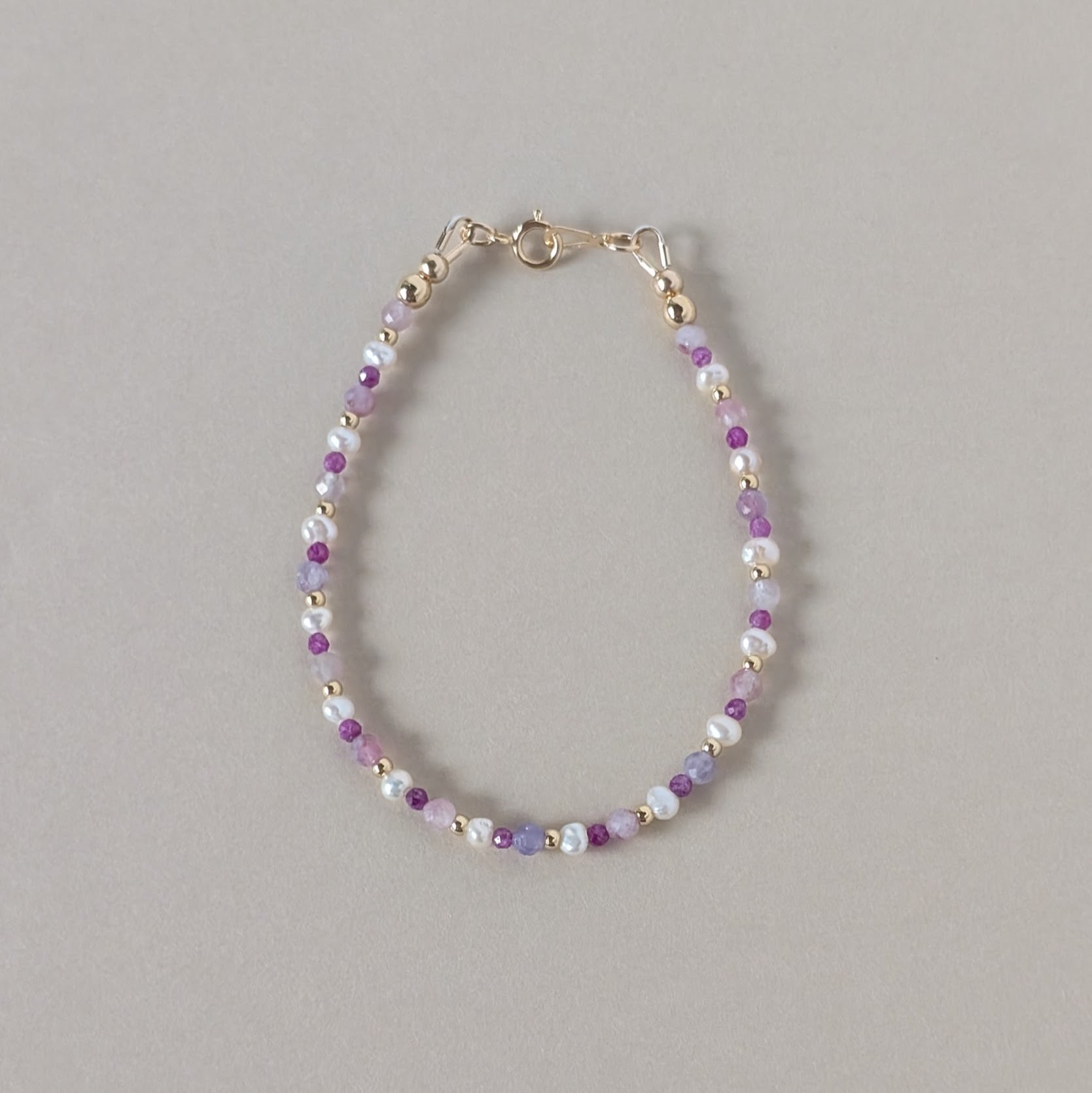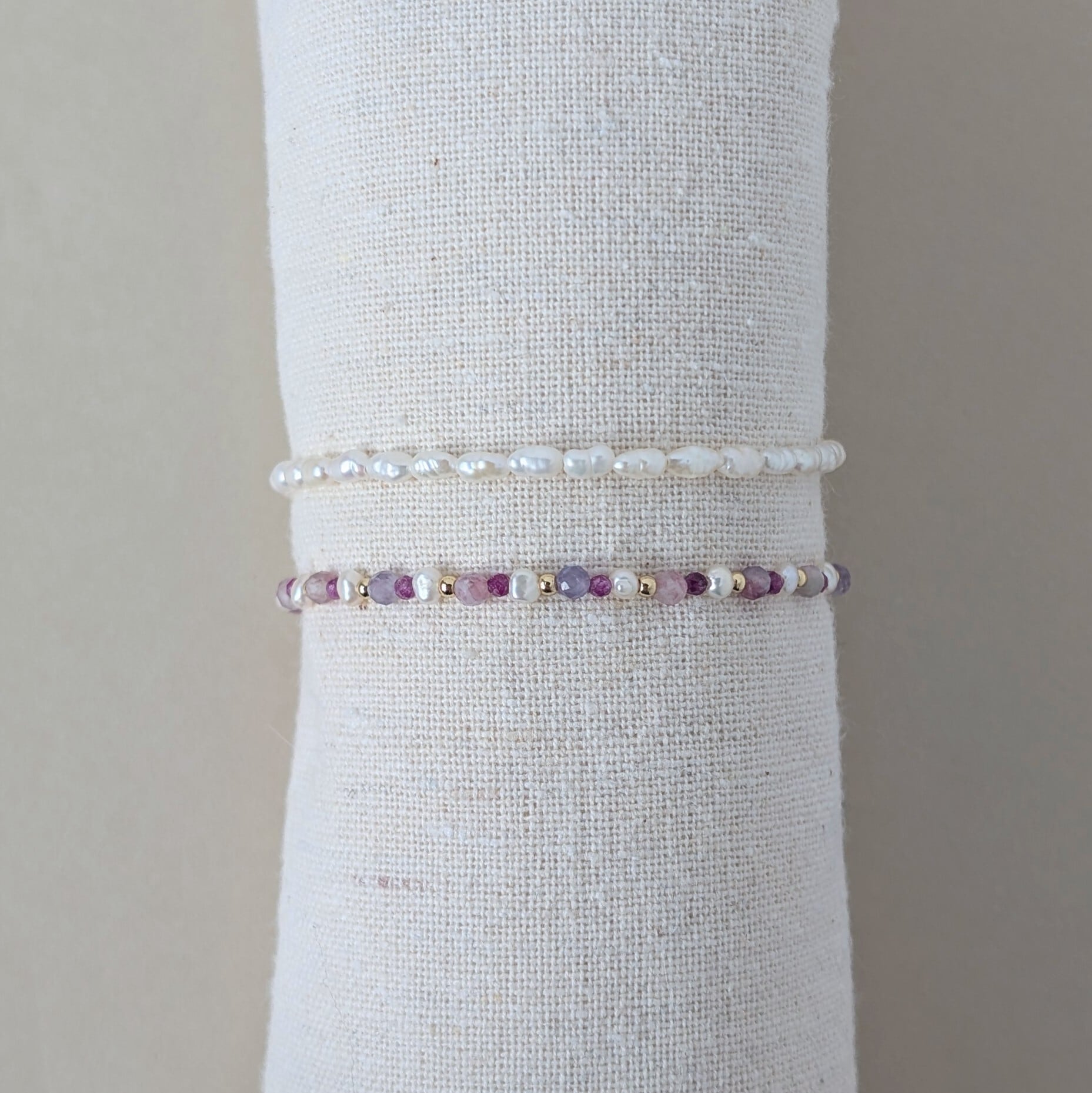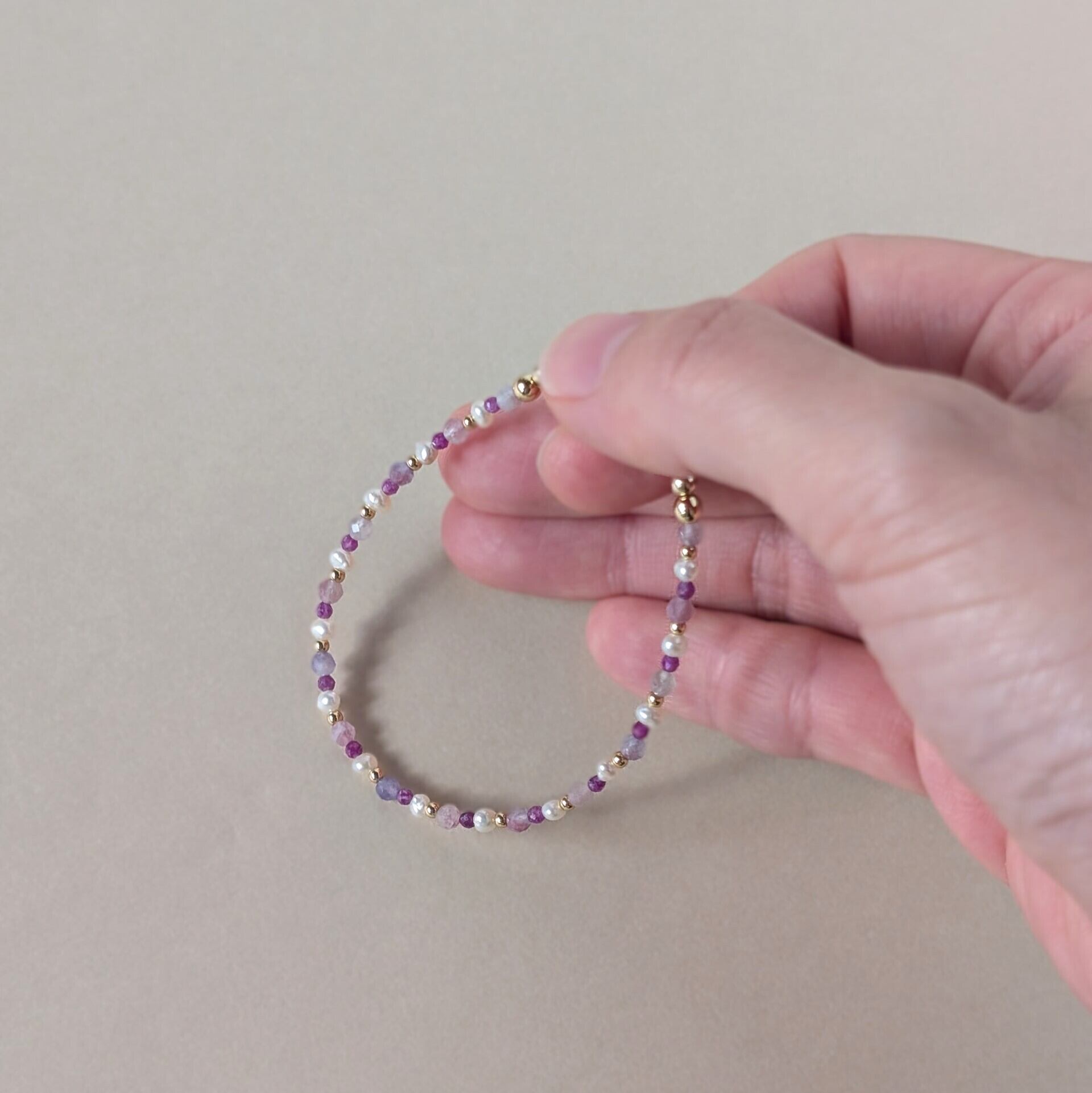 ピンクトルマリンよりも柔らかい色味のピンクトルマリンシリカに極小2㎜ながらも発色の良い天然ルビーをあわせたブレスレットです。
