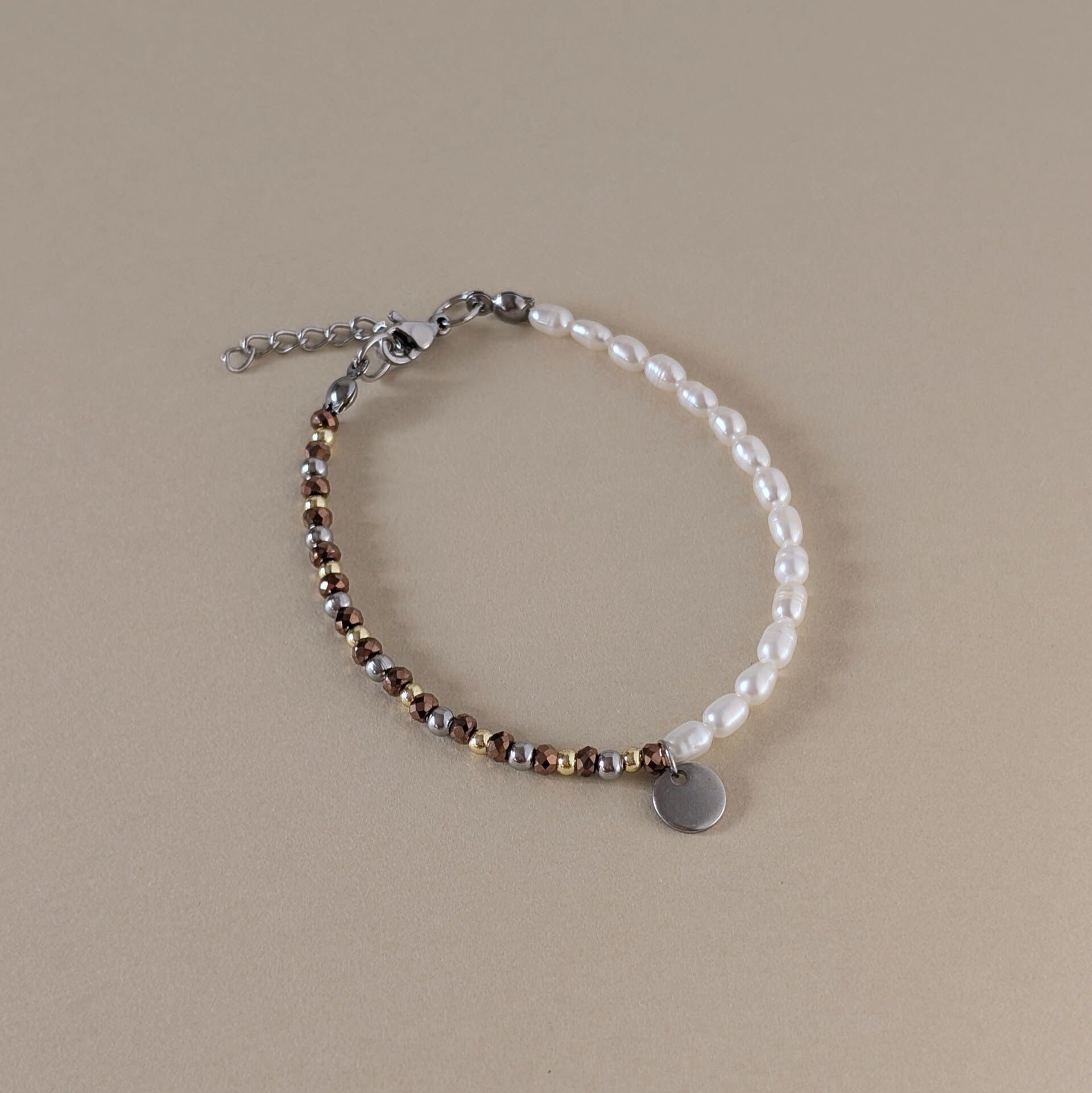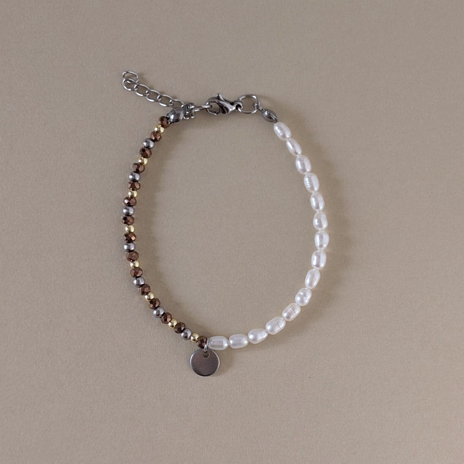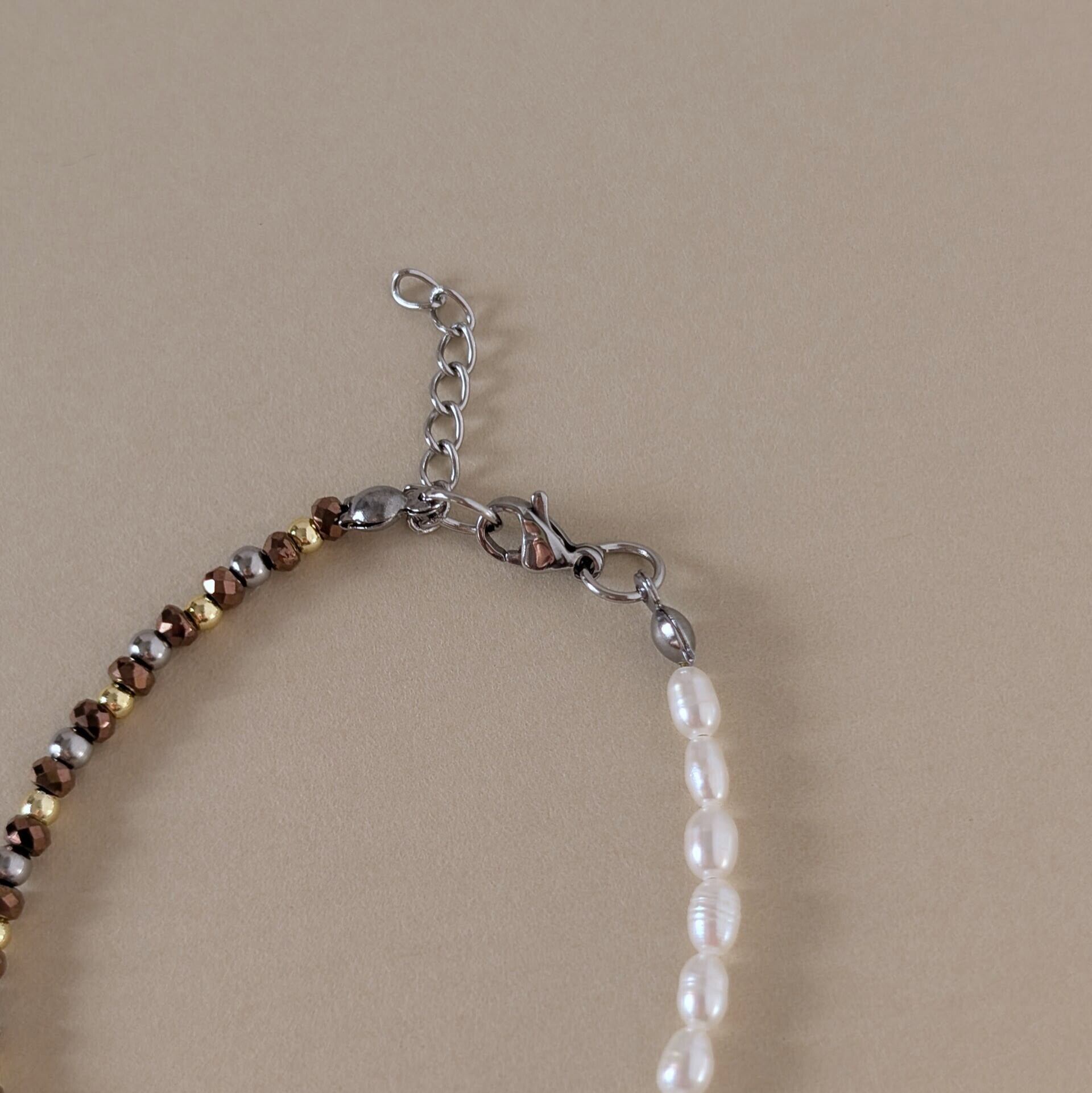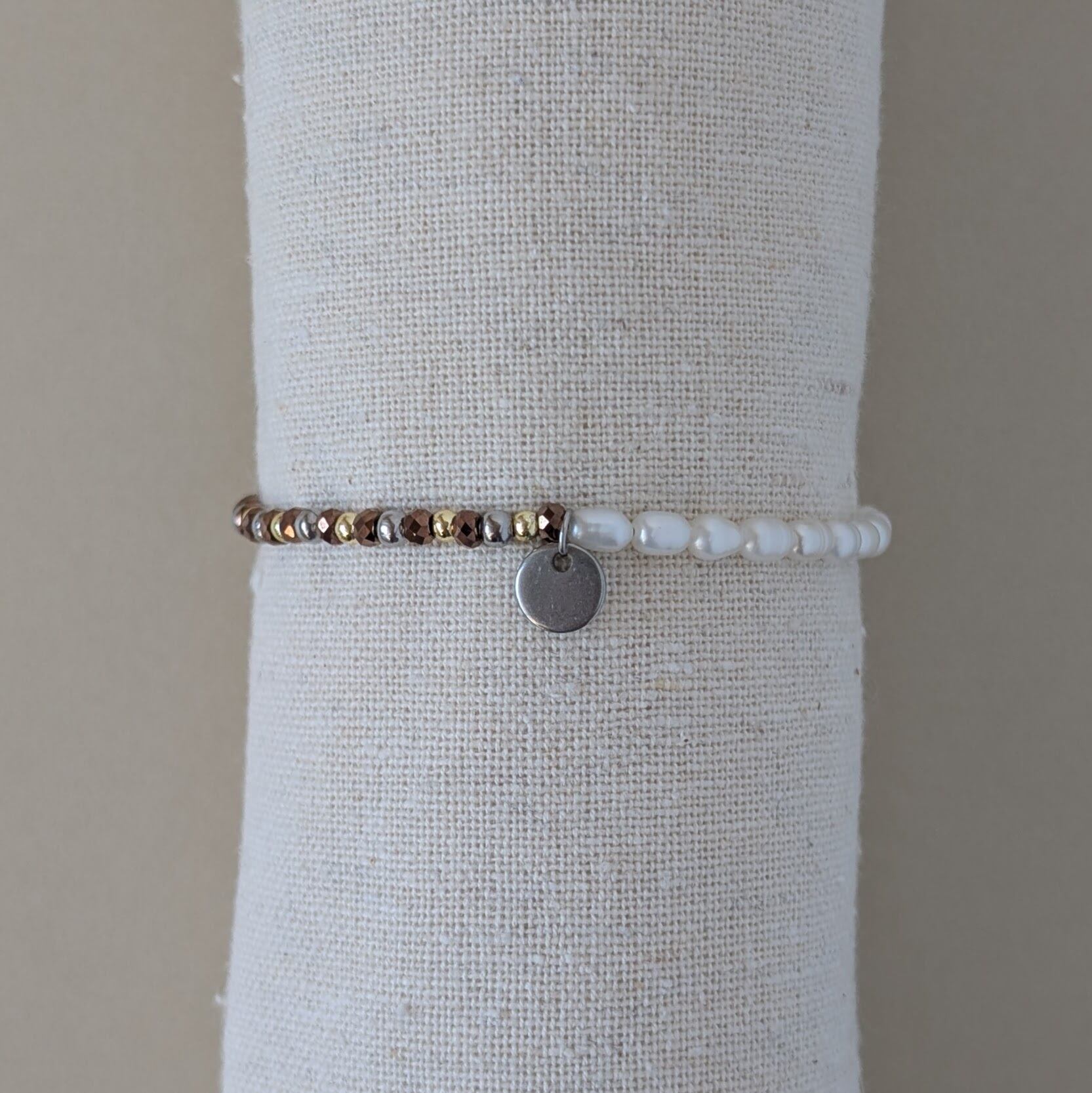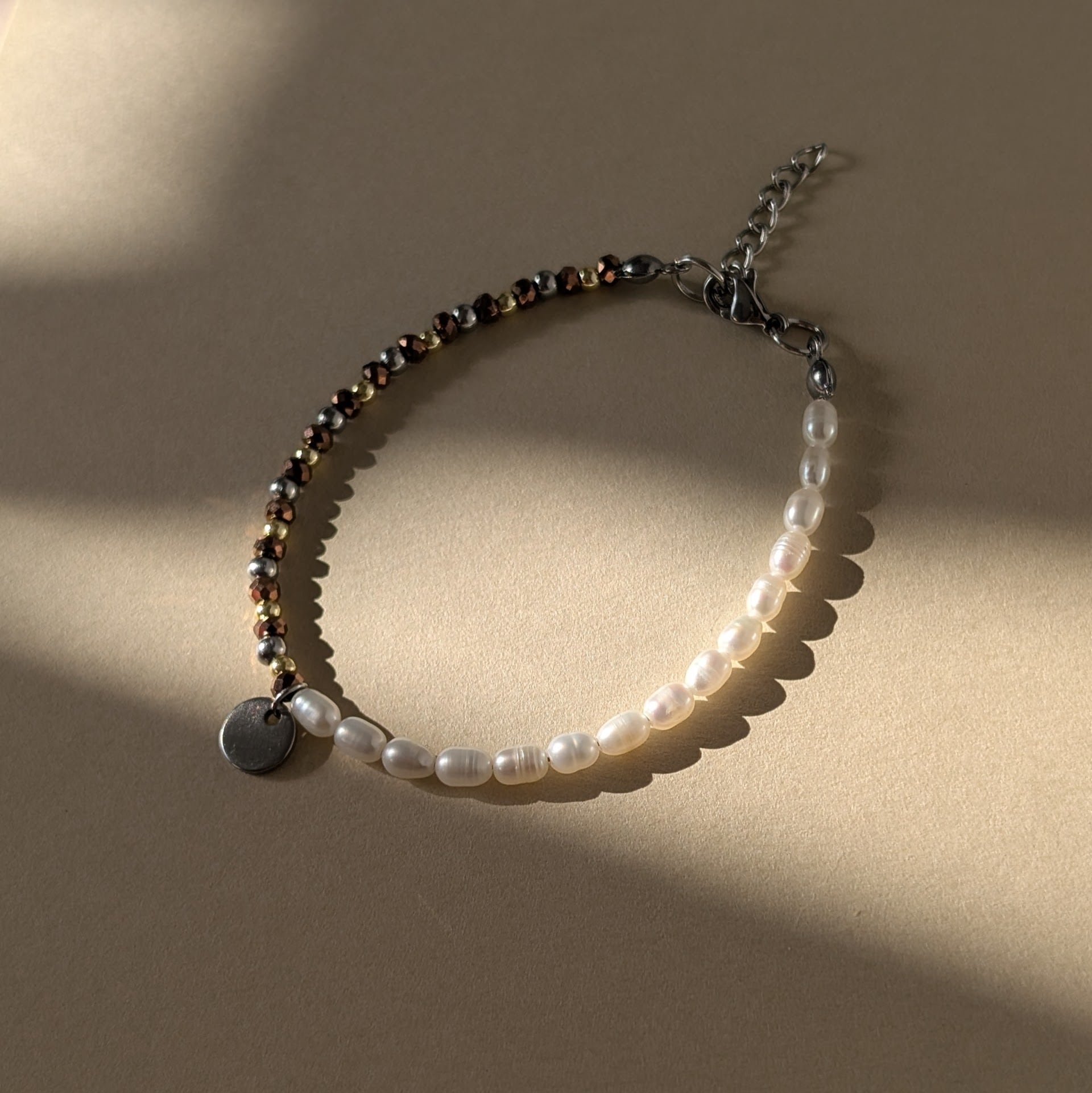 メタルのような質感のヘマタイトに淡水パールを合わせたブレスレット。
