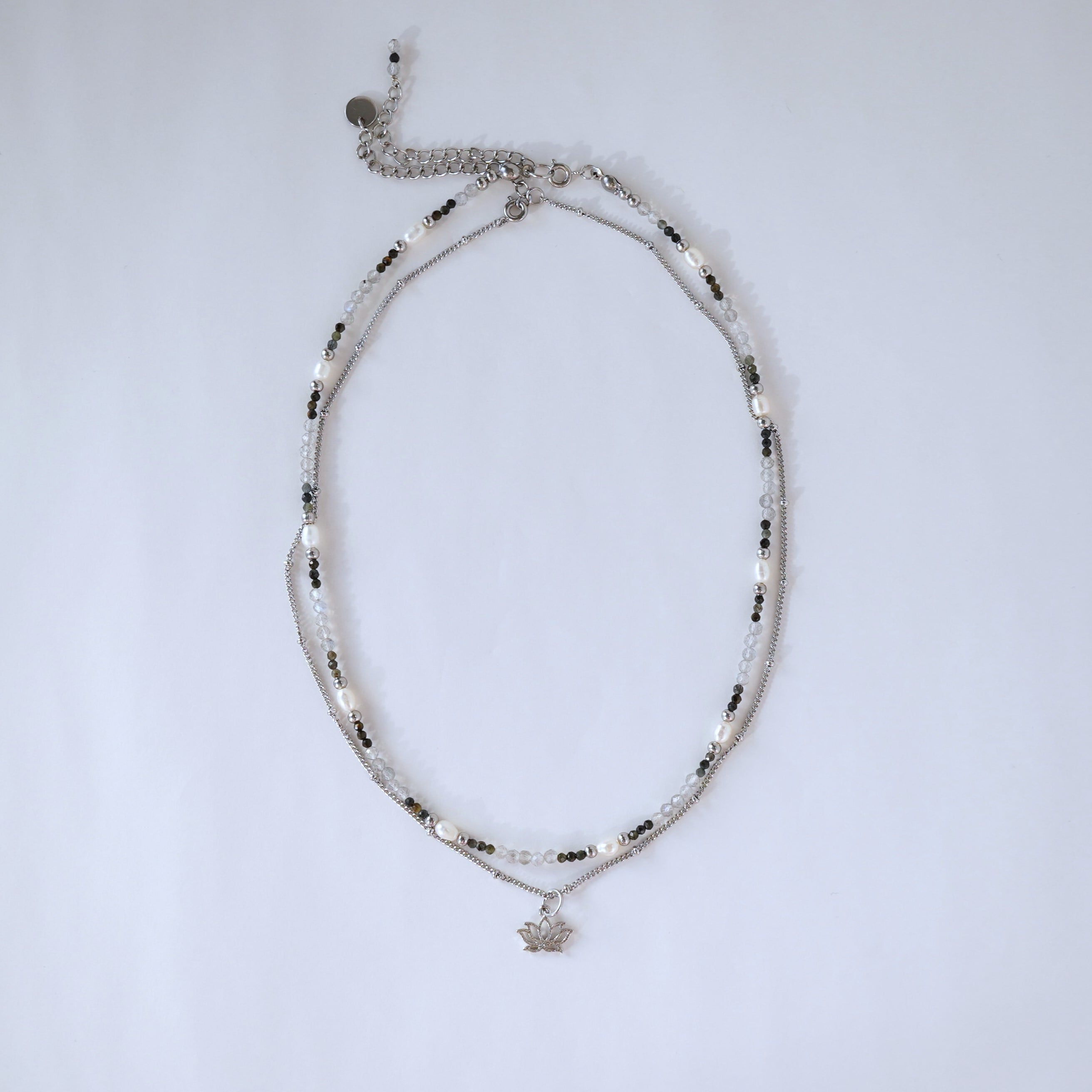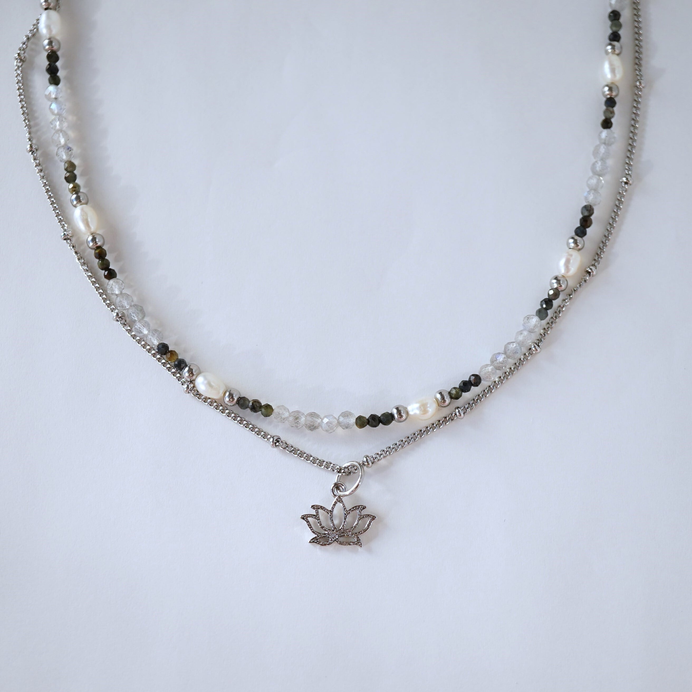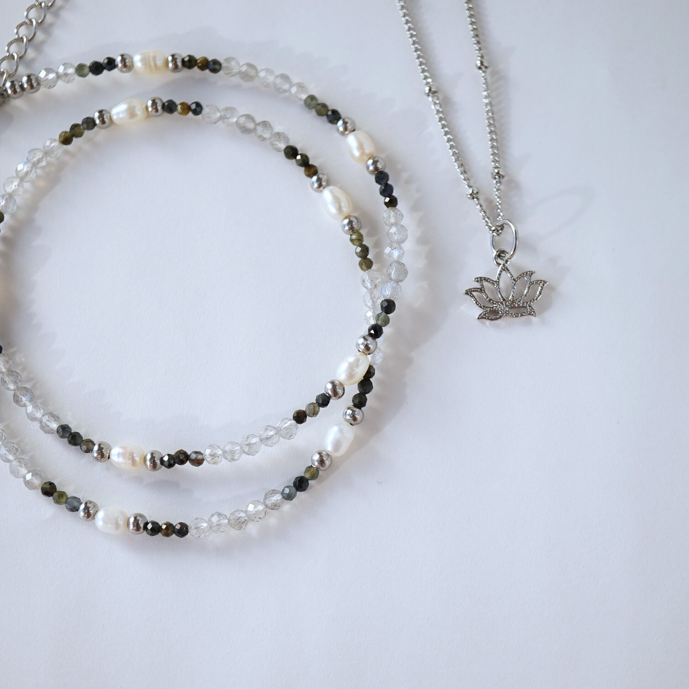 2本SET 蓮の花とモノトーン天然石のネックレス mixダイガーアイ ラブラドライト サージカルステンレス