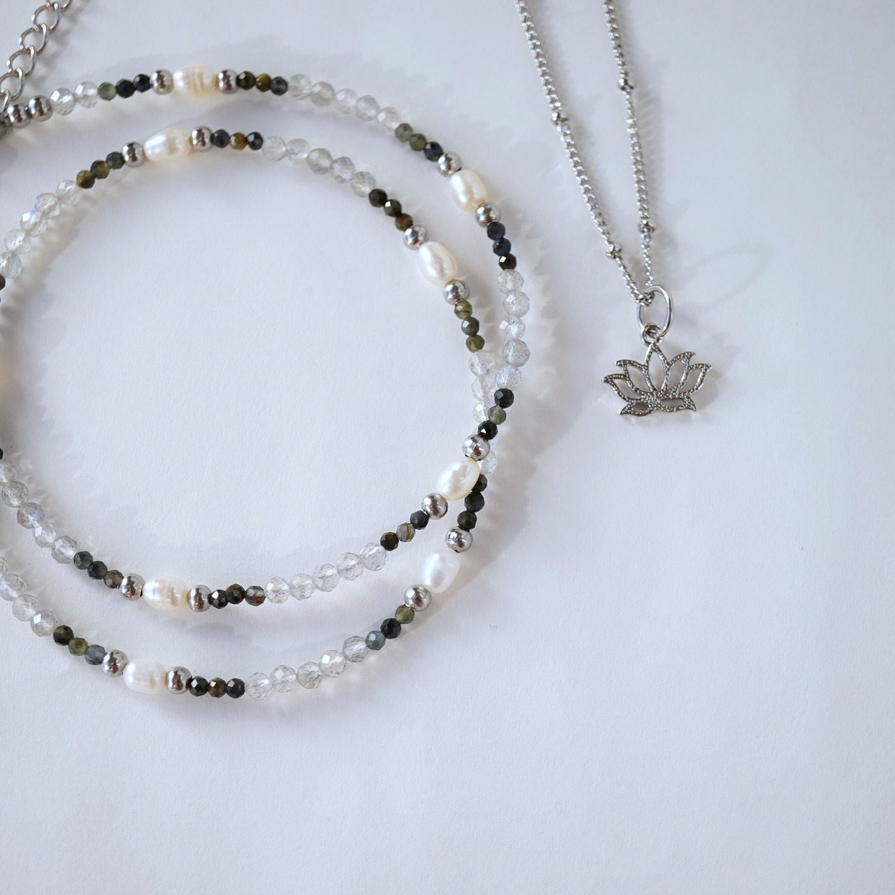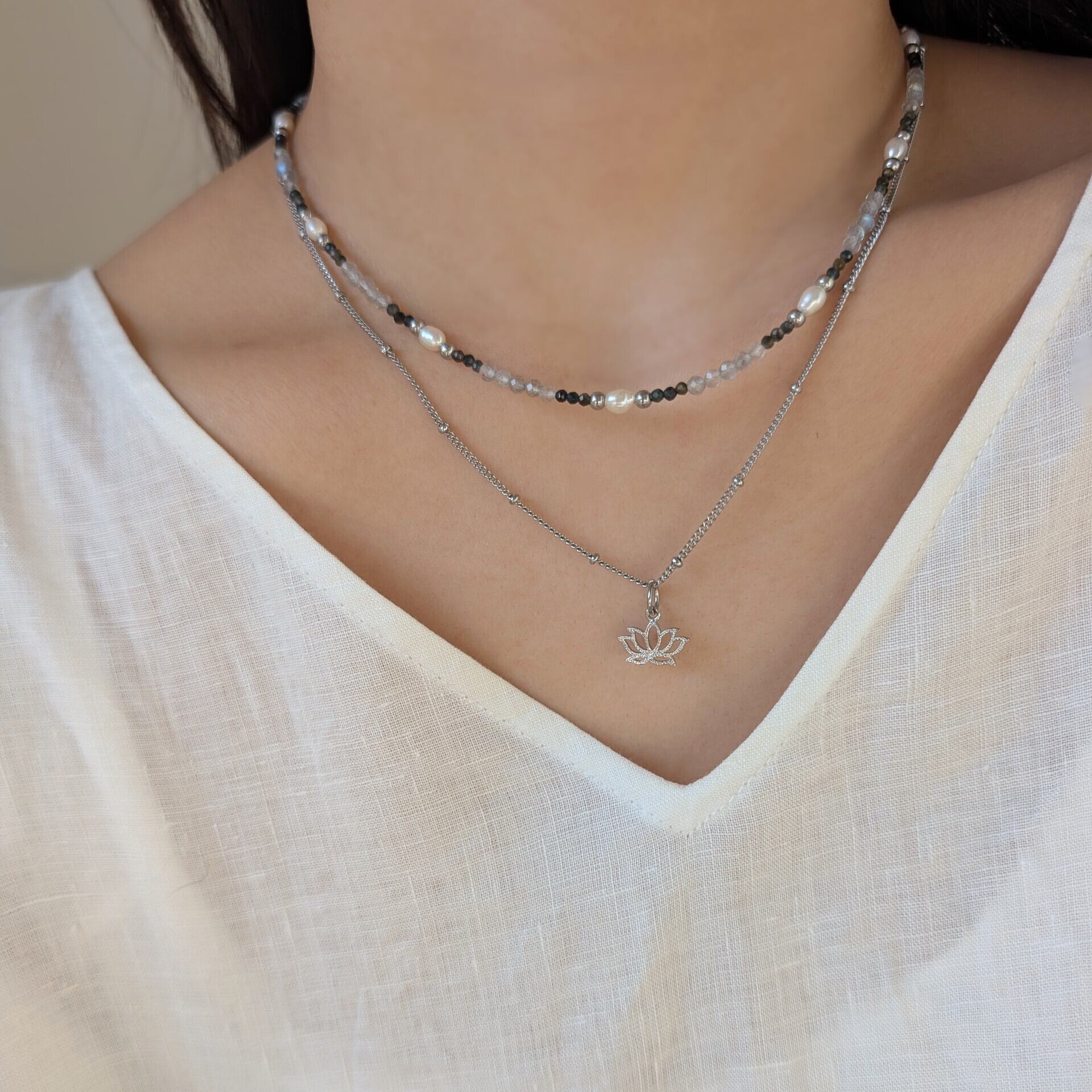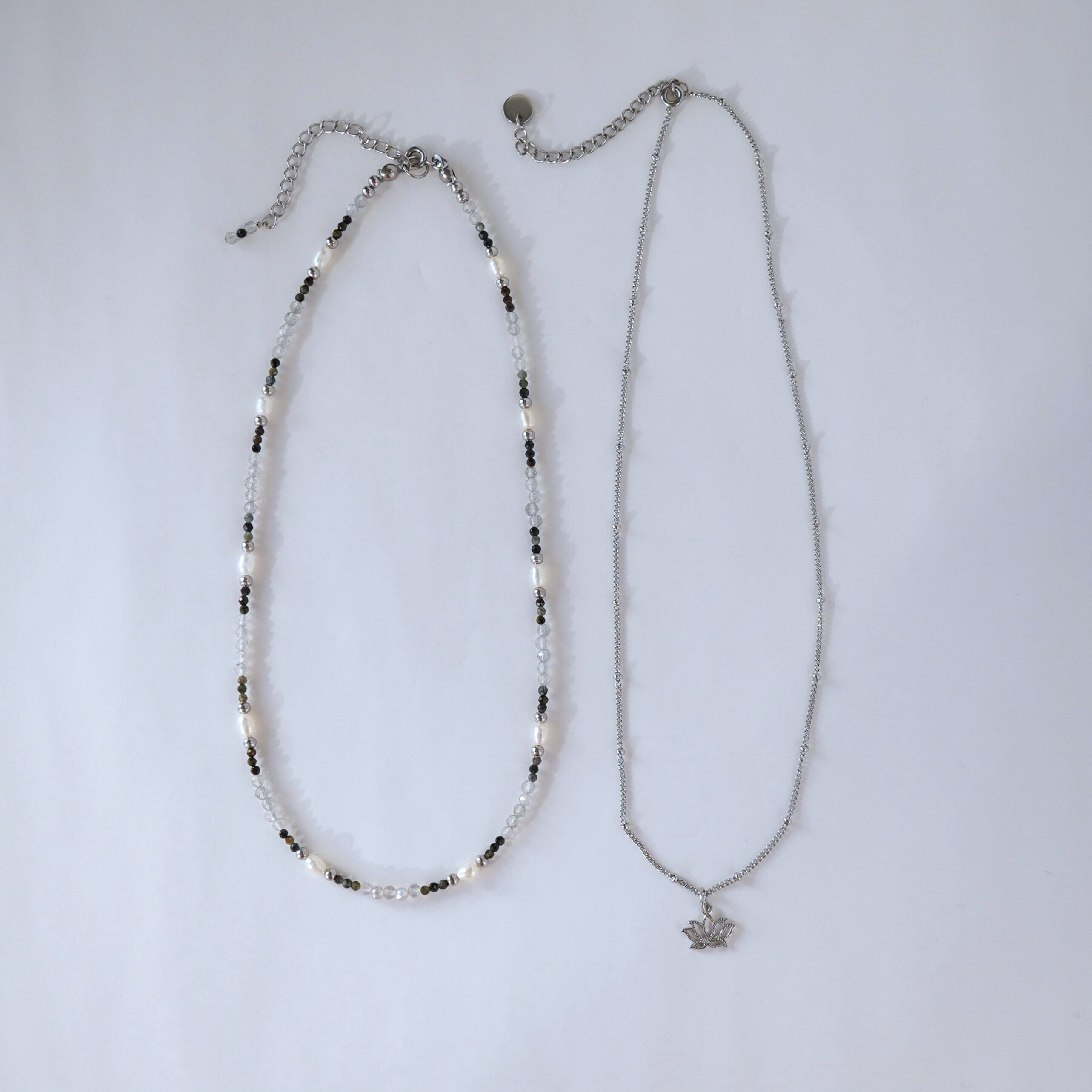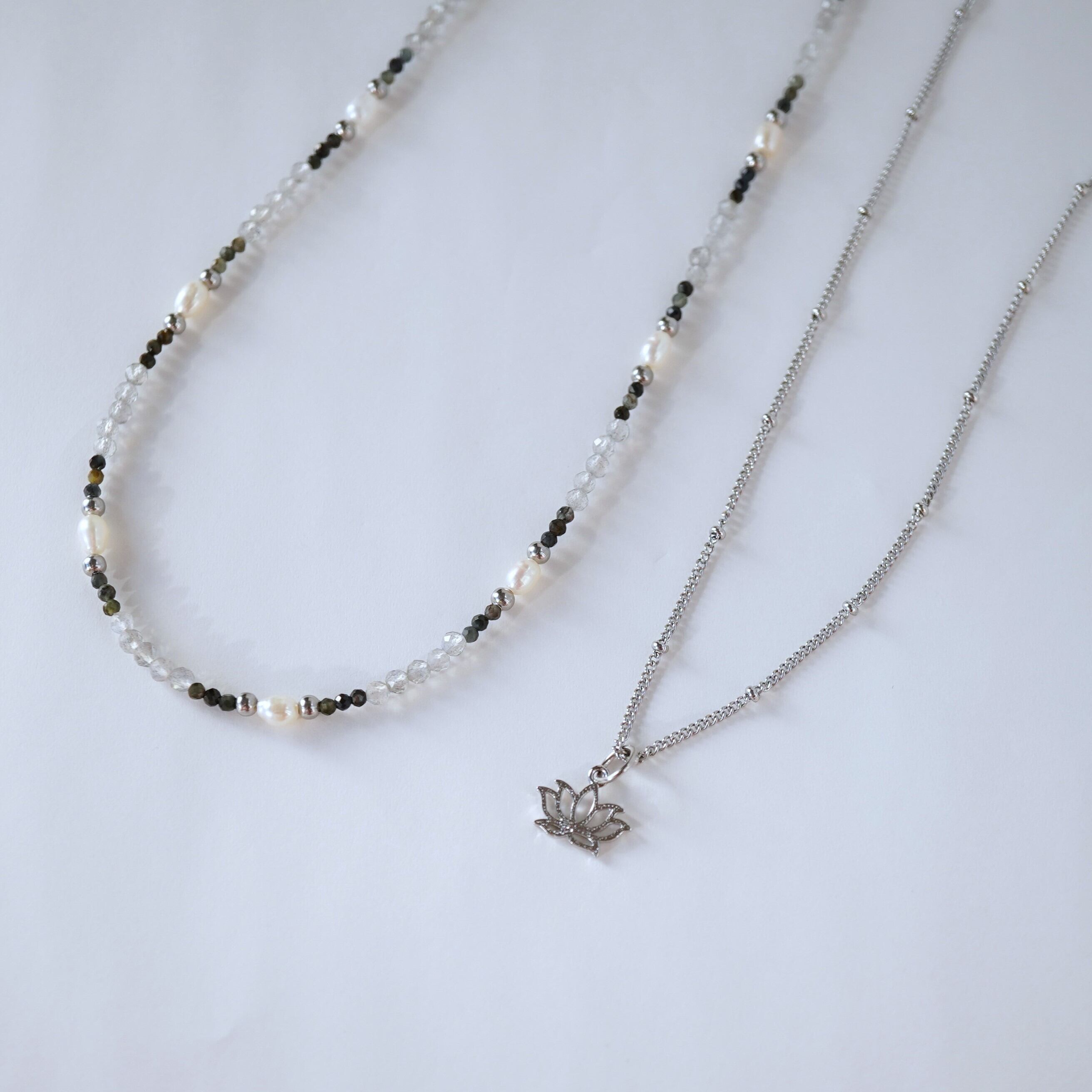 蓮のチャームにシンプルなデザインチェーンのネックレスとモノトーンカラーの天然石ネックレスのセット。