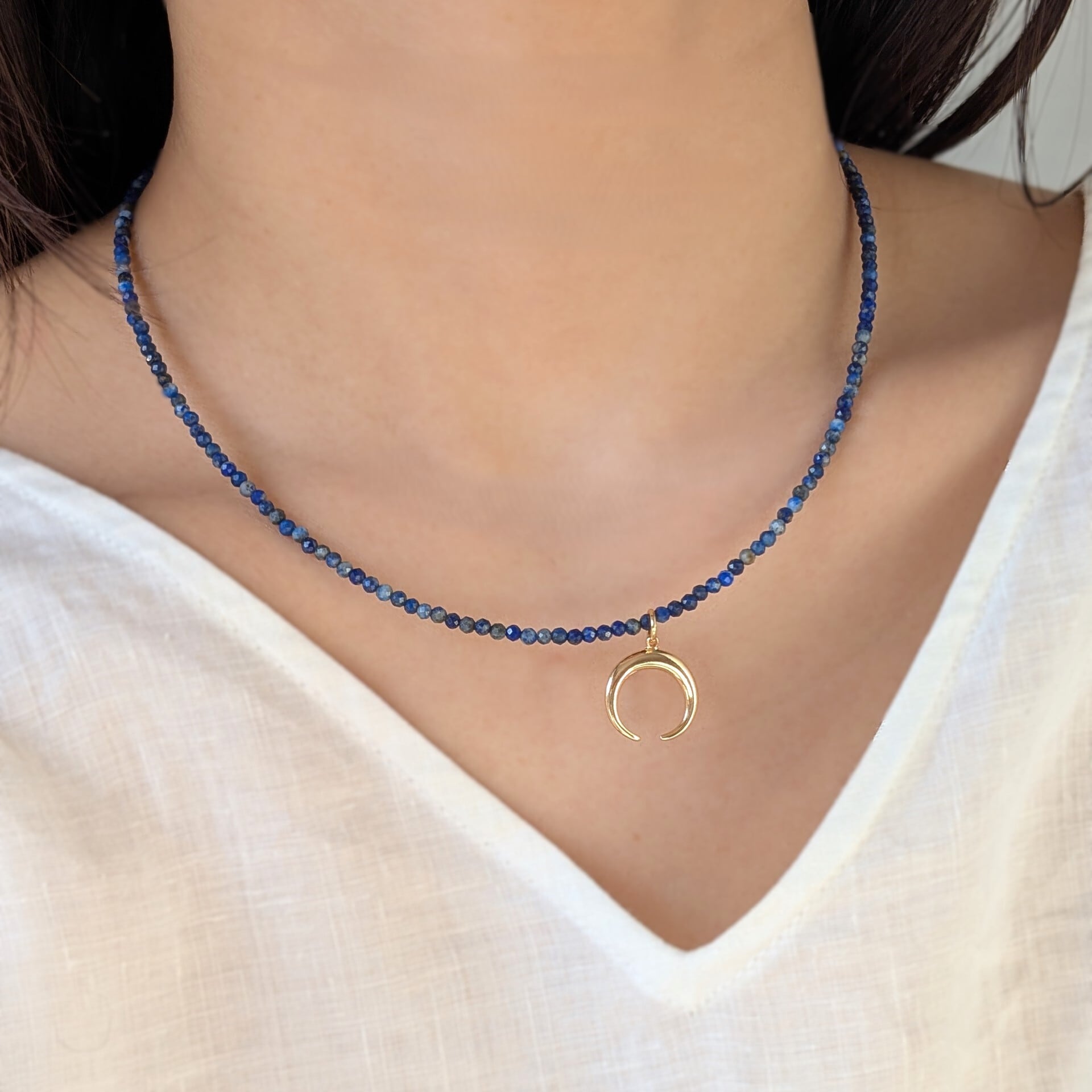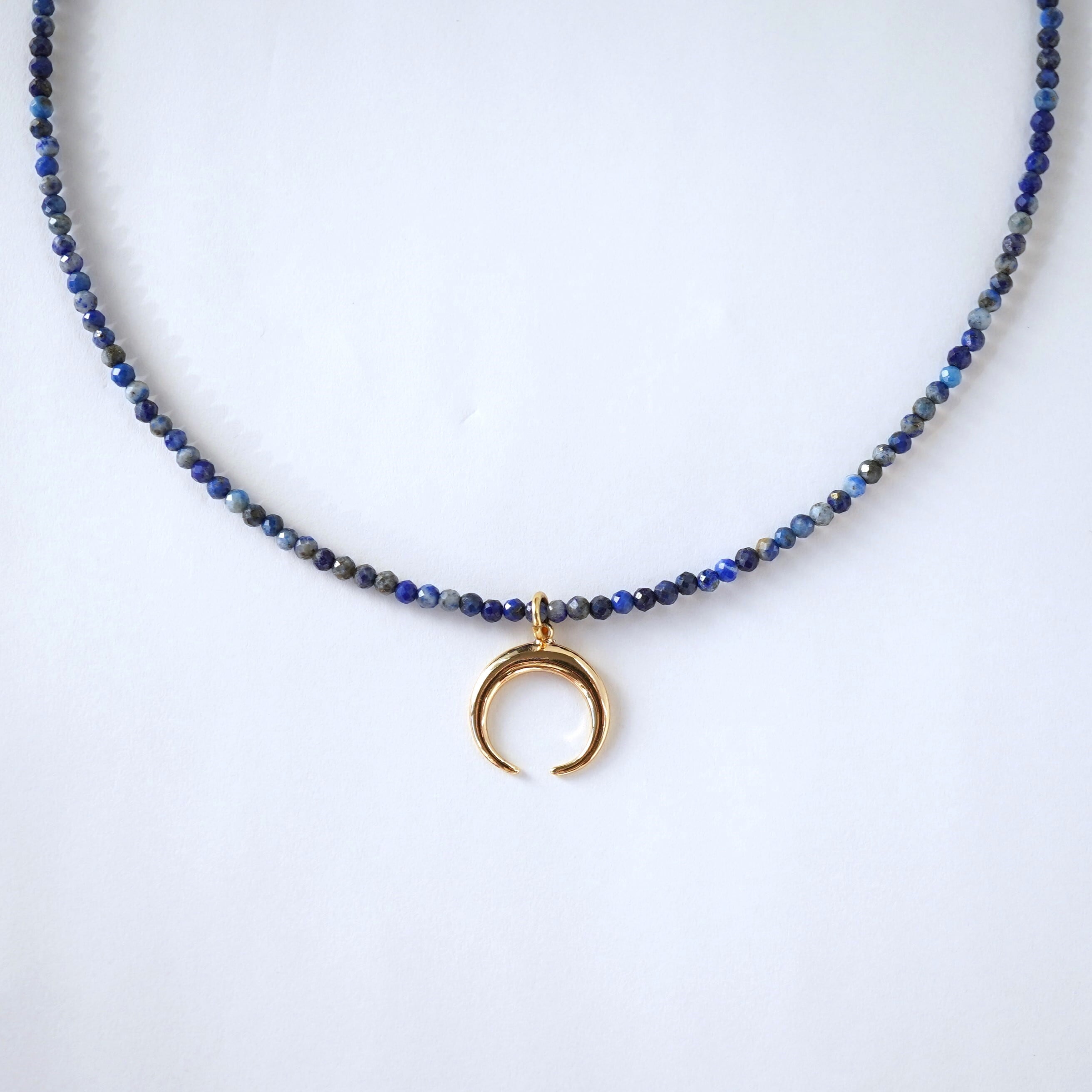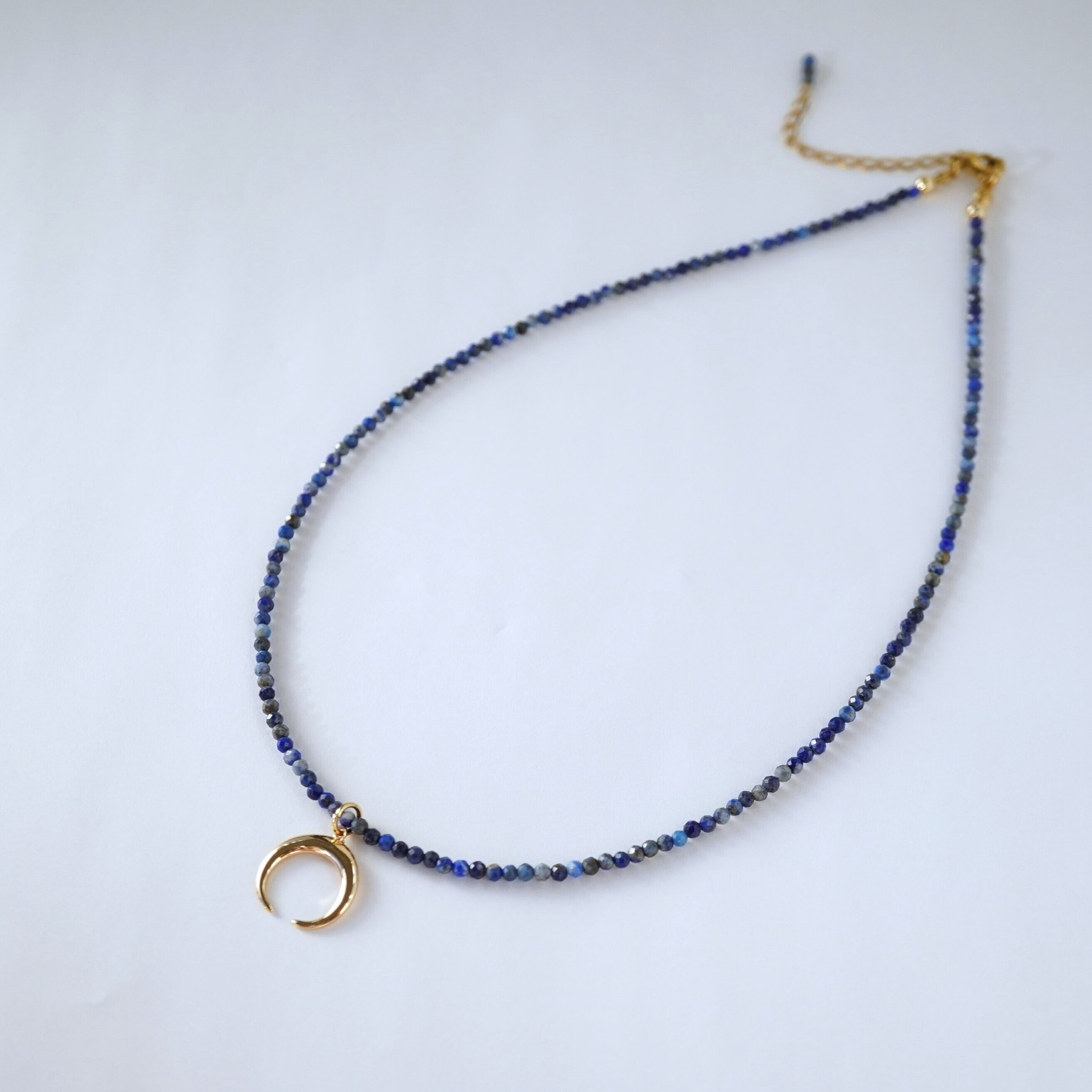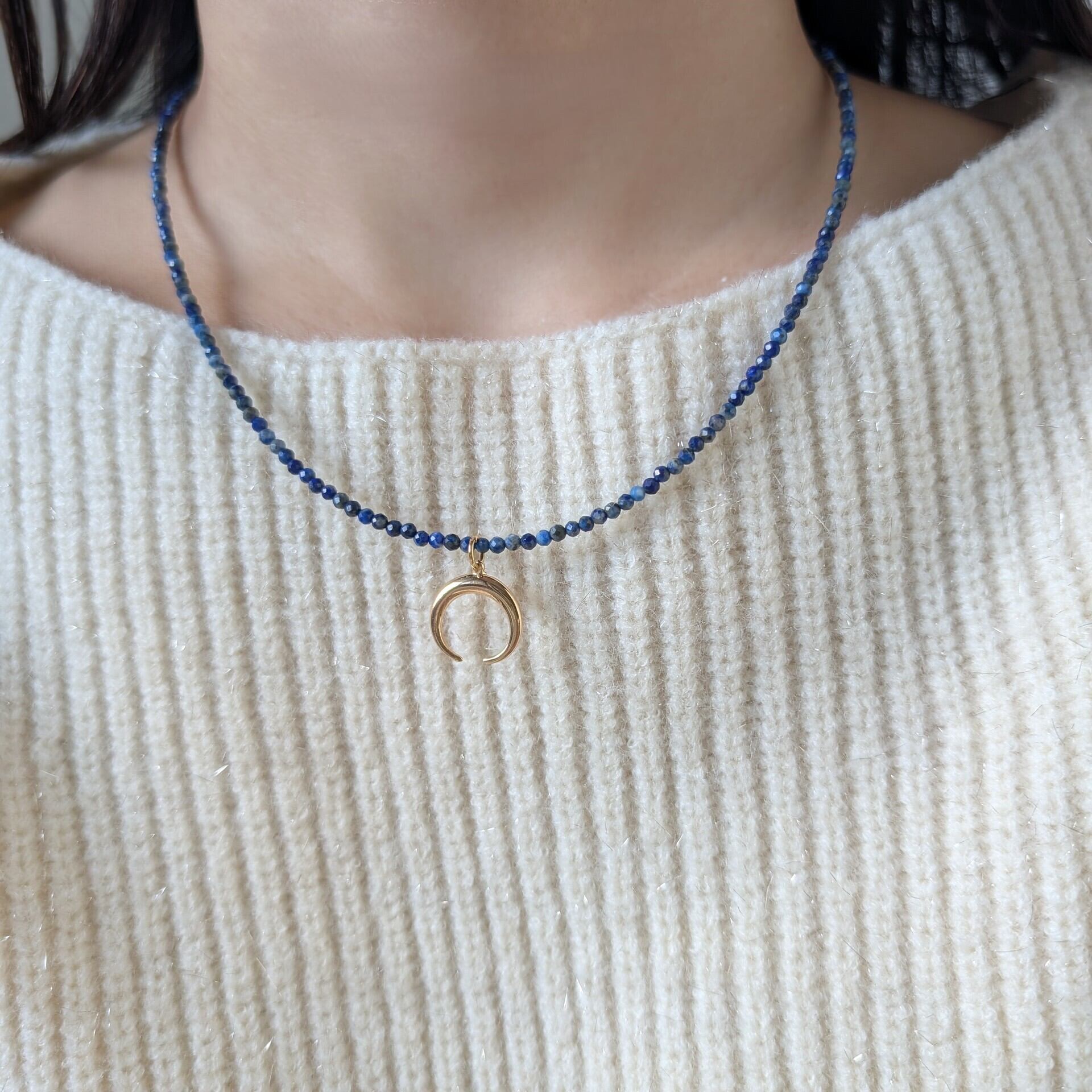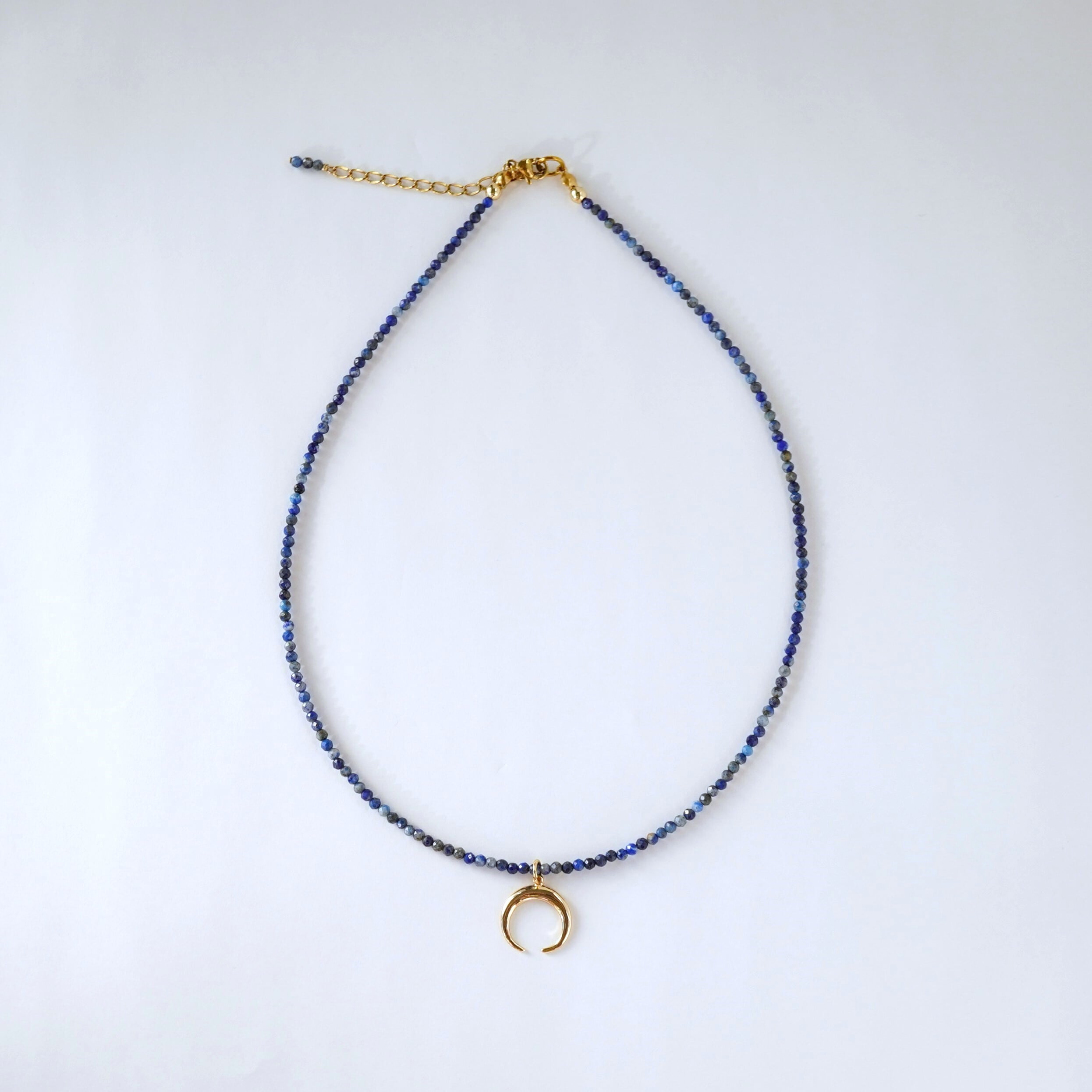 天然石ラピスラズリにクレセントムーン(三日月)のチャームを合わせたネックレス。
