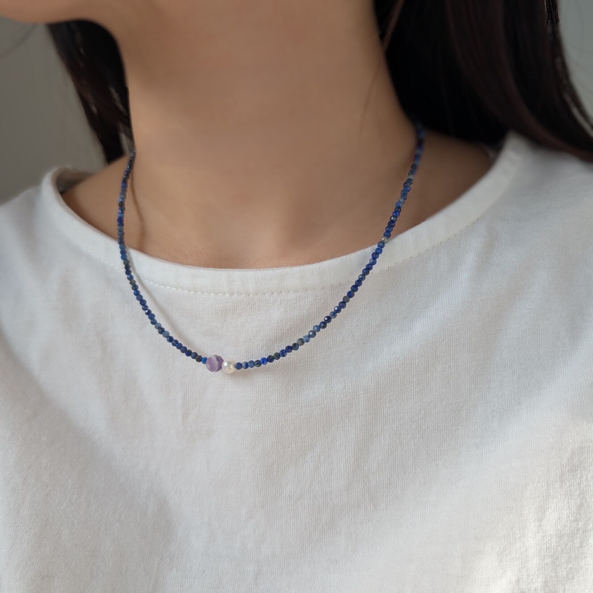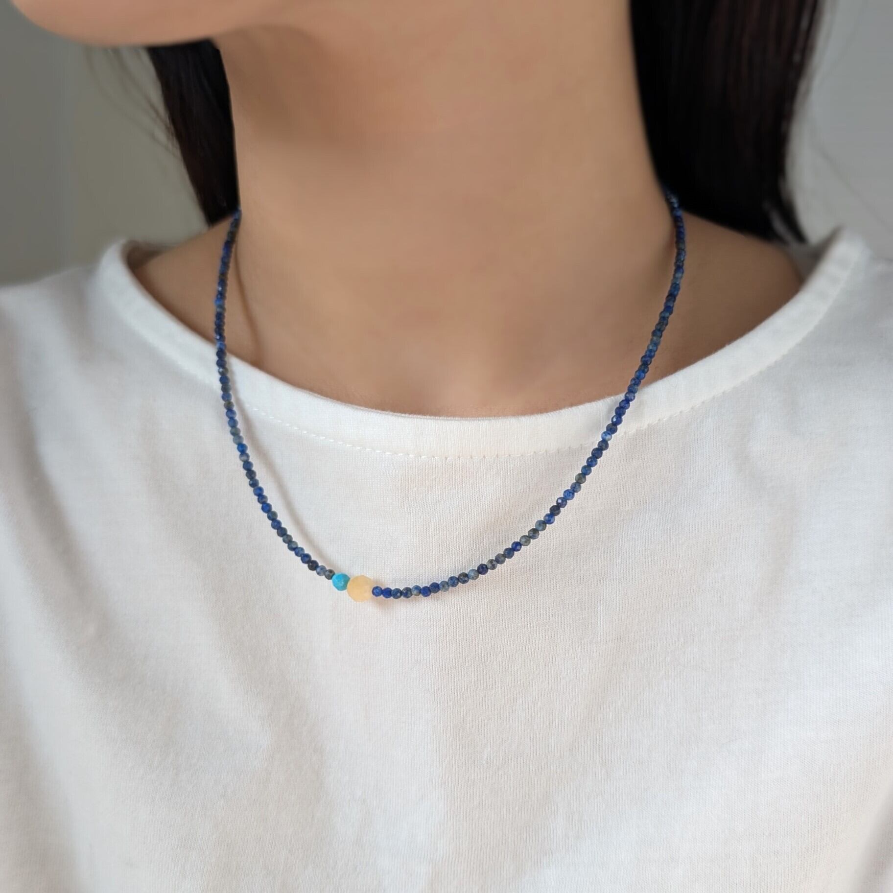 天然石ラピスラズリは極小2㎜。細めですのでさり気なく、上品に着けて頂けます。