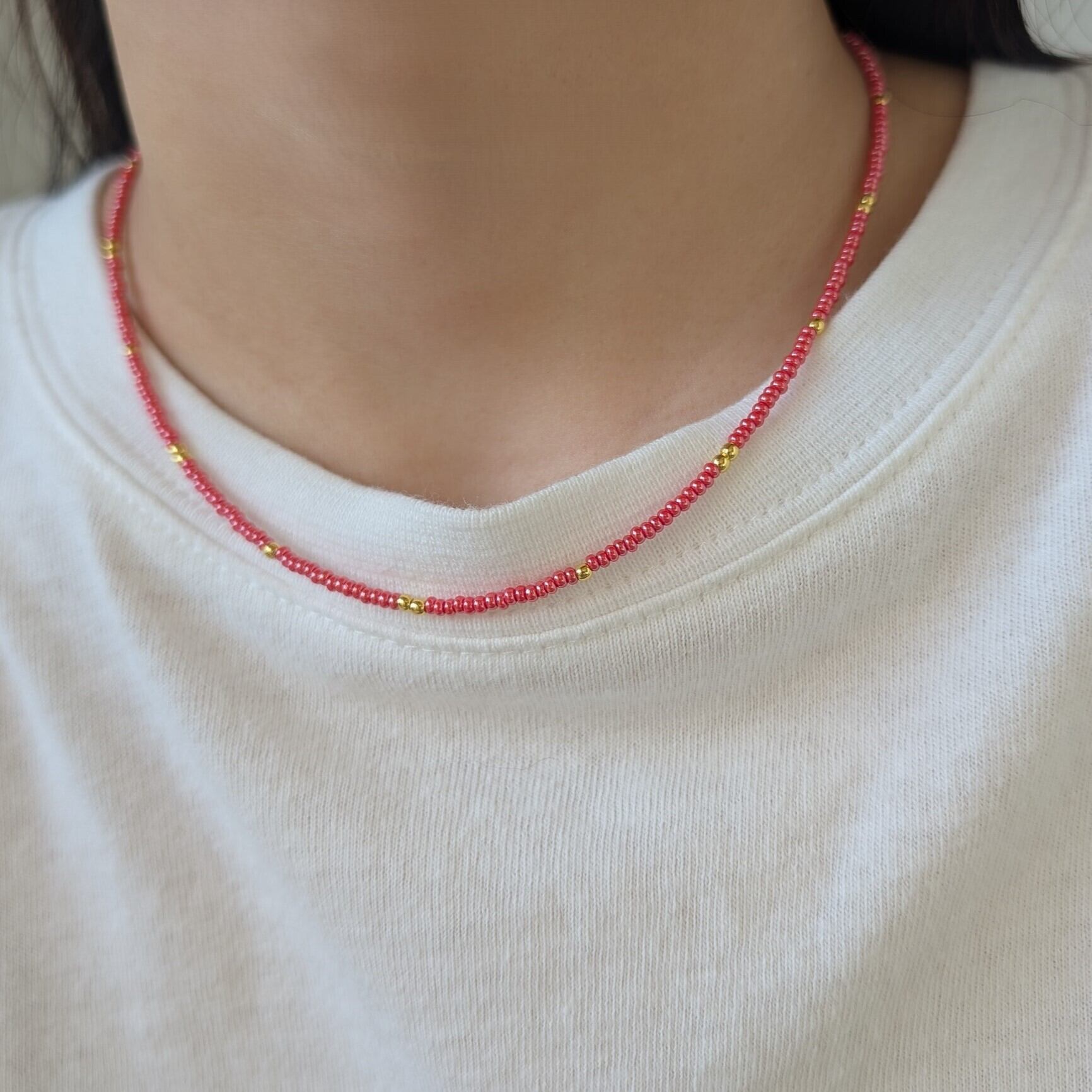 シンプルなデザインの赤いビーズのネックレスに、ミニハートのチャームが付いたネックレスをあわせました。赤いビーズはパールのような艶があり、色味も真っ赤ではなく、もう少し柔らかい、コーラルレッドに近い色味ですので、優しい印象になり、肌なじみも良いと思います。