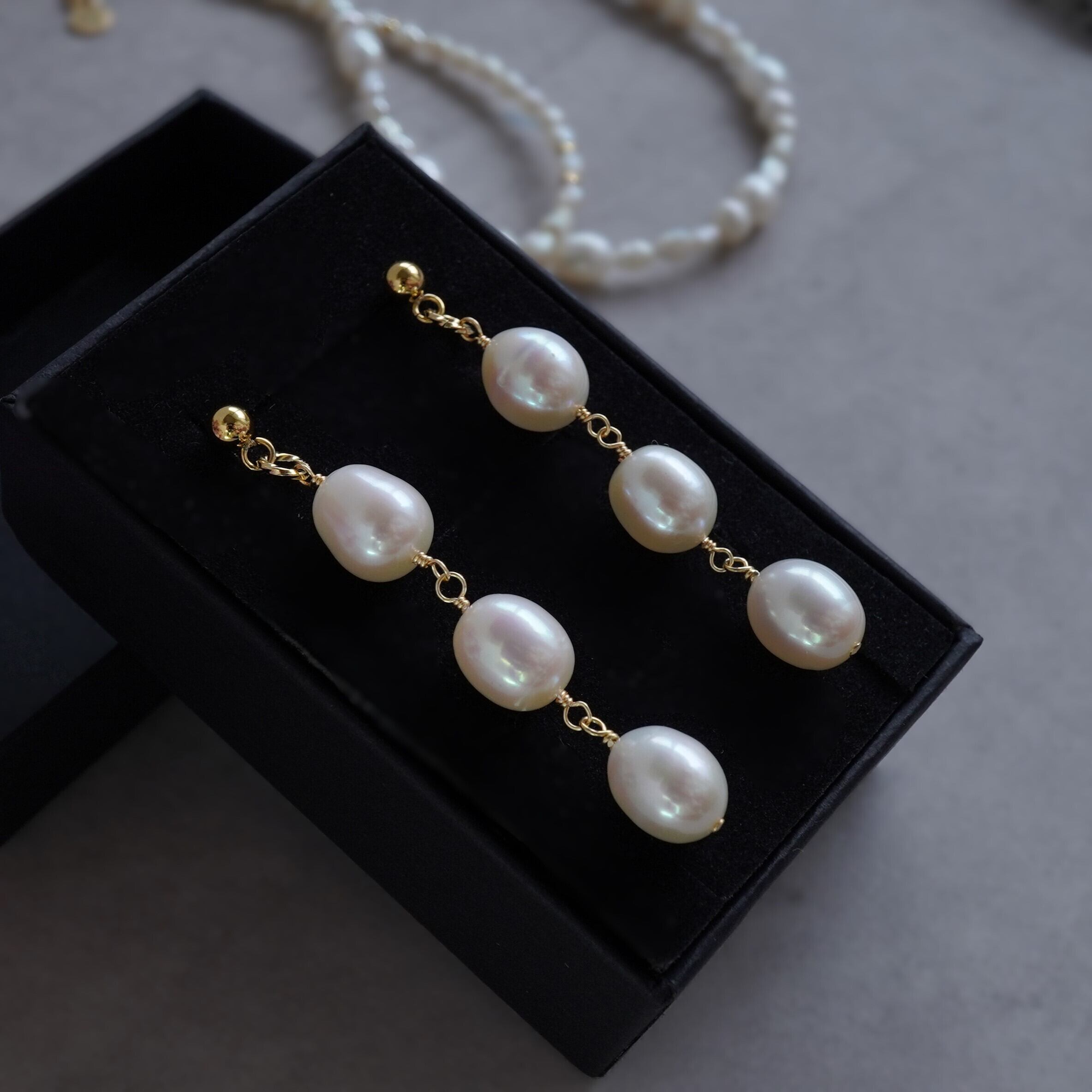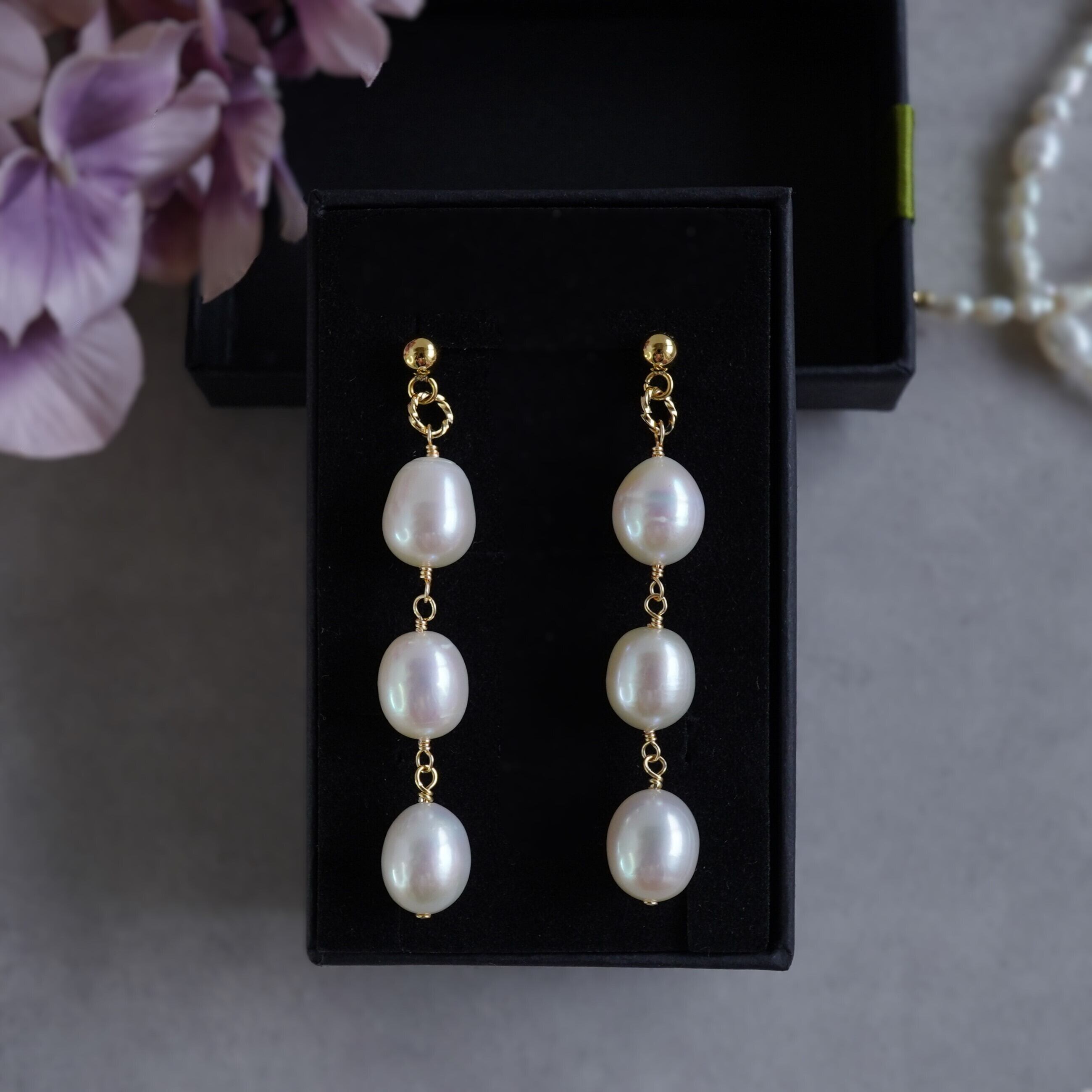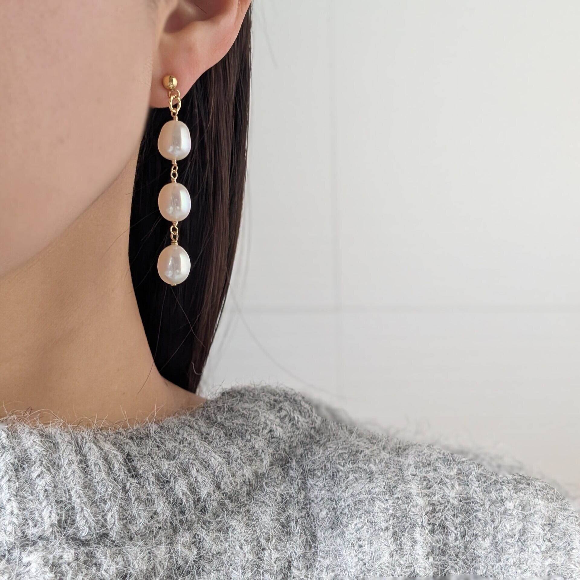上質 3連淡水パールピアス/イヤリング
