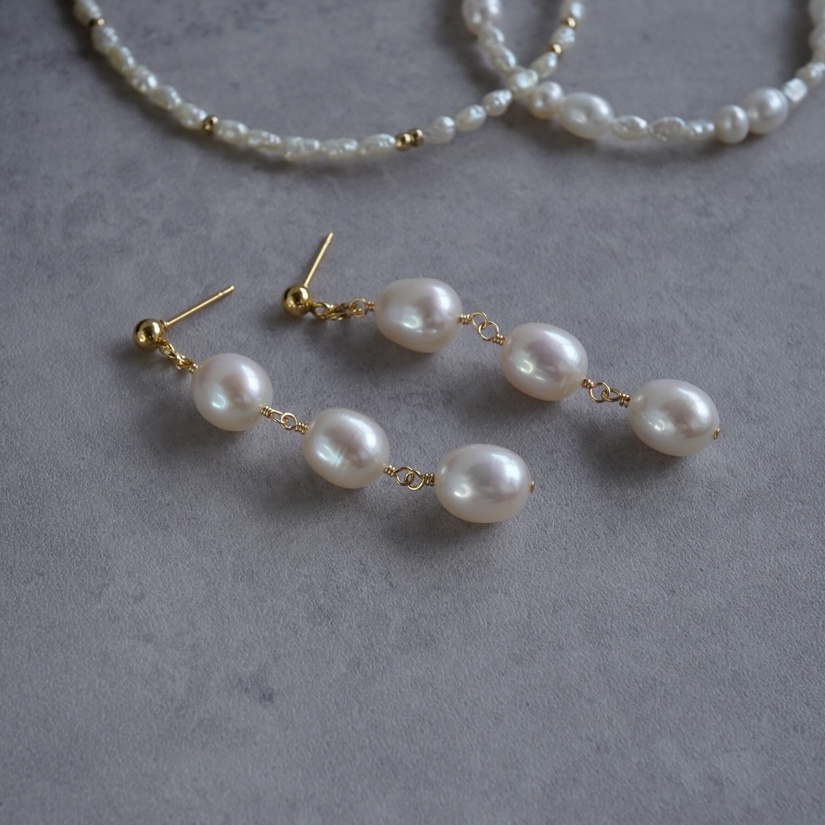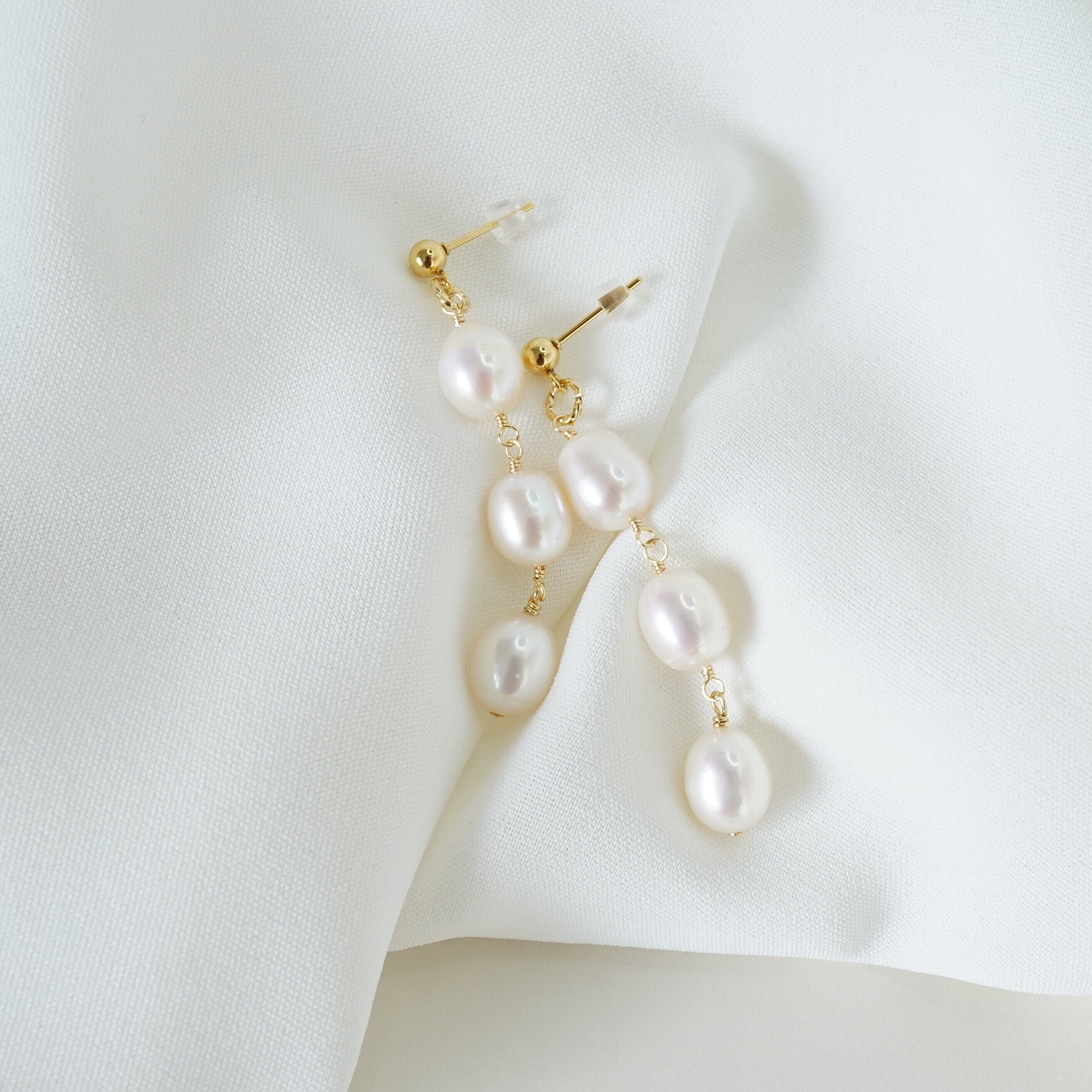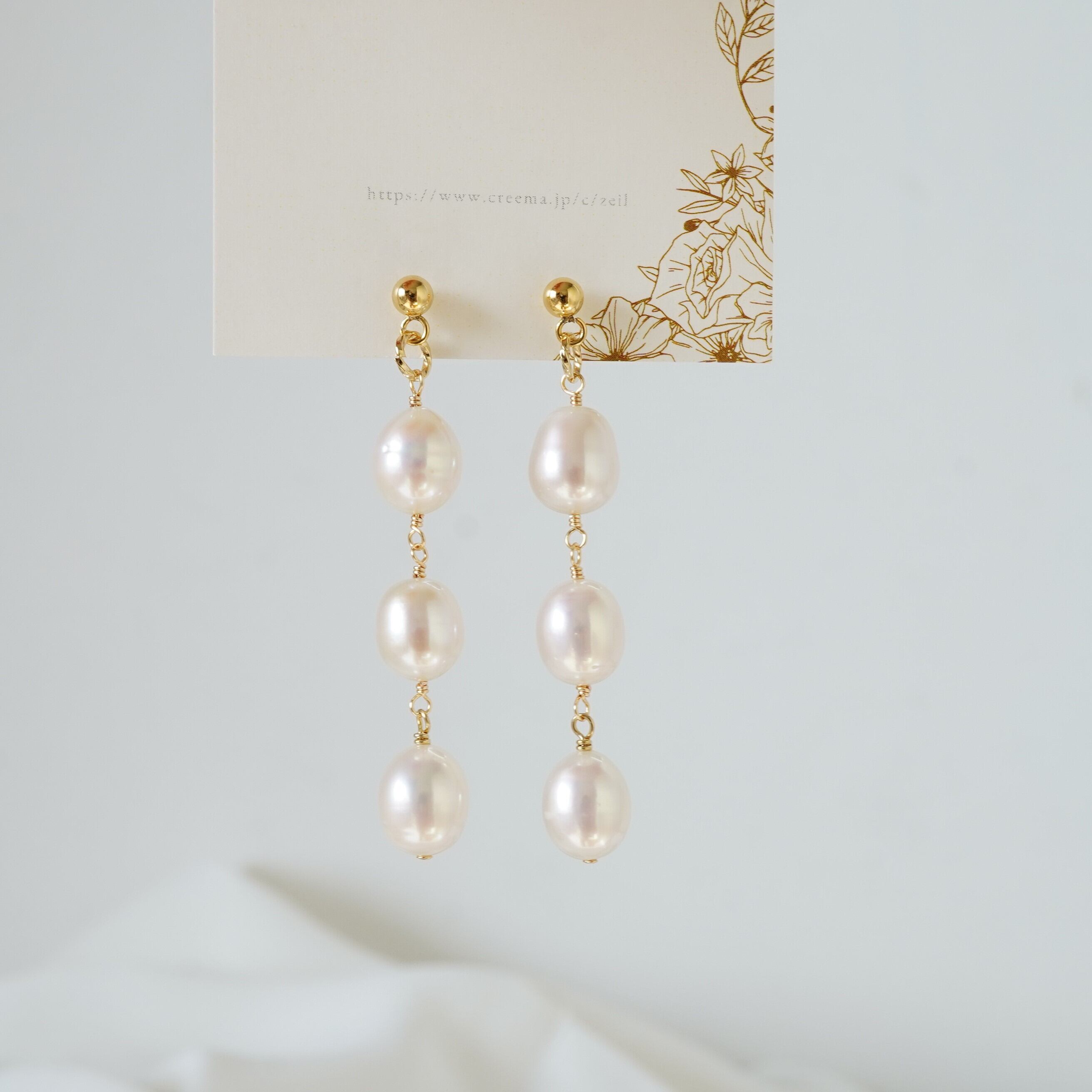 ふっくらと艶のある卵型の淡水パールを使用した、シンプルな3連パールピアス。