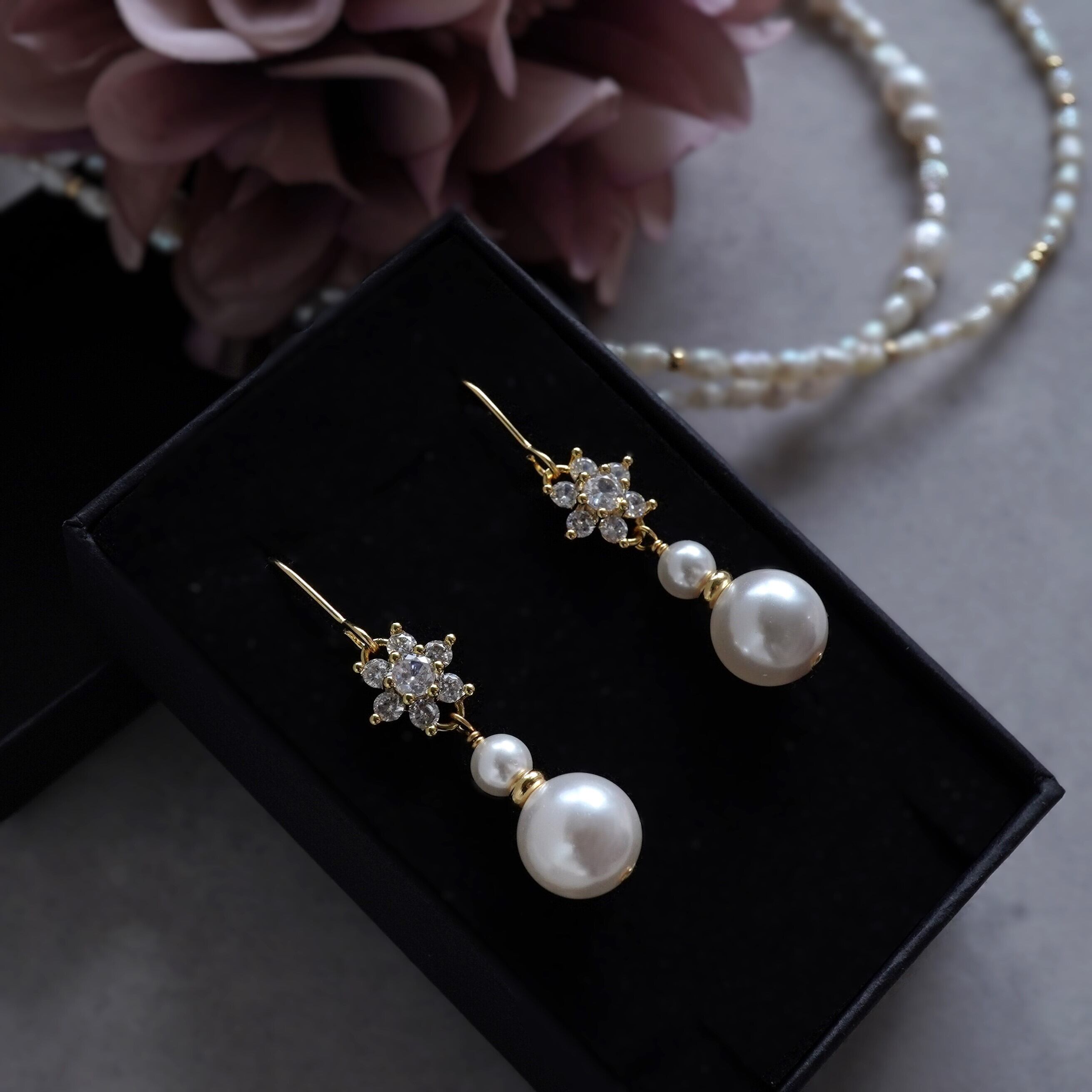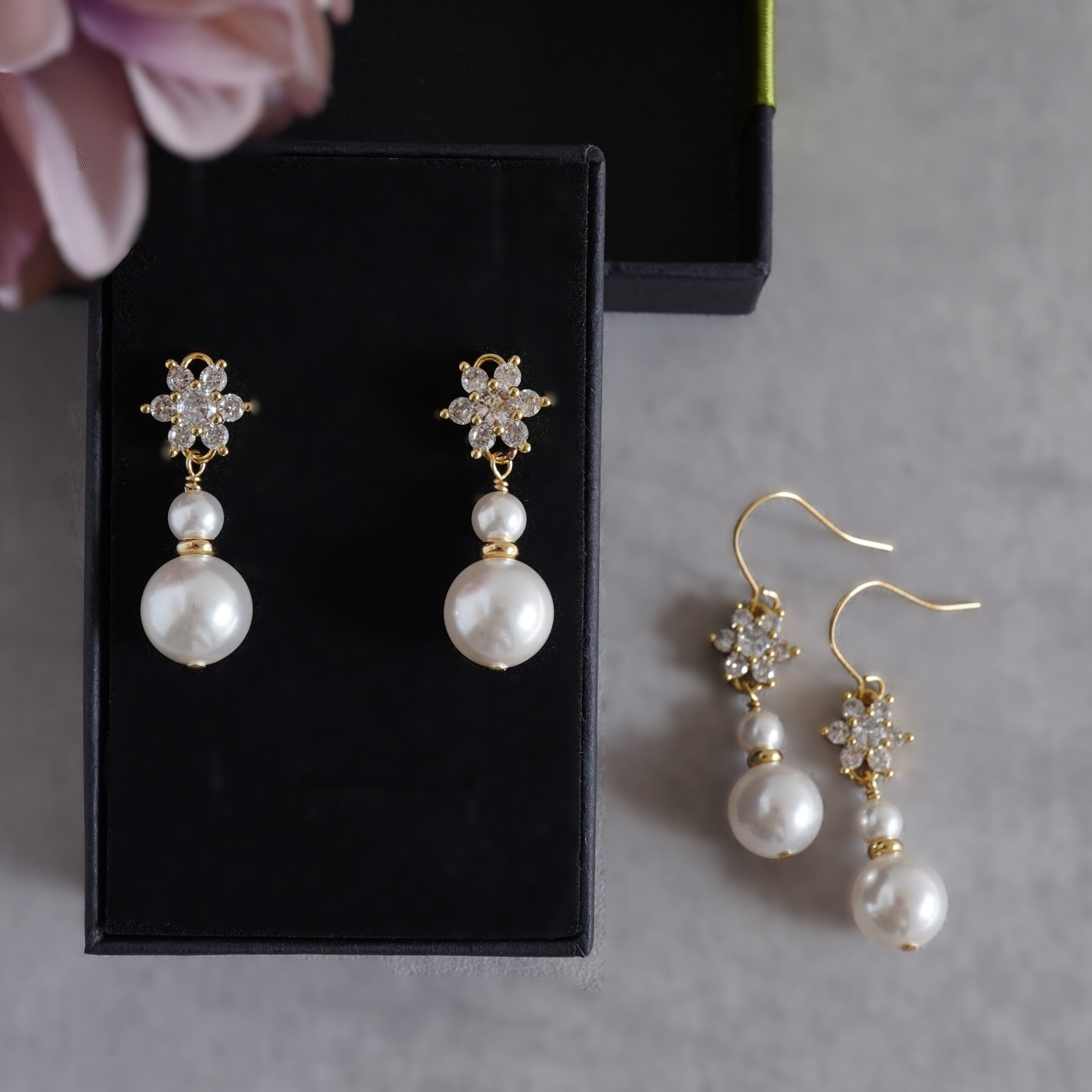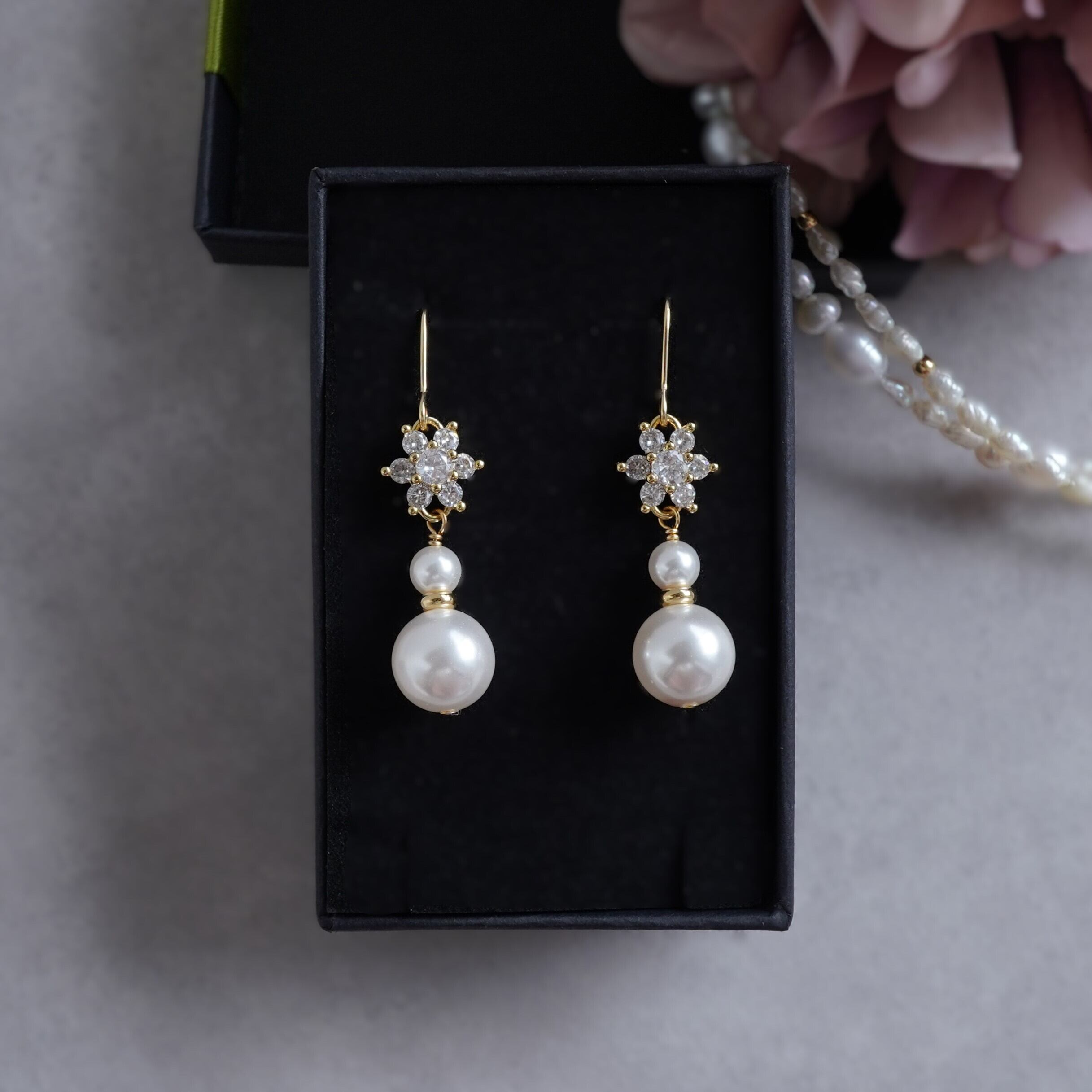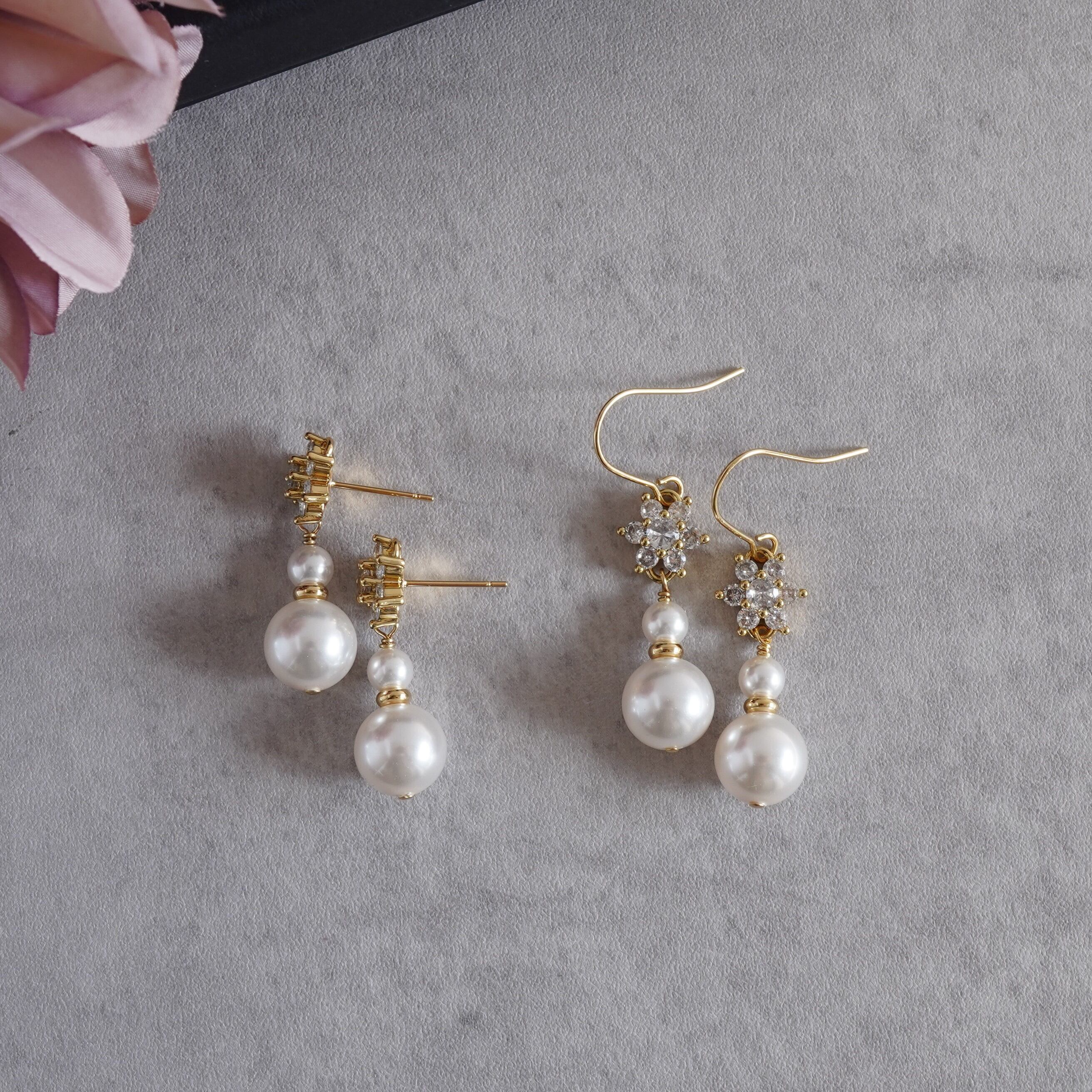 特別な日のピアス キュービックジルコニアのお花とクリスタルパールのピアス