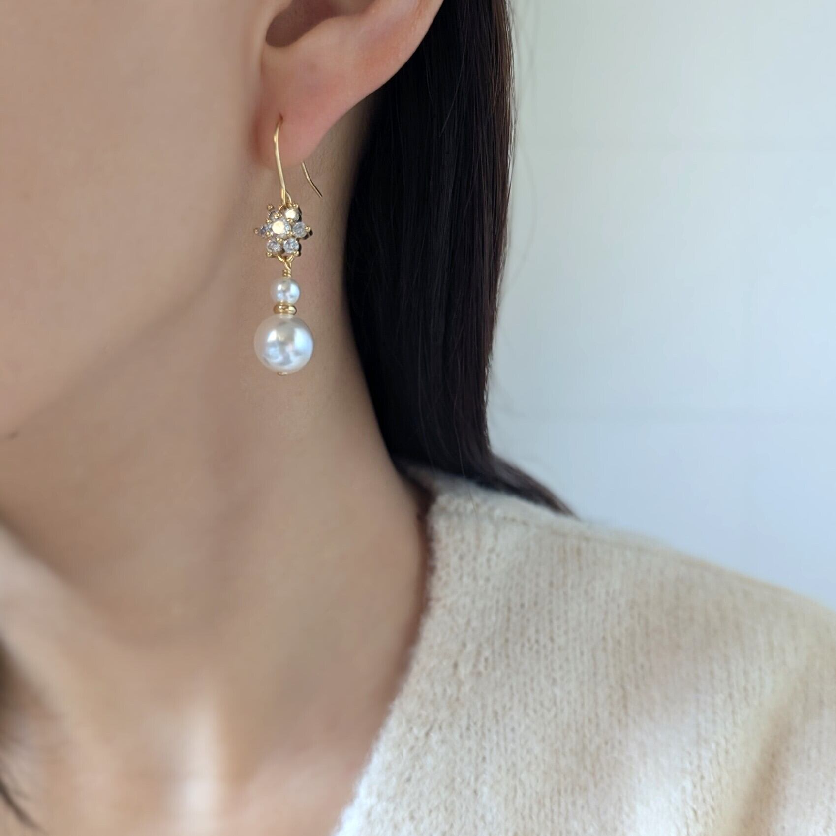 キラキラと輝くCZのお花に上品なクリスタルパールを合わせたピアス。