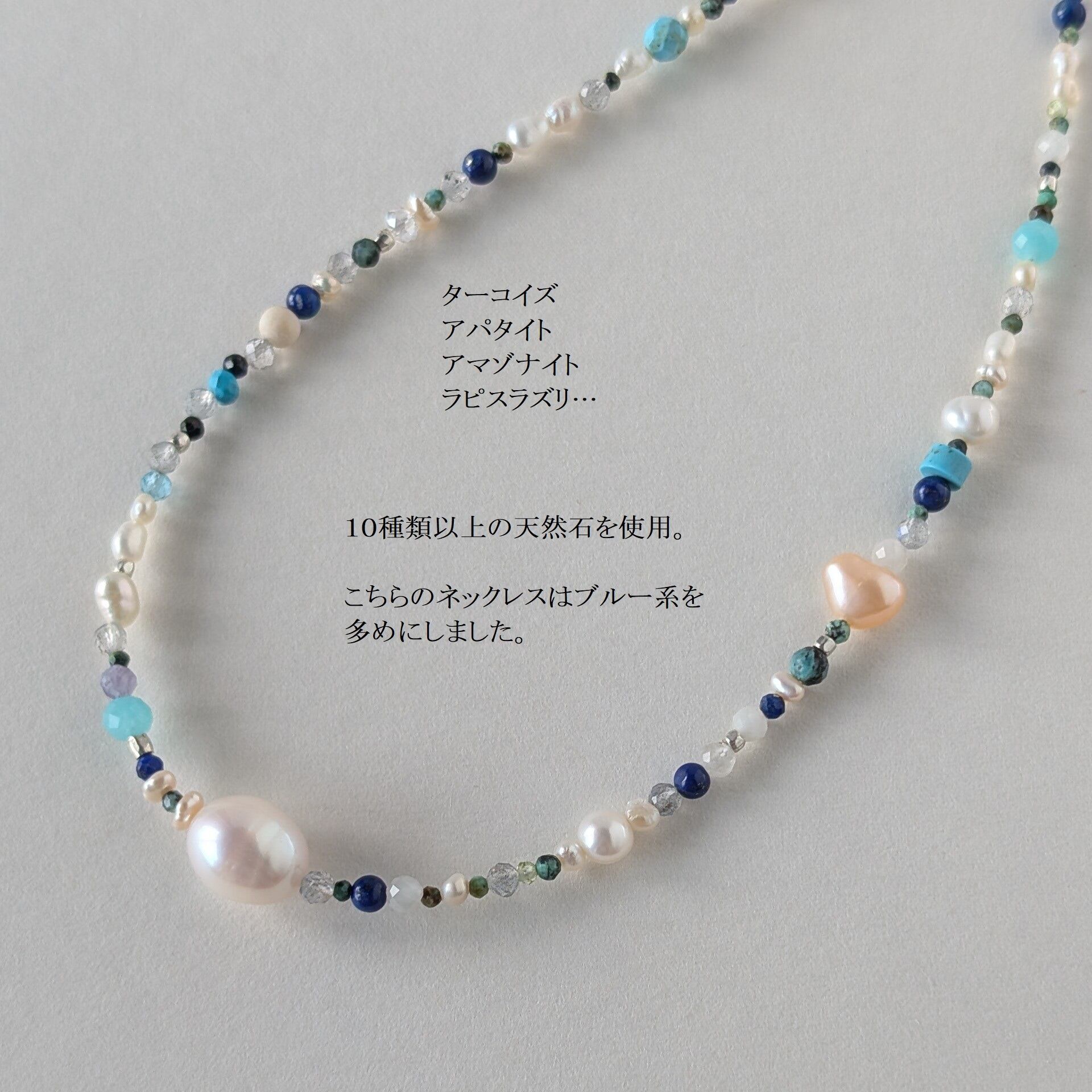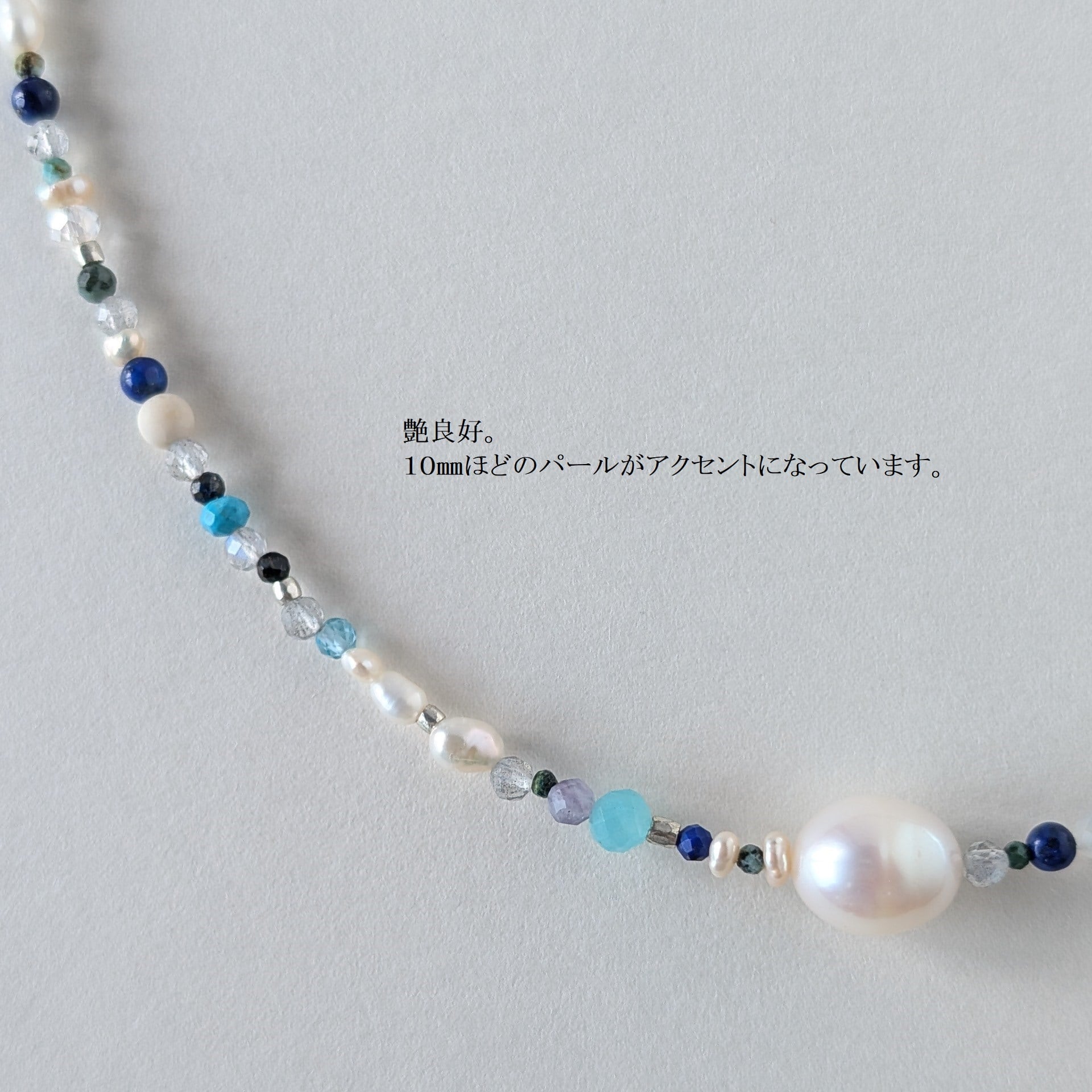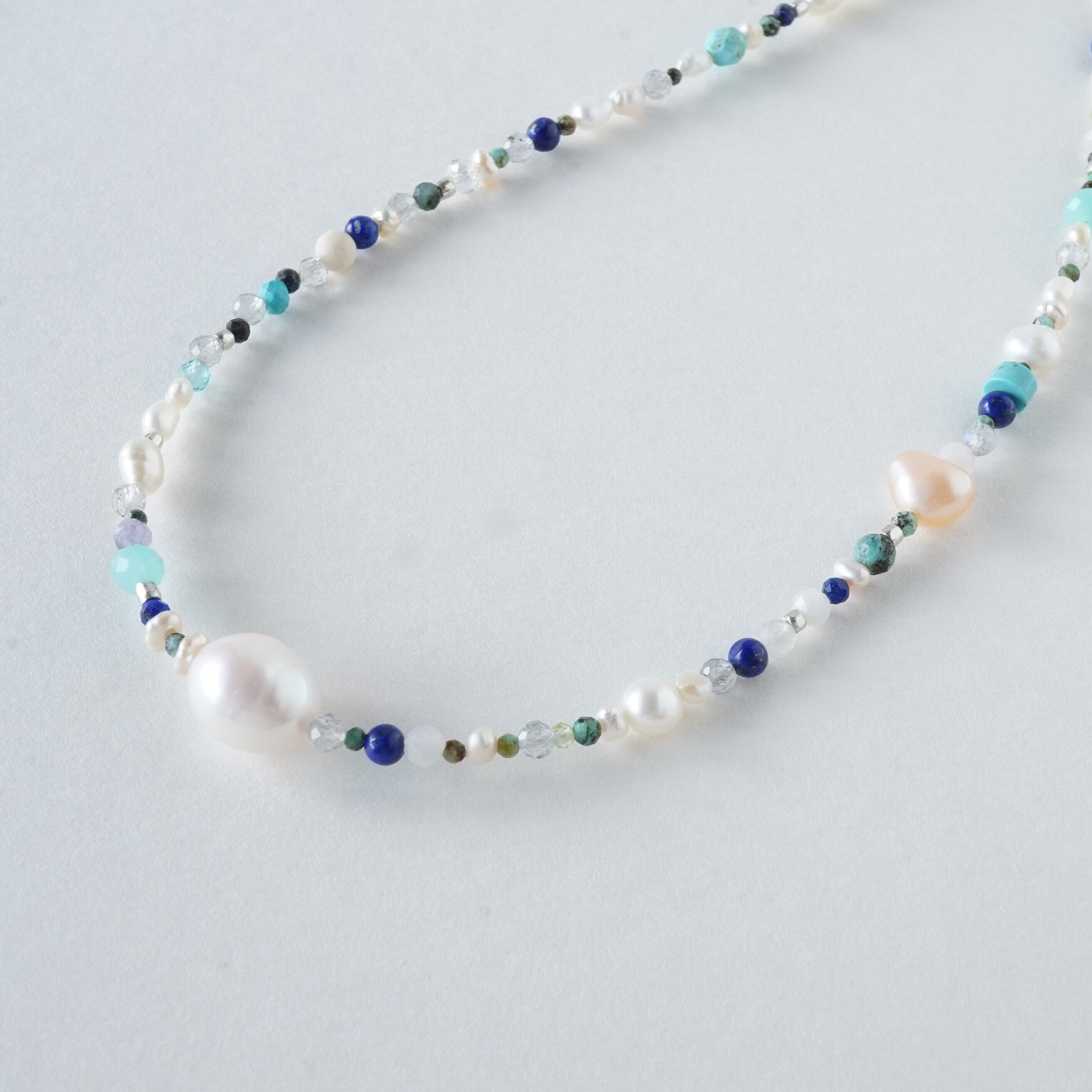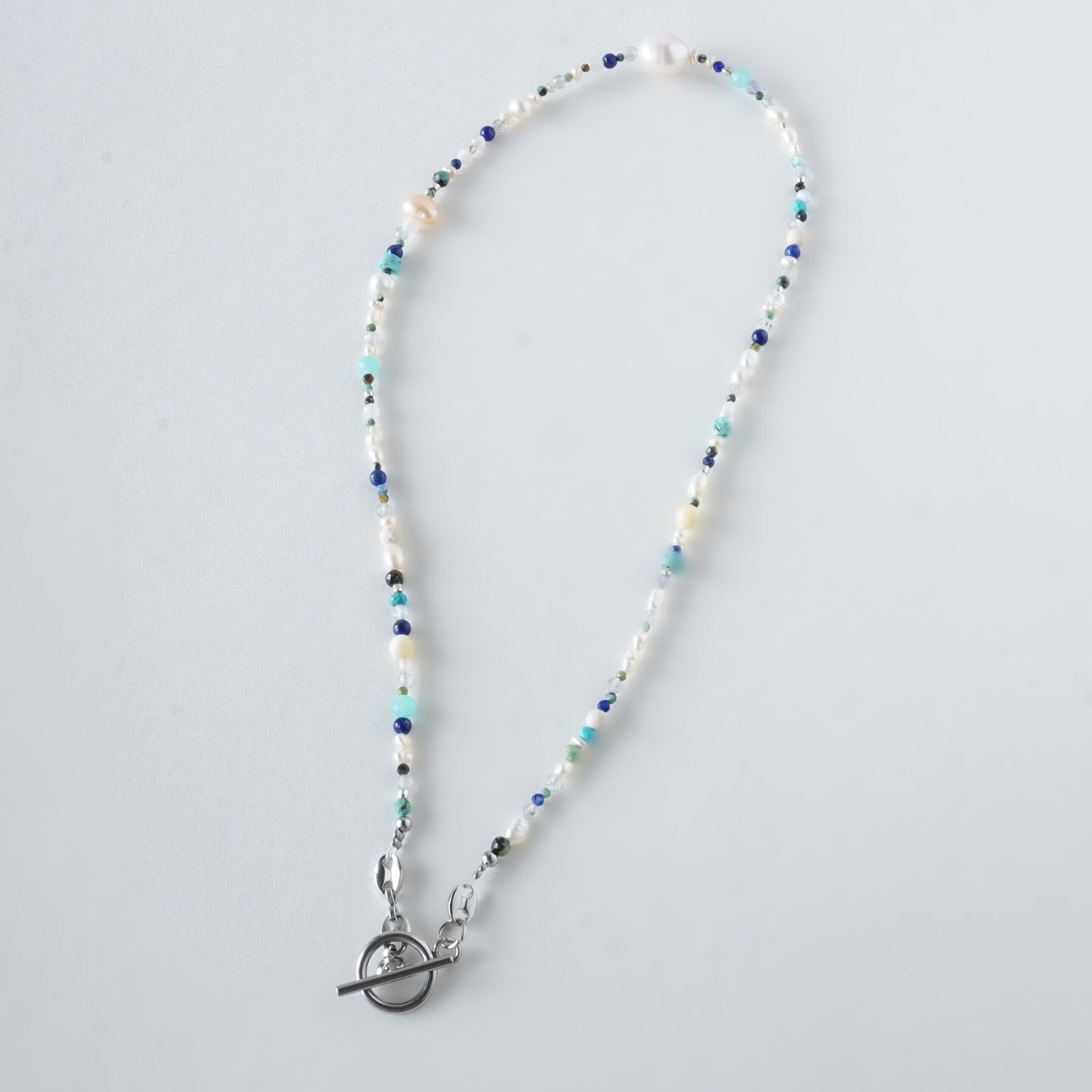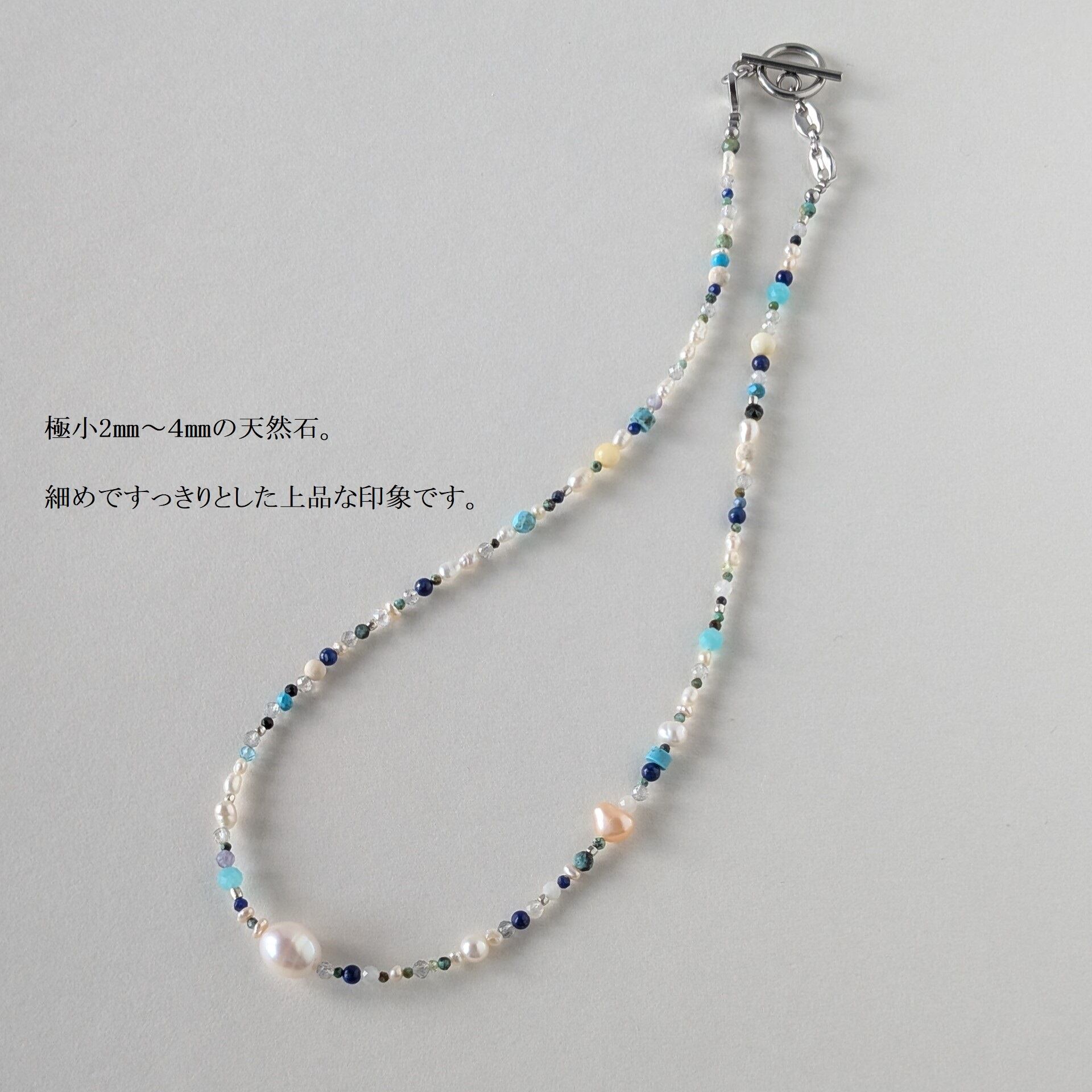 天然石mixネックレス ブルー系 一粒淡水パール マンテルネックレス サージカルステンレス