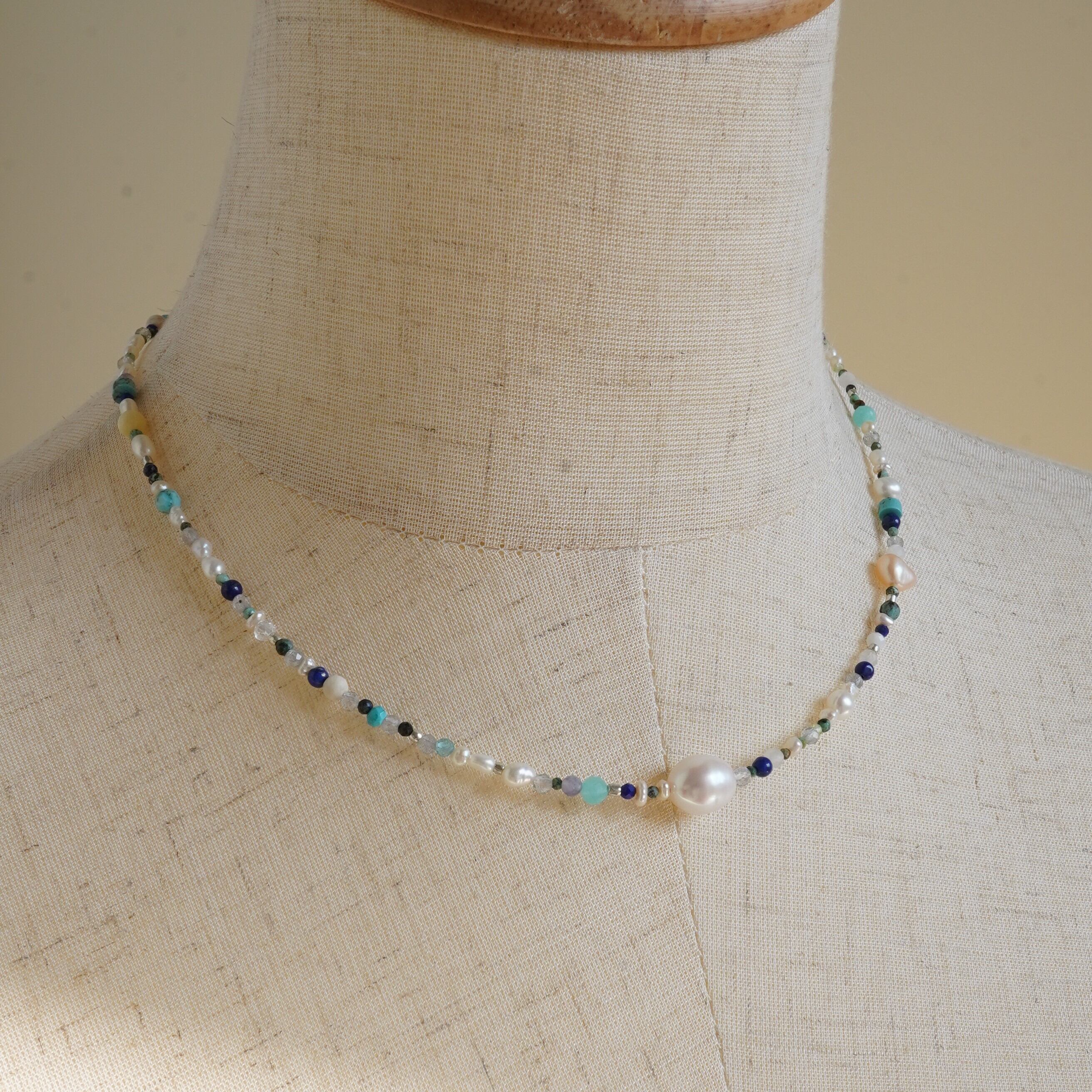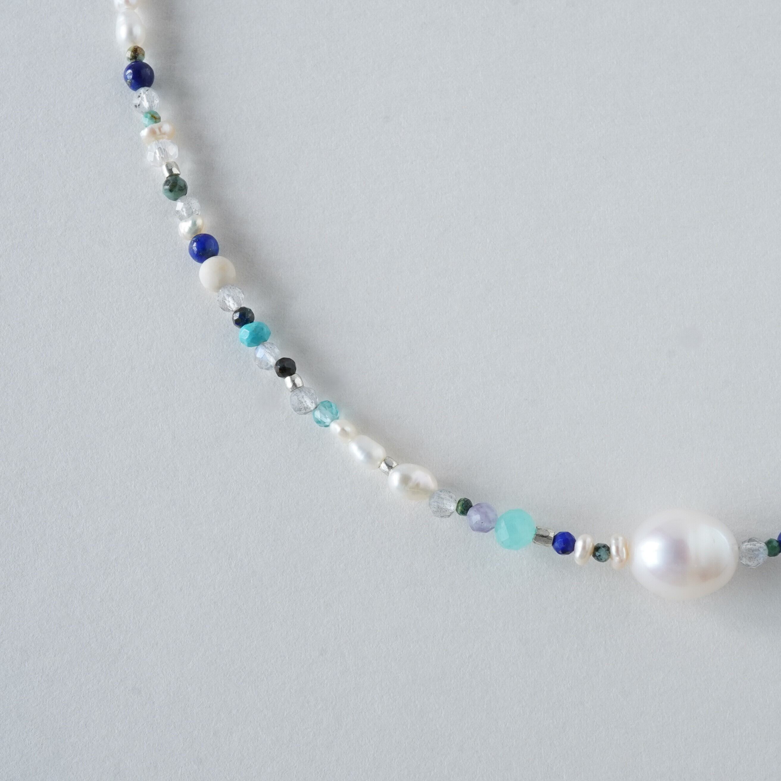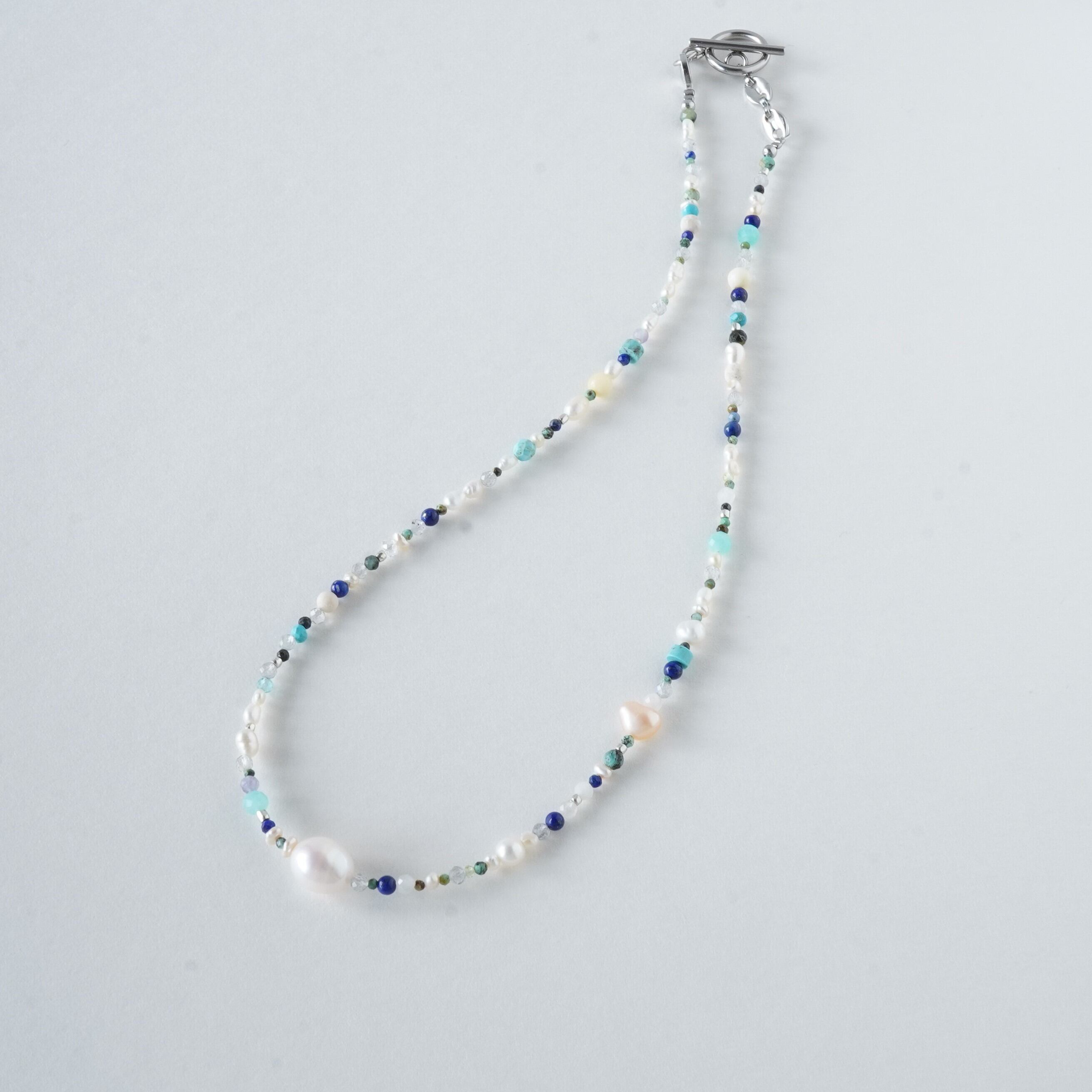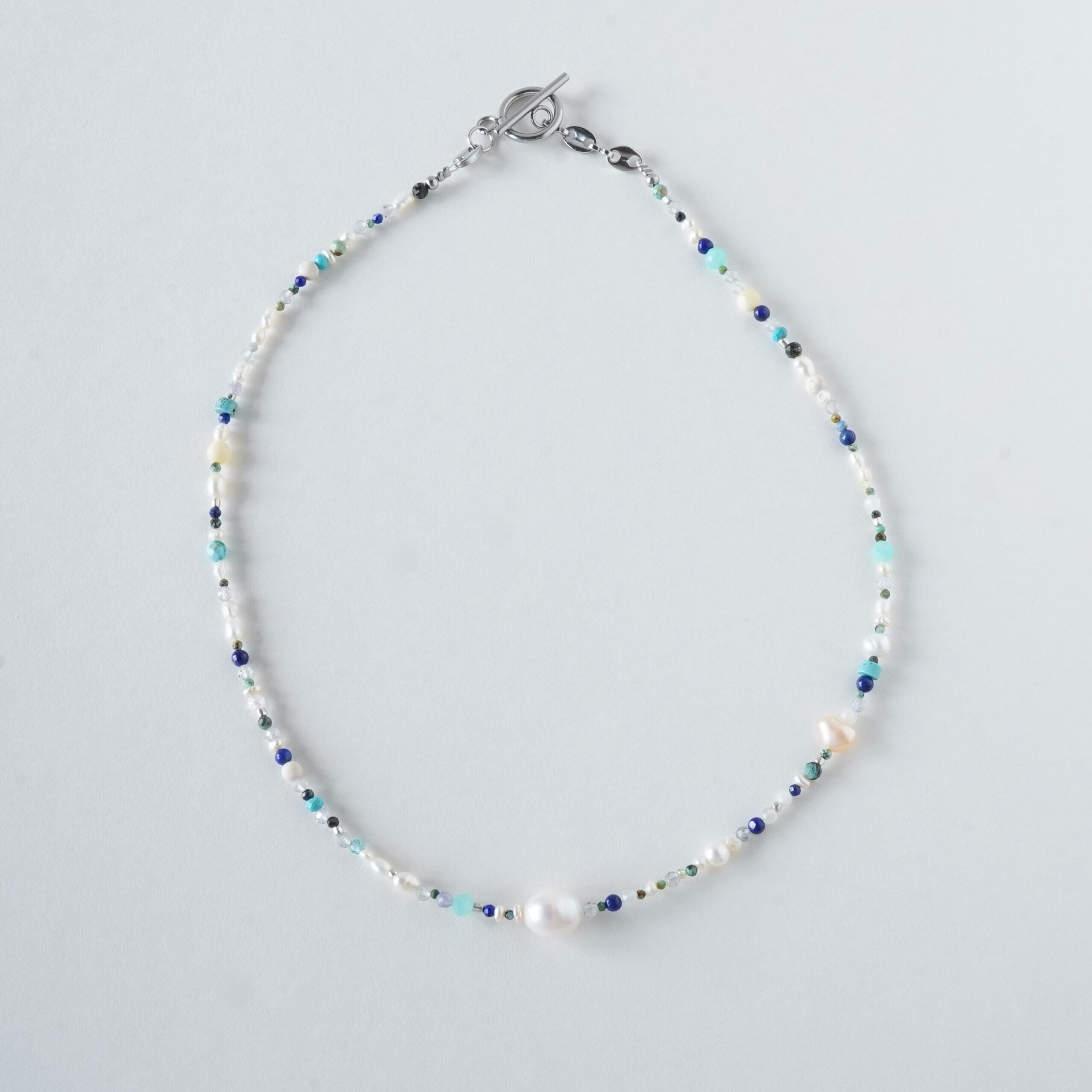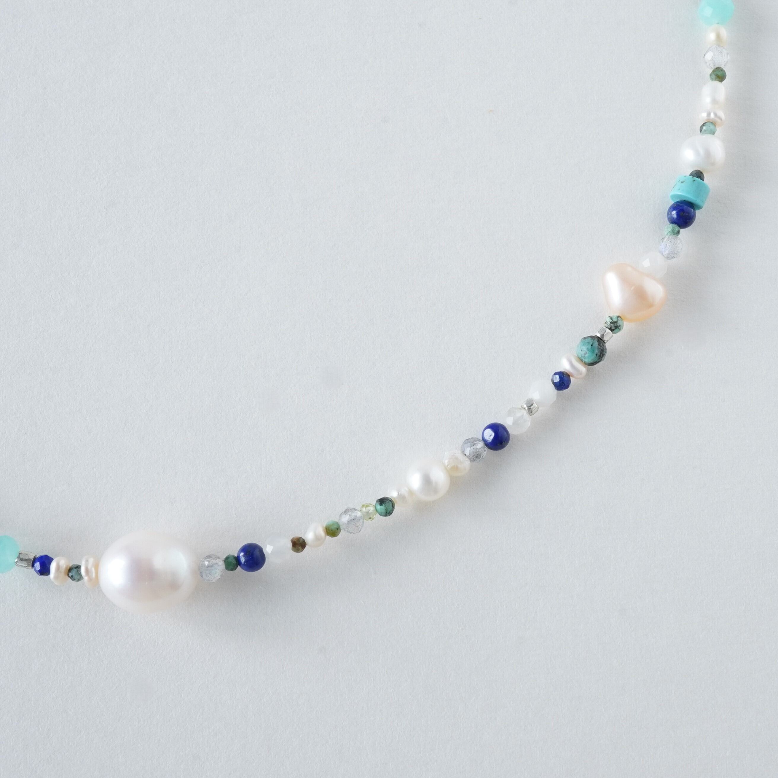 天然石mixネックレス ブルー系 一粒淡水パール マンテルネックレス サージカルステンレス