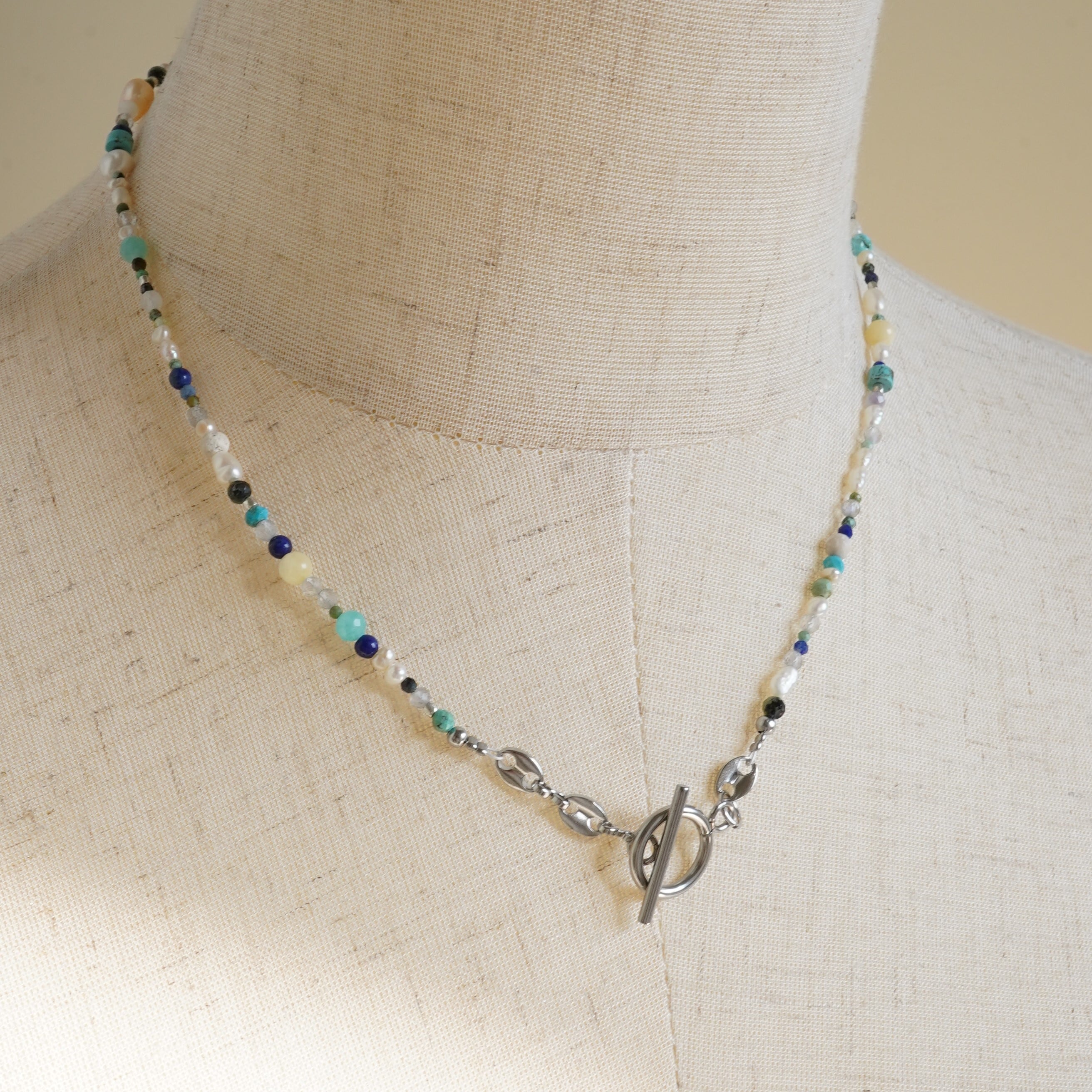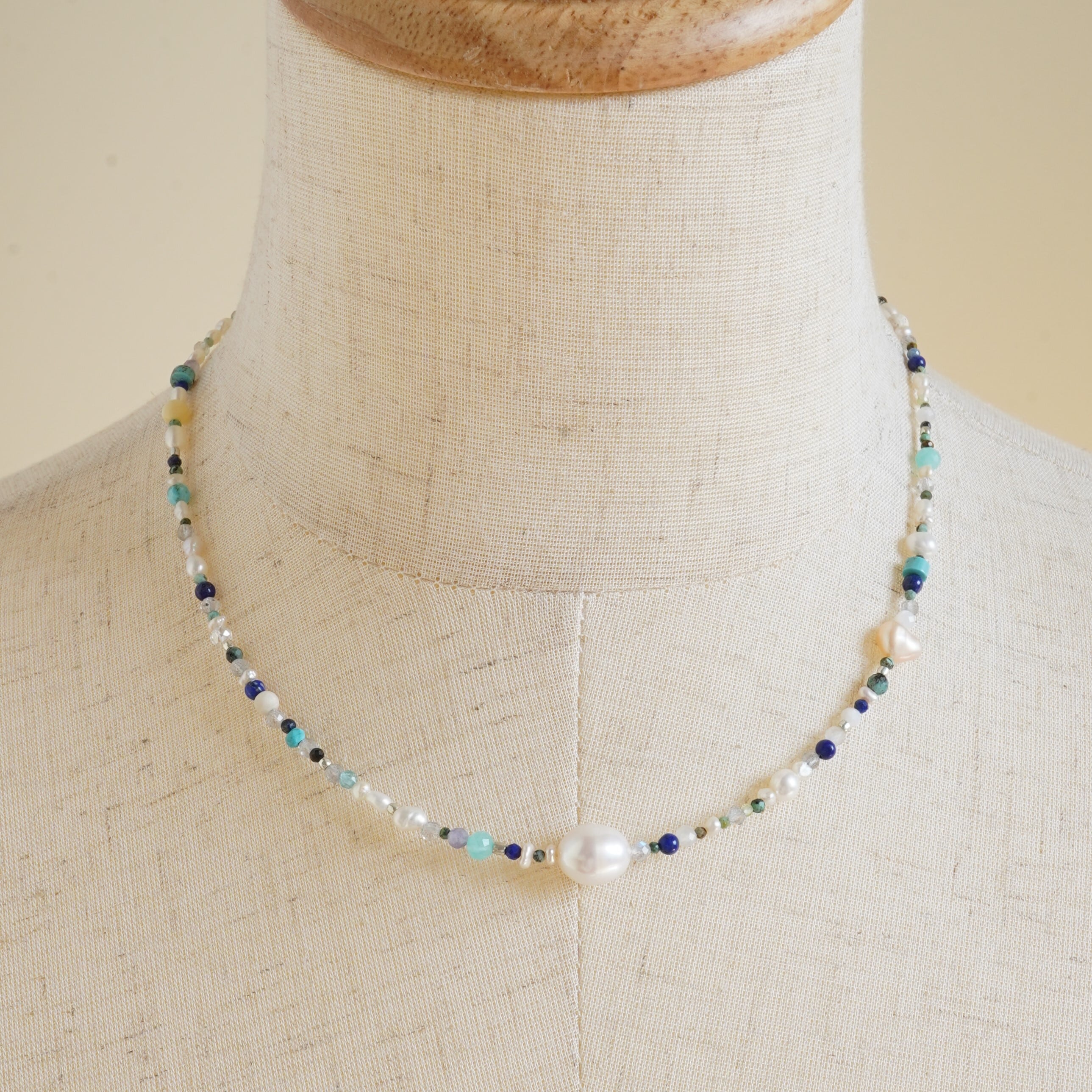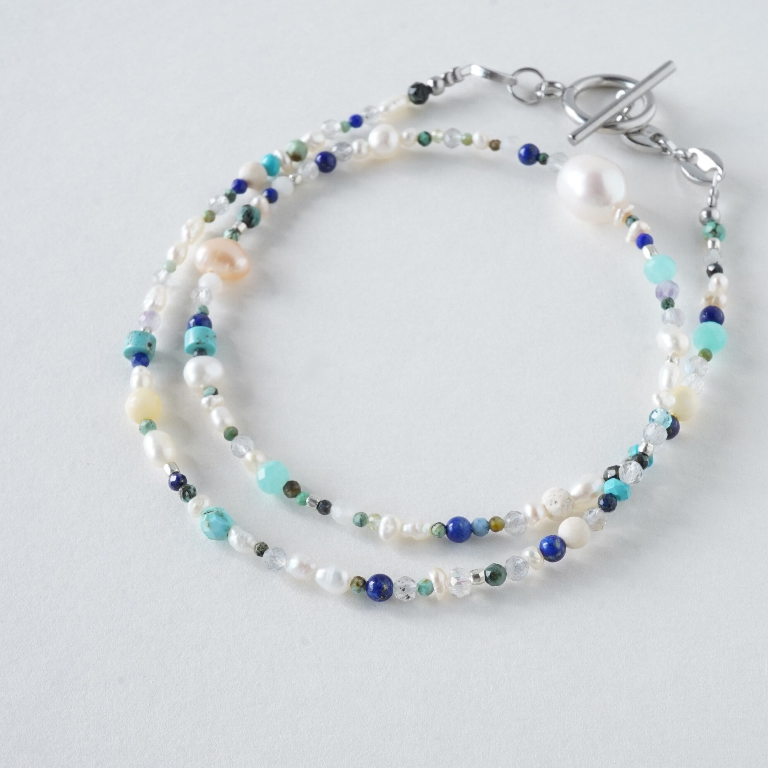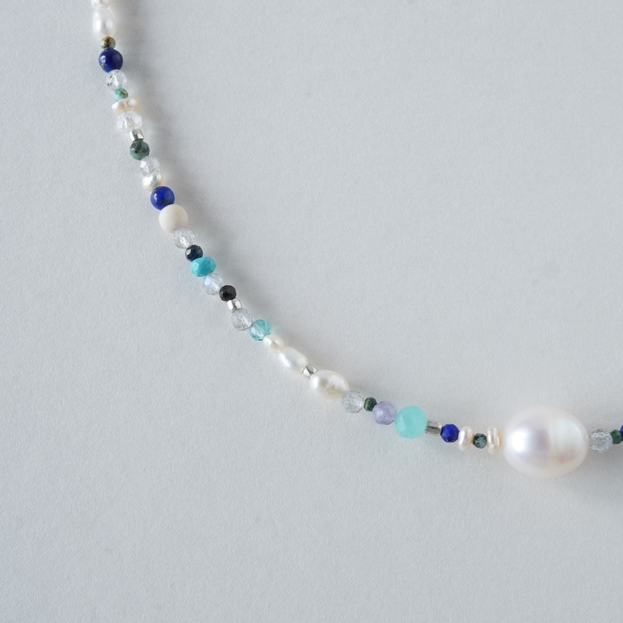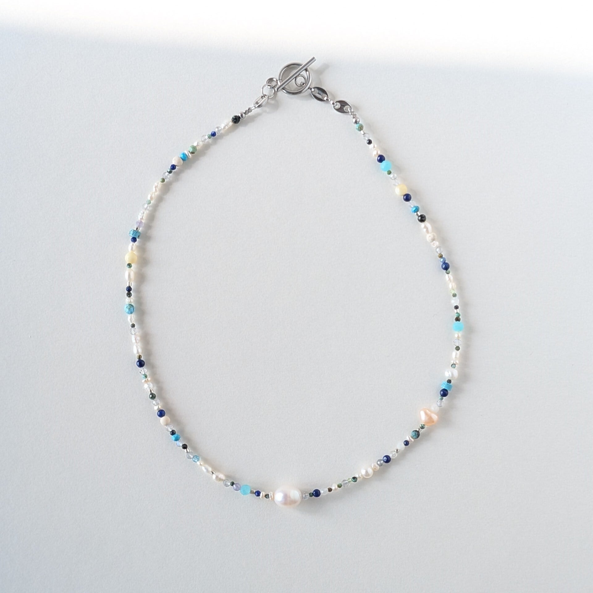 天然石mixネックレス ブルー系 一粒淡水パール マンテルネックレス サージカルステンレス
